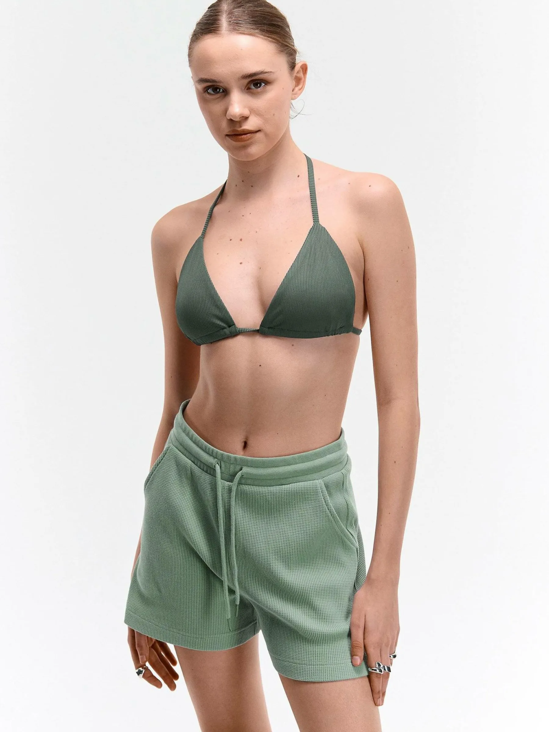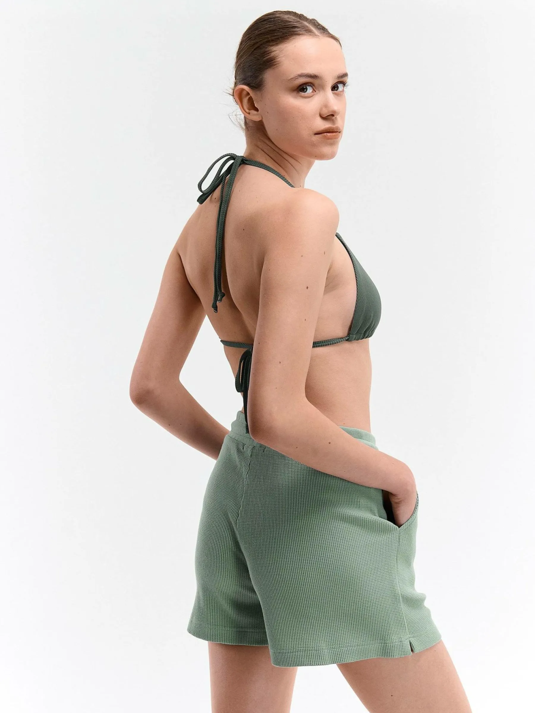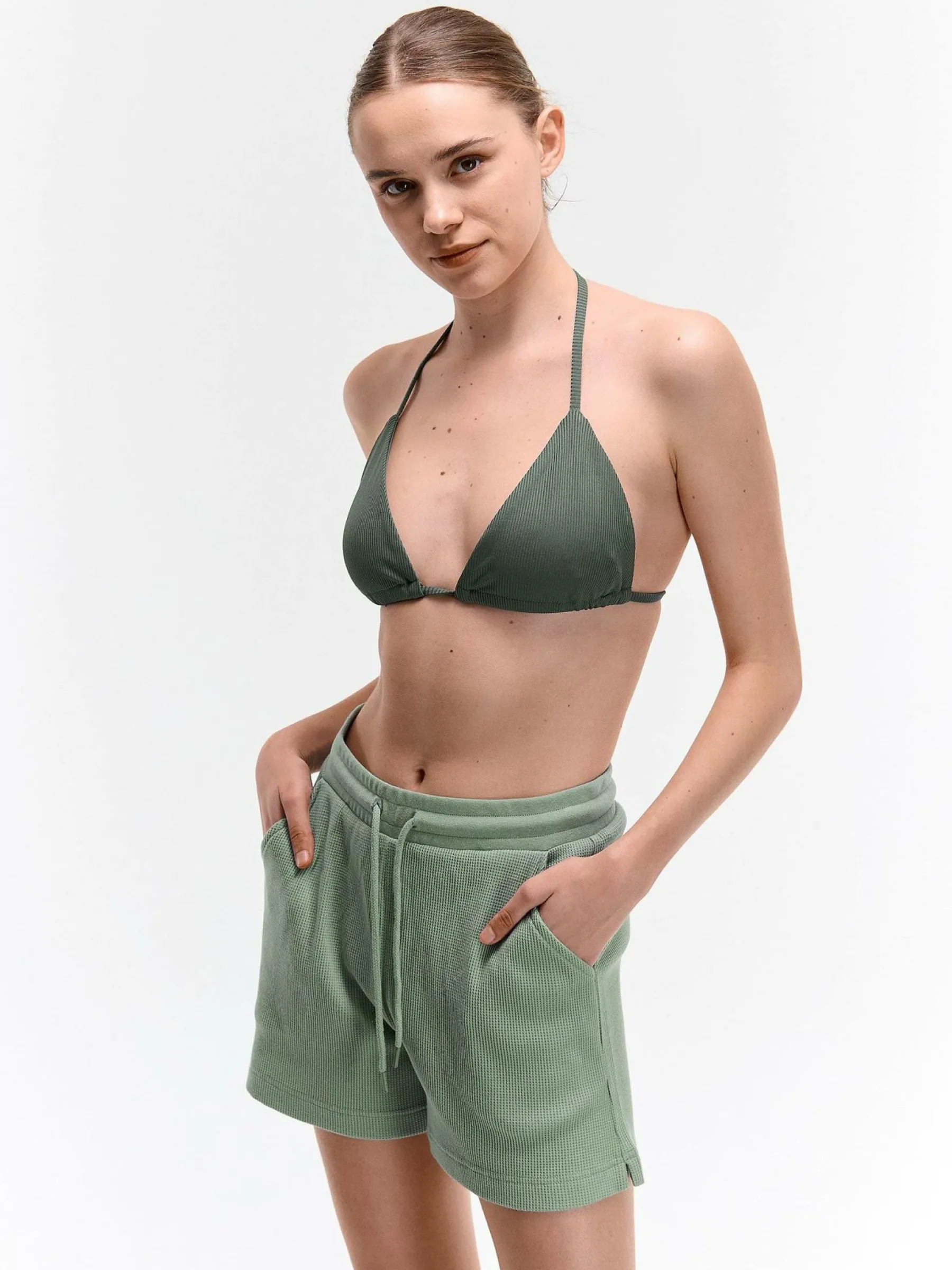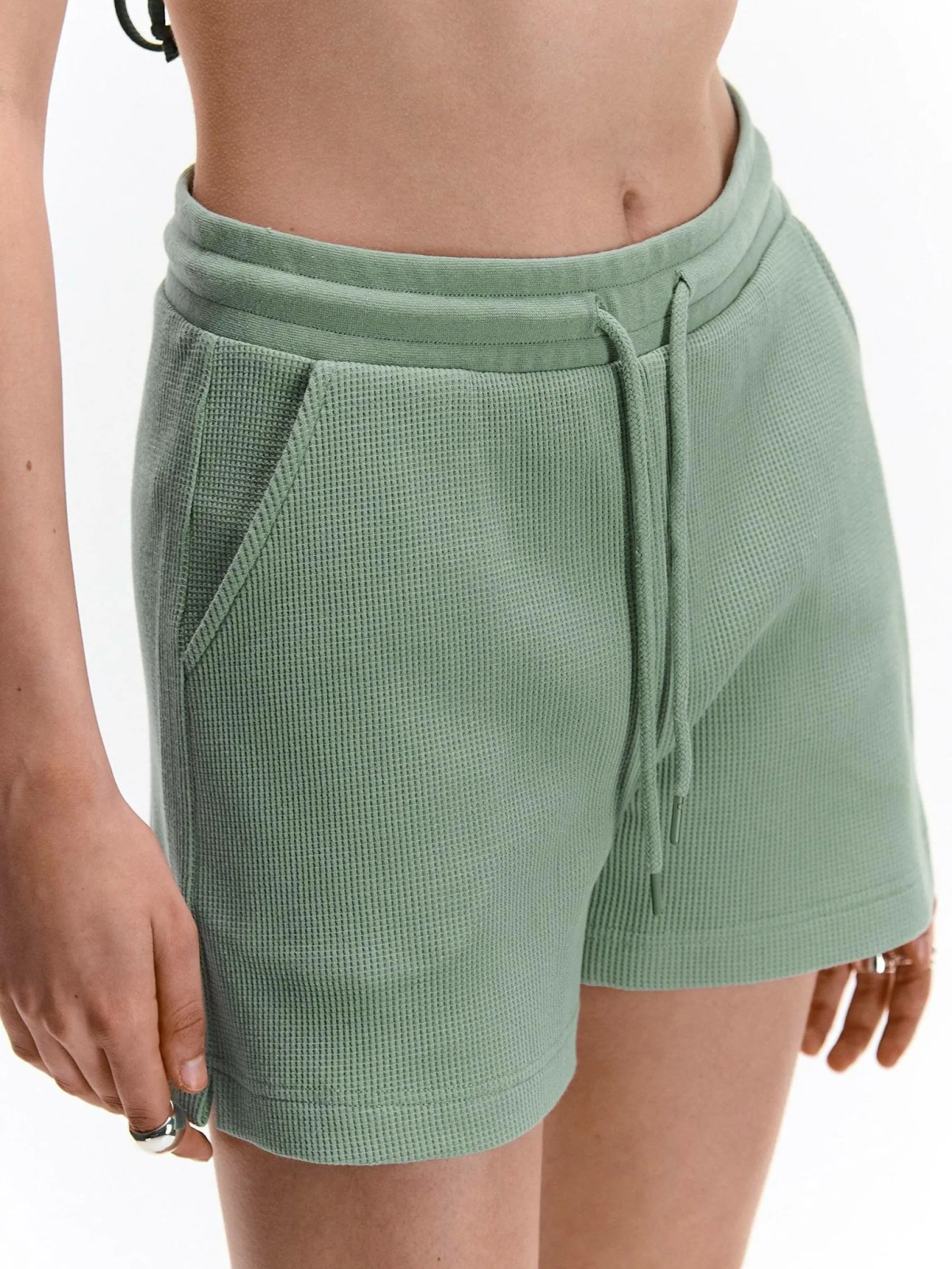 Kolor: zielonyKrój: straightTyp: spodenkiDługość: krótkiPattern style: pojedynczy kolor, strukturowaneDetal: ze szn…