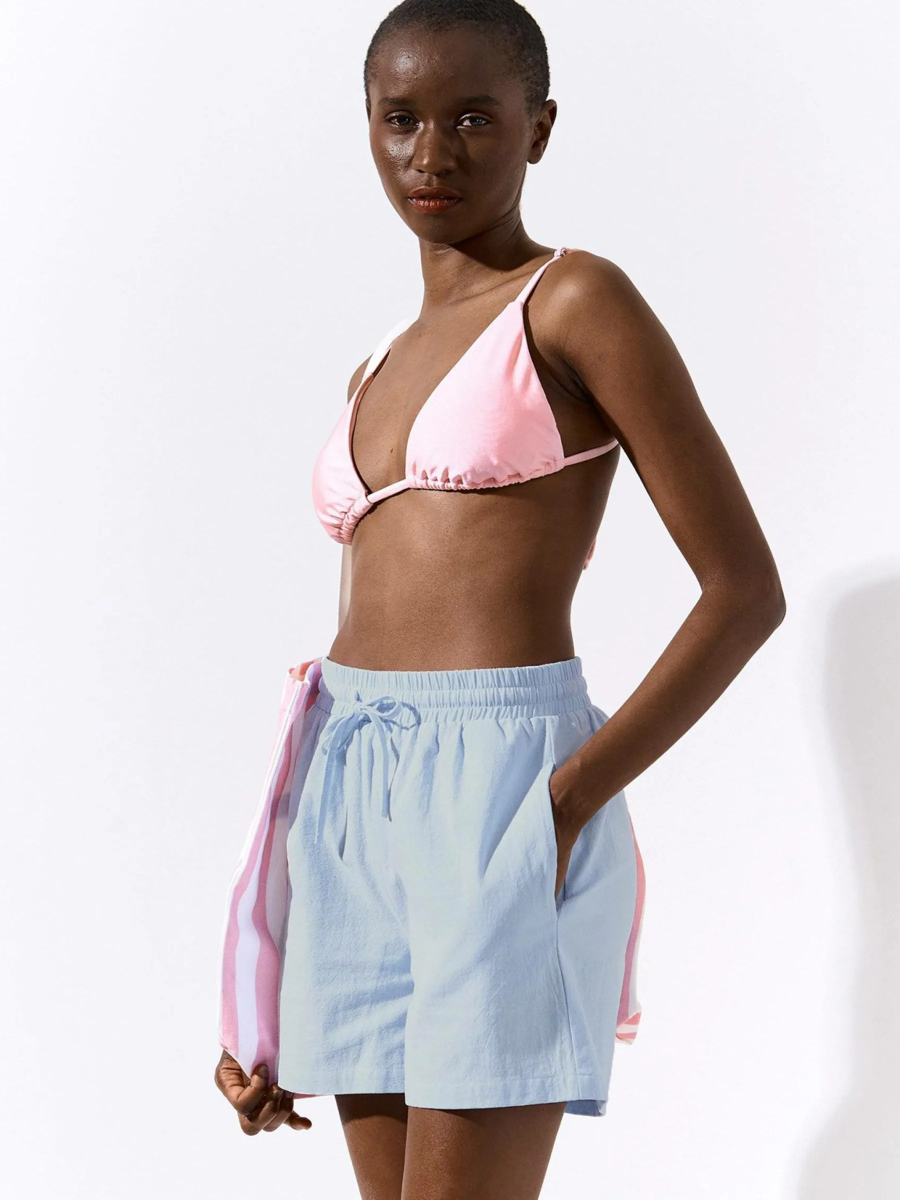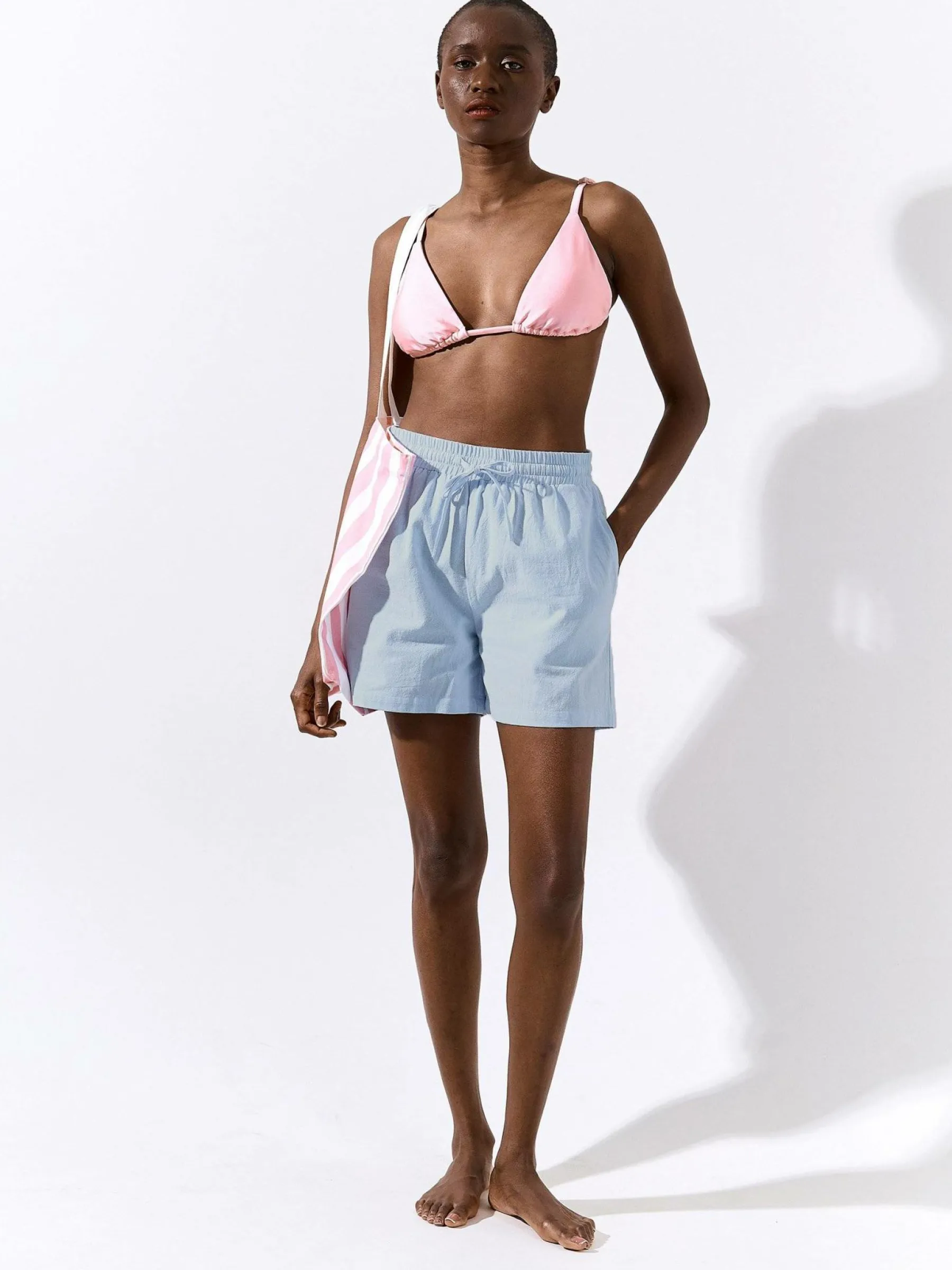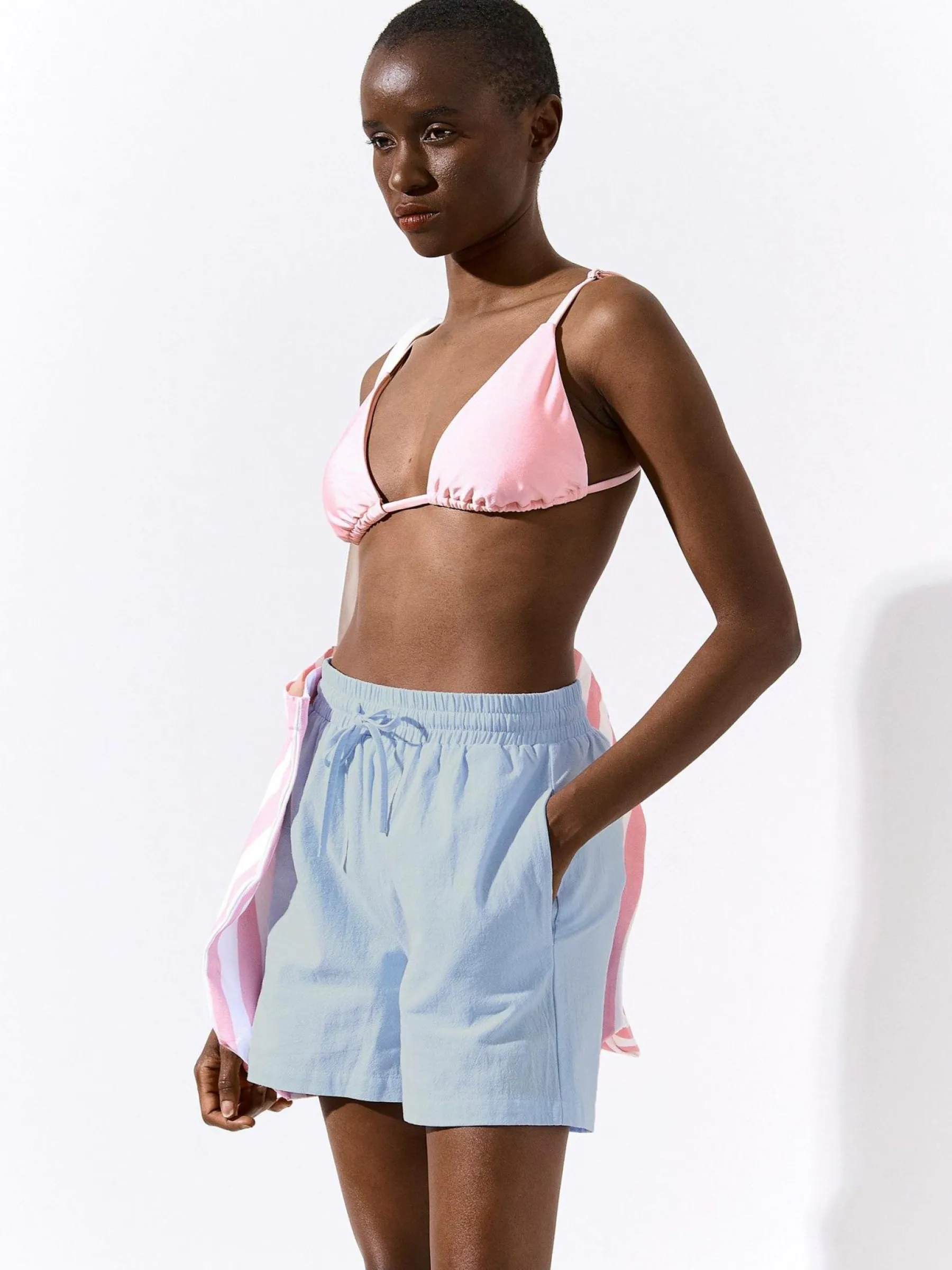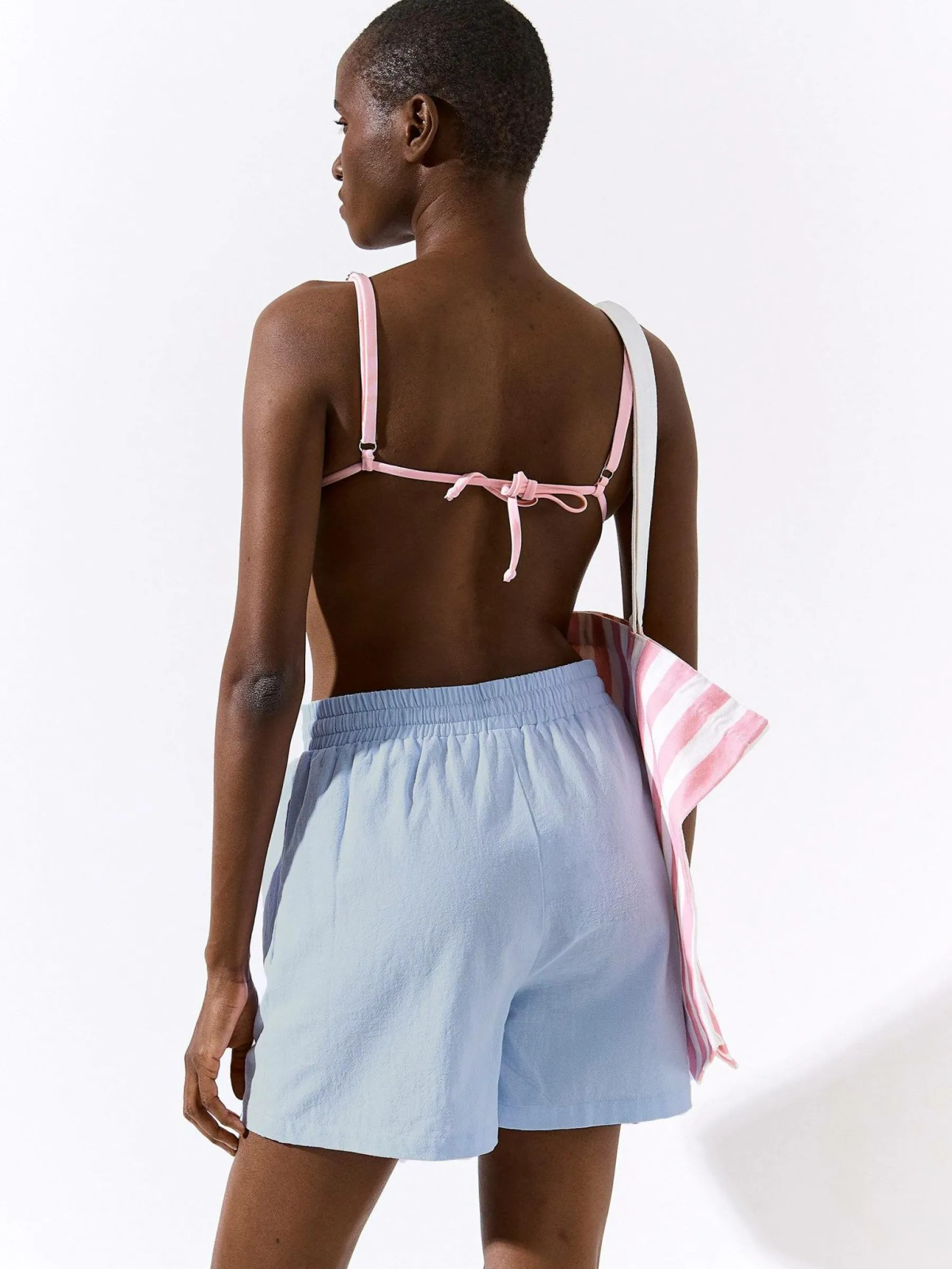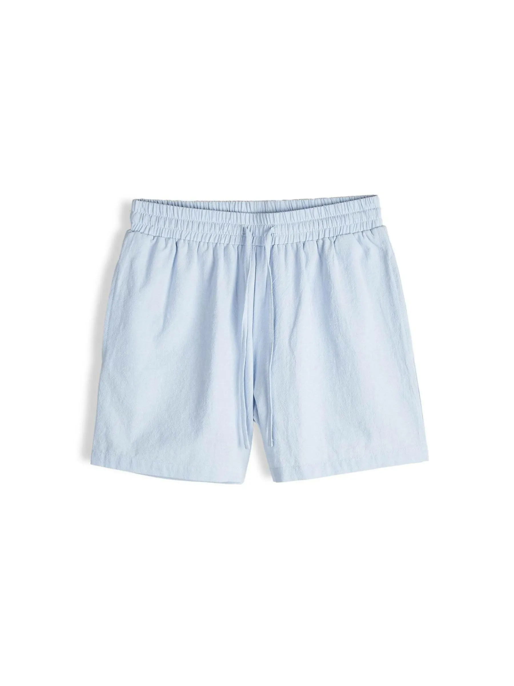 Kolor: niebieskiKrój: straightTyp: spodenkiDługość: krótkiPattern style: pojedynczy kolorDetal: ze sznurowaniemMate…