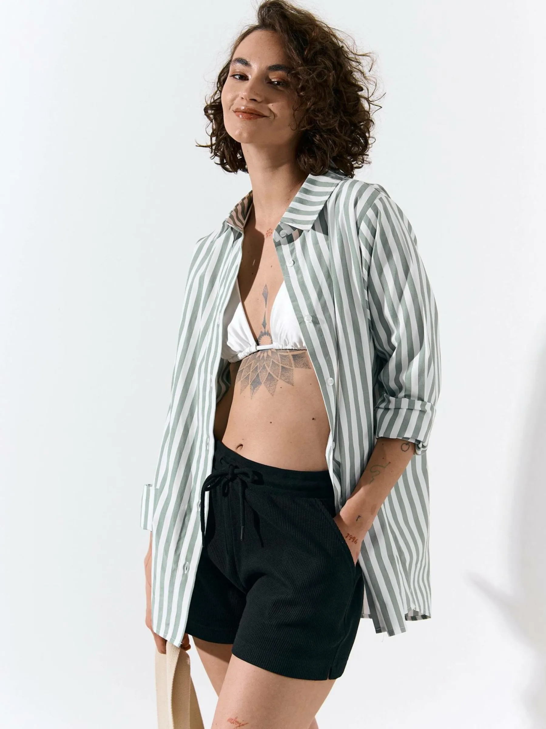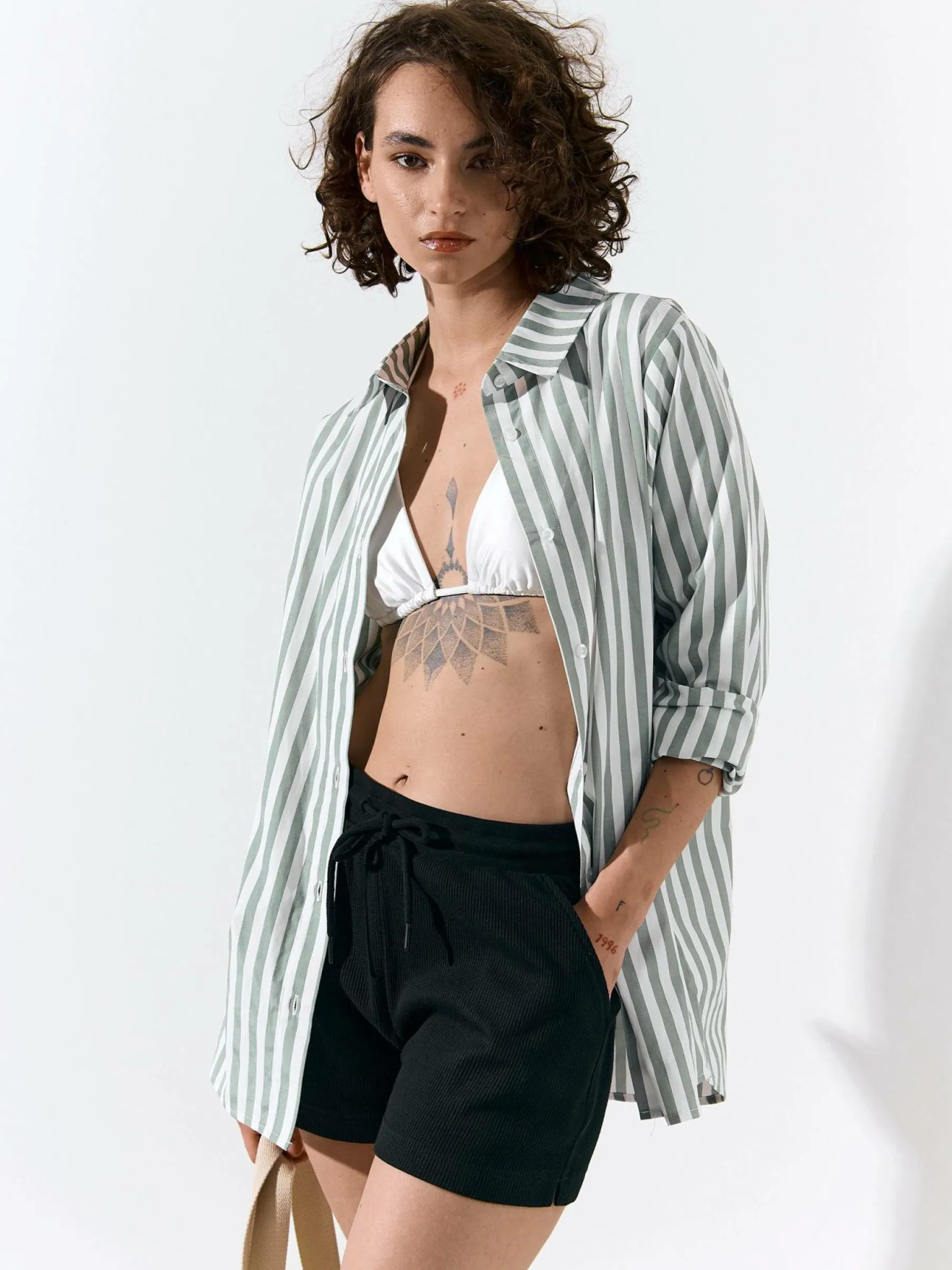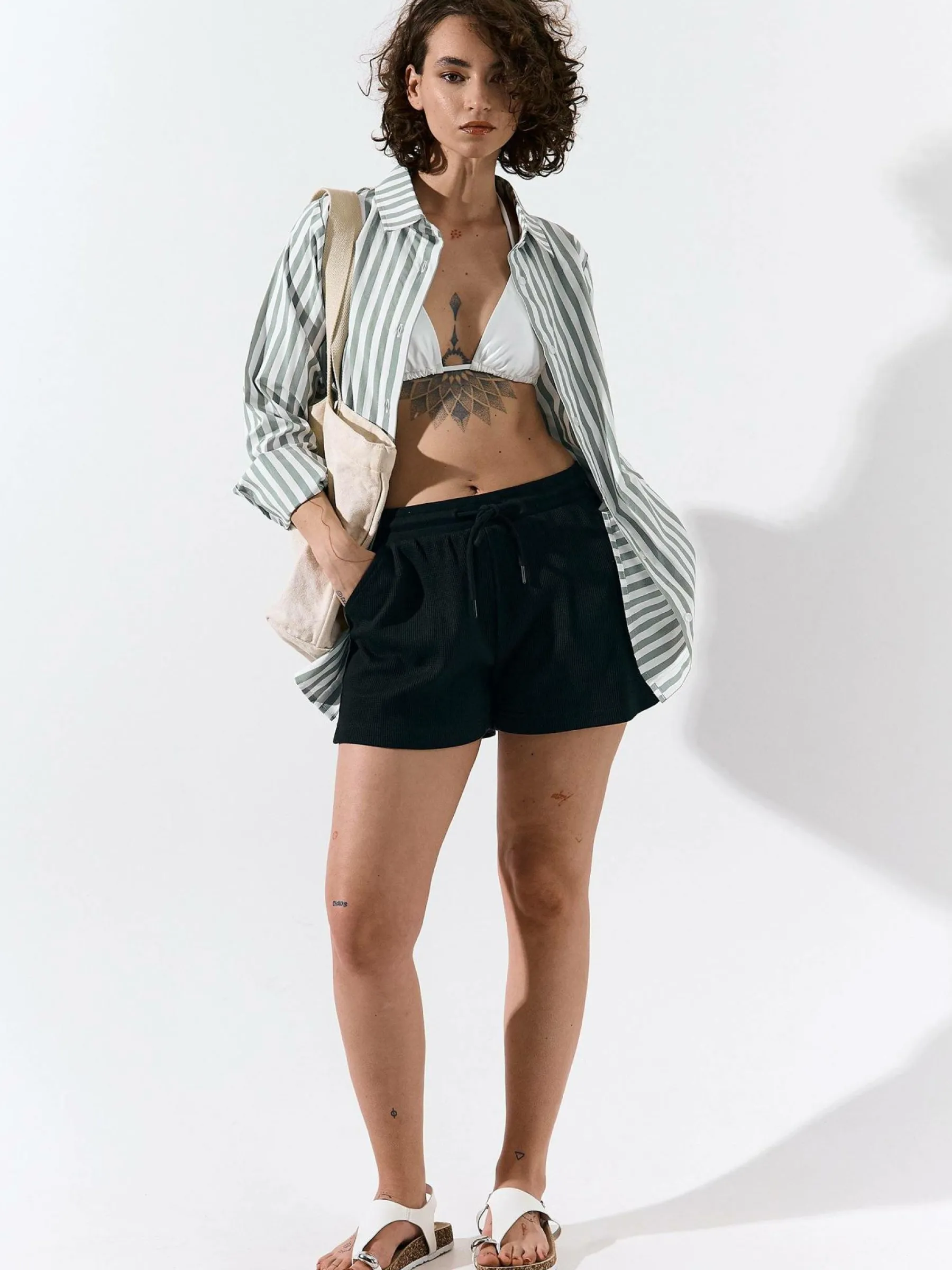 Kolor: czarnyKrój: straightTyp: spodenkiDługość: krótkiPattern style: pojedynczy kolor, strukturowaneDetal: ze sznu…