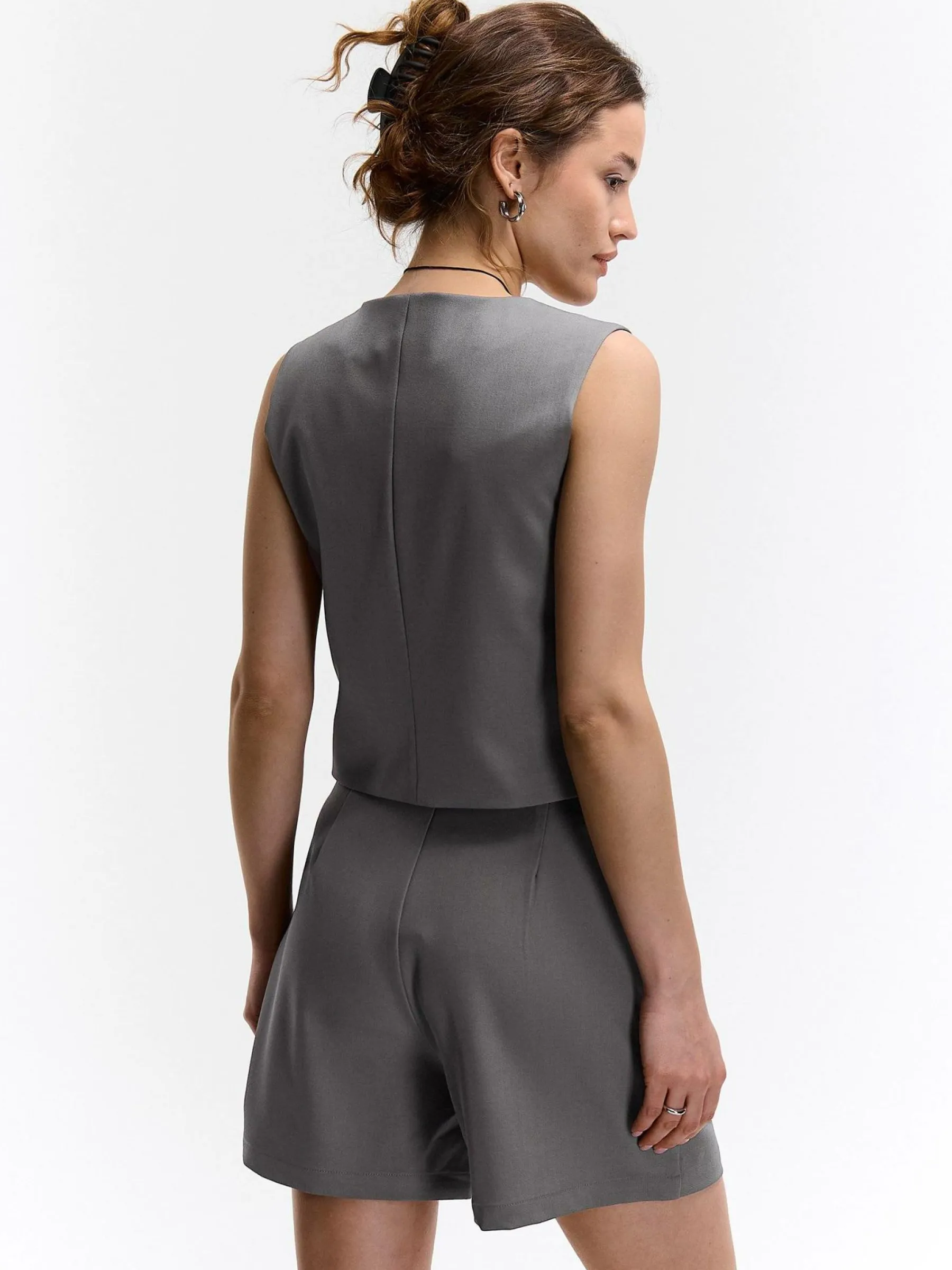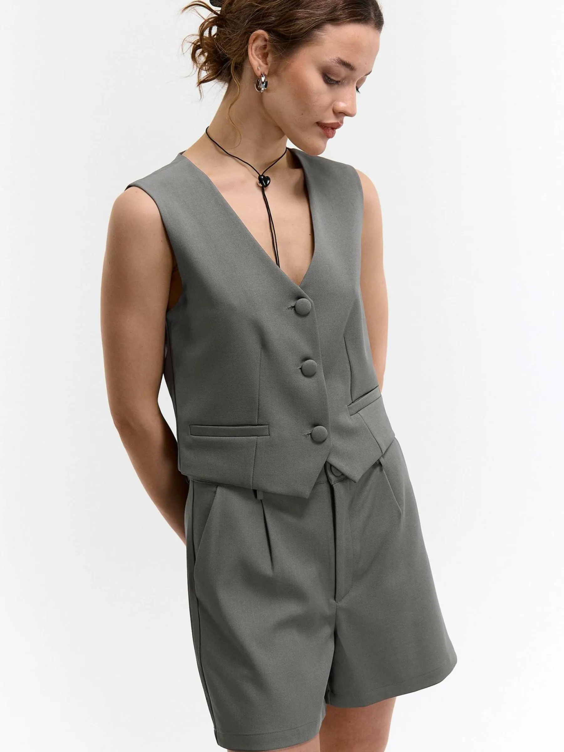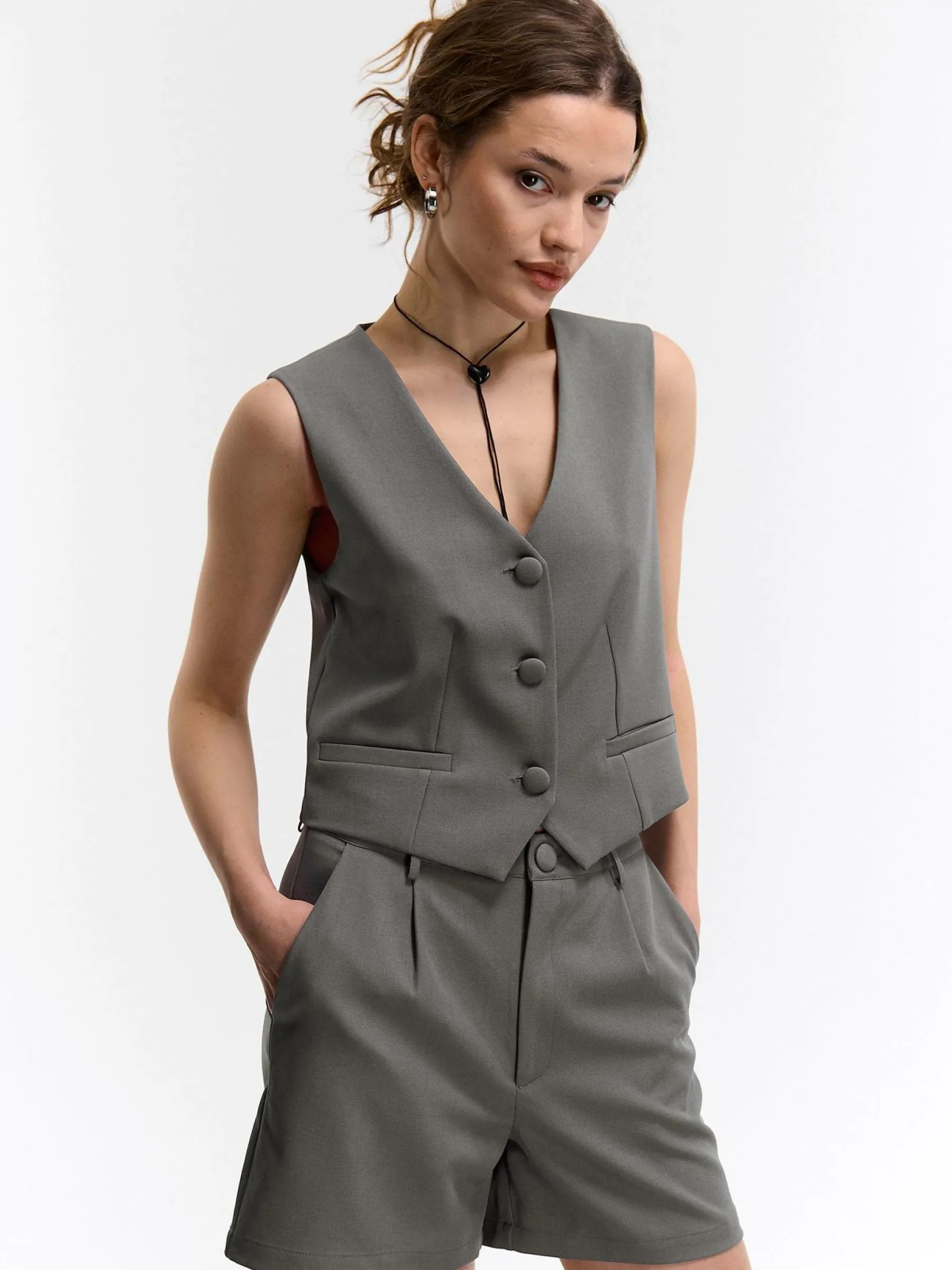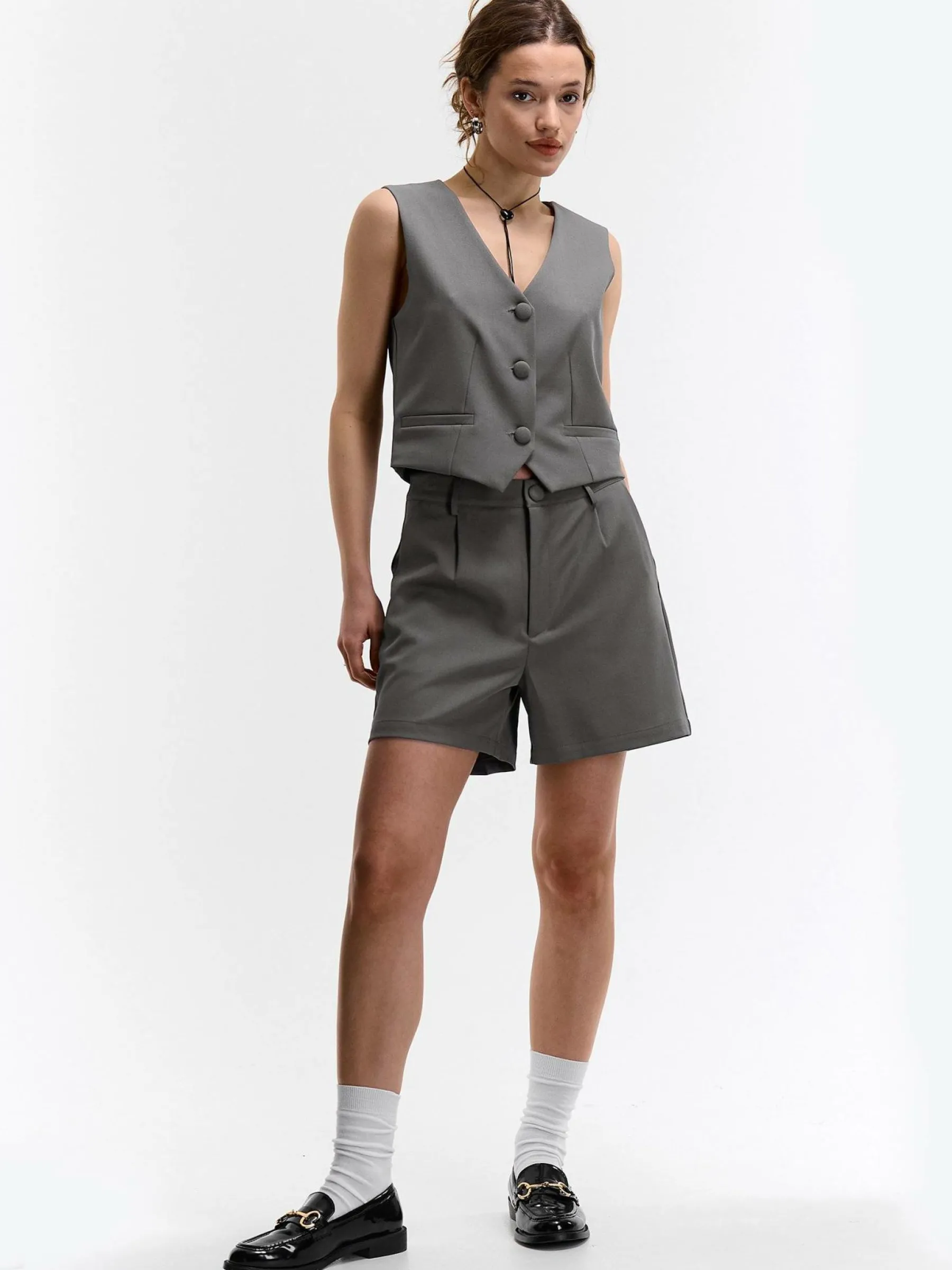 Kolor: szaryKrój: straightTyp: spodenkiDługość: krótkiPattern style: pojedynczy kolorDetal: na zamekMateriał: synt…