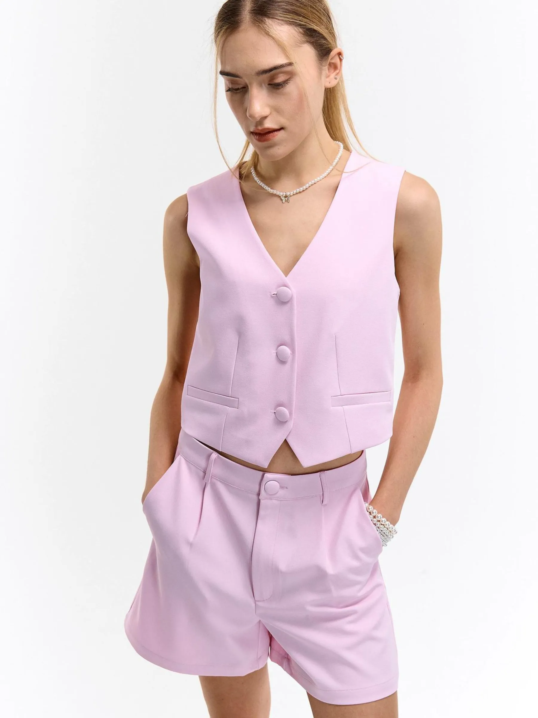 Kolor: różowyKrój: straightTyp: spodenkiDługość: krótkiPattern style: pojedynczy kolorDetal: na zamek, z kieszeni…