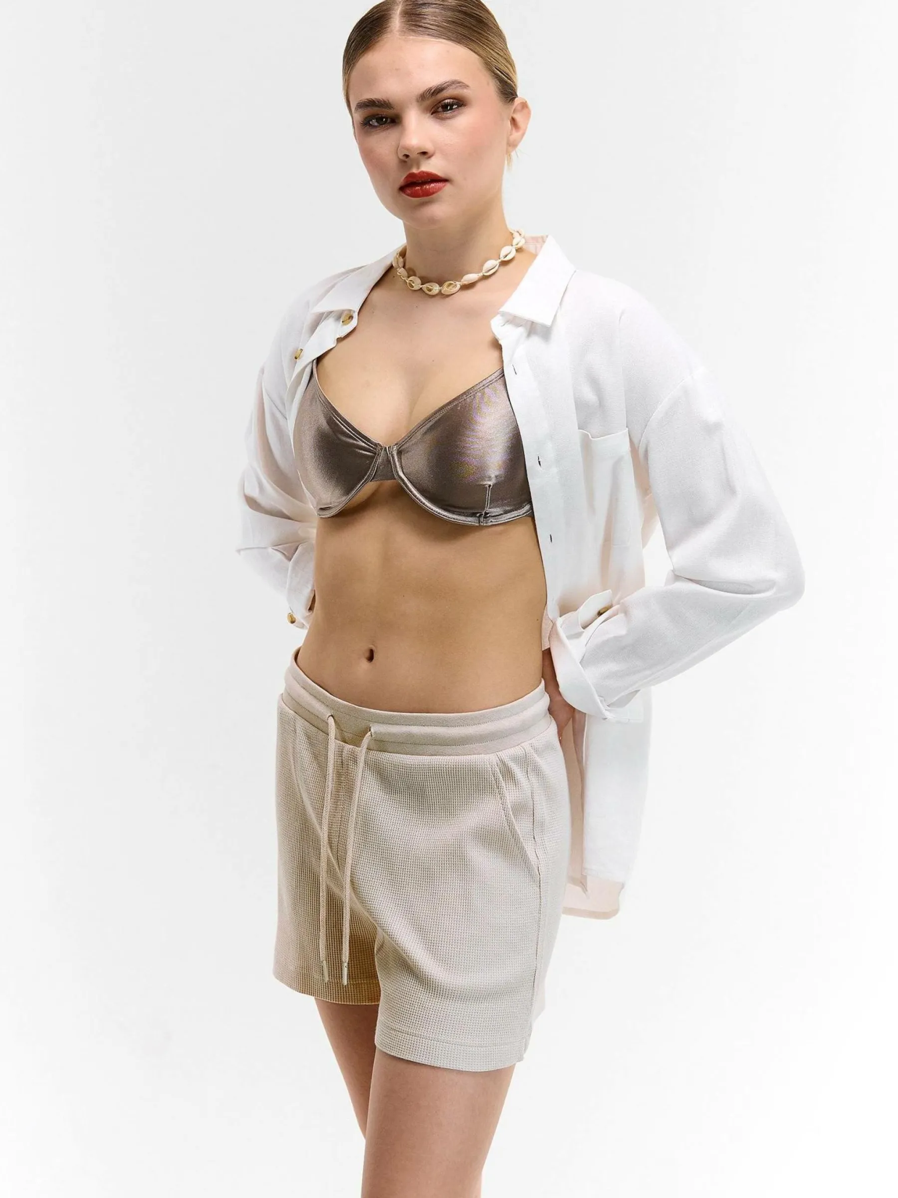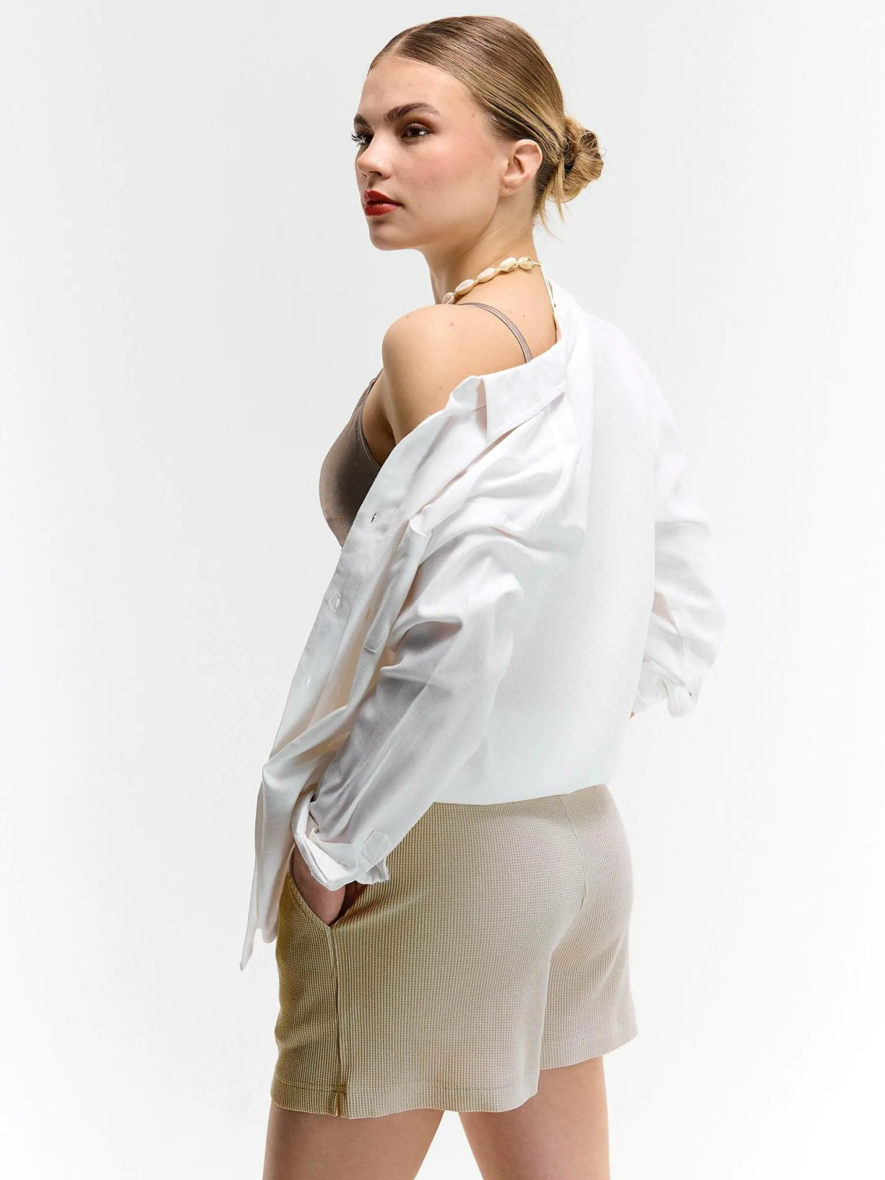 Kolor: beżowyKrój: straightTyp: spodenkiDługość: krótkiPattern style: pojedynczy kolor, strukturowaneDetal: ze szn…