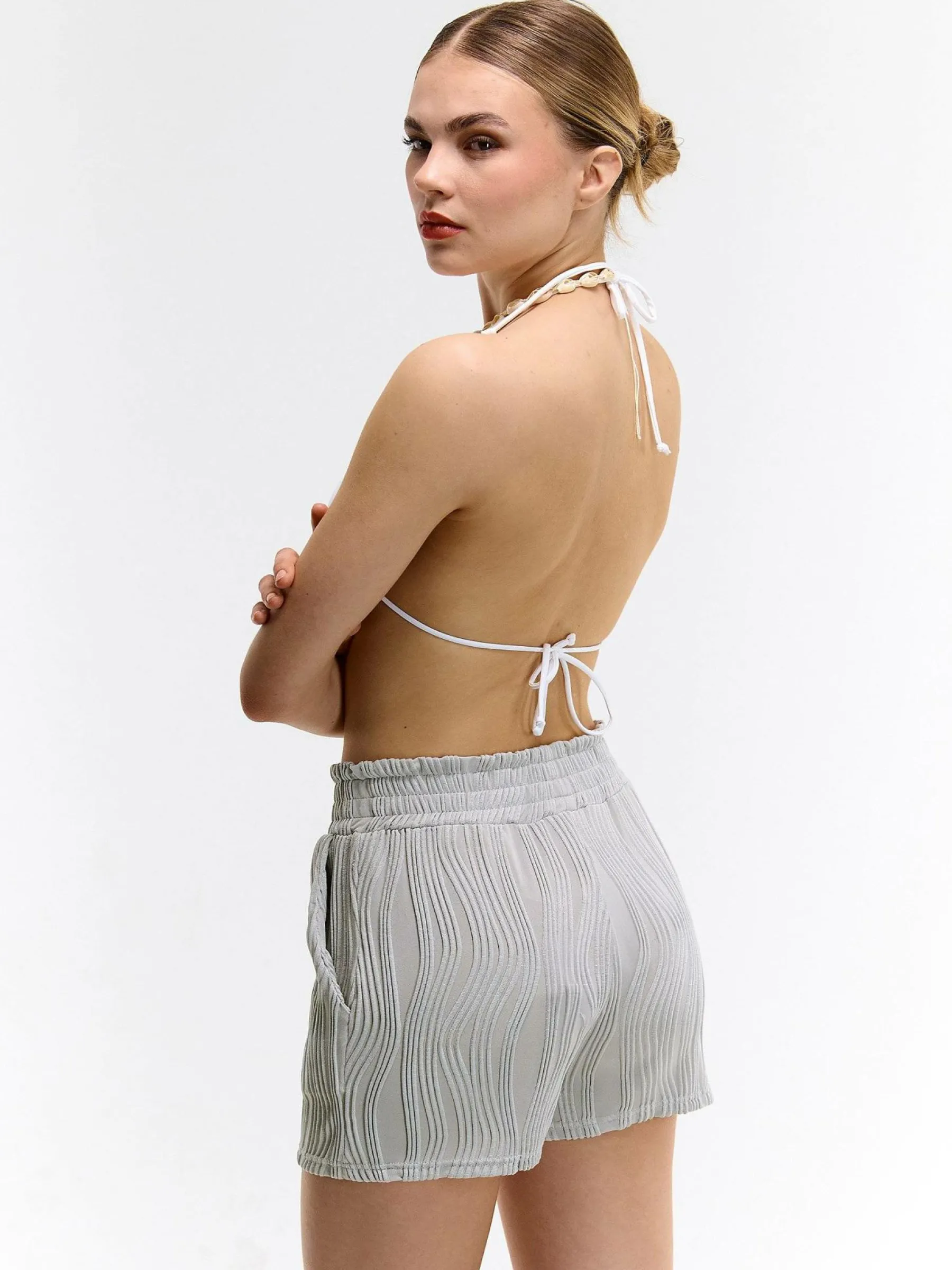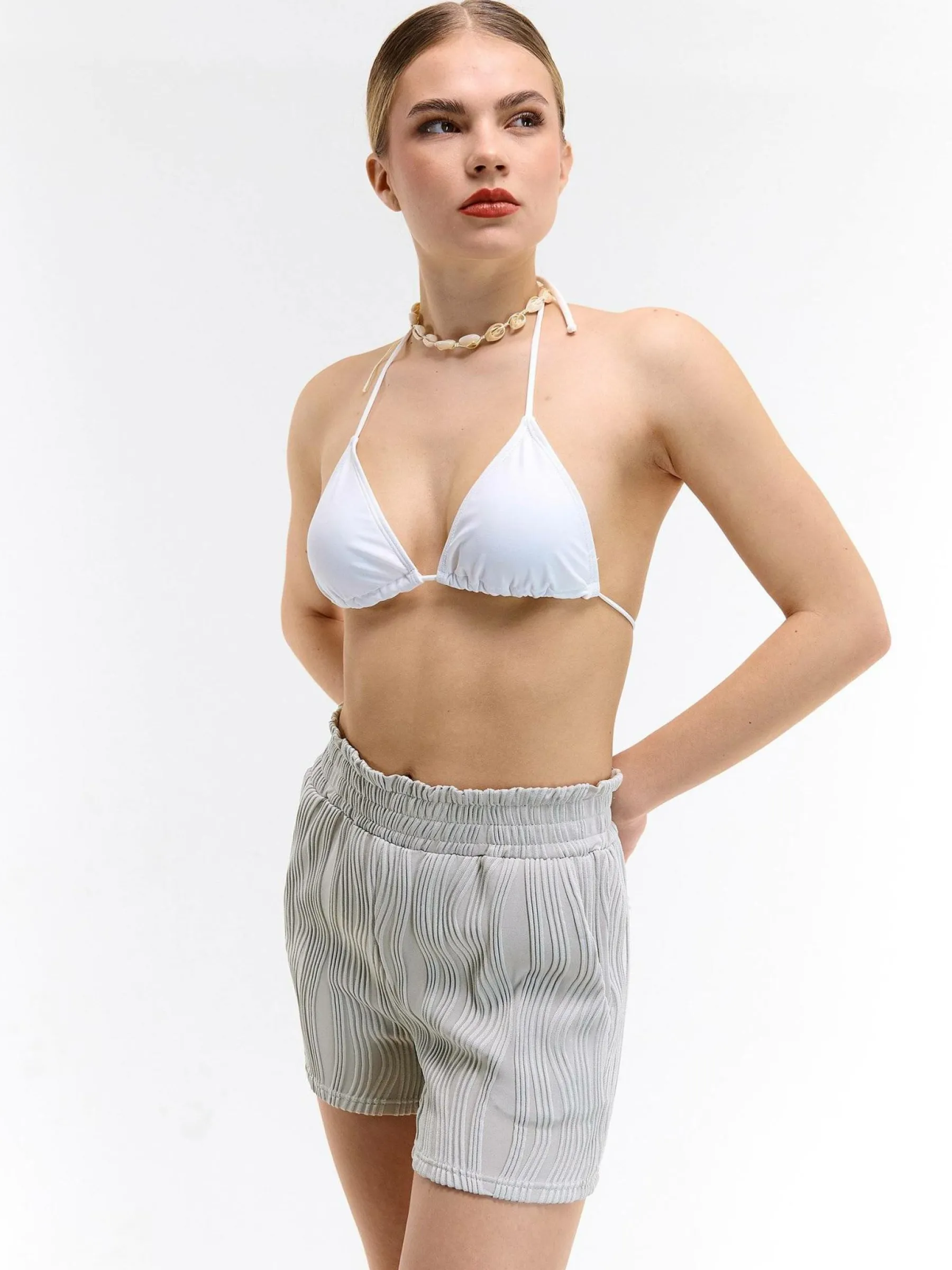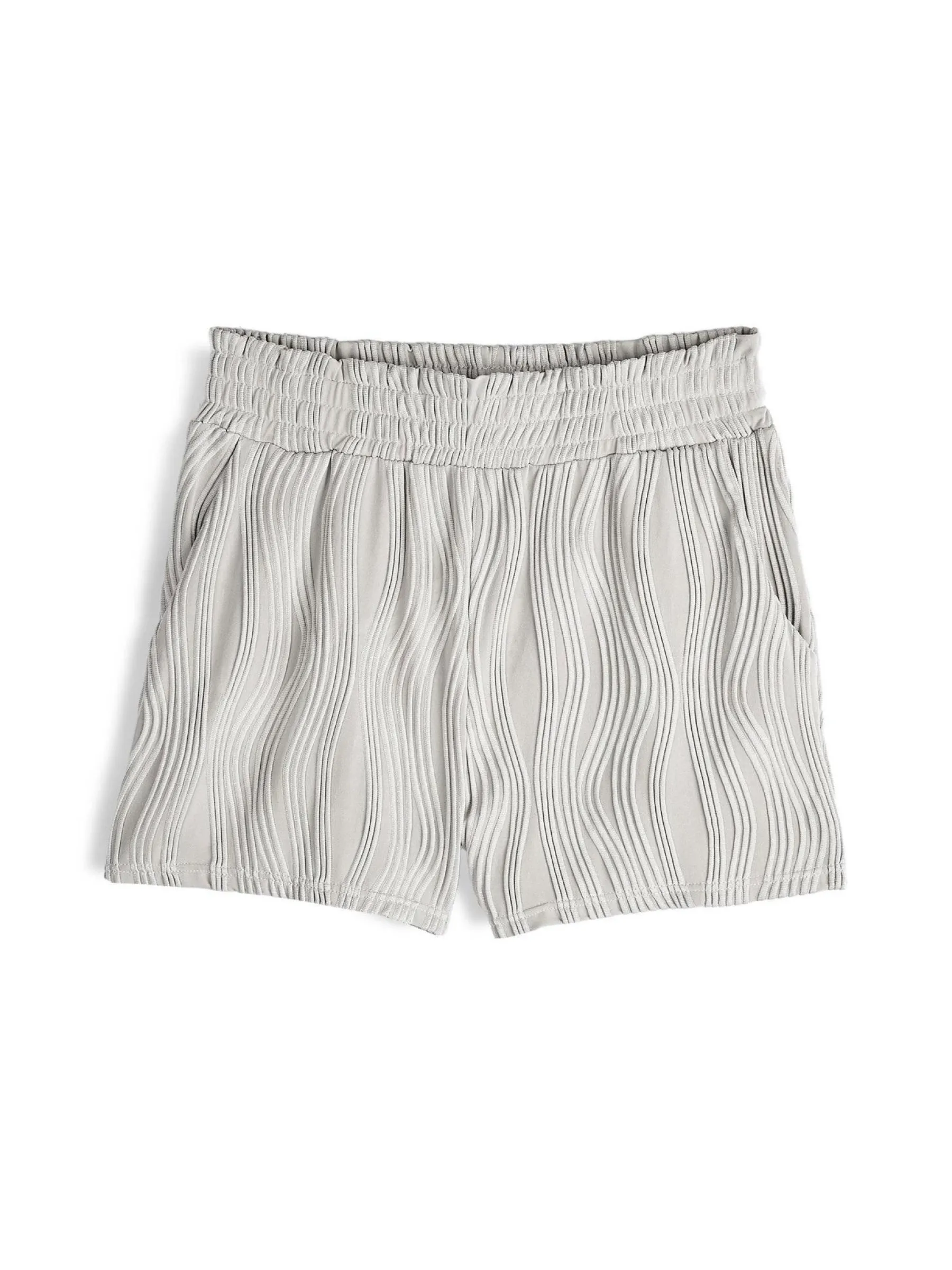 Kolor: szaryKrój: straightTyp: spodenkiDługość: krótkiPattern style: pojedynczy kolor, strukturowaneDetal: z elasty…