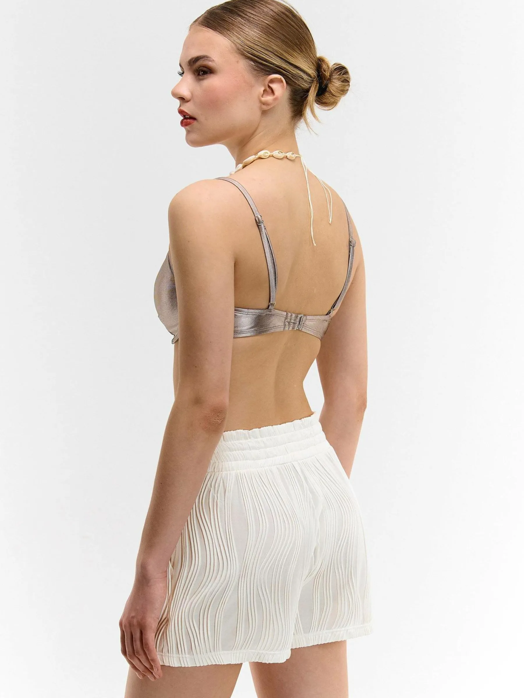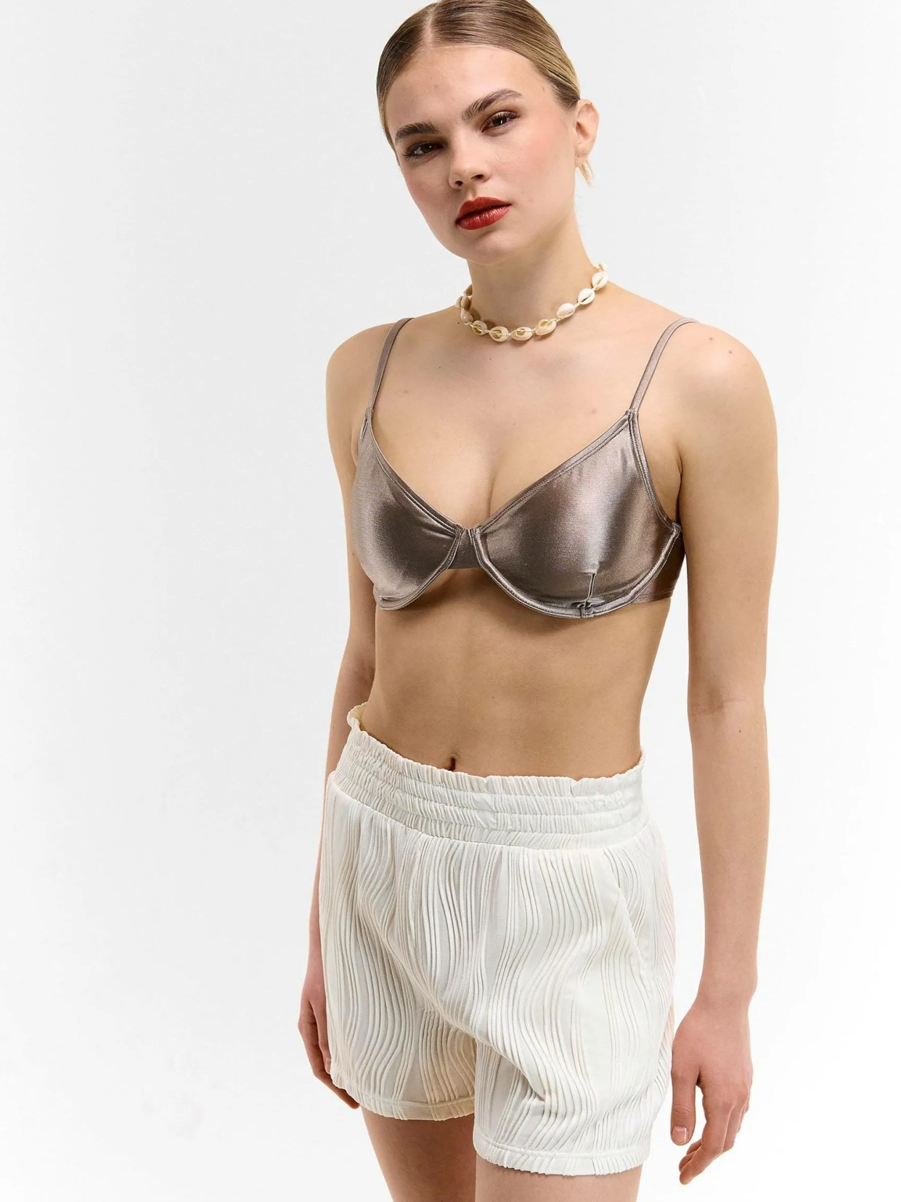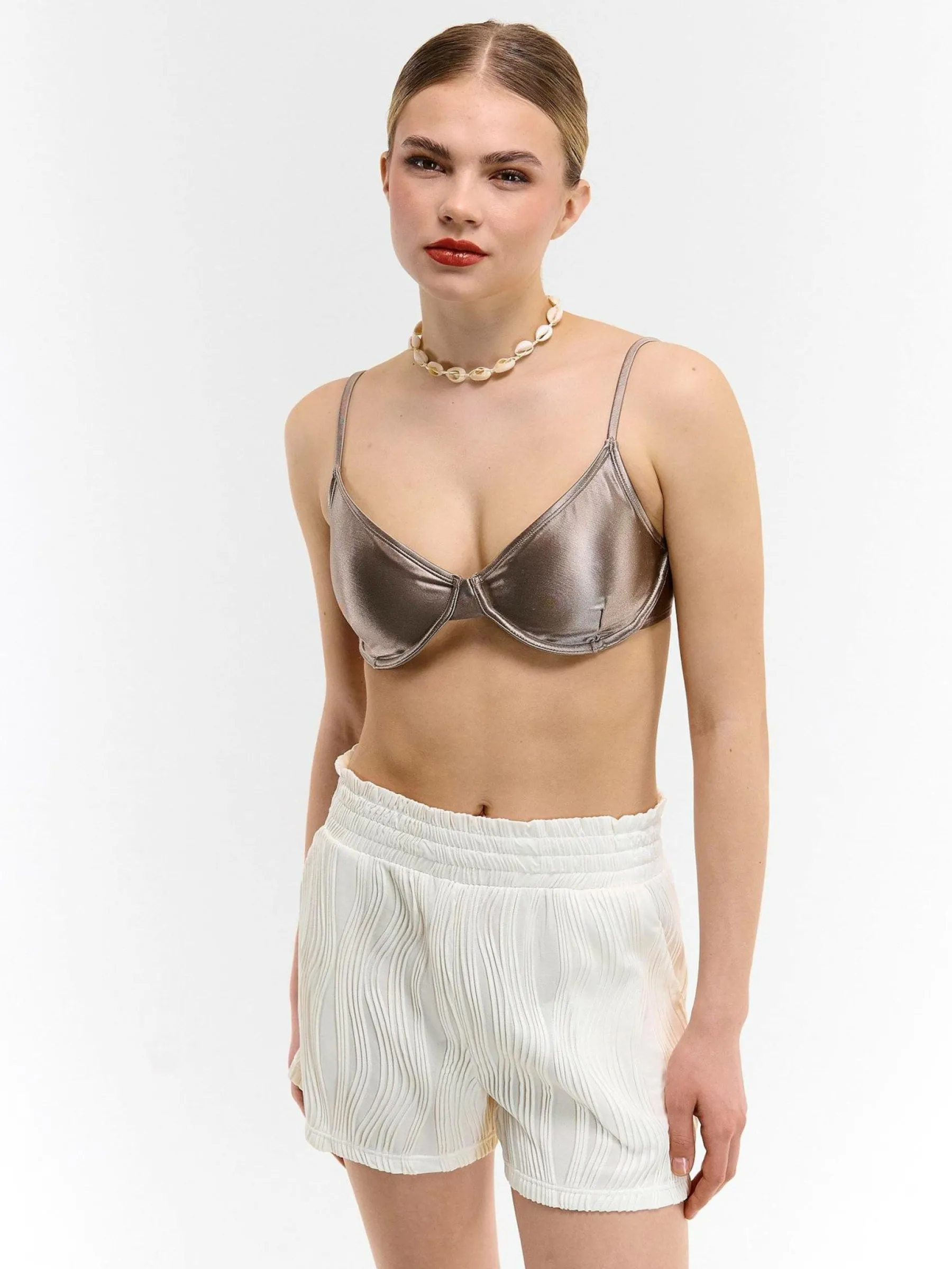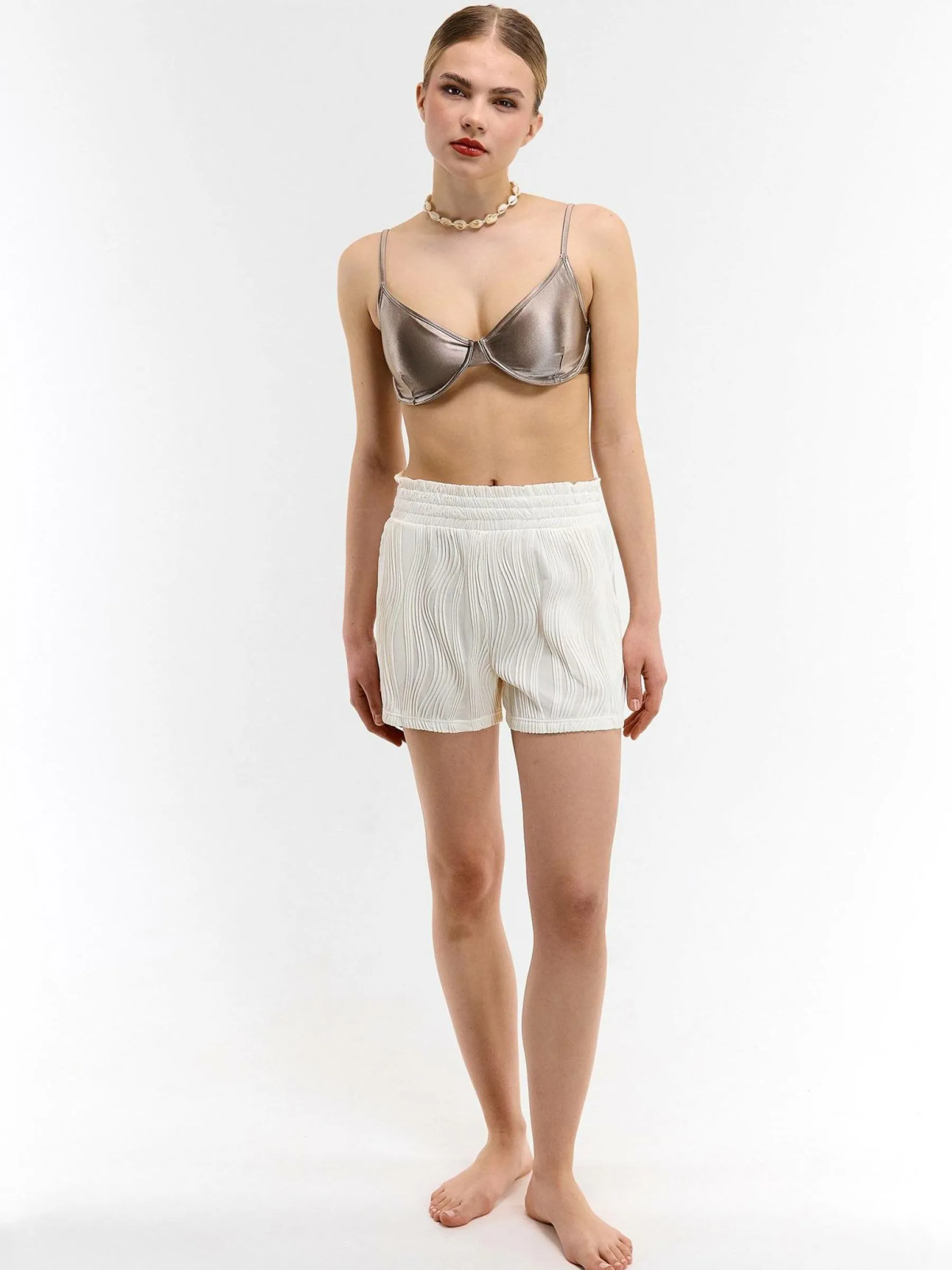 Kolor: beżowyKrój: straightTyp: spodenkiDługość: krótkiPattern style: pojedynczy kolor, strukturowaneDetal: z elas…