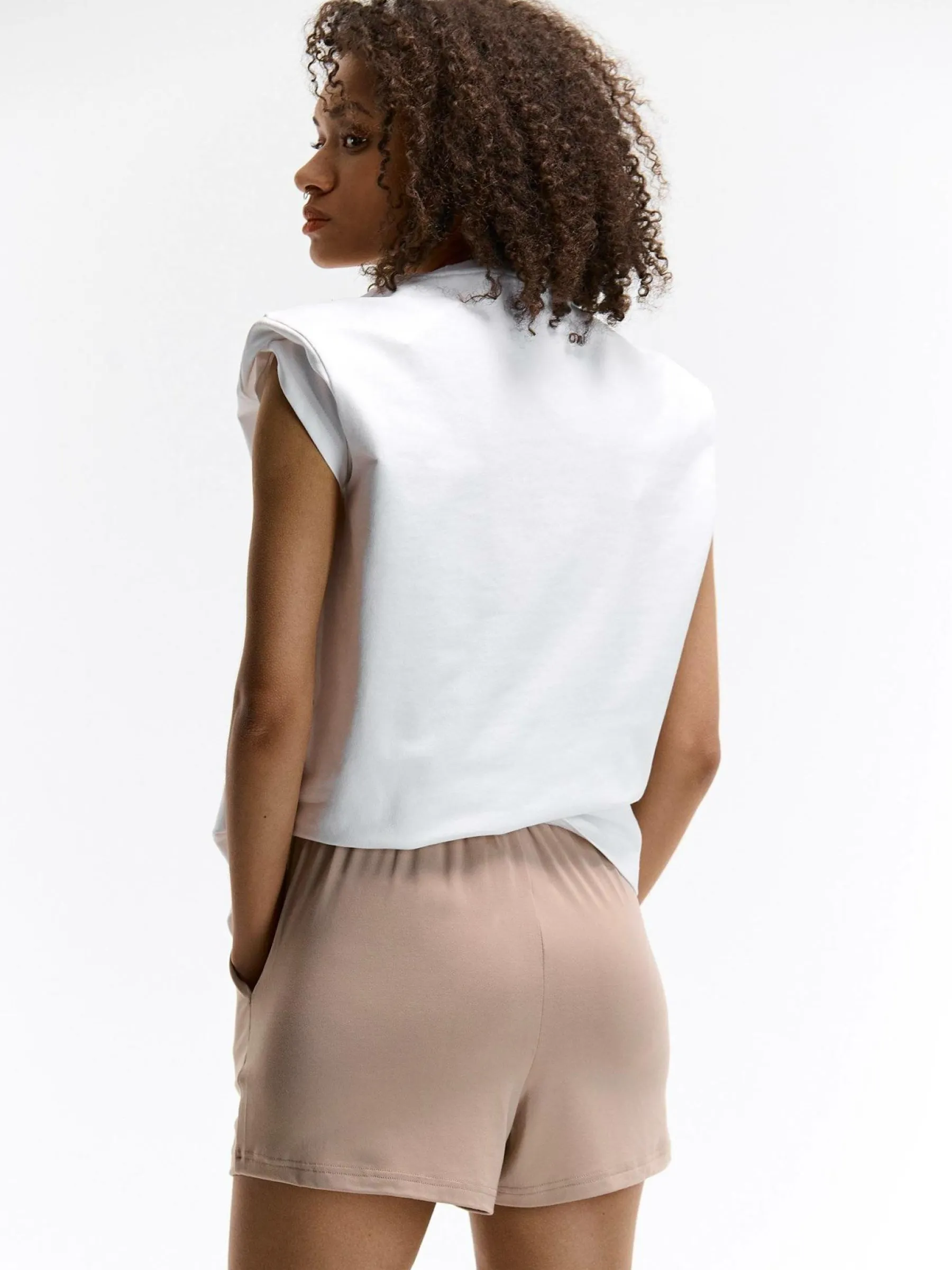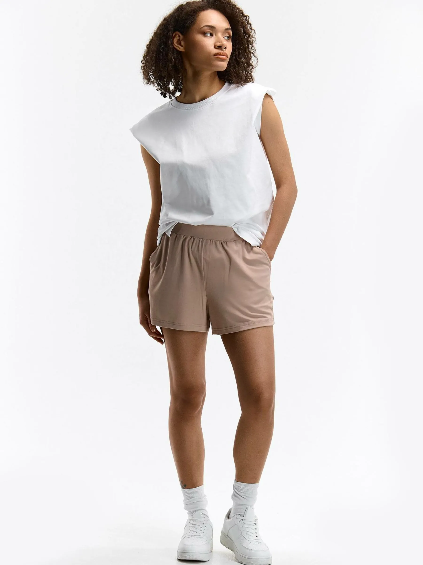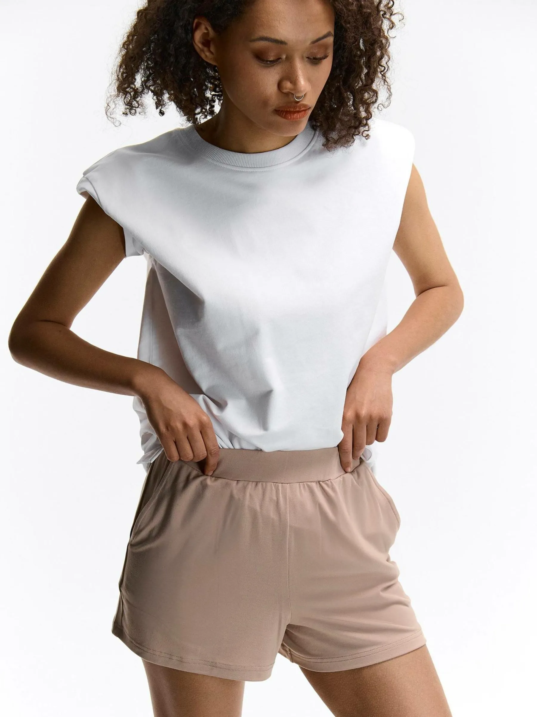 Kolor: beżowyKrój: straightTyp: spodenkiDługość: krótkiPattern style: pojedynczy kolorDetal: z elastyczną opaską…