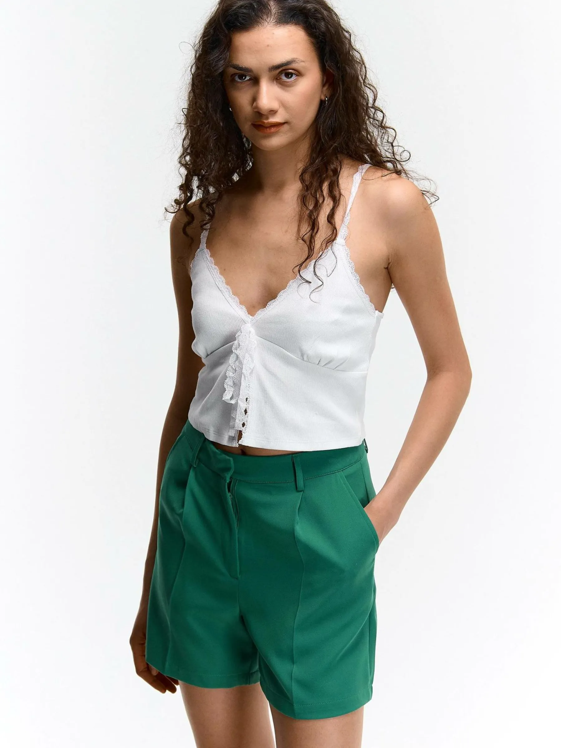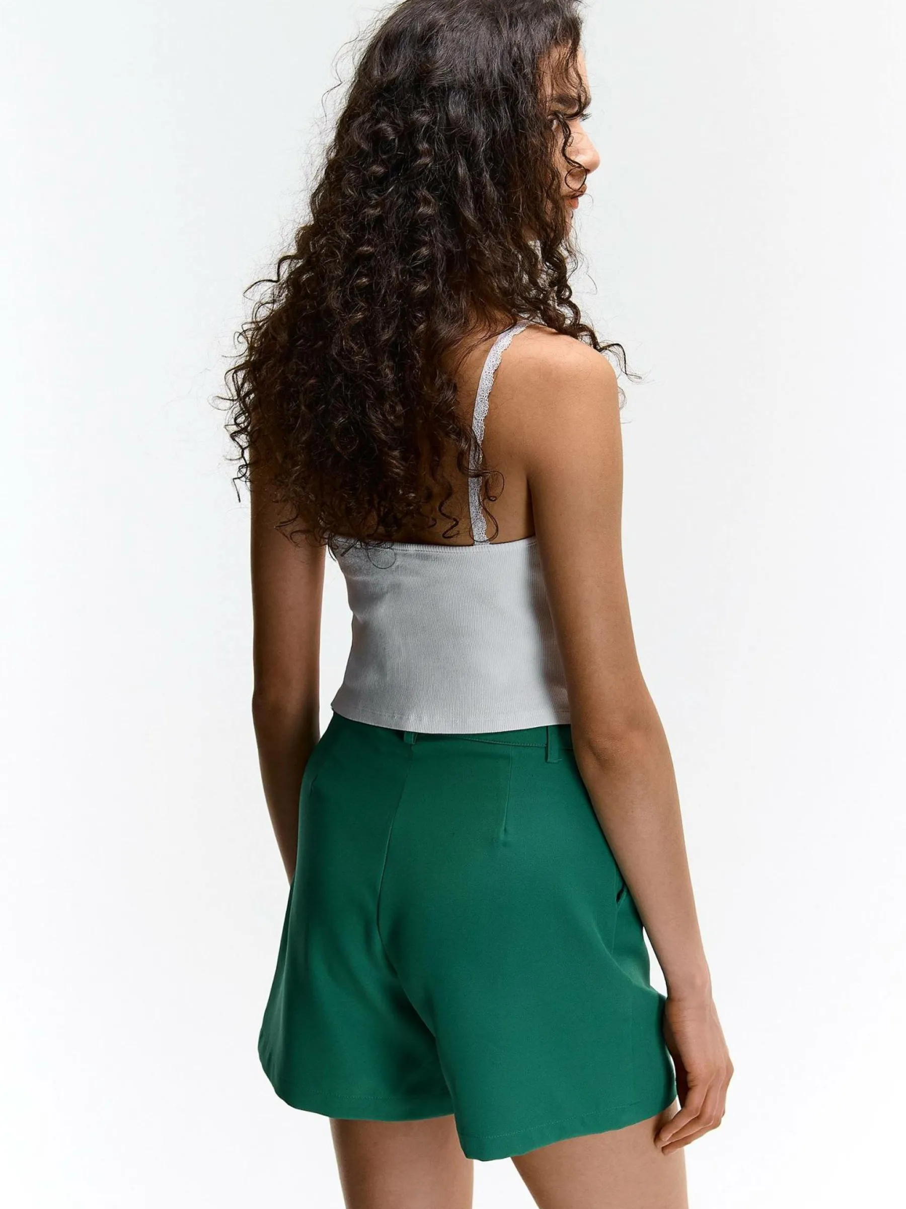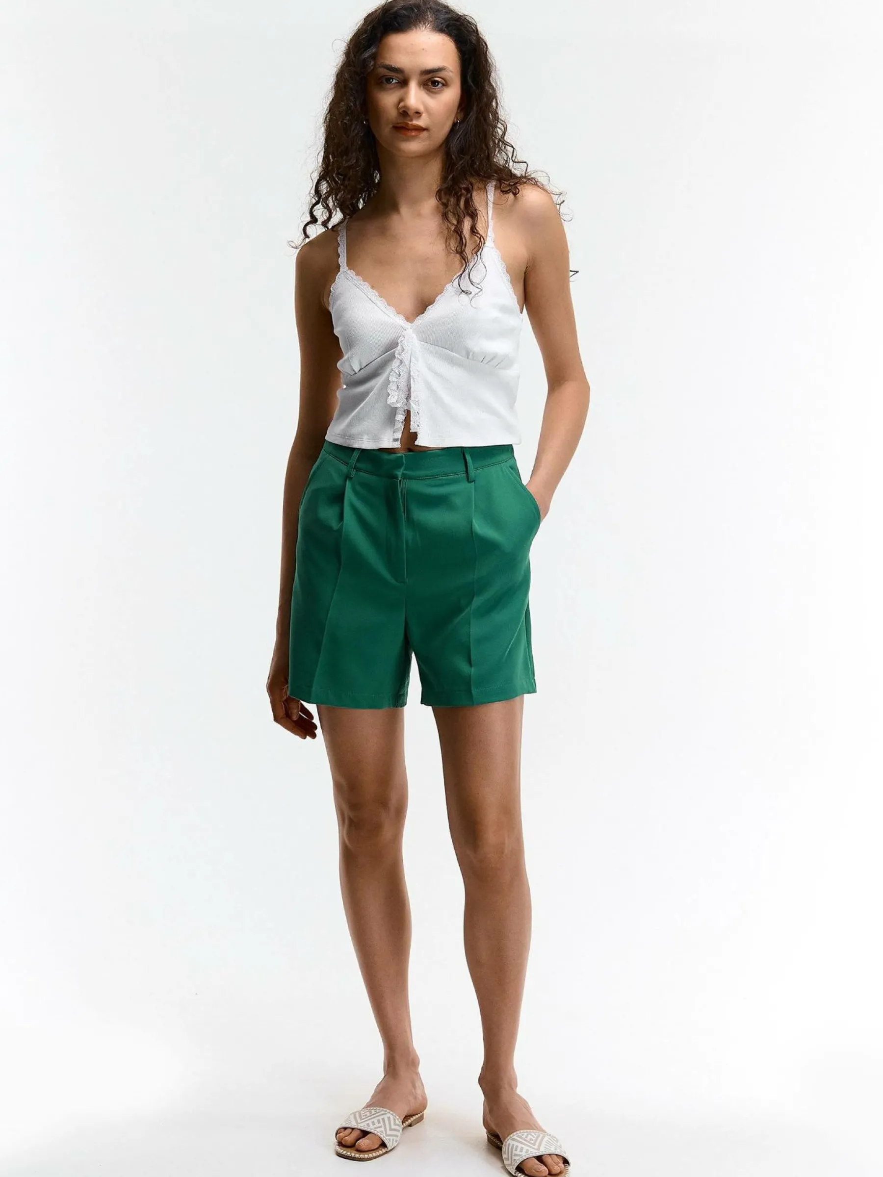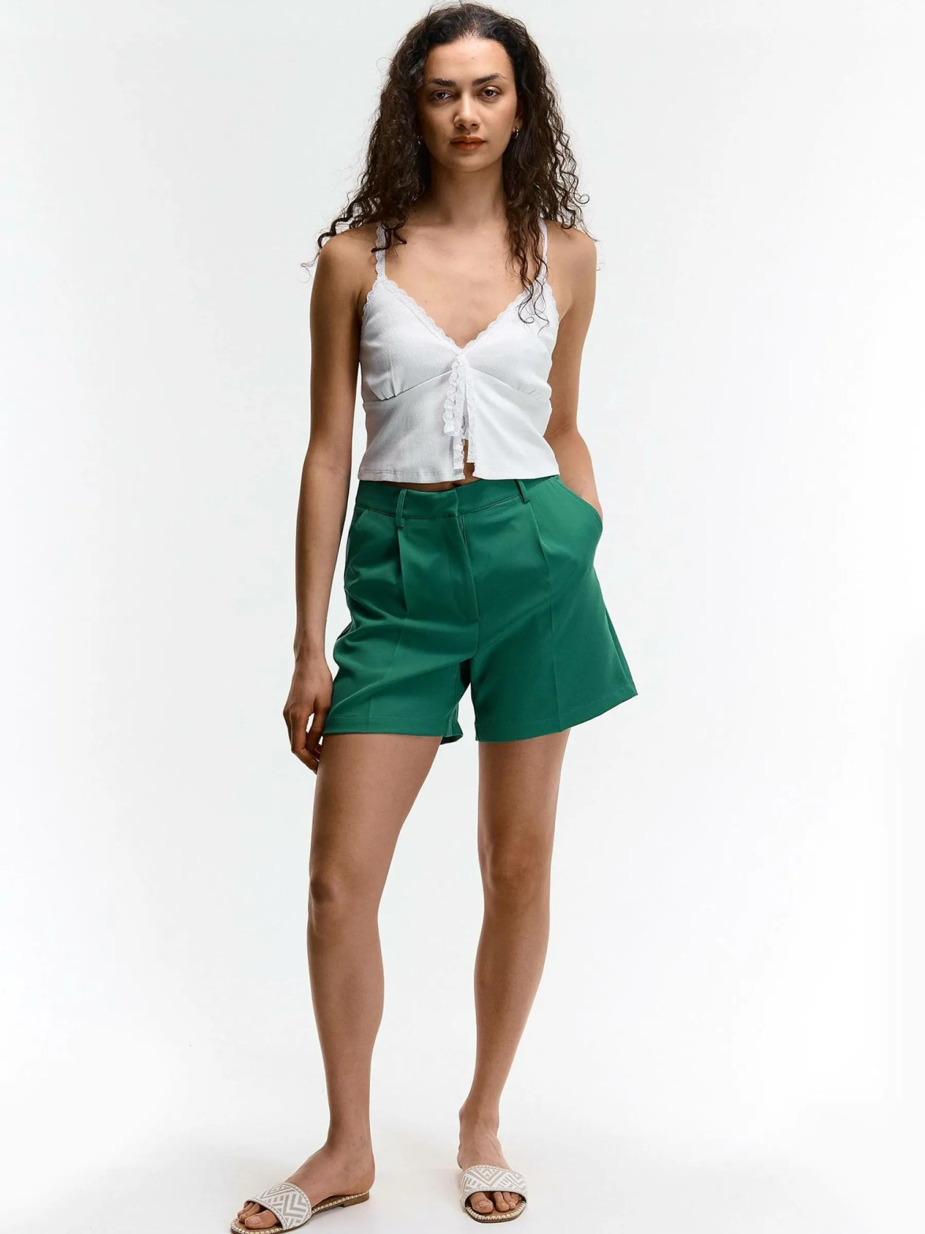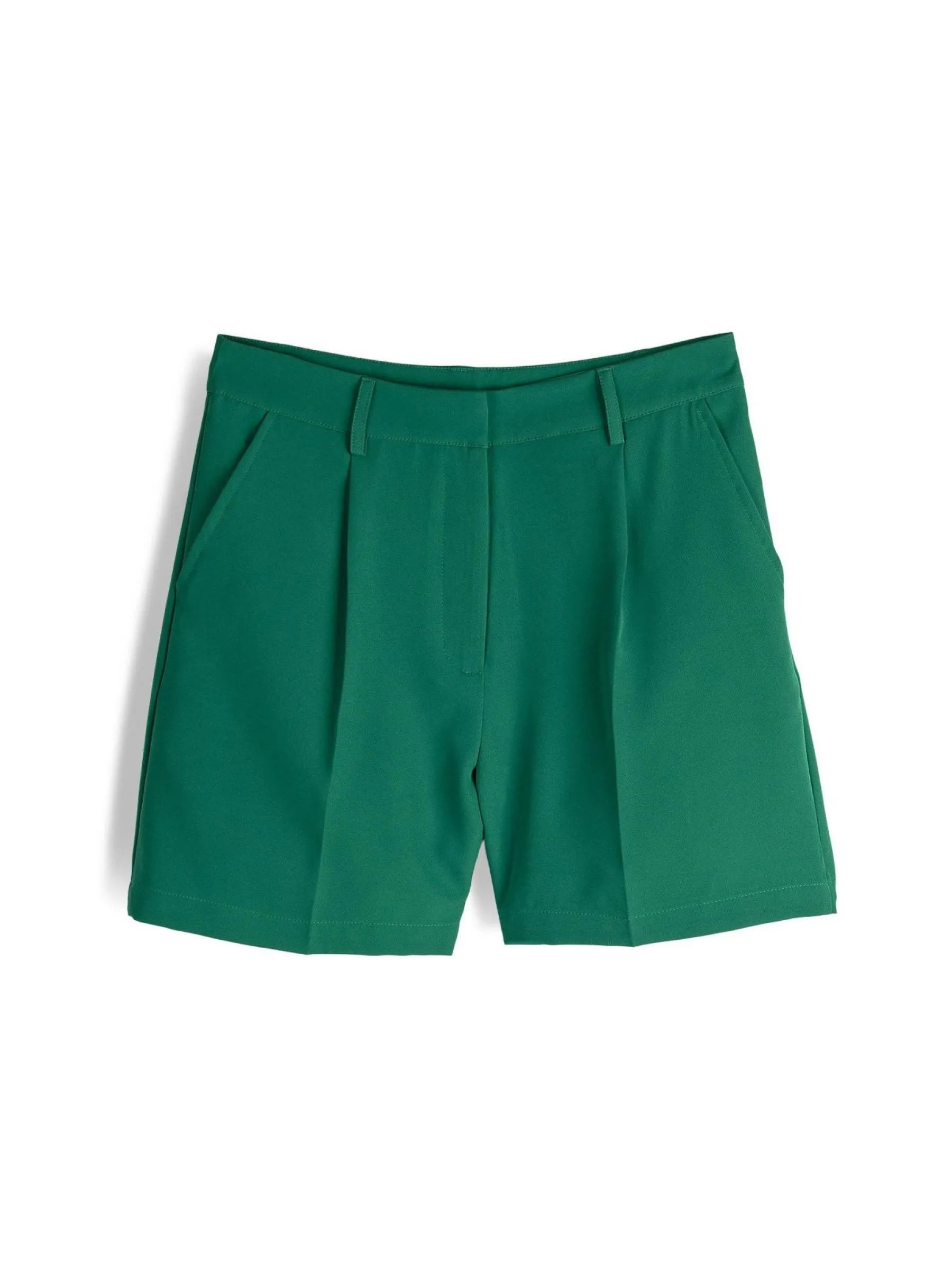 Kolor: zielonyKrój: straight, z wysokim stanemTyp: spodenkiDługość: krótkiPattern style: pojedynczy kolorDetal: na …
