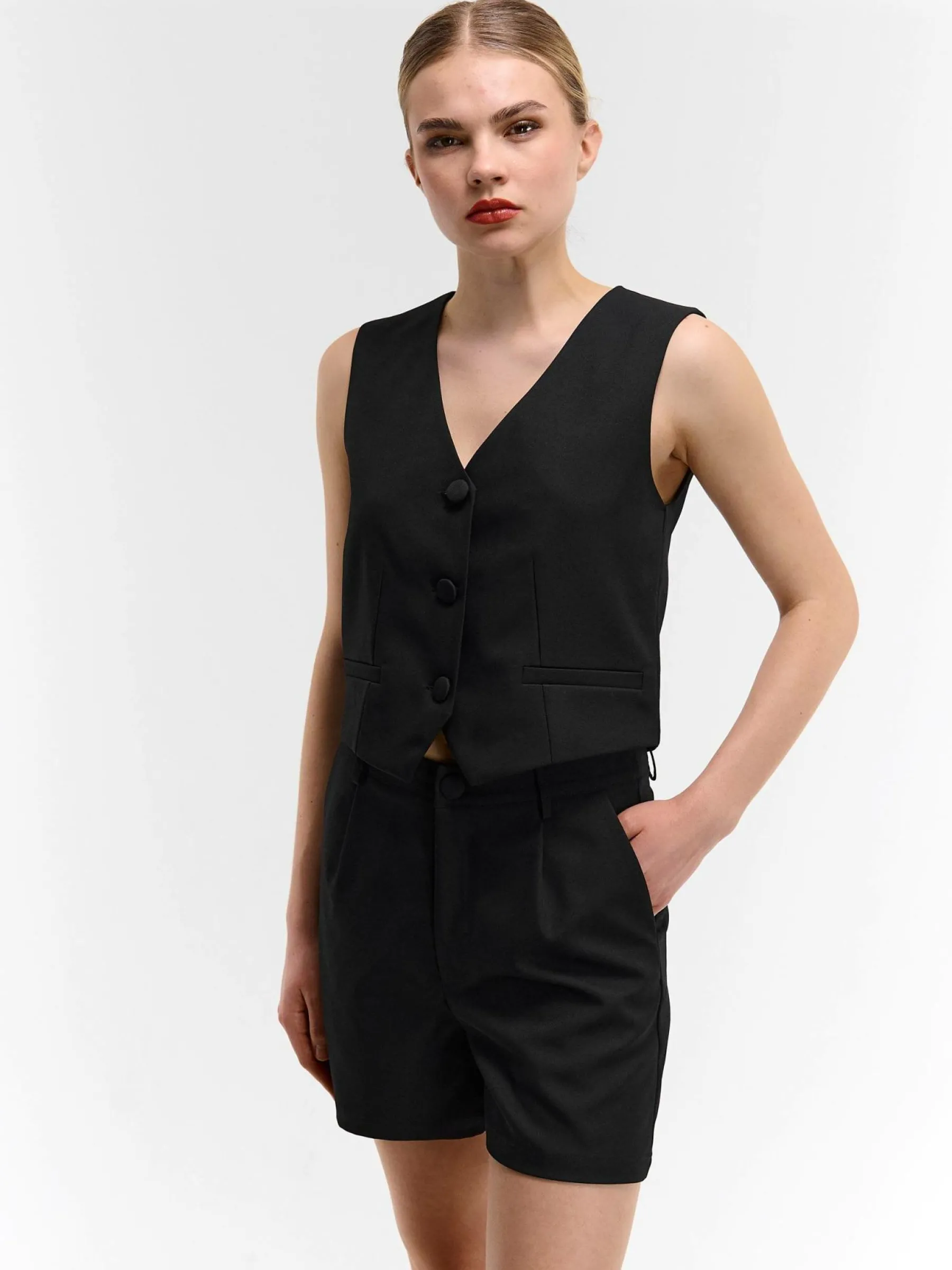 Kolor: czarnyKrój: straightTyp: spodenkiDługość: krótkiPattern style: pojedynczy kolorDetal: z kieszeniamiMateriał…
