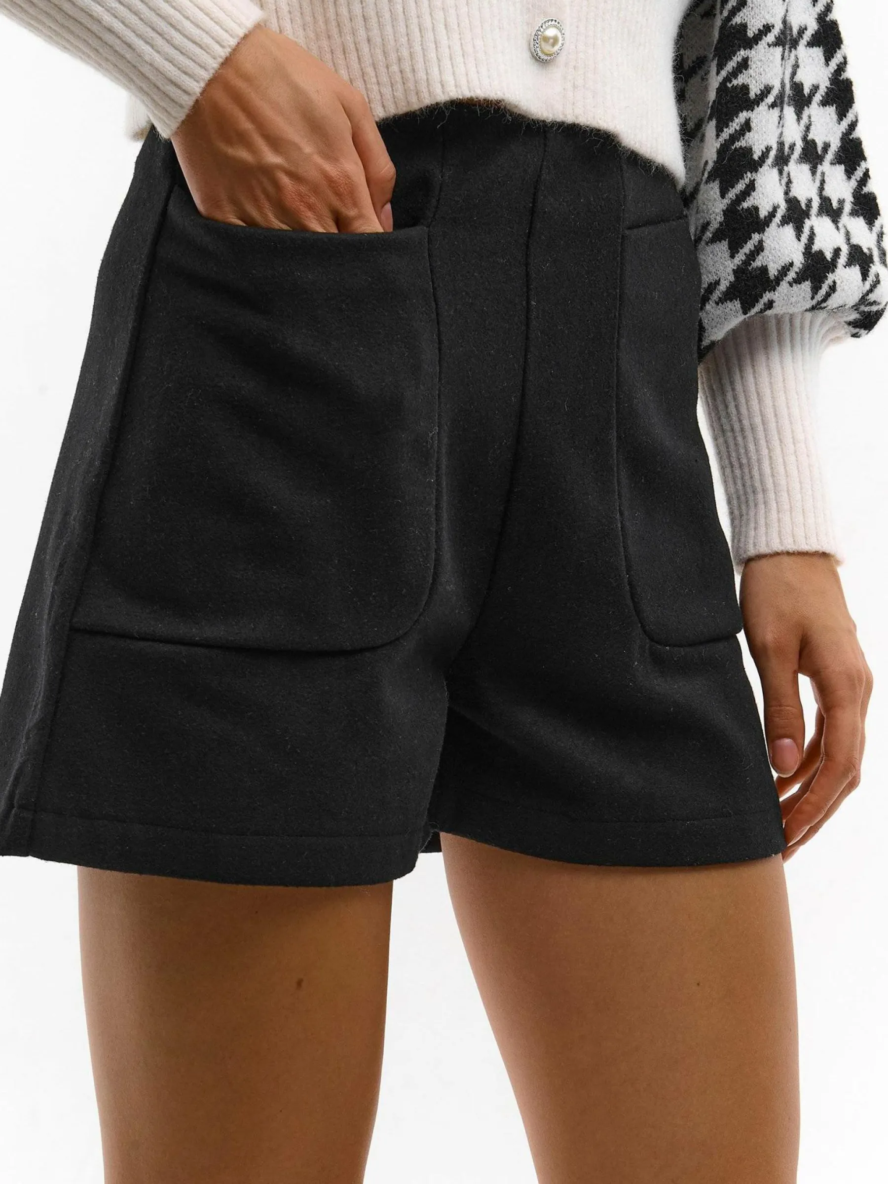 Kolor: czarnyKrój: straightTyp: spodenkiDługość: krótkiPattern style: pojedynczy kolorDetal: na zamek, z kieszeniam…