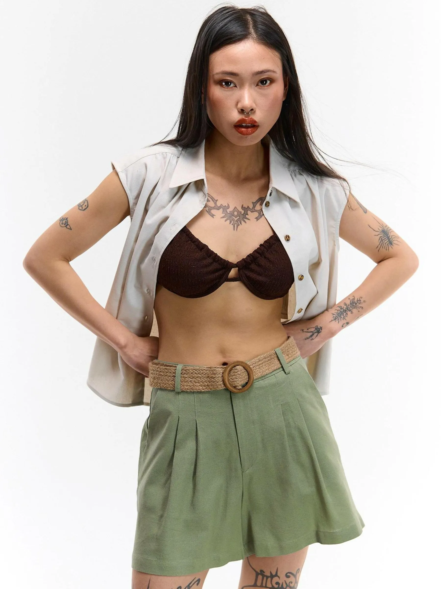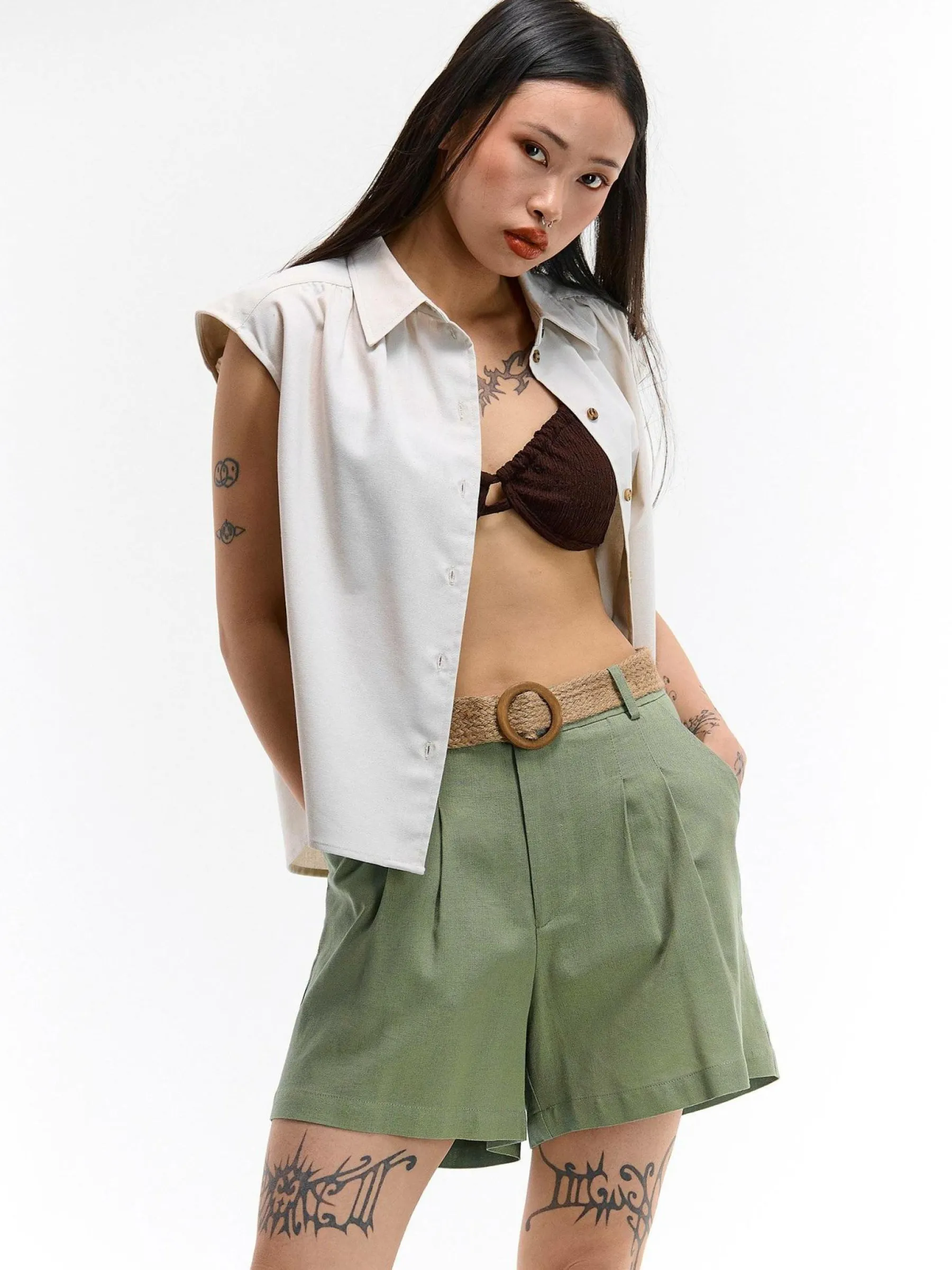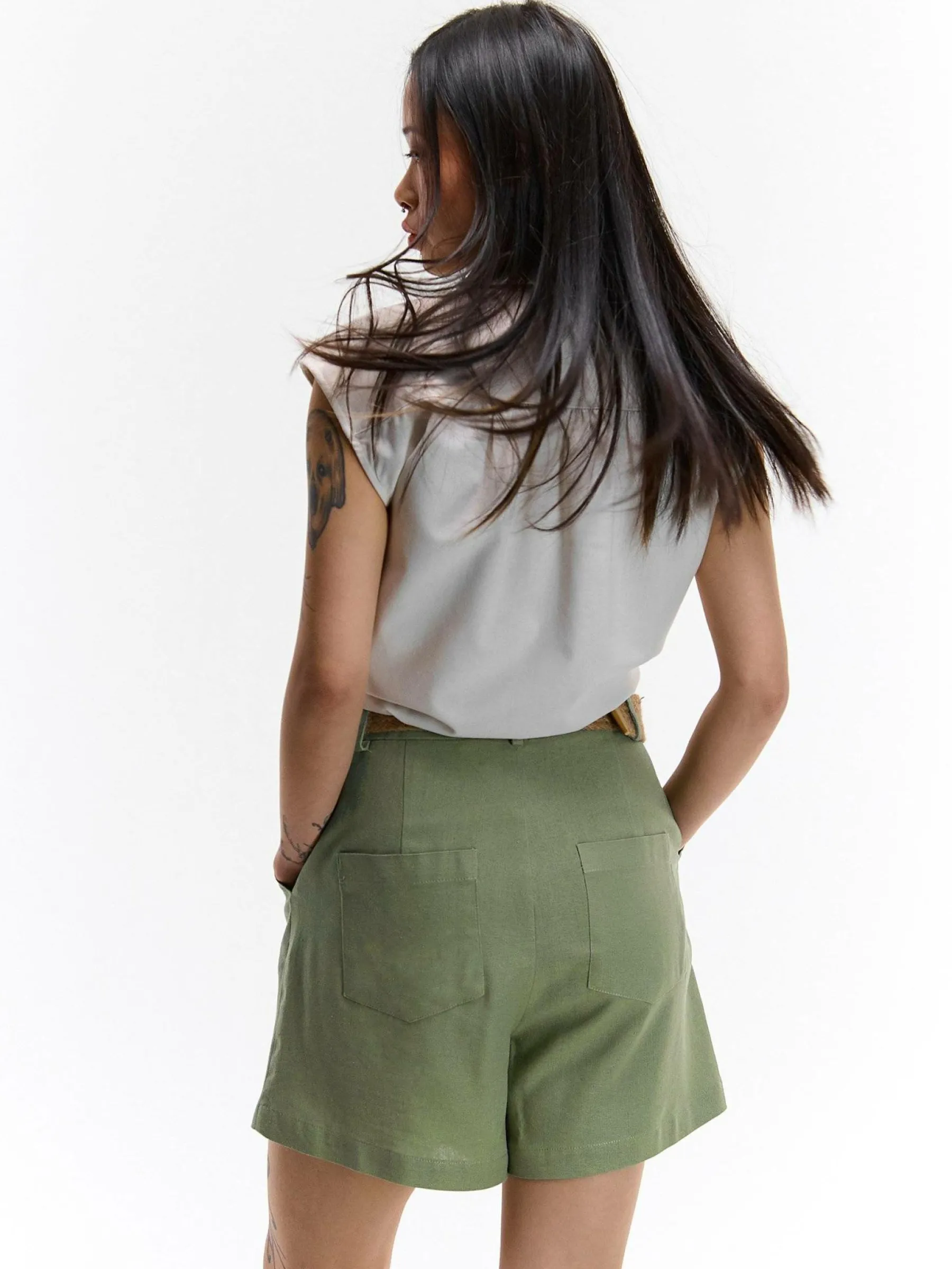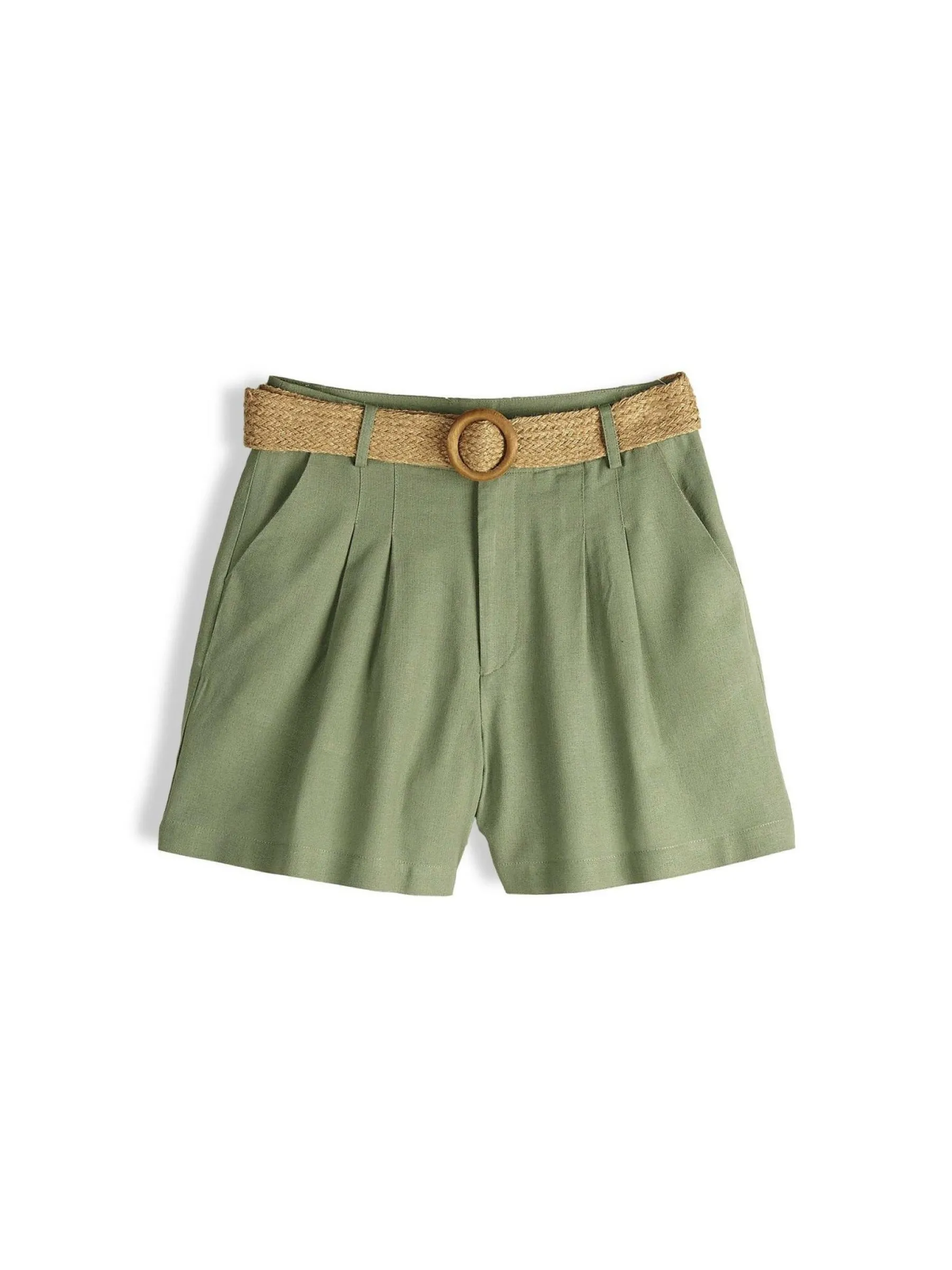 Kolor: zielonyKrój: straightTyp: spodenkiDługość: krótkiPattern style: pojedynczy kolorDetal: z paskiem, na zamekMa…