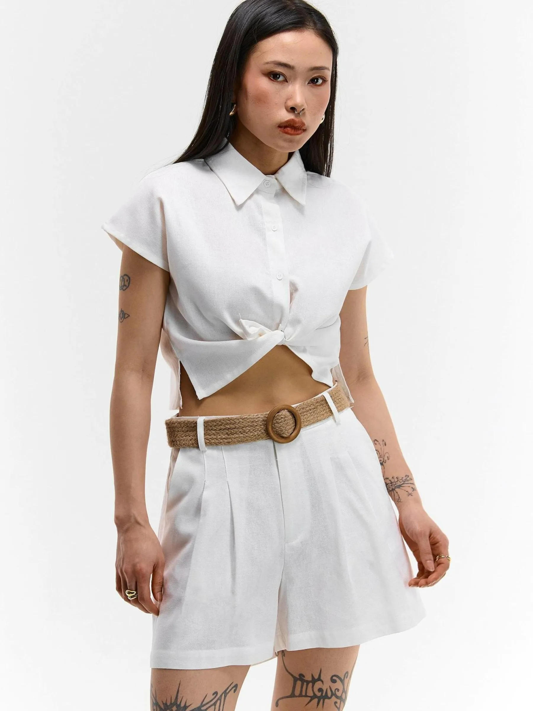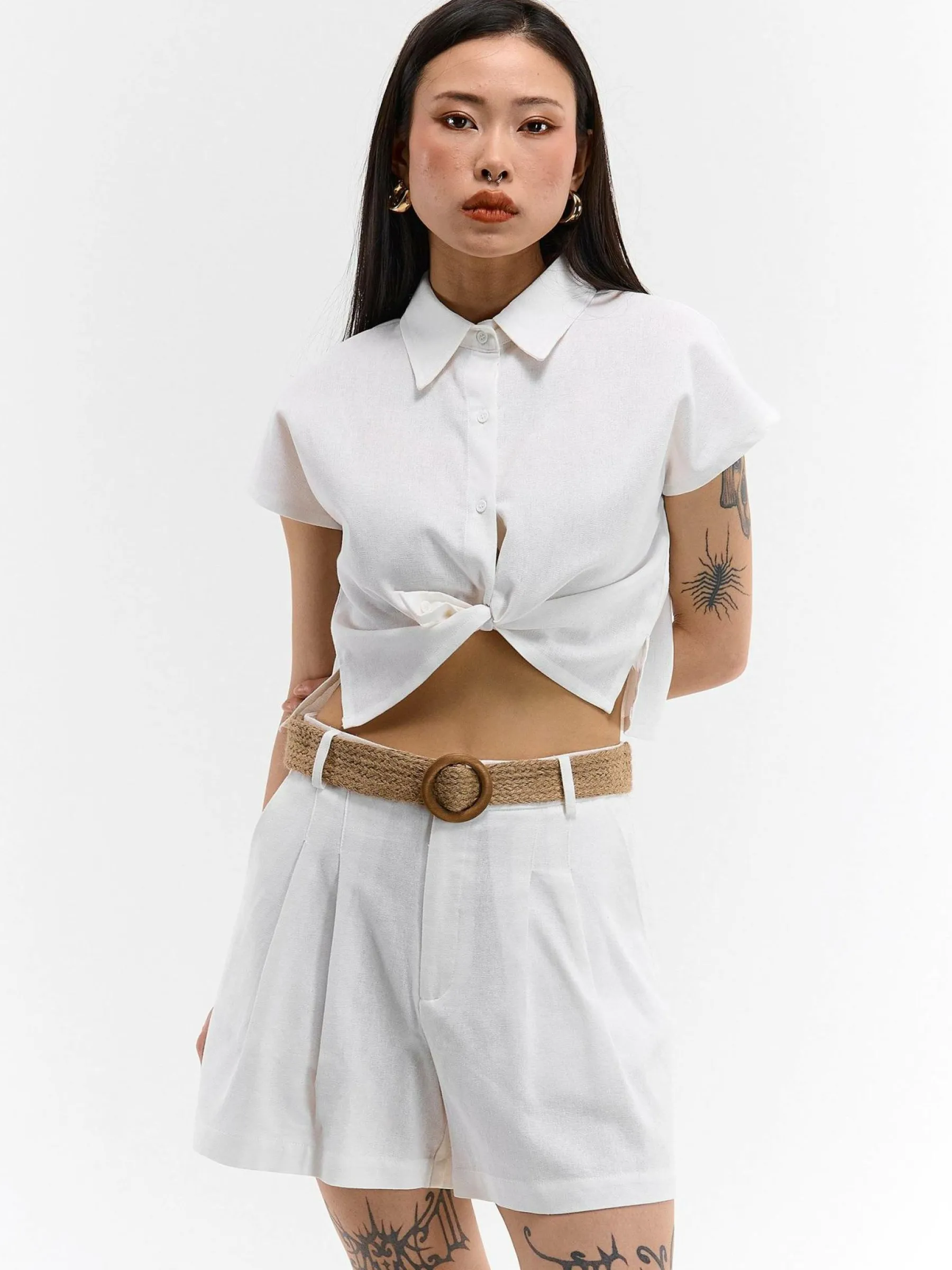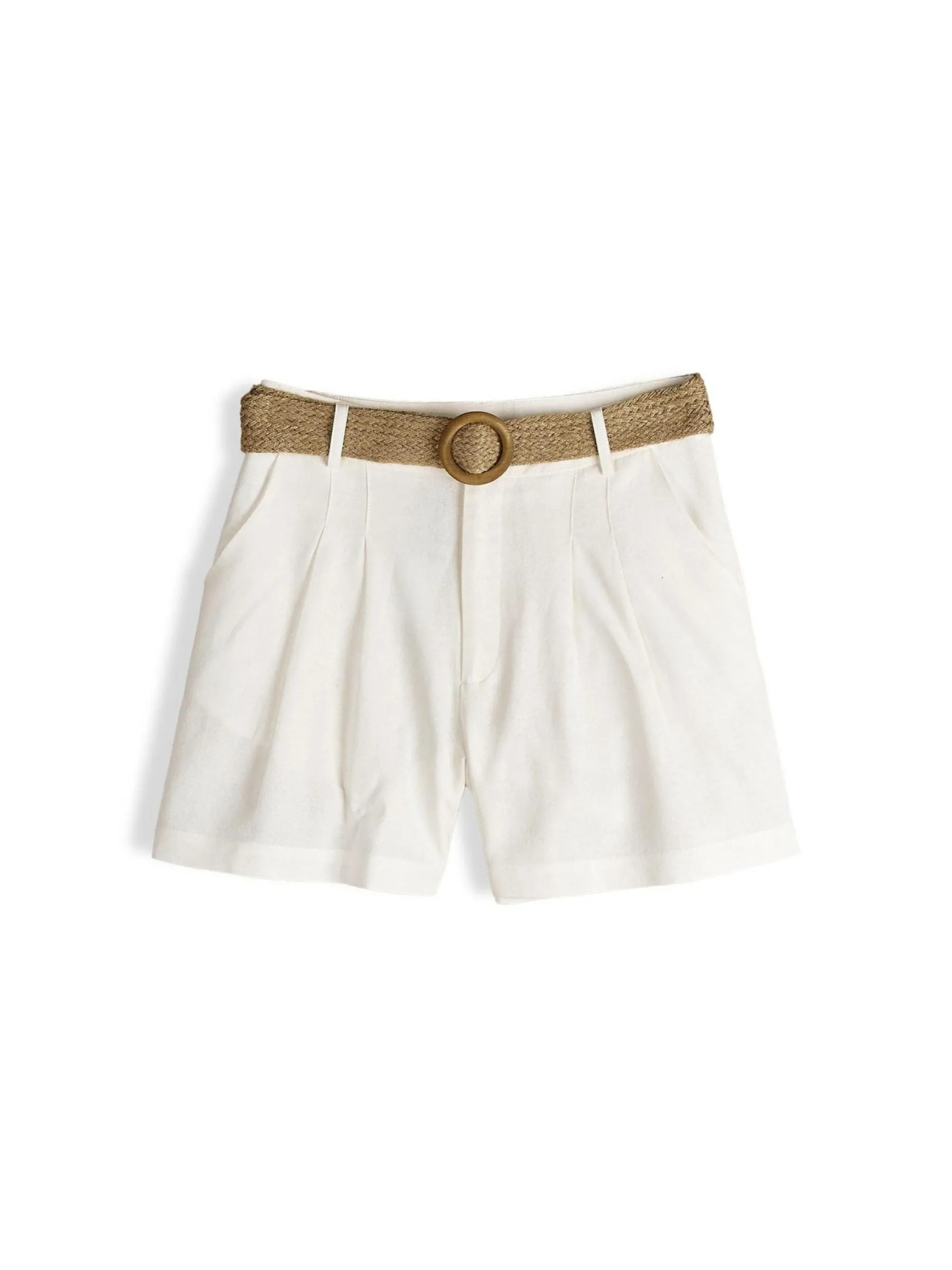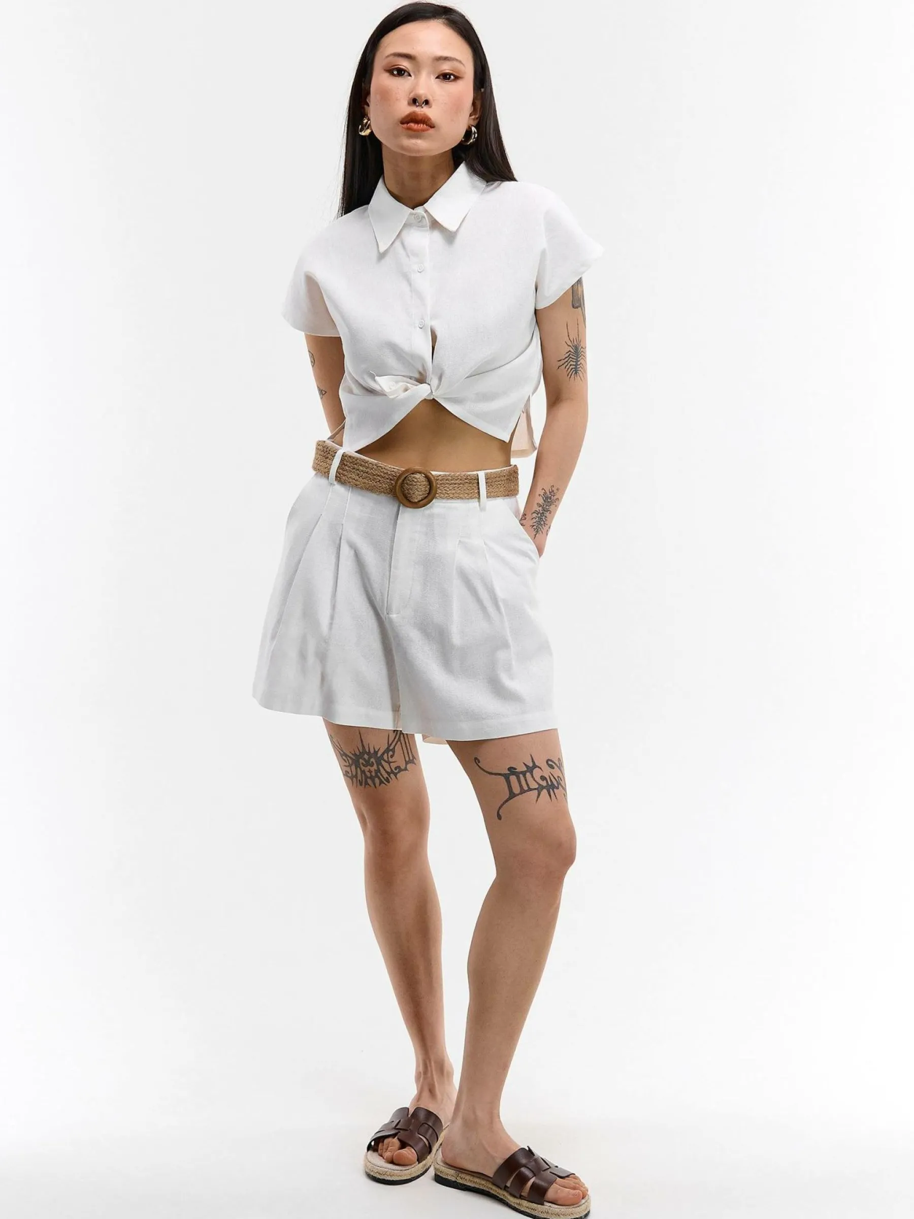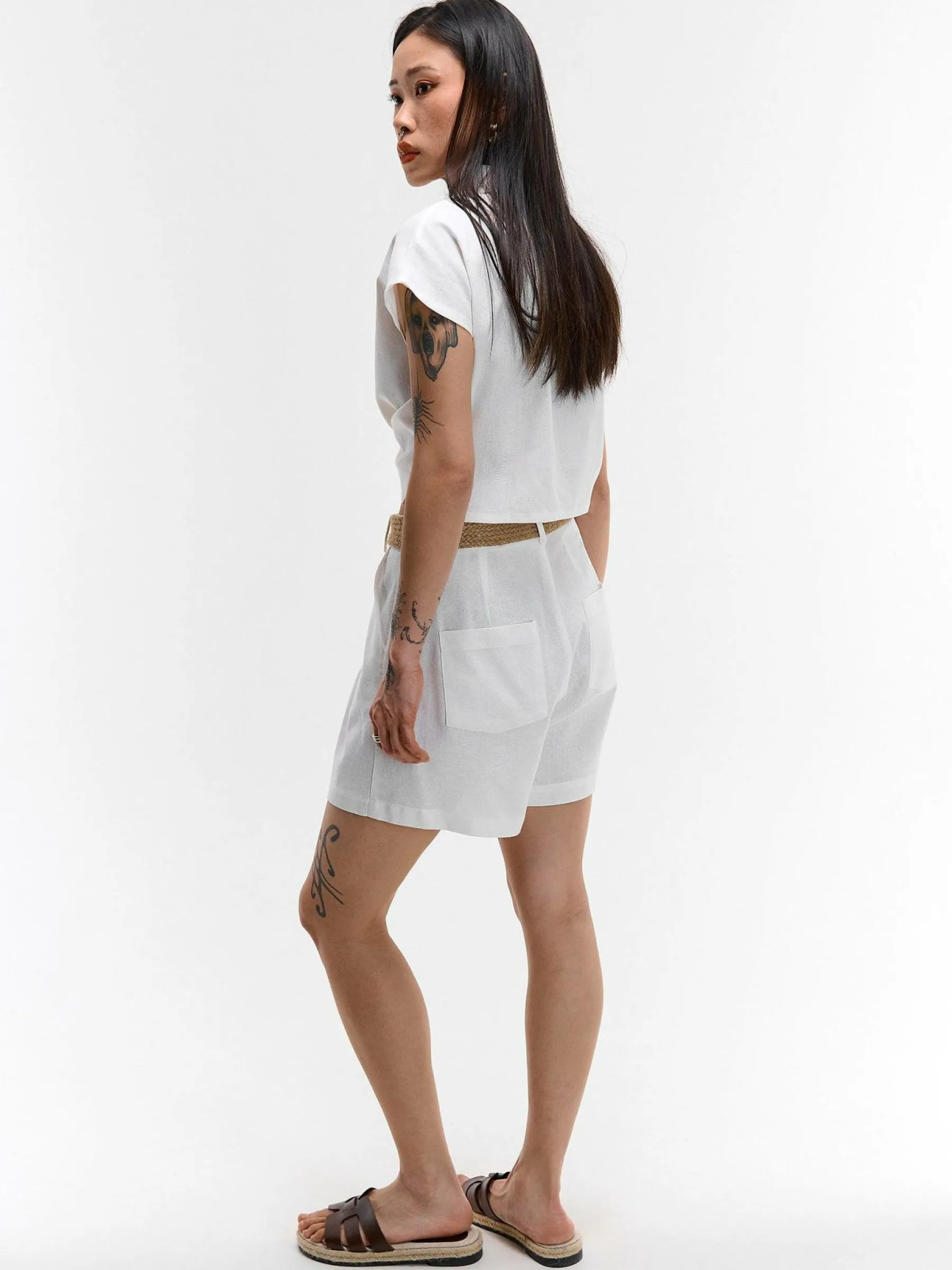Kolor: białyKrój: straightTyp: spodenkiDługość: krótkiPattern style: pojedynczy kolorDetal: z paskiem, na zamekMat…