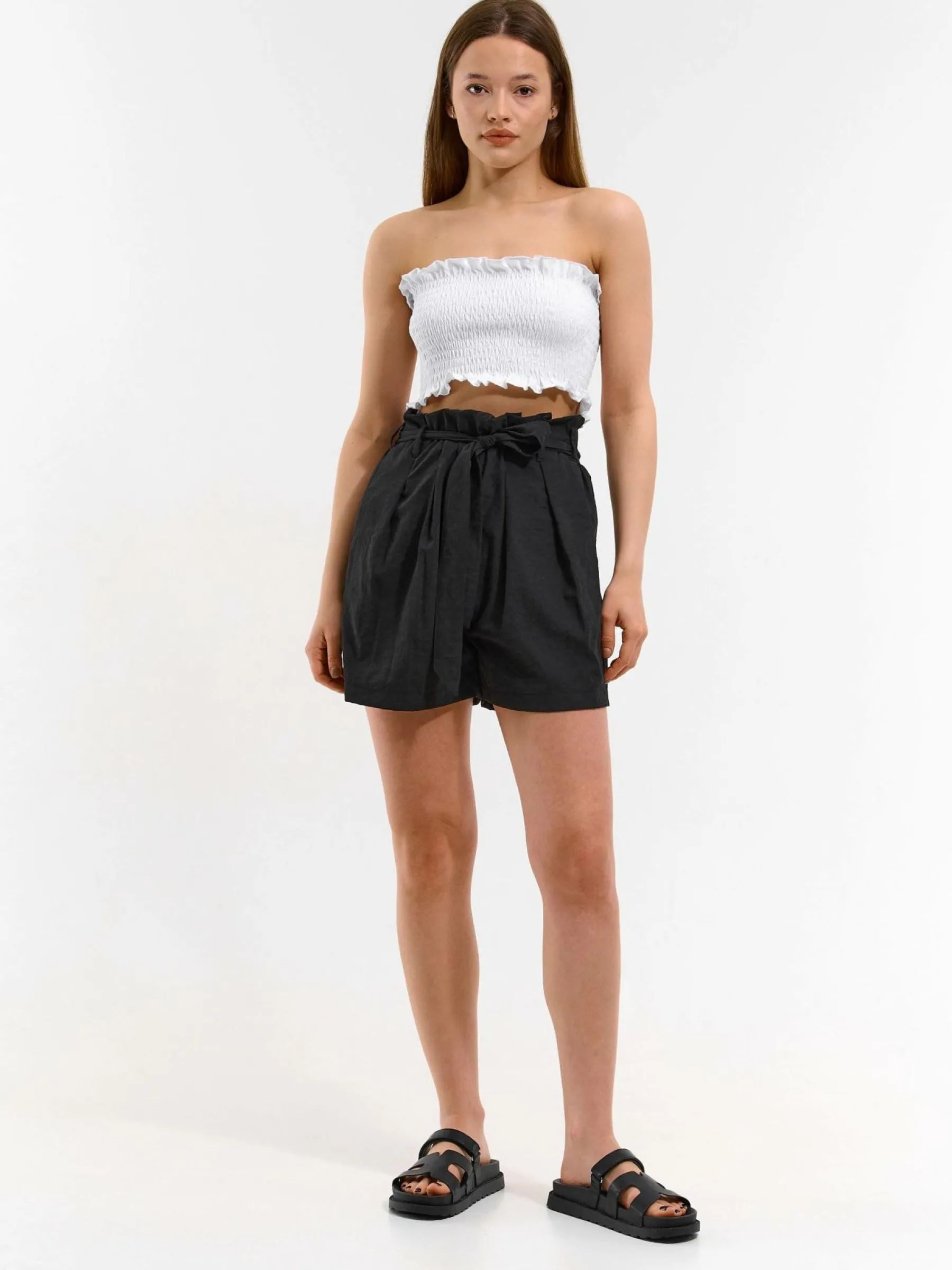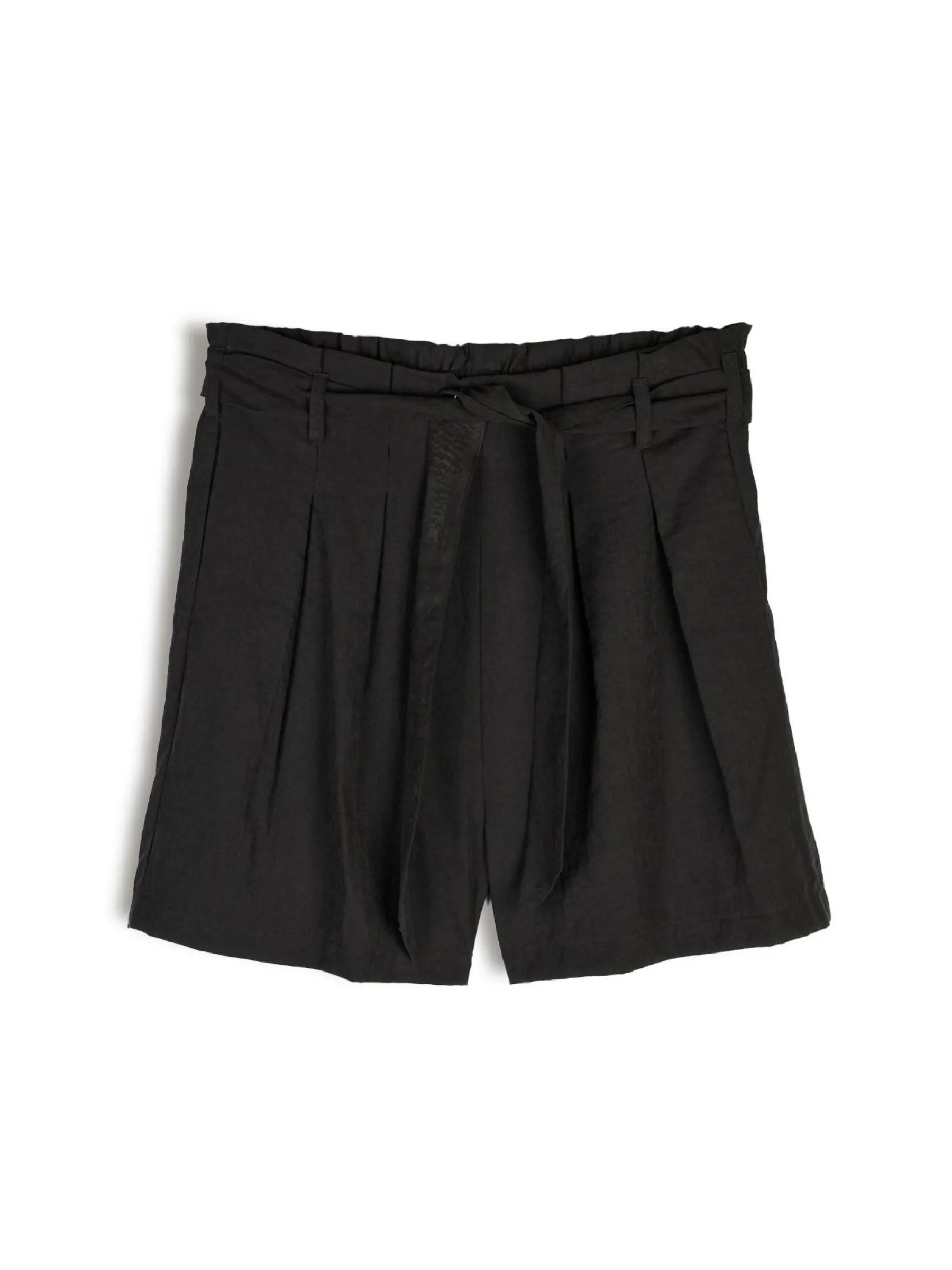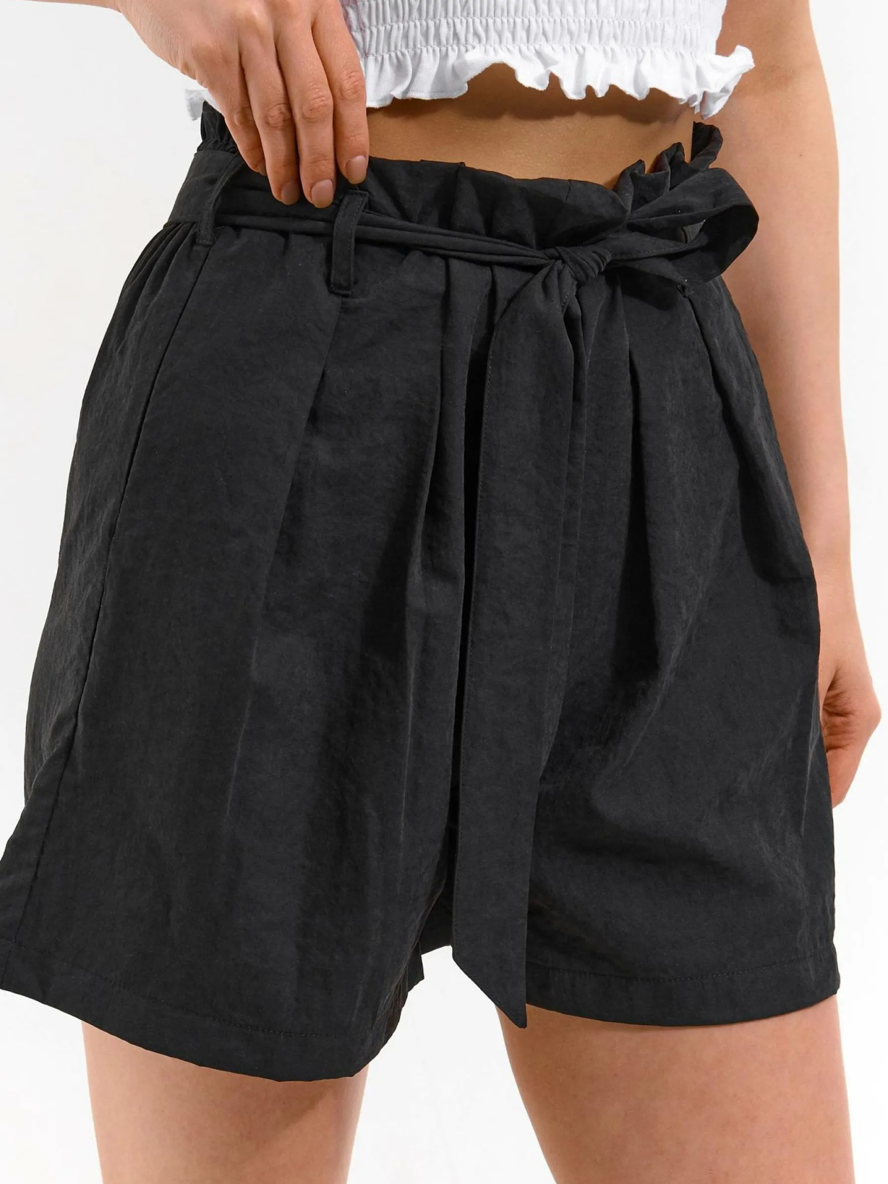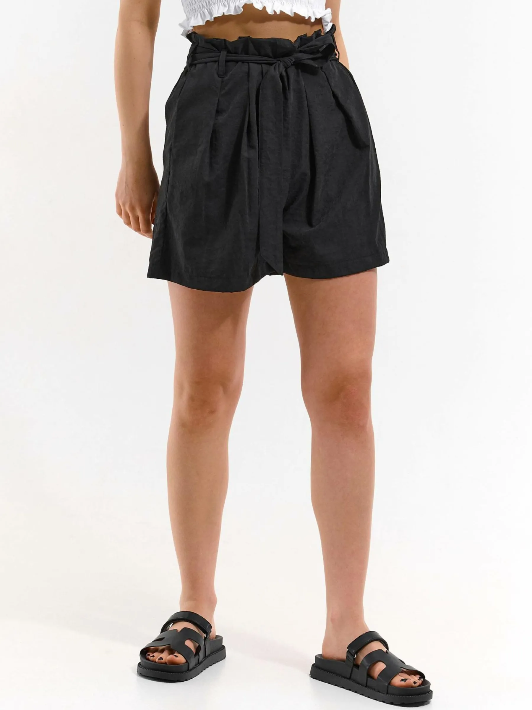 Kolor: czarnyKrój: straightTyp: spodenkiDługość: krótkiPattern style: pojedynczy kolorDetal: z paskiemMateriał: sy…