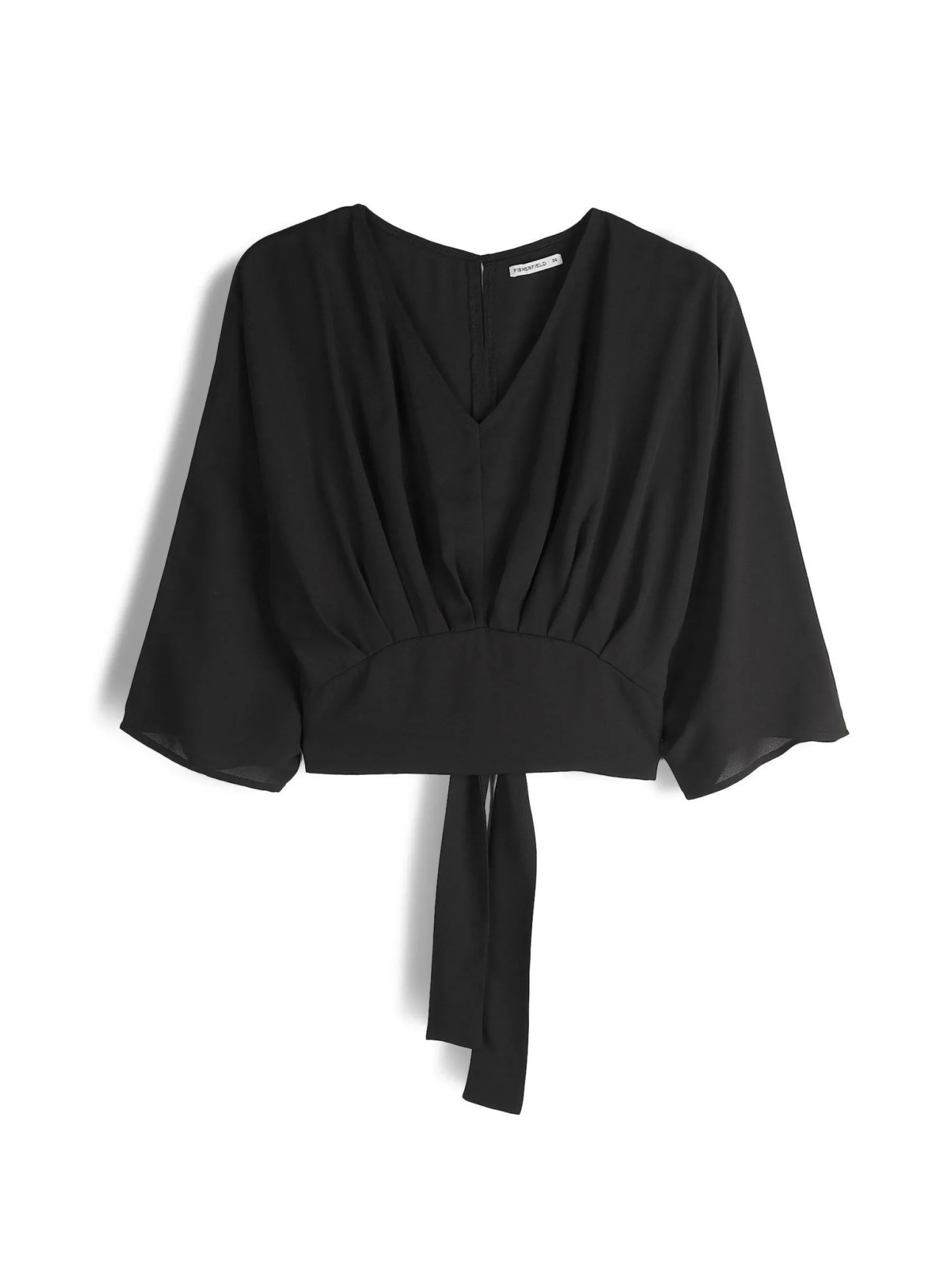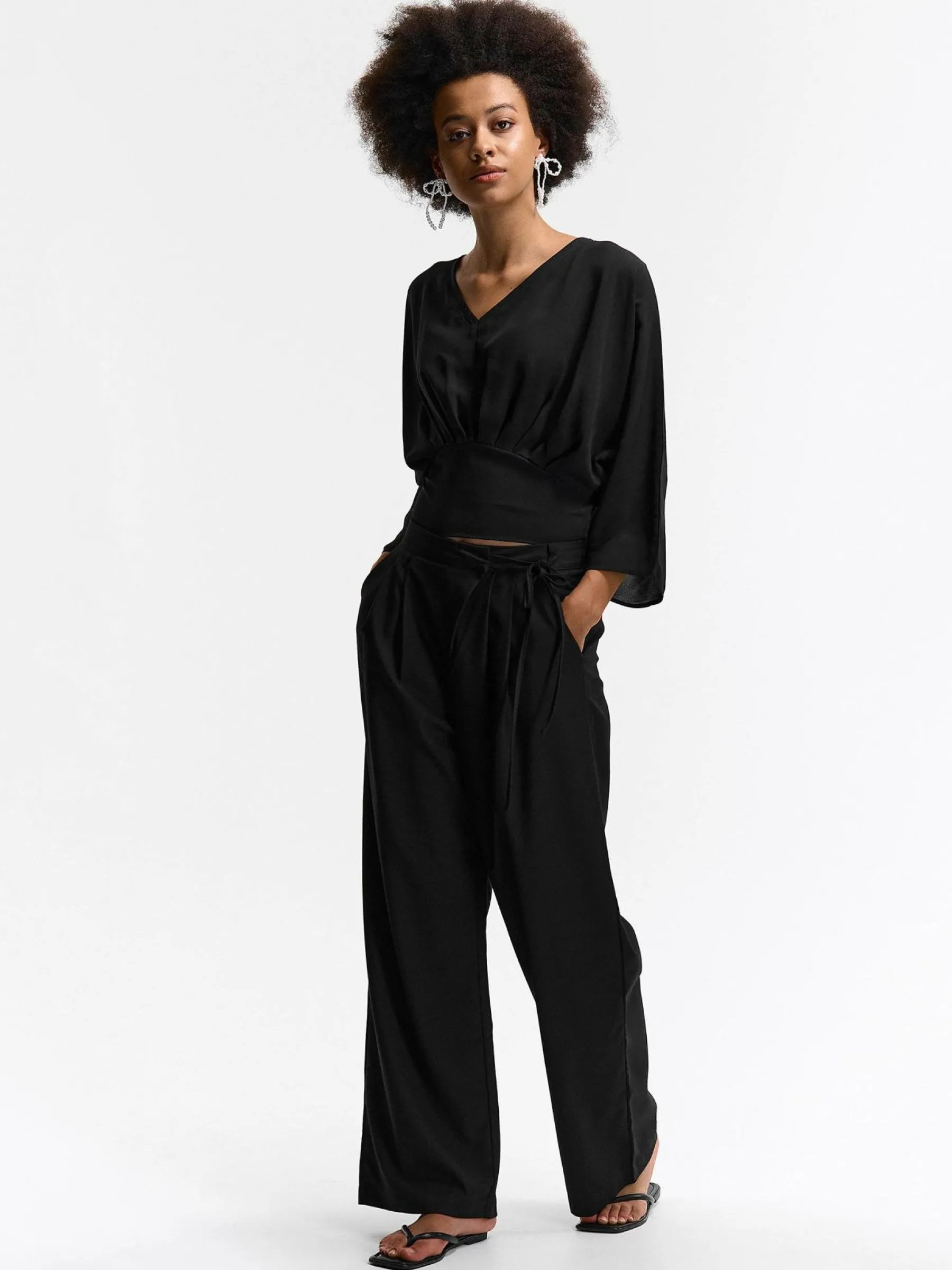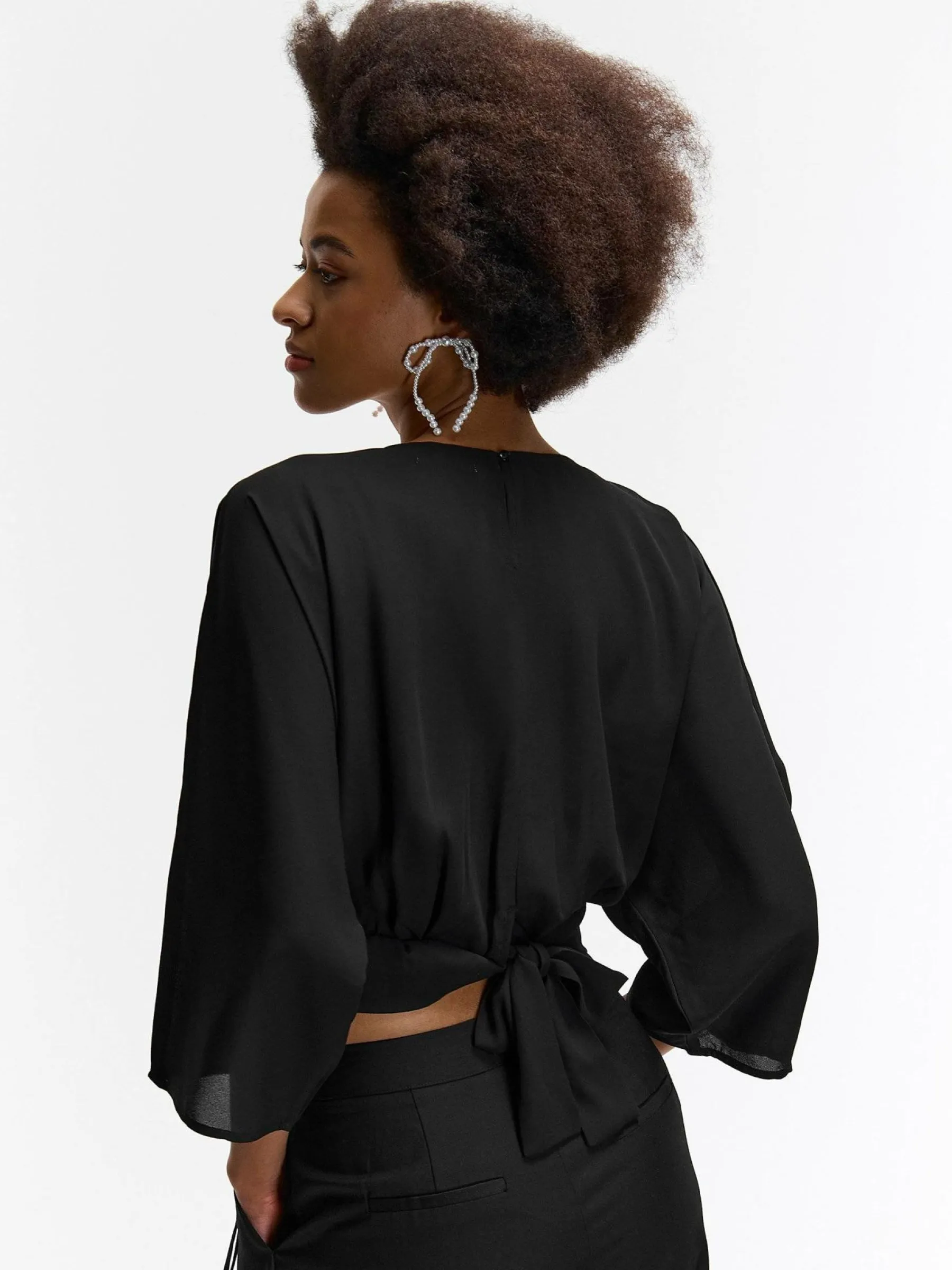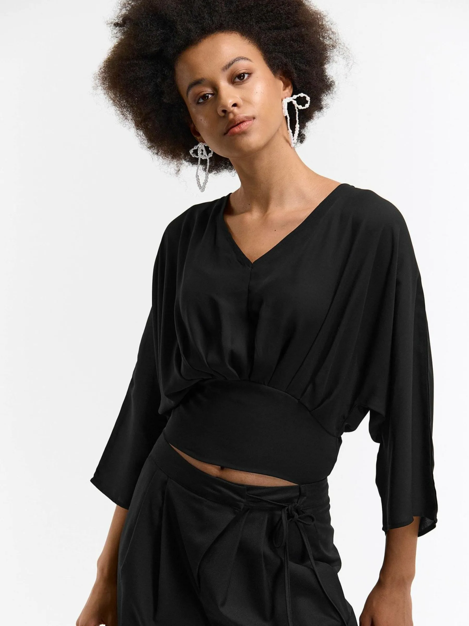 Kolor: czarnyKrój: z marszczeniemTyp: top, bluzkaRekaw: rękaw 3/4Długość: krótki topPattern style: pojedynczy kolo…