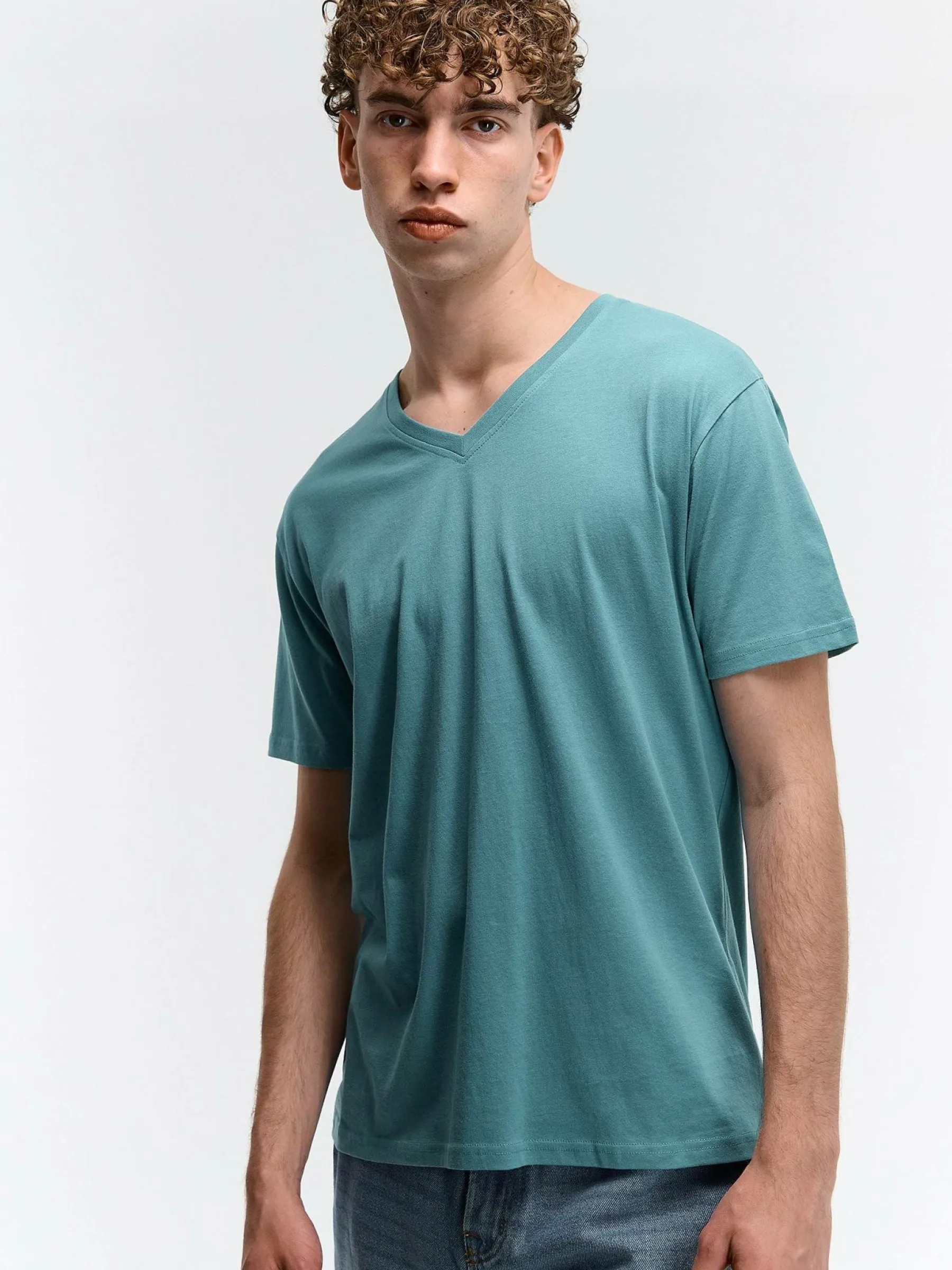 Kolor: zielonyKrój: regularTyp: koszulkaRekaw: krótki rękawPattern style: pojedynczy kolorDetal: nad głową, v-neckM…