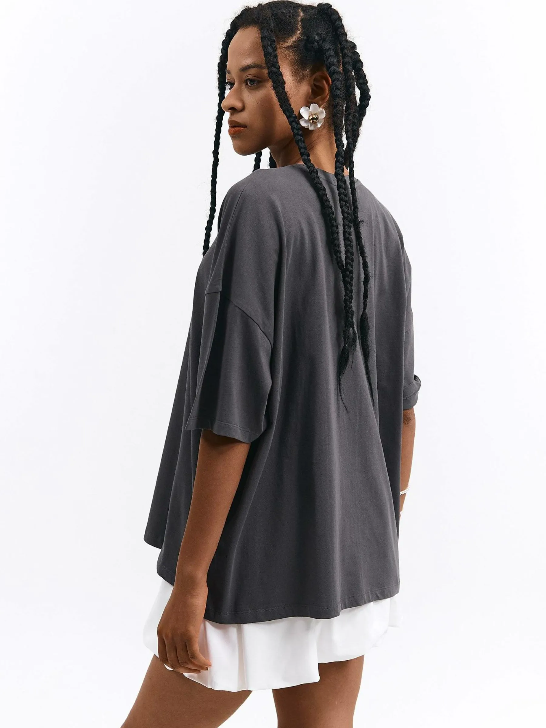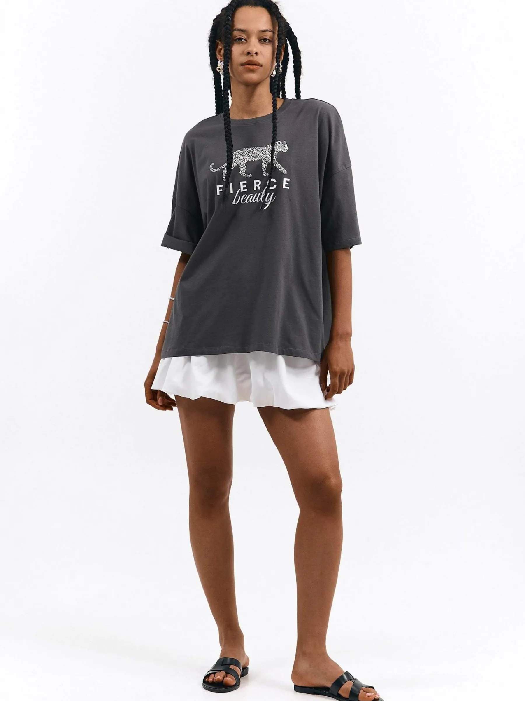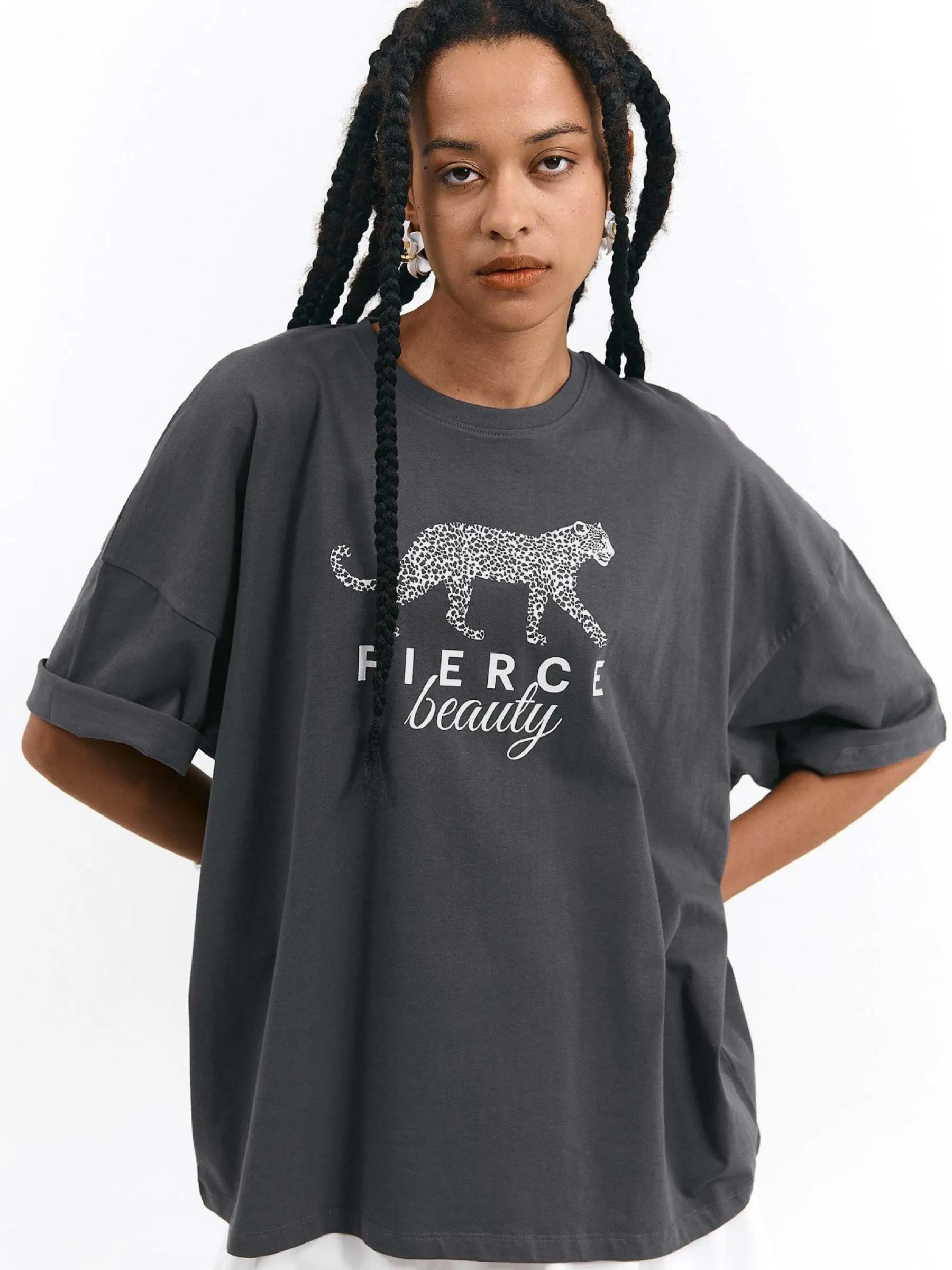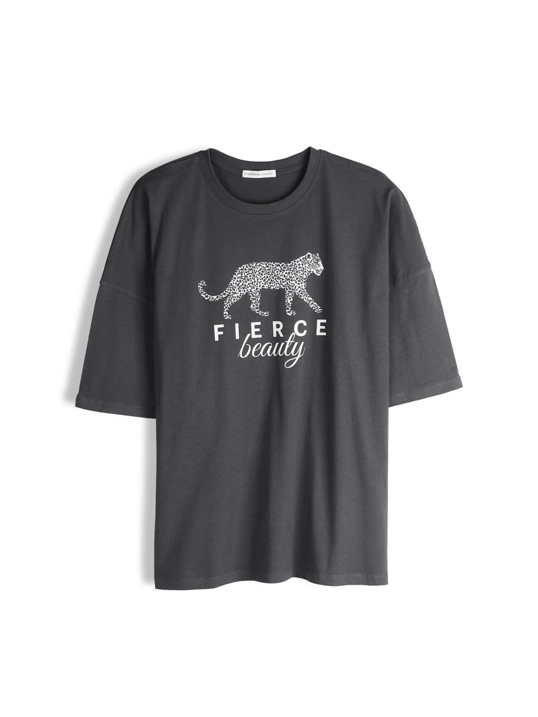 Kolor: szaryKrój: oversizedTyp: koszulkaRekaw: krótki rękawDługość: dlugiePattern style: z nadrukiemDetal: nad gł…