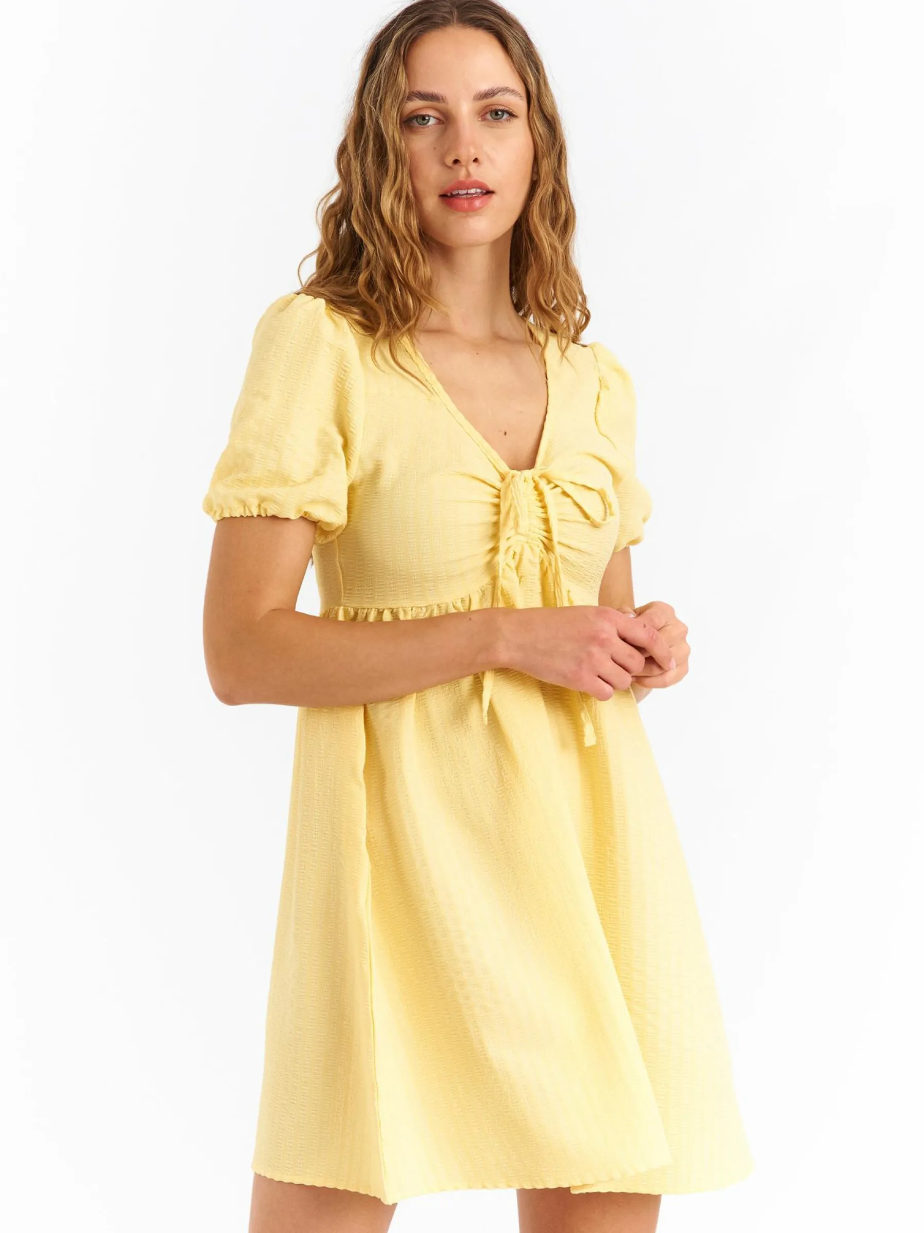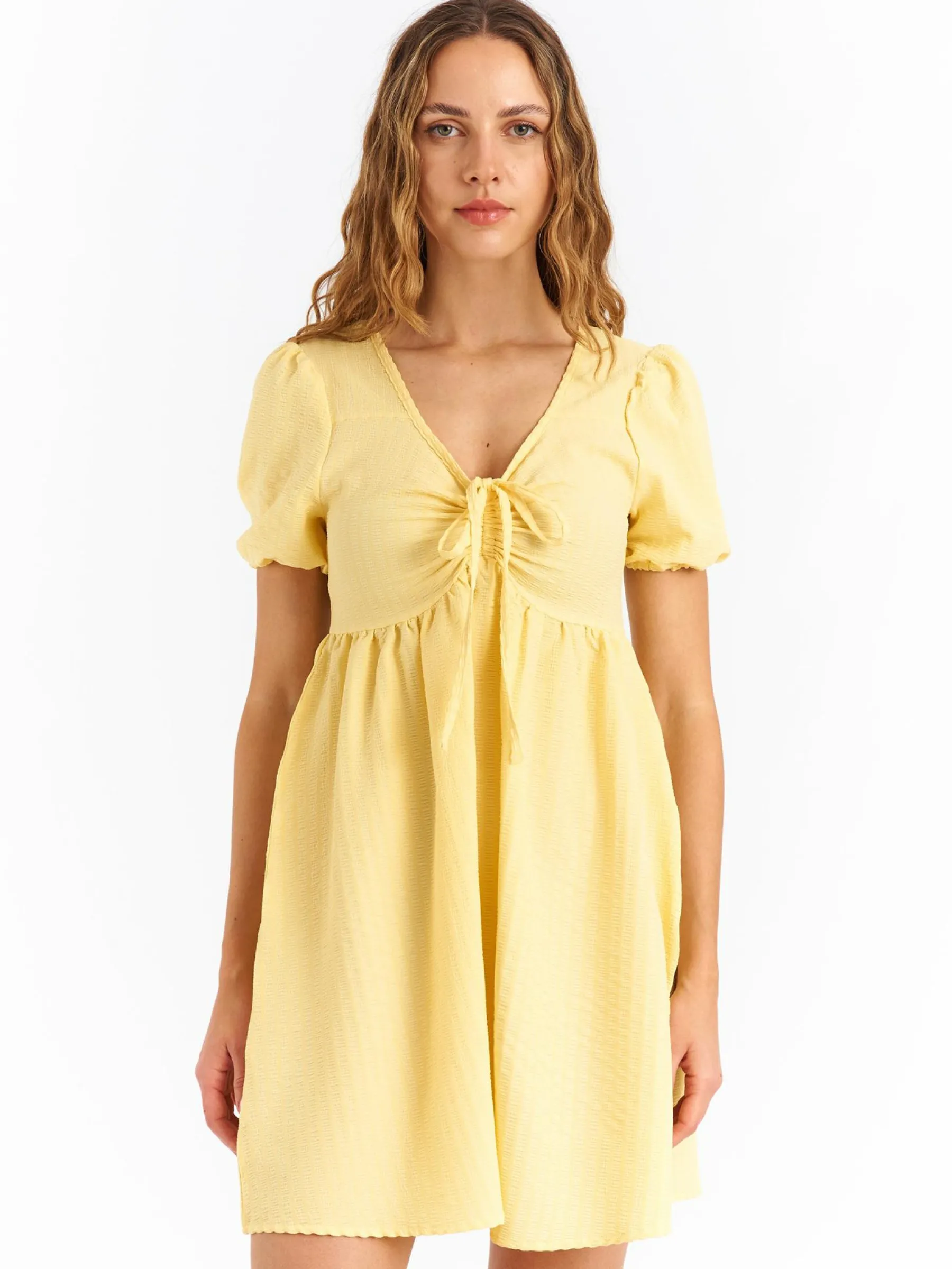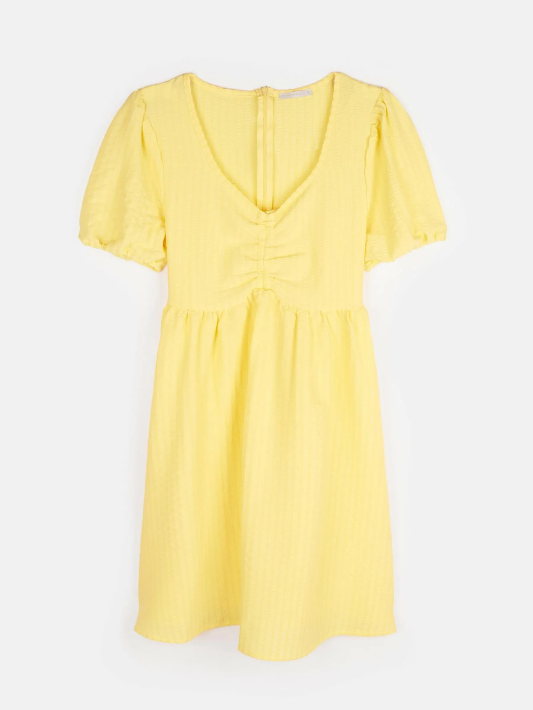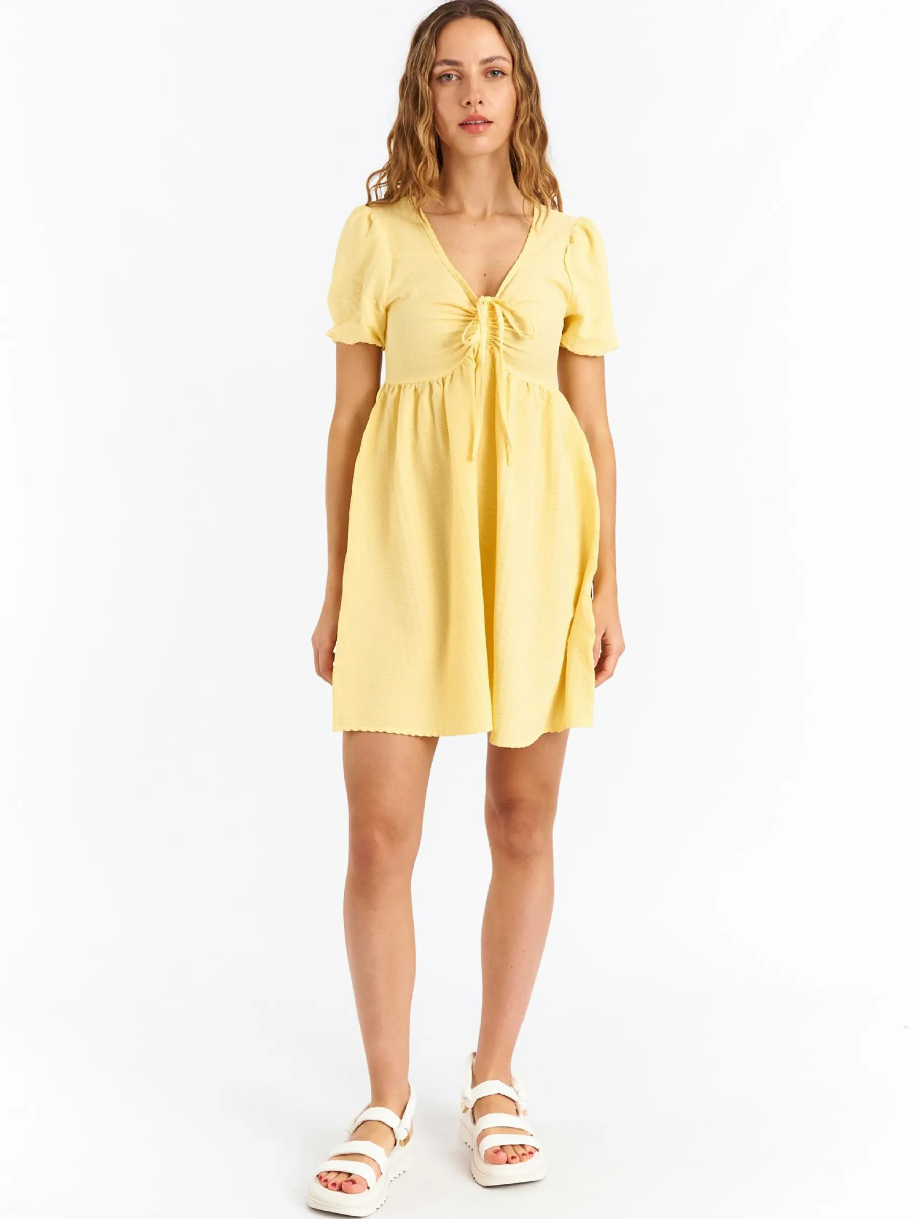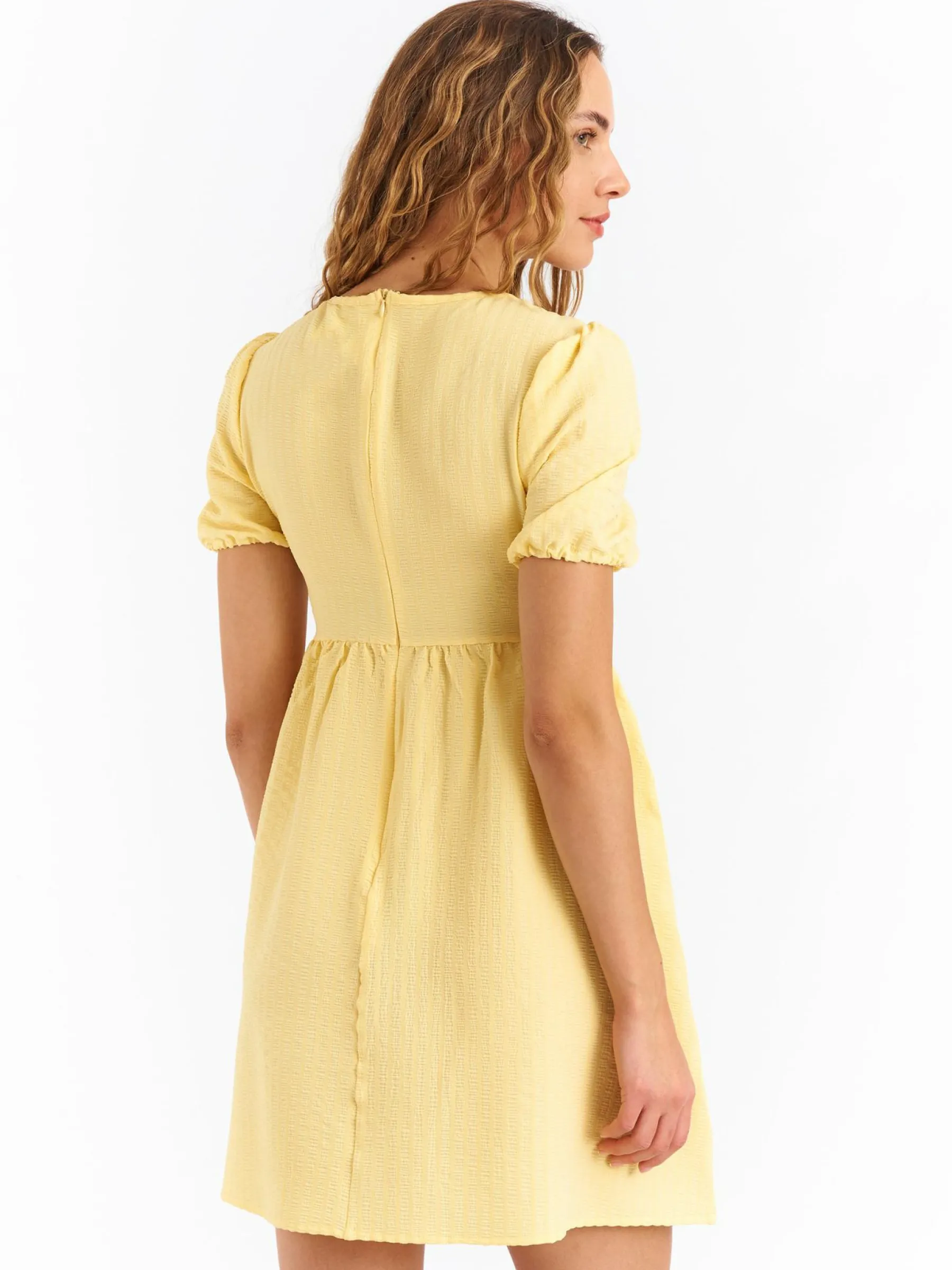 Kolor: żółtyKrój: asyTyp: sukienkaRekaw: krótki rękawDługość: miniPattern style: pojedynczy kolorMateriał: syn…