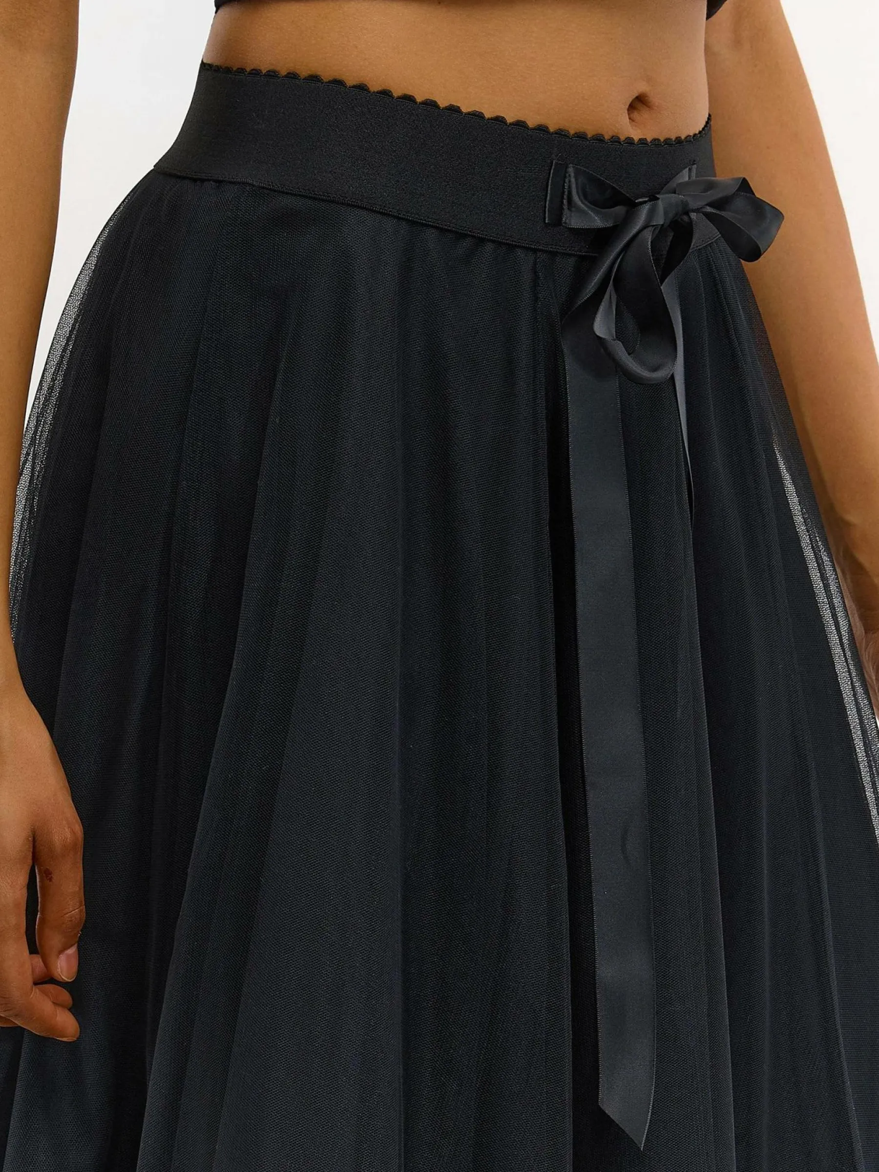Kolor: czarnyKrój: asyTyp: spódnicaDługość: maxiPattern style: pojedynczy kolorDetal: z kokardką, z elastyczną op…