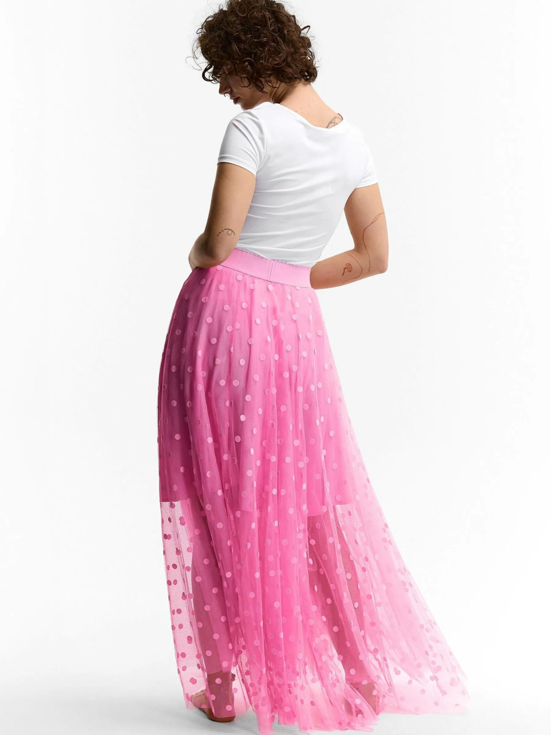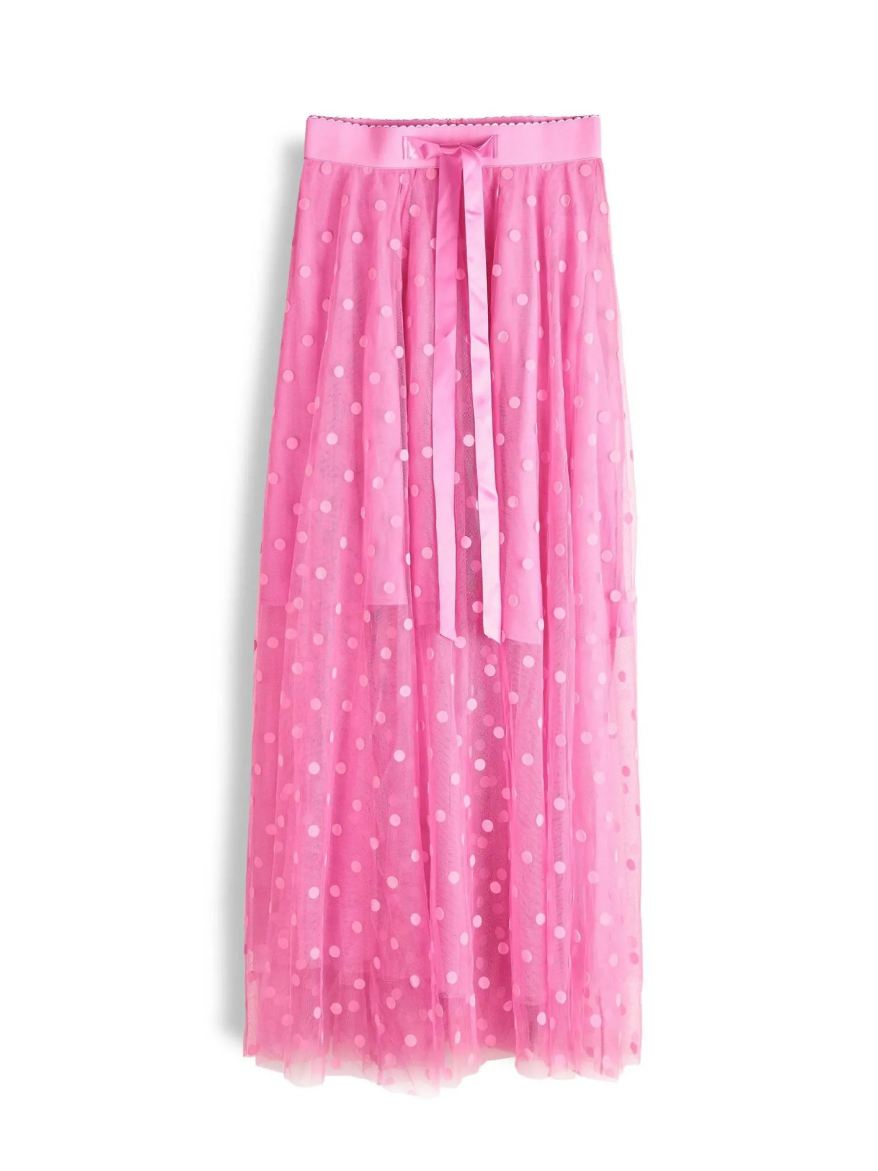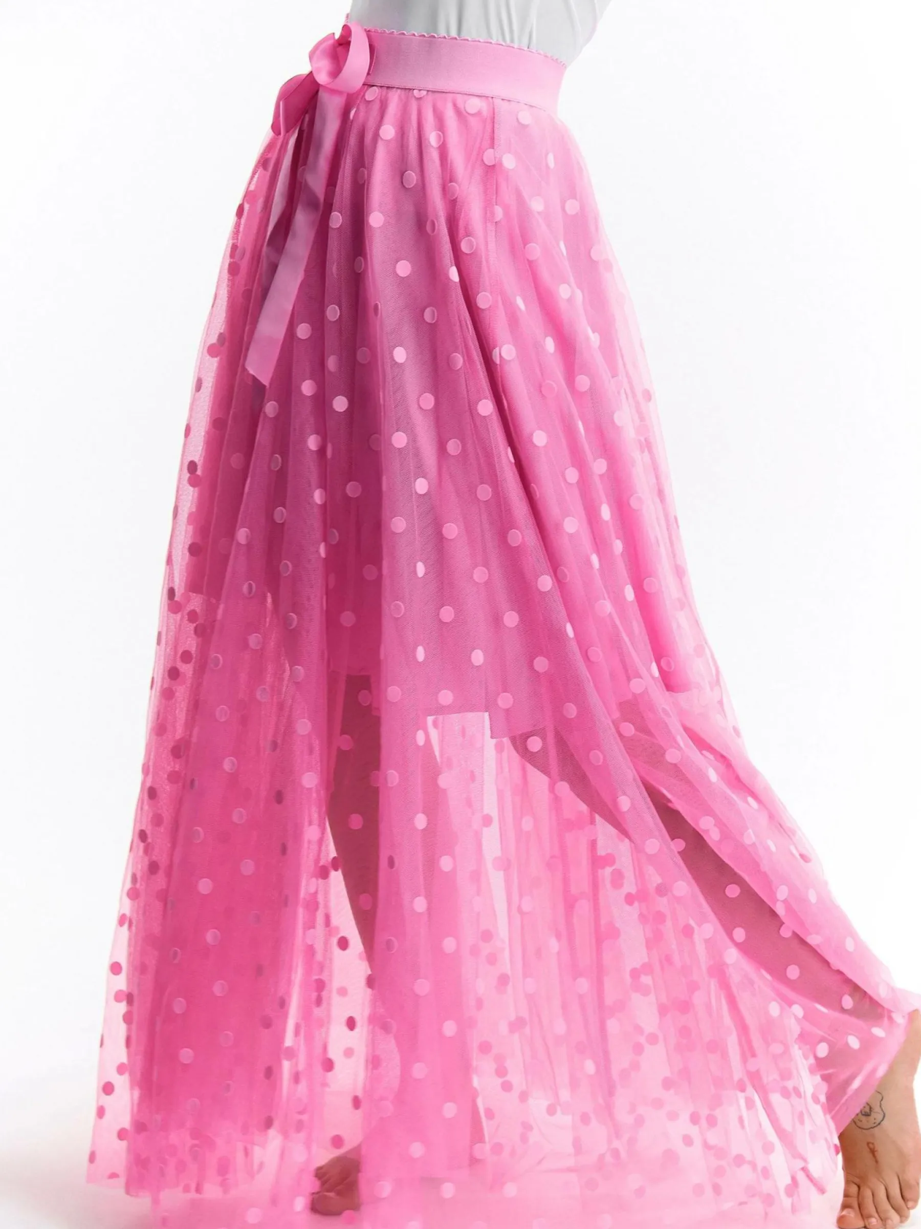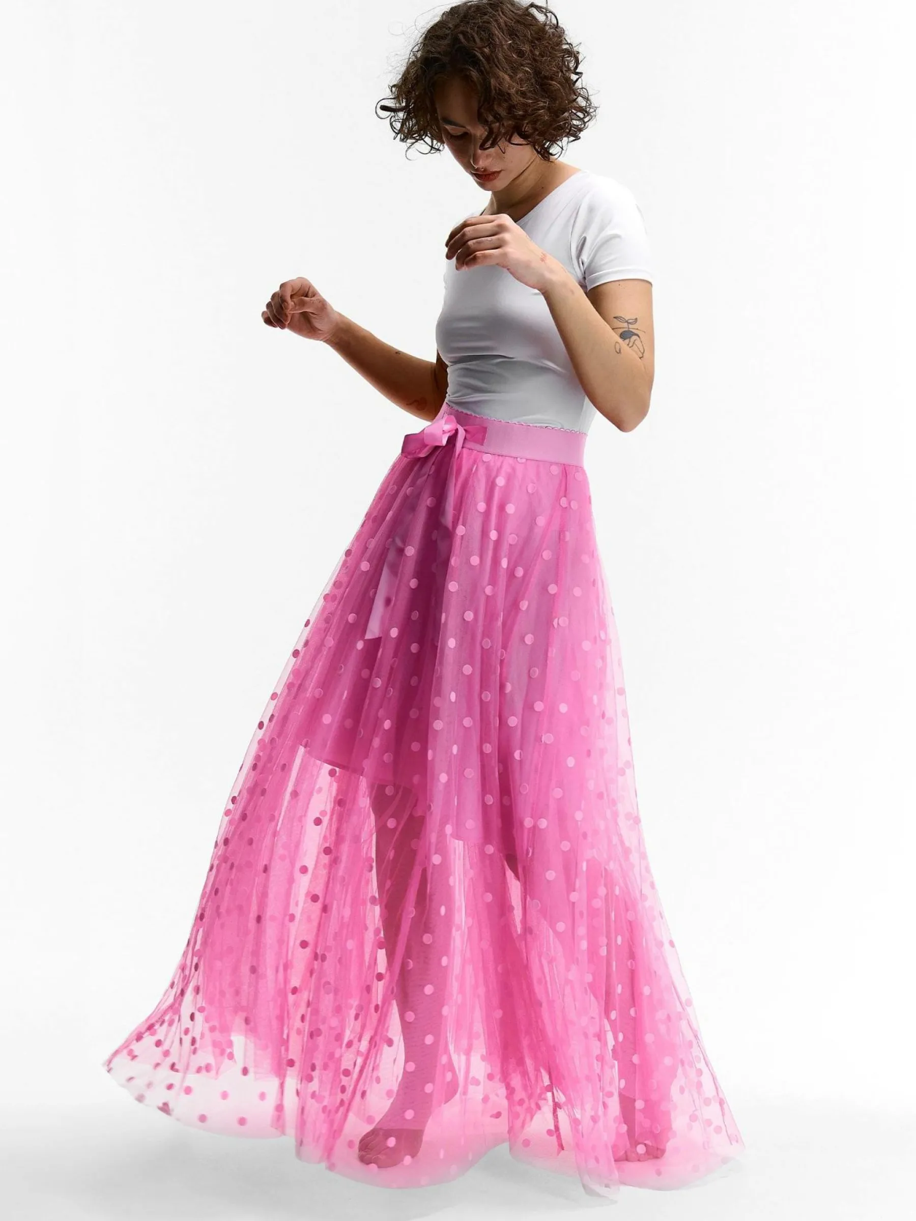 Kolor: różowyKrój: podstawowyTyp: spódnicaDługość: maxiPattern style: w grochyDetal: ze wstążką, z elastyczną…
