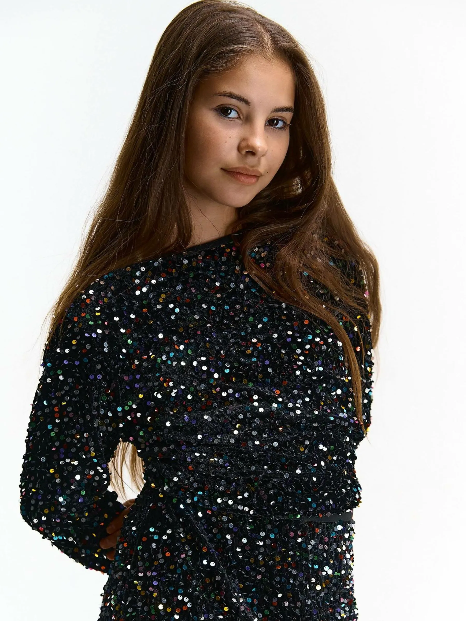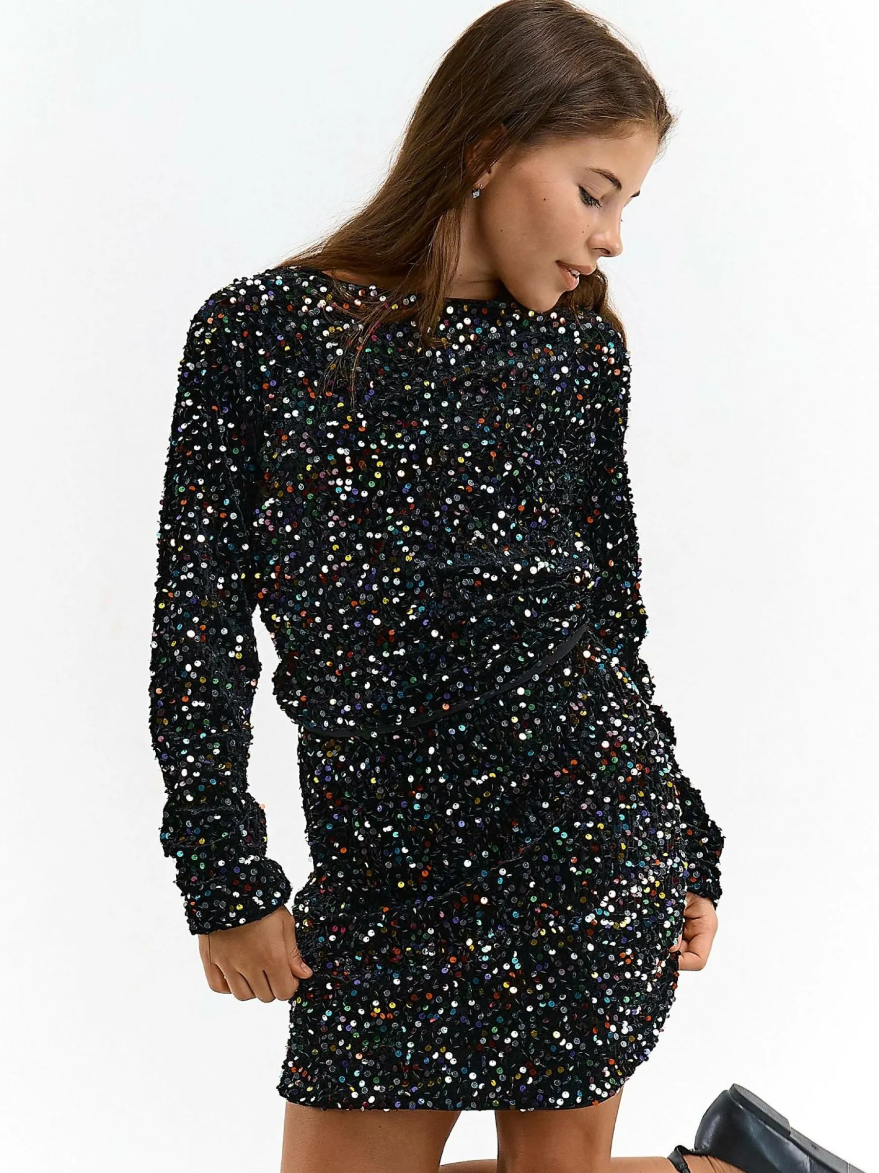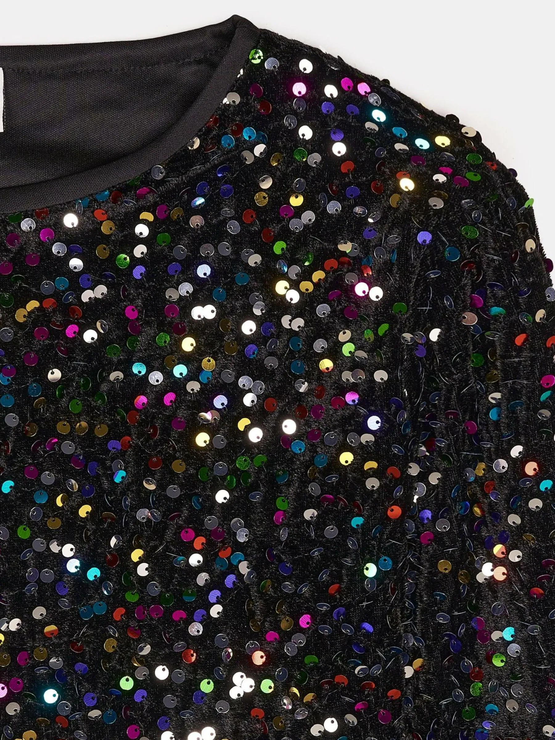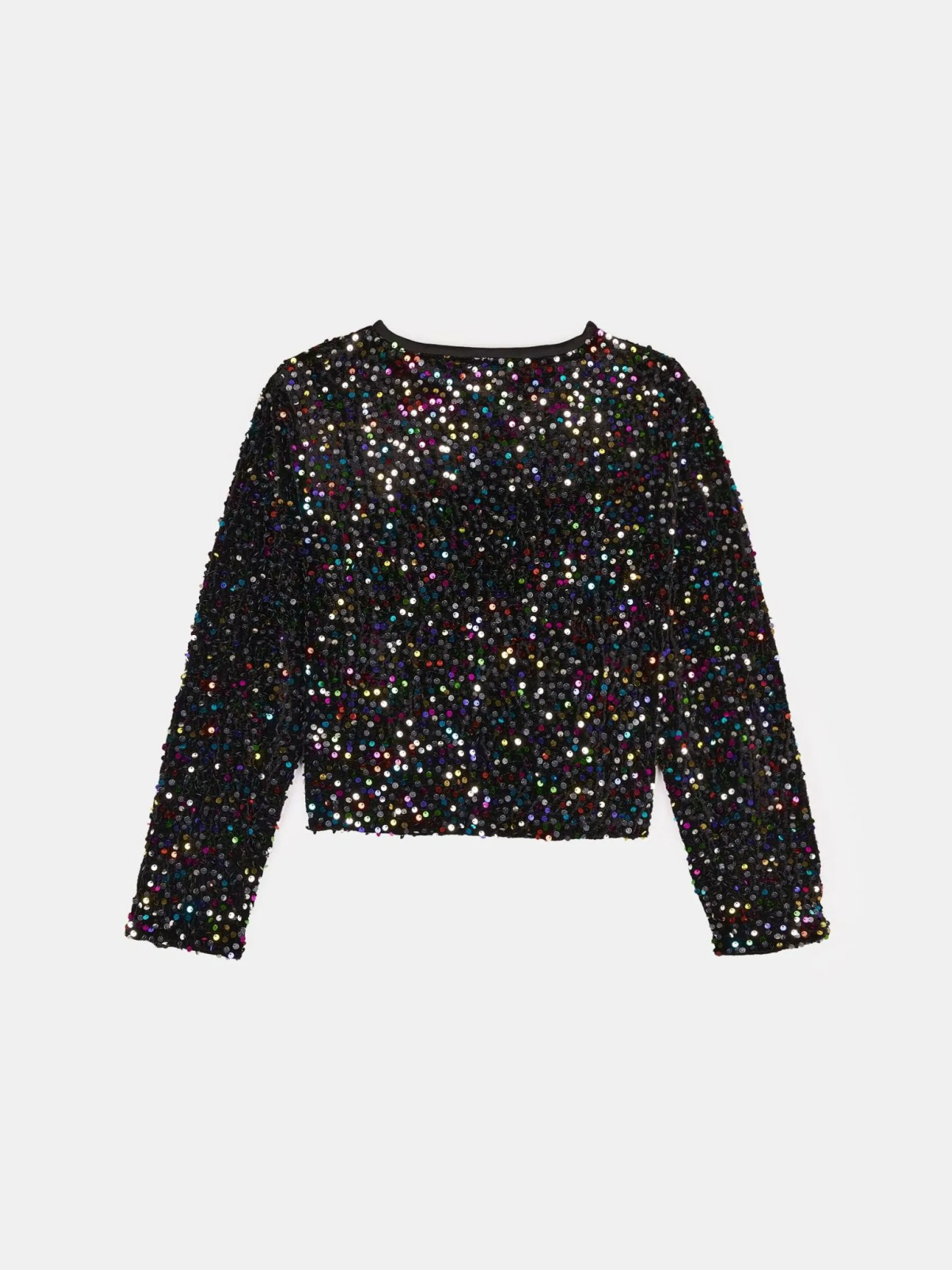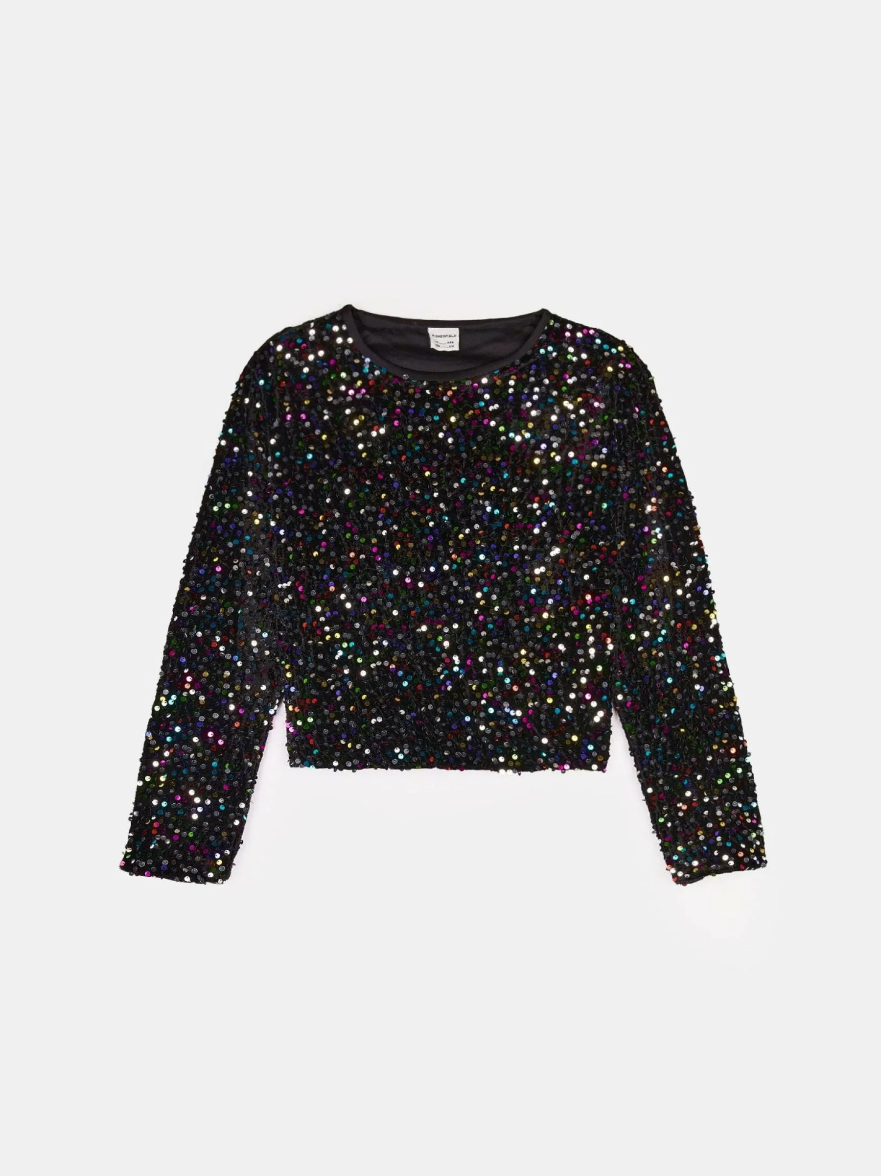 Kolor: czarnyKrój: regularTyp: topRekaw: długi rękawDługość: krótkiPattern style: z cekinamiDetal: nad głowąMat…
