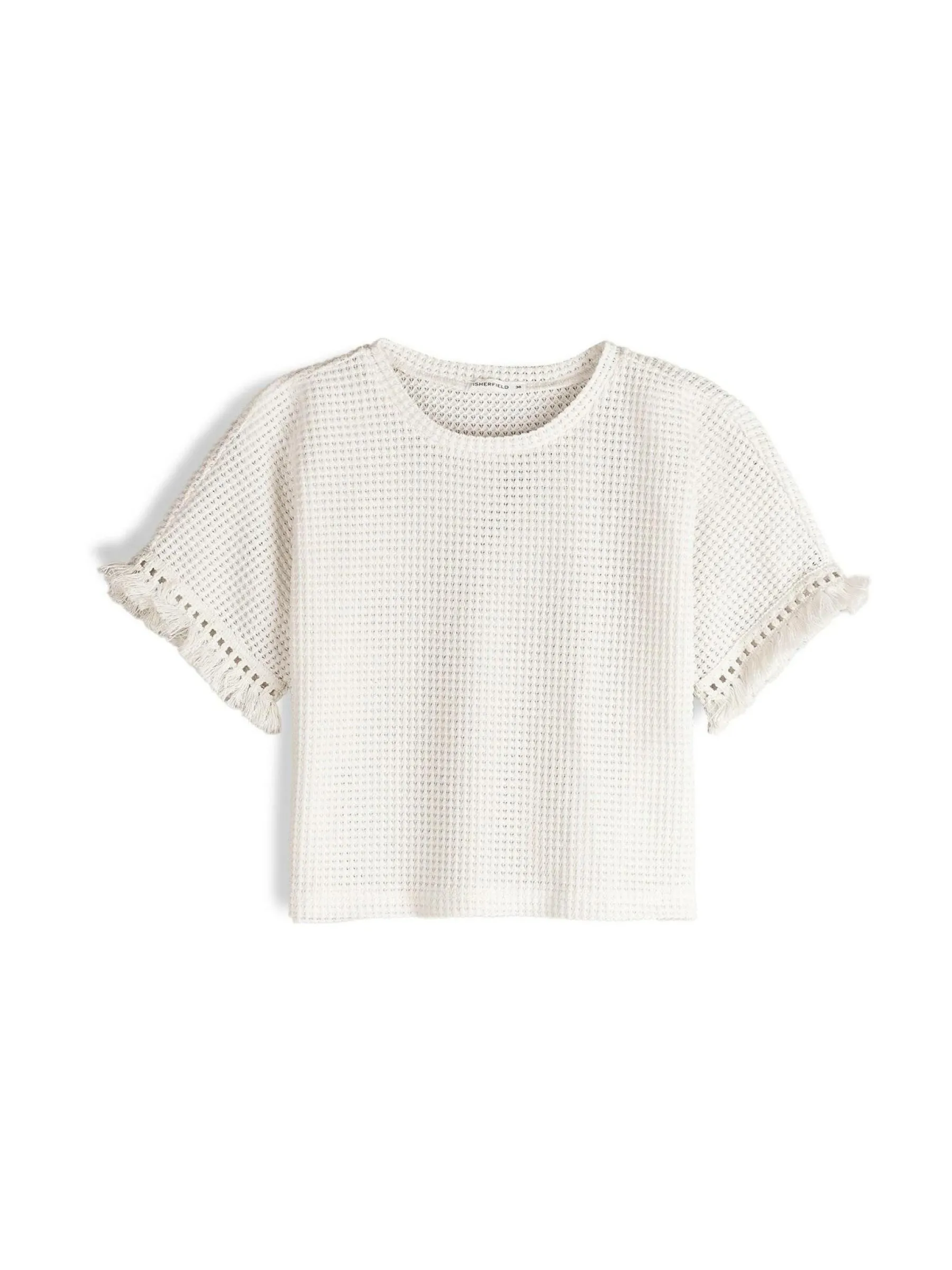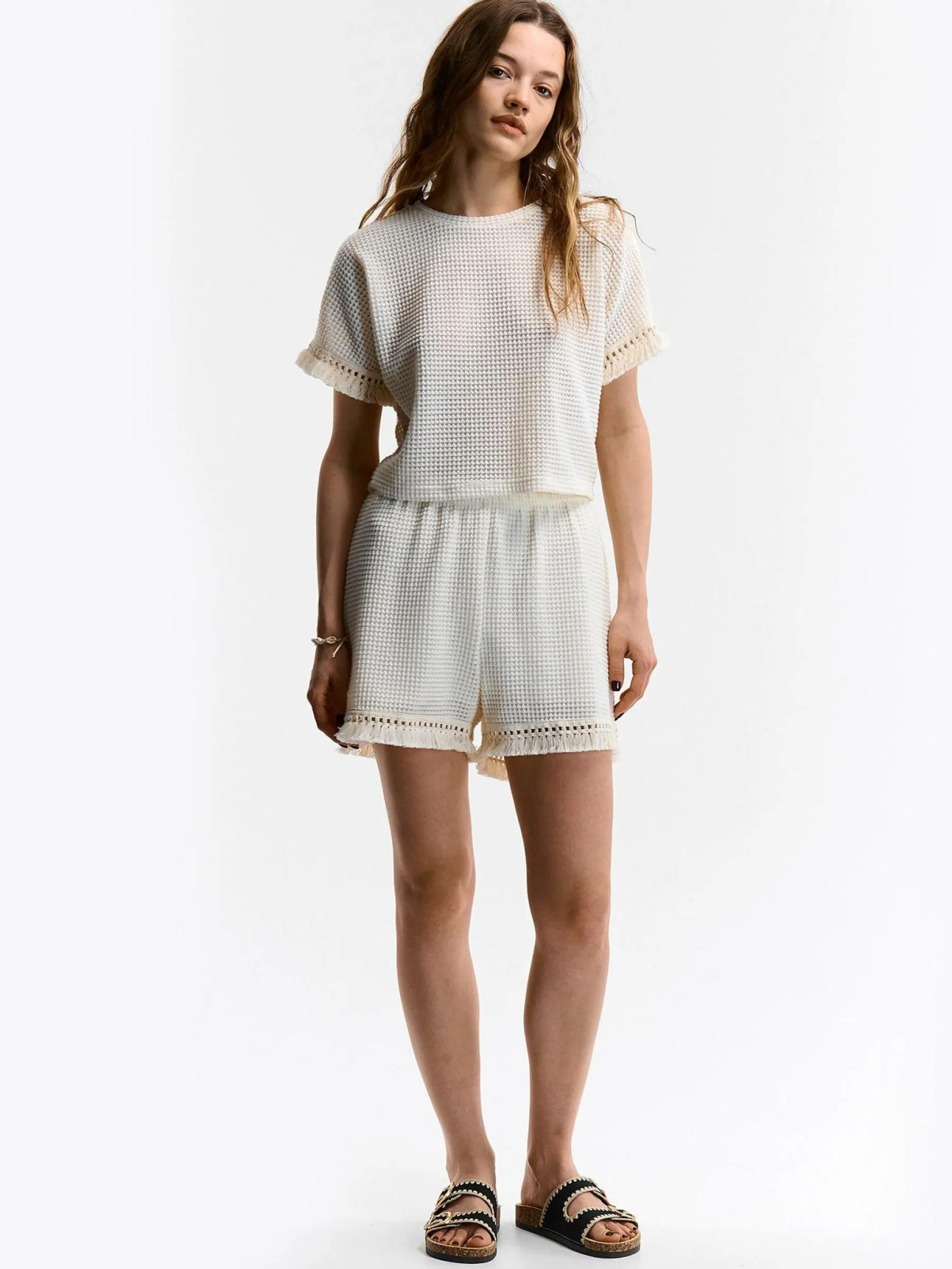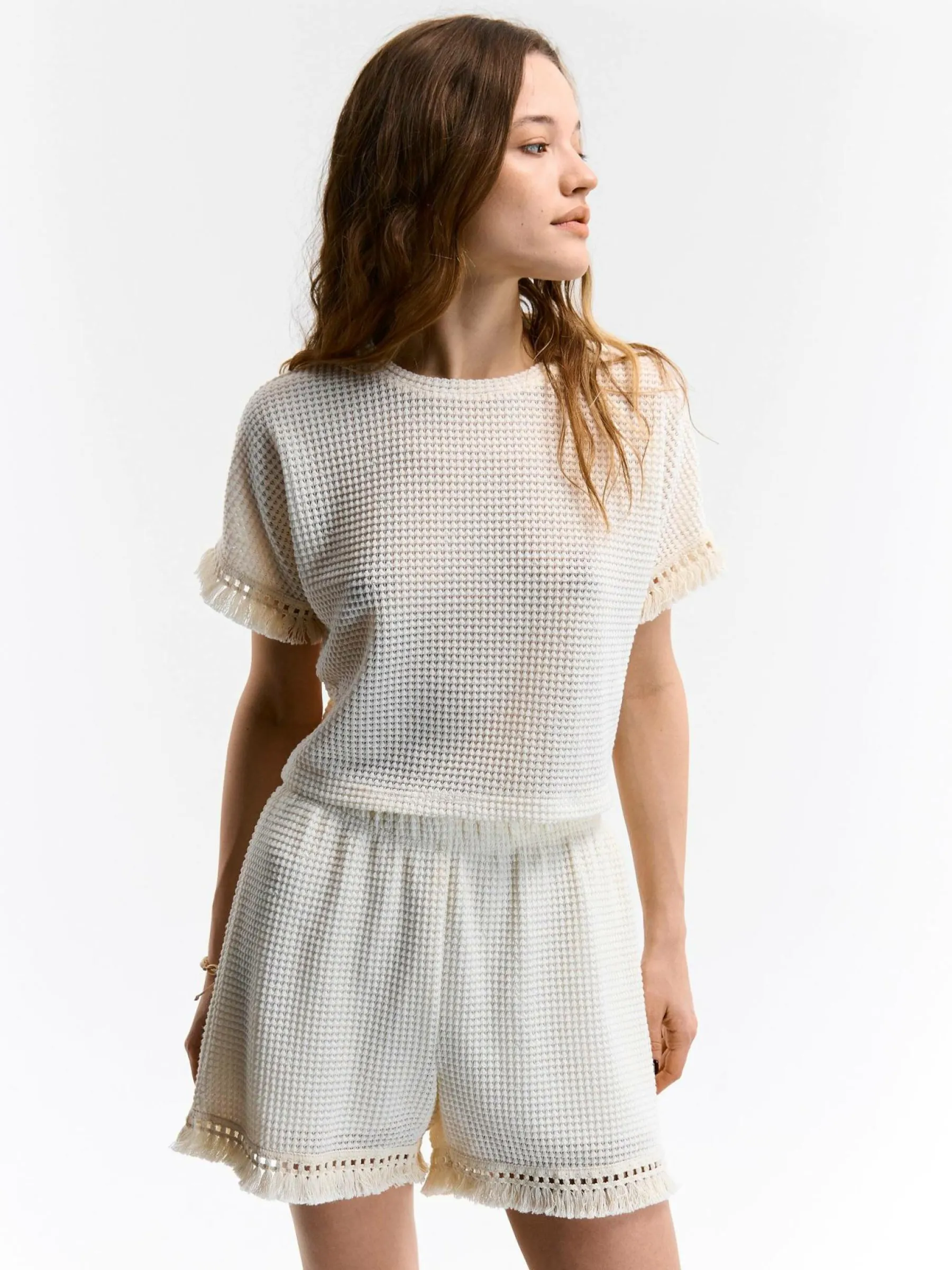 Kolor: beżowyKrój: regularTyp: topRekaw: krótki rękawDługość: krótki topPattern style: pojedynczy kolor, struktu…
