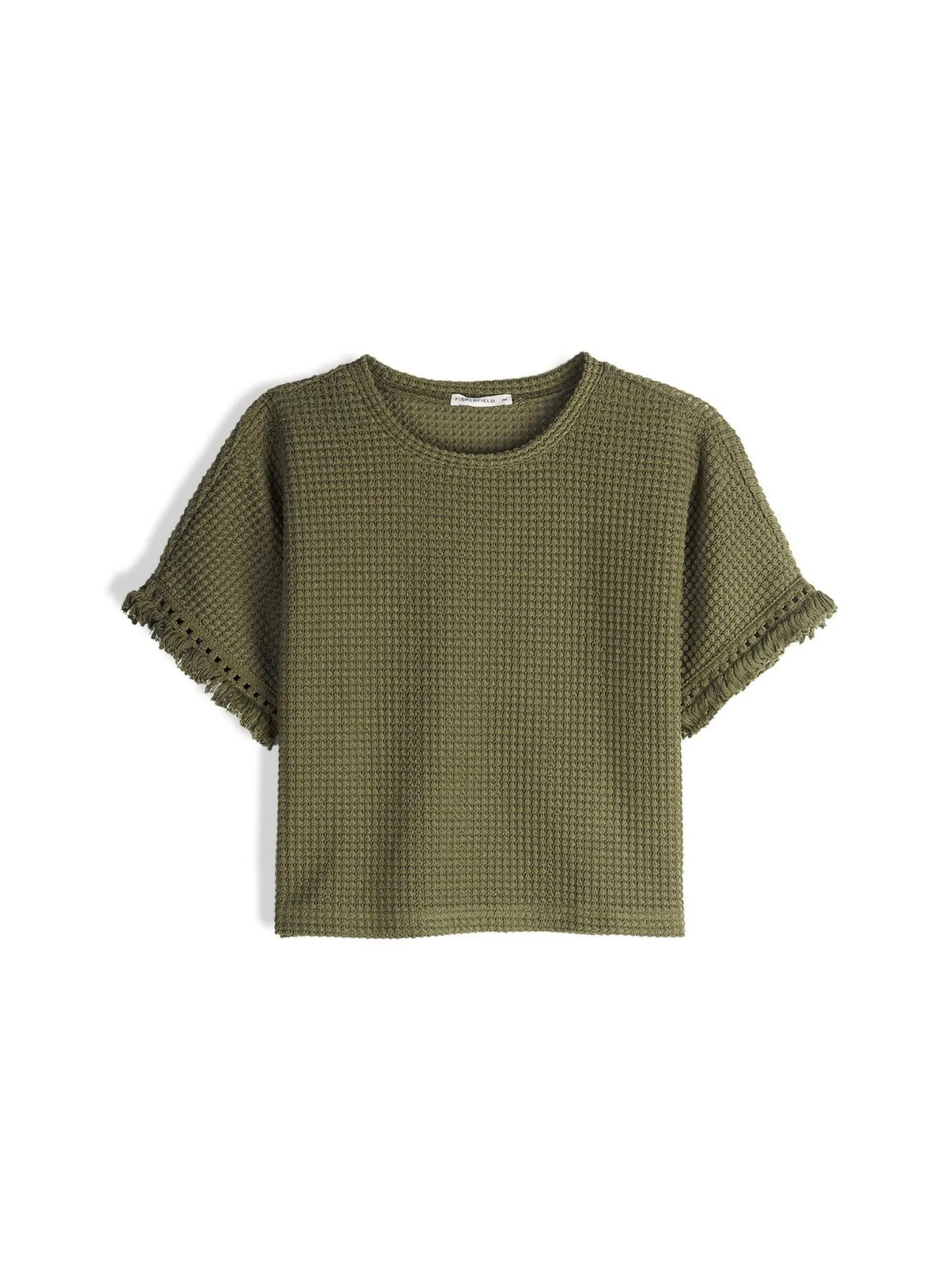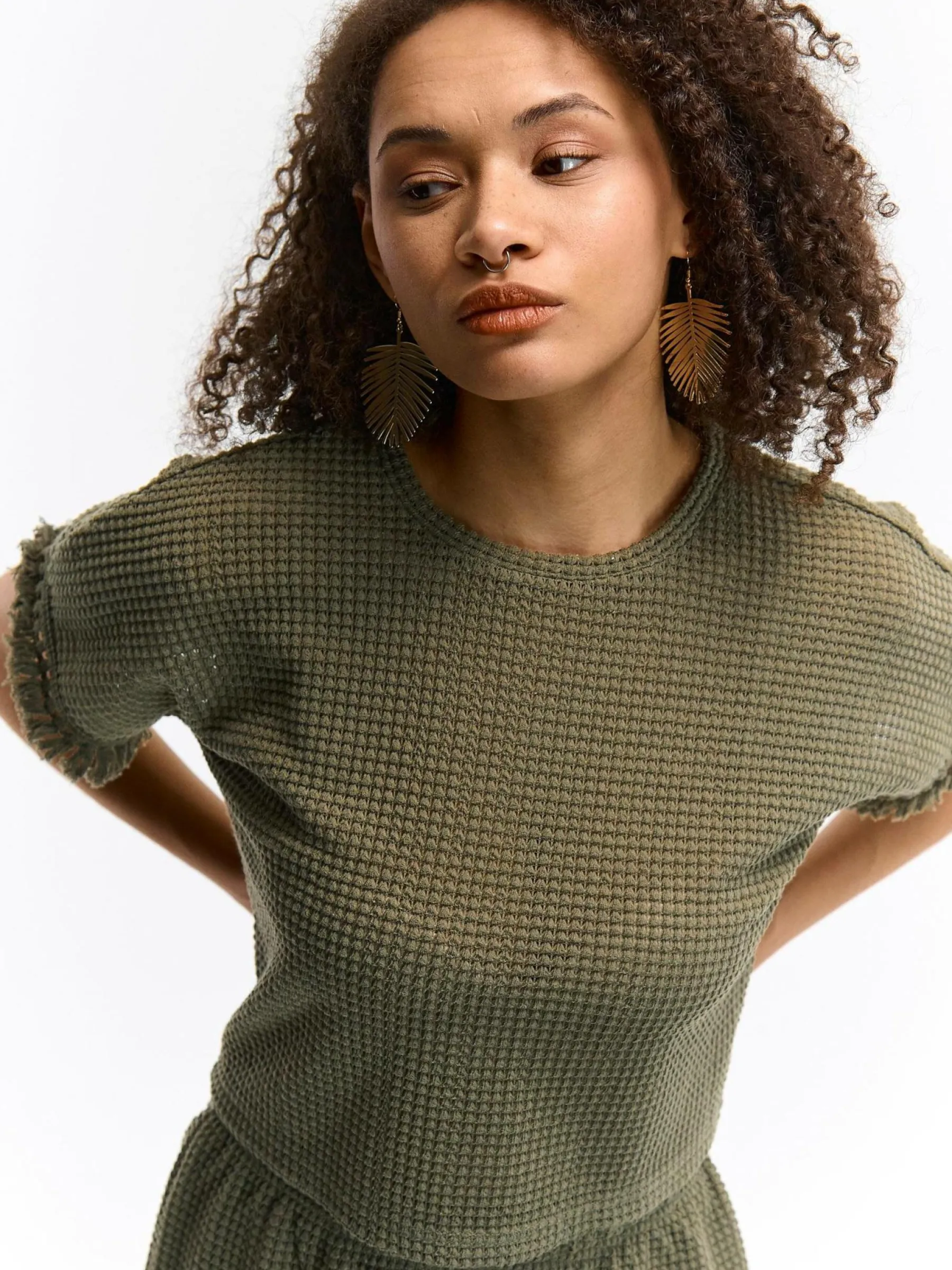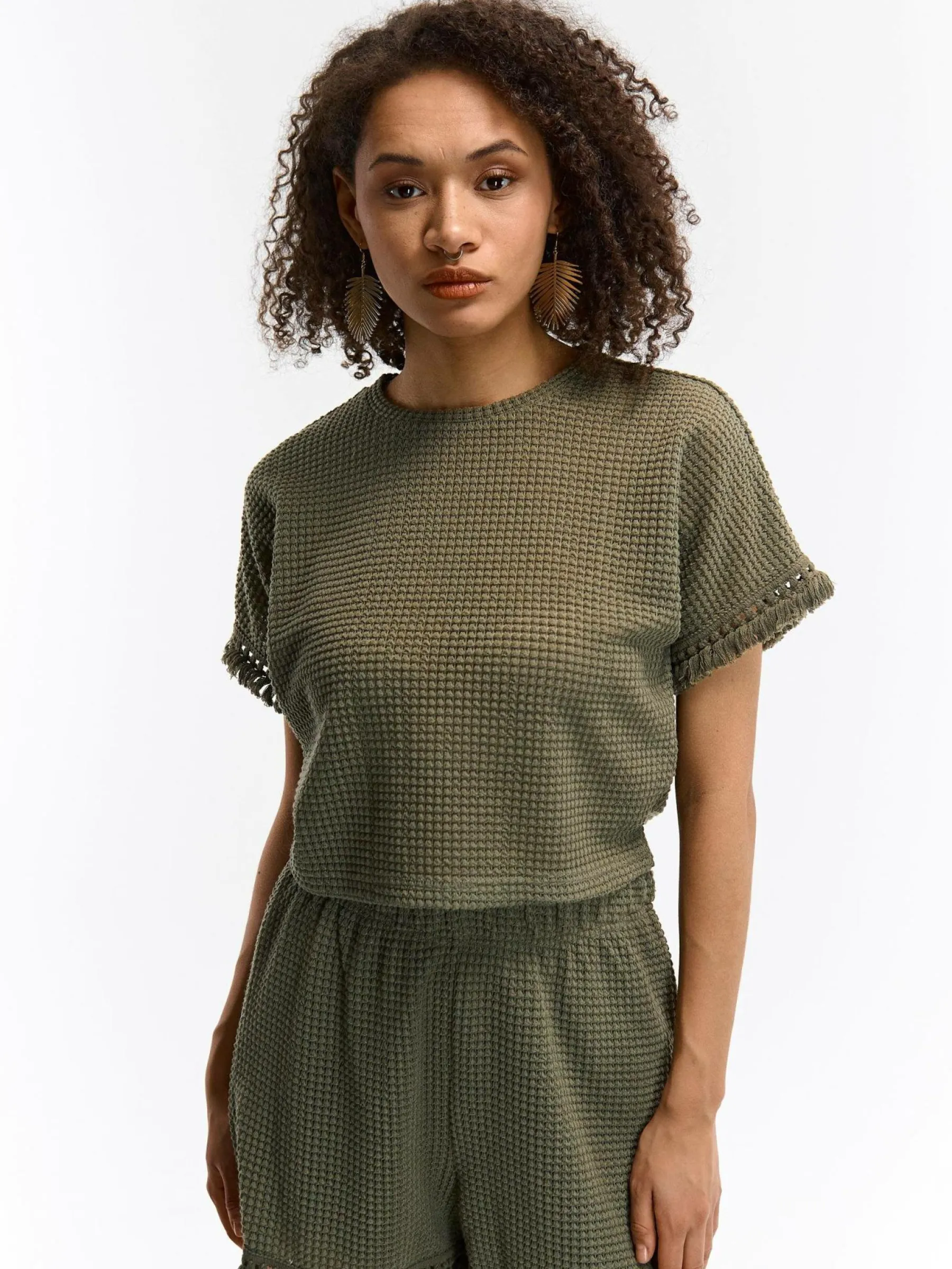 Kolor: khakiKrój: regularTyp: topRekaw: krótki rękawDługość: krótki topPattern style: pojedynczy kolor, strukturo…