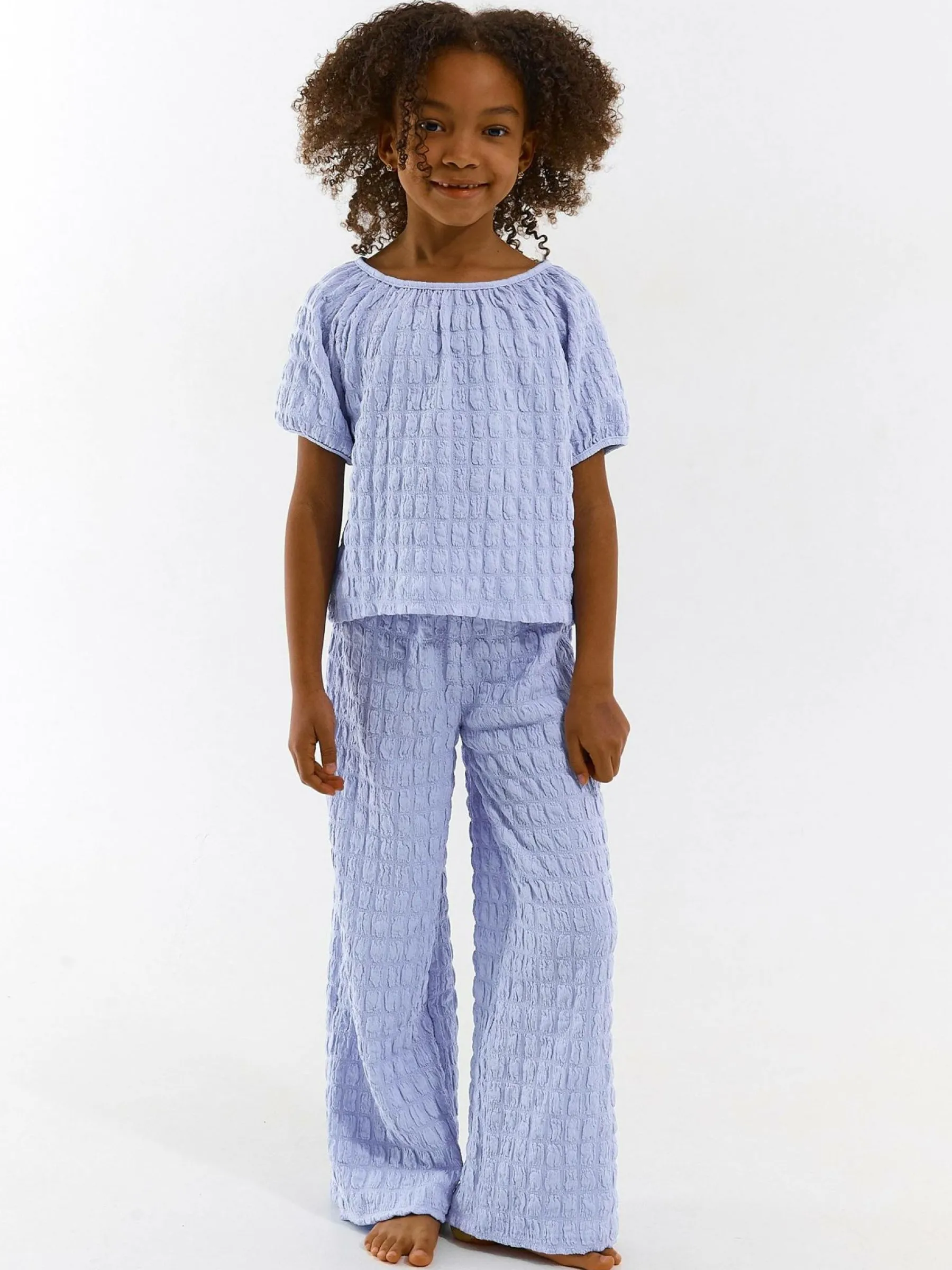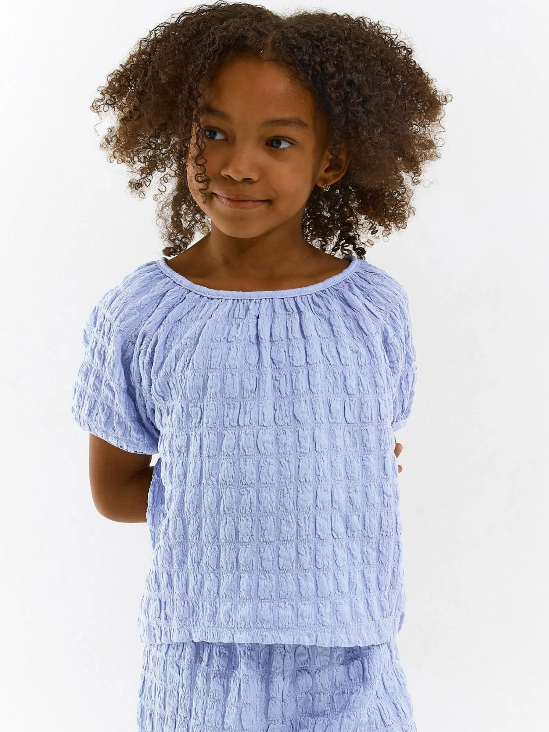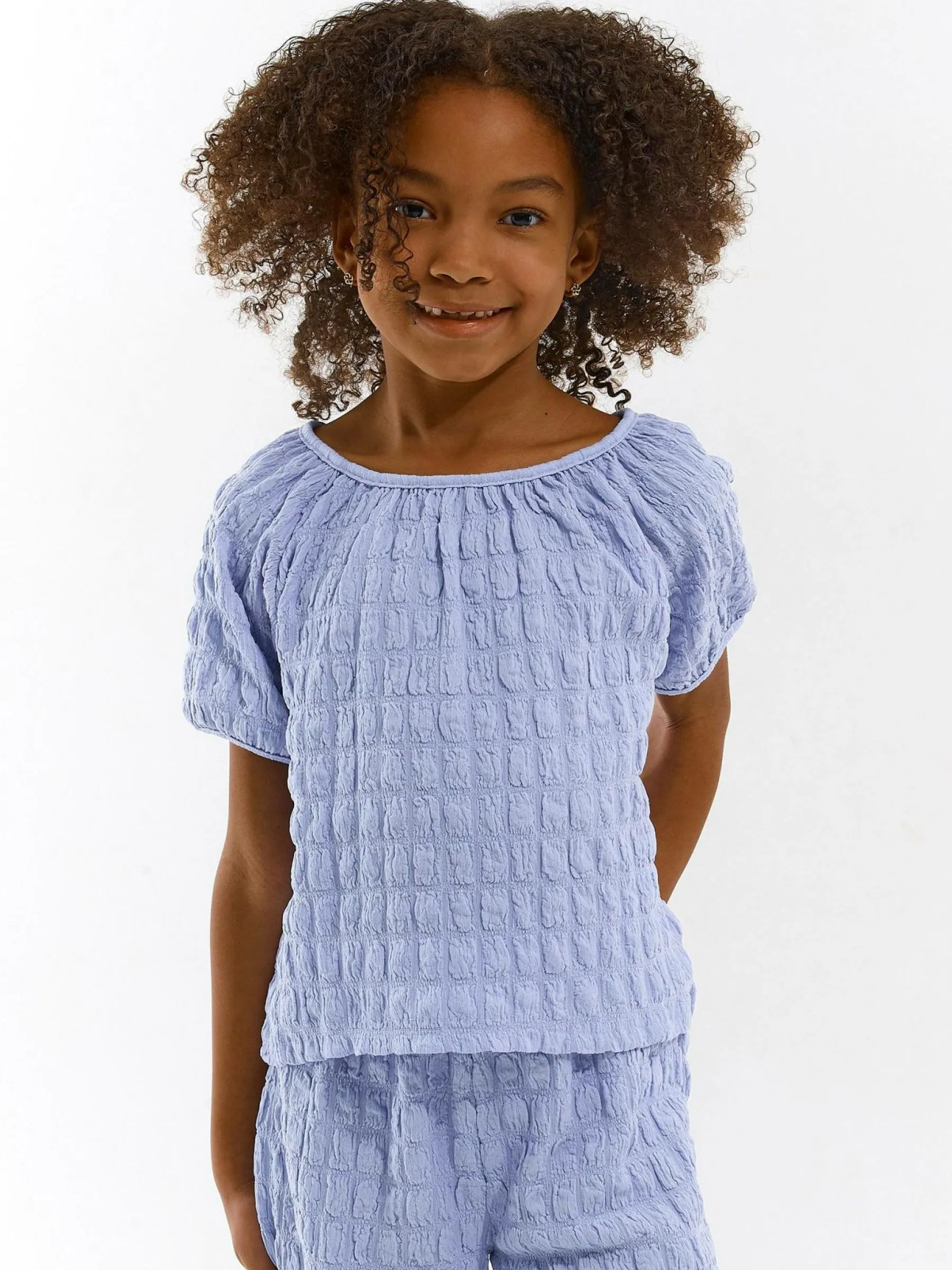 Kolor: niebieskiKrój: regularTyp: topRekaw: krótki rękawDługość: krótkiPattern style: pojedynczy kolor, strukturo…