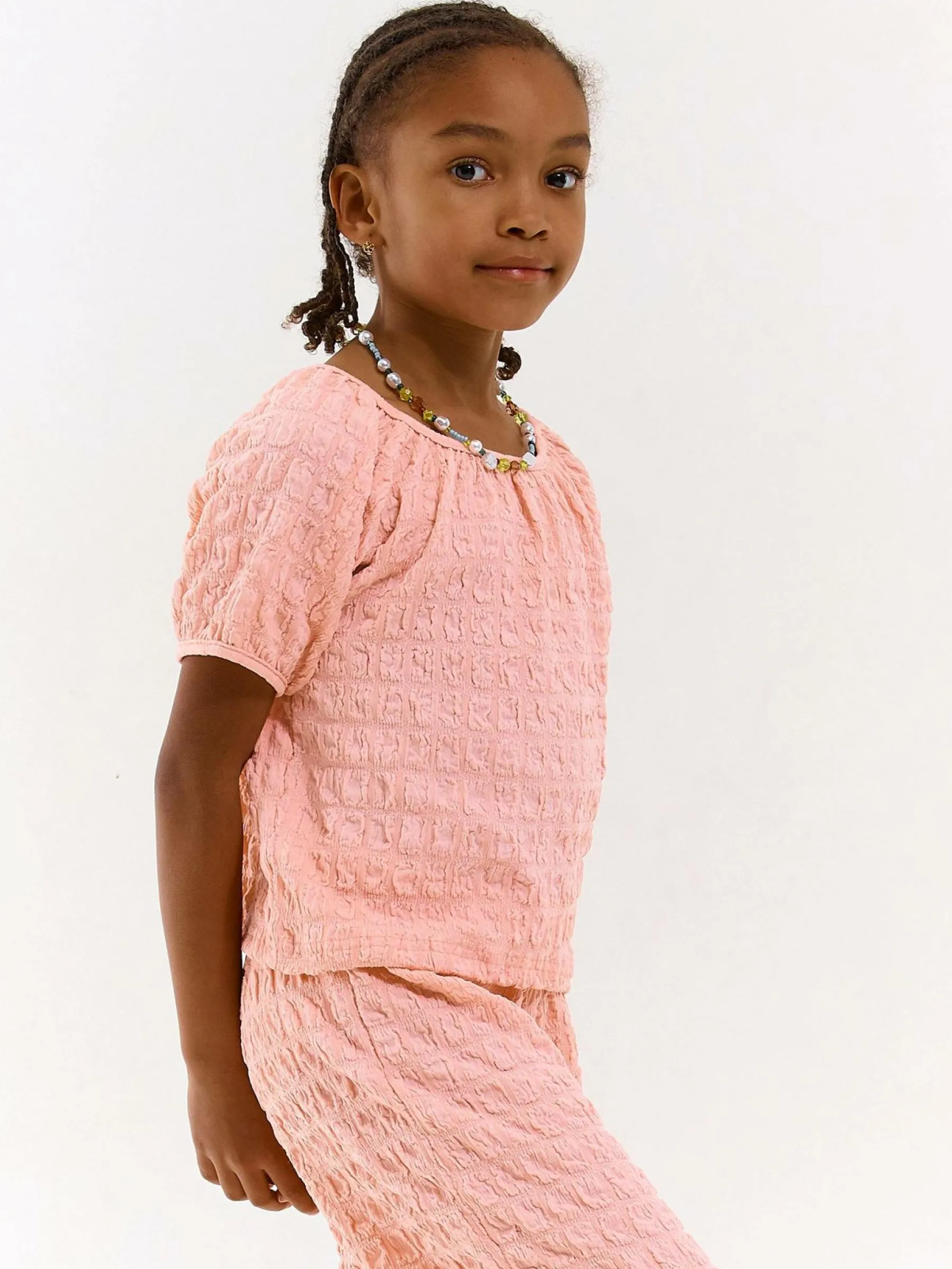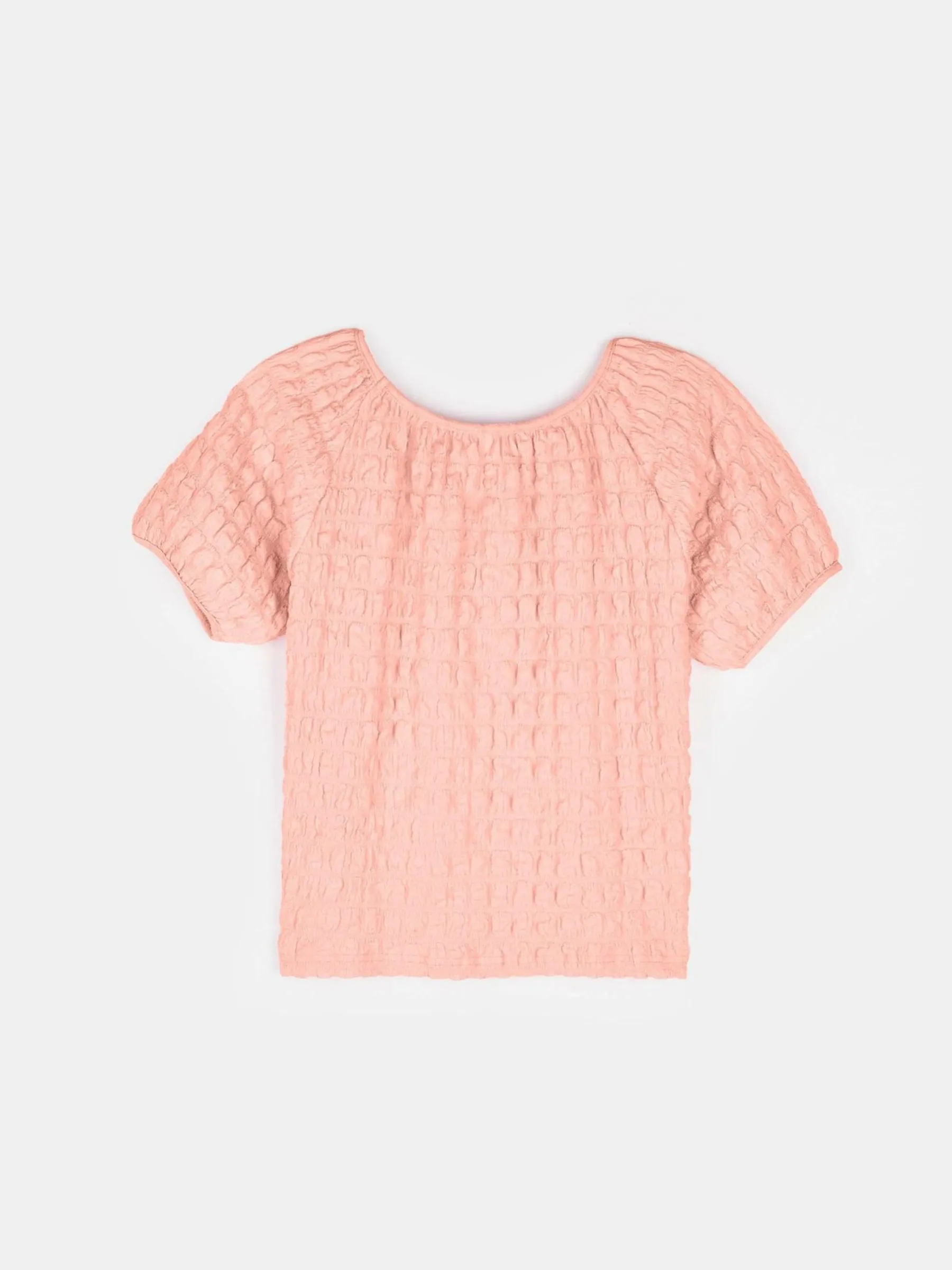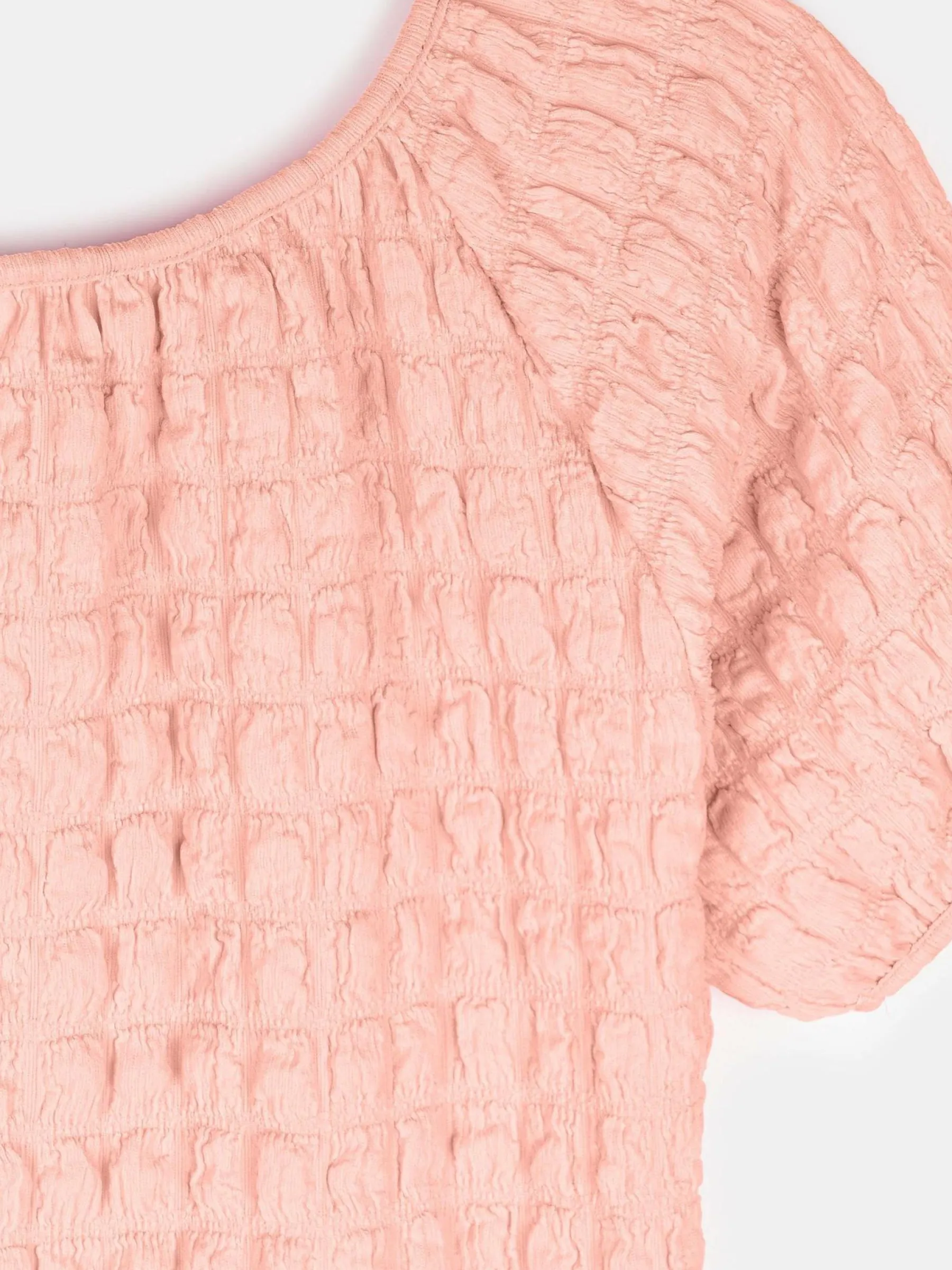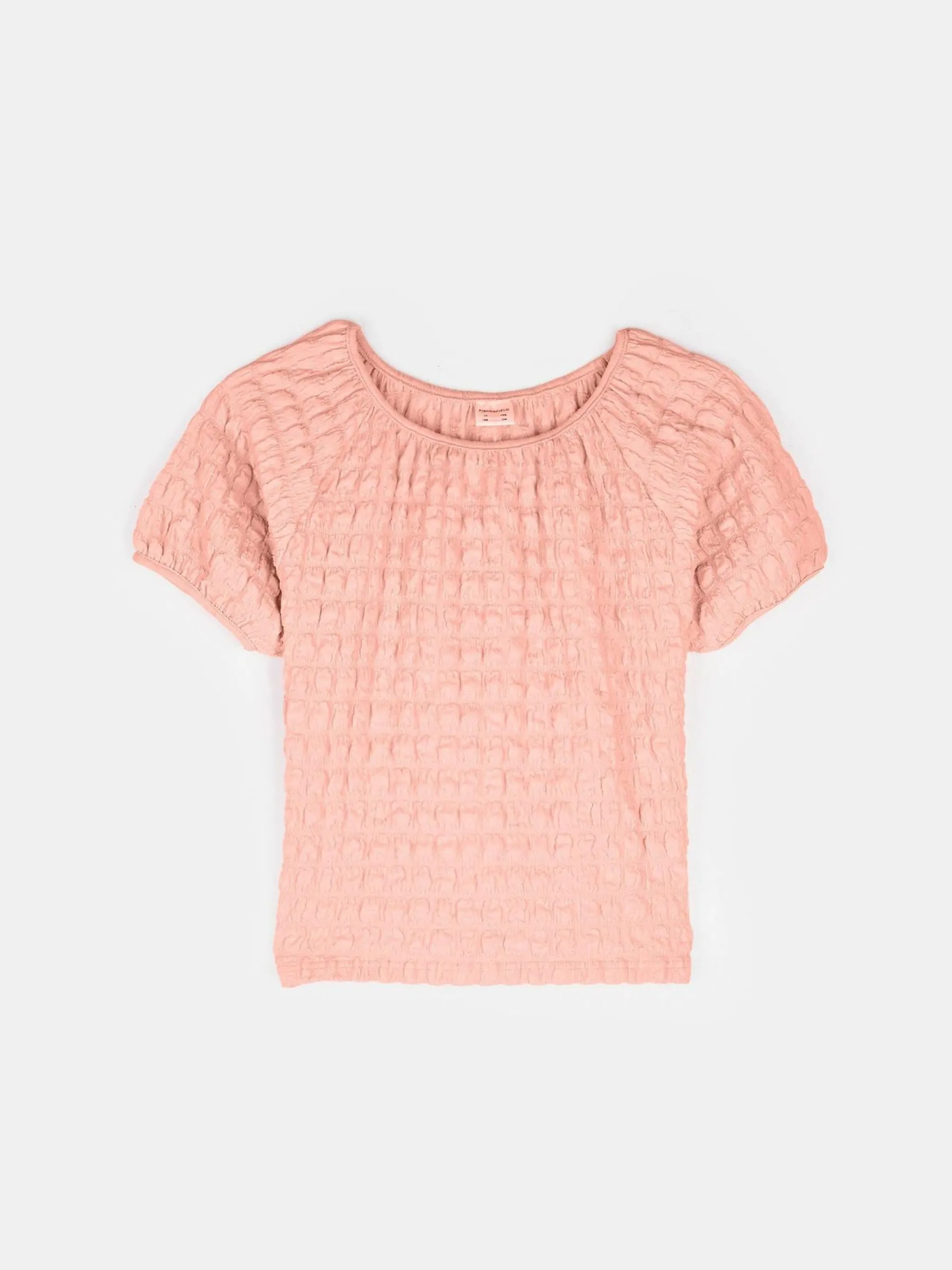 Kolor: różowyKrój: regularTyp: topRekaw: krótki rękawDługość: krótkiPattern style: pojedynczy kolor, strukturow…