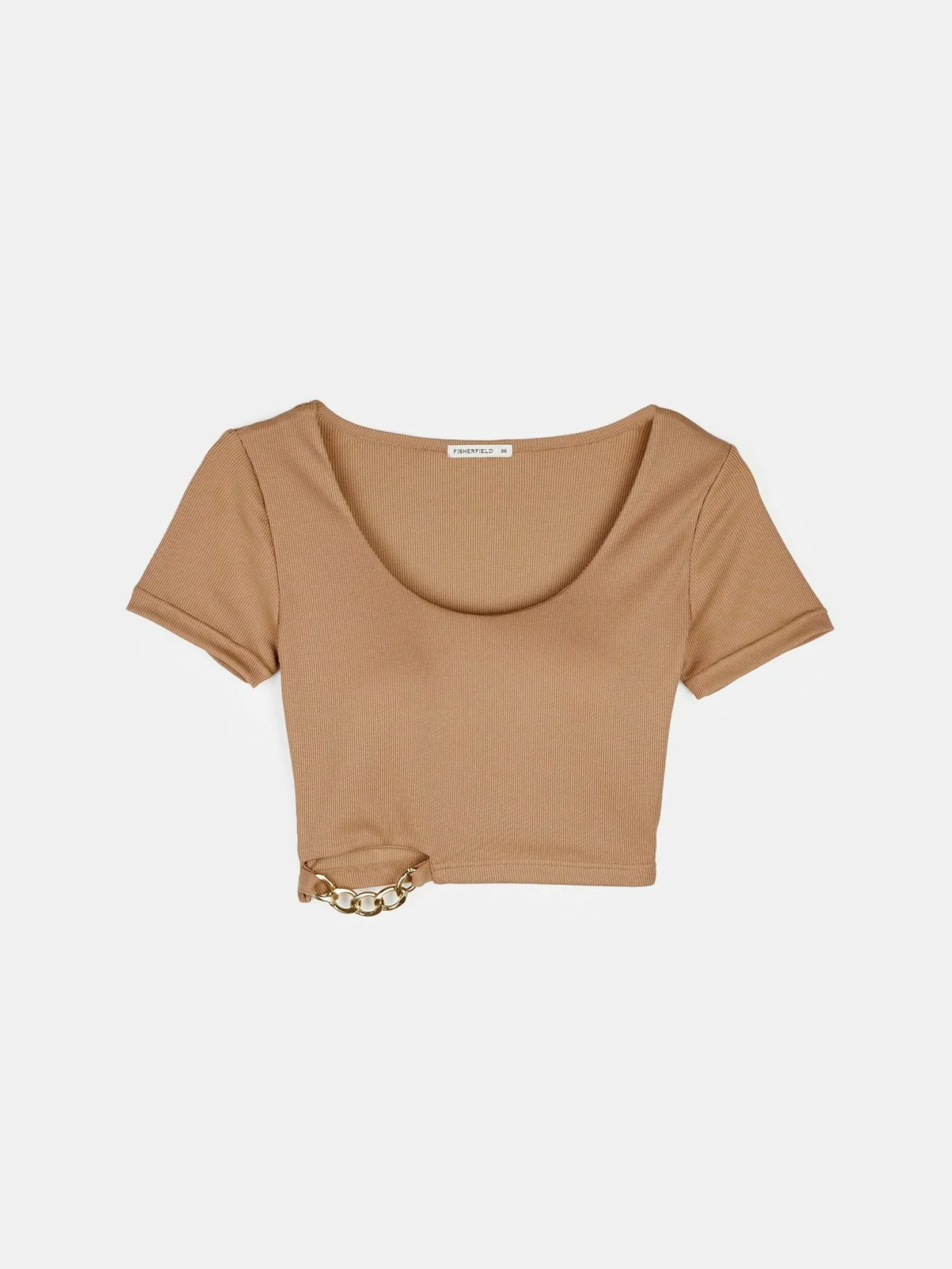Kolor: beżowyKrój: regularTyp: topRekaw: bez rękawówDługość: krótki topPattern style: pojedynczy kolor, żebrowa…