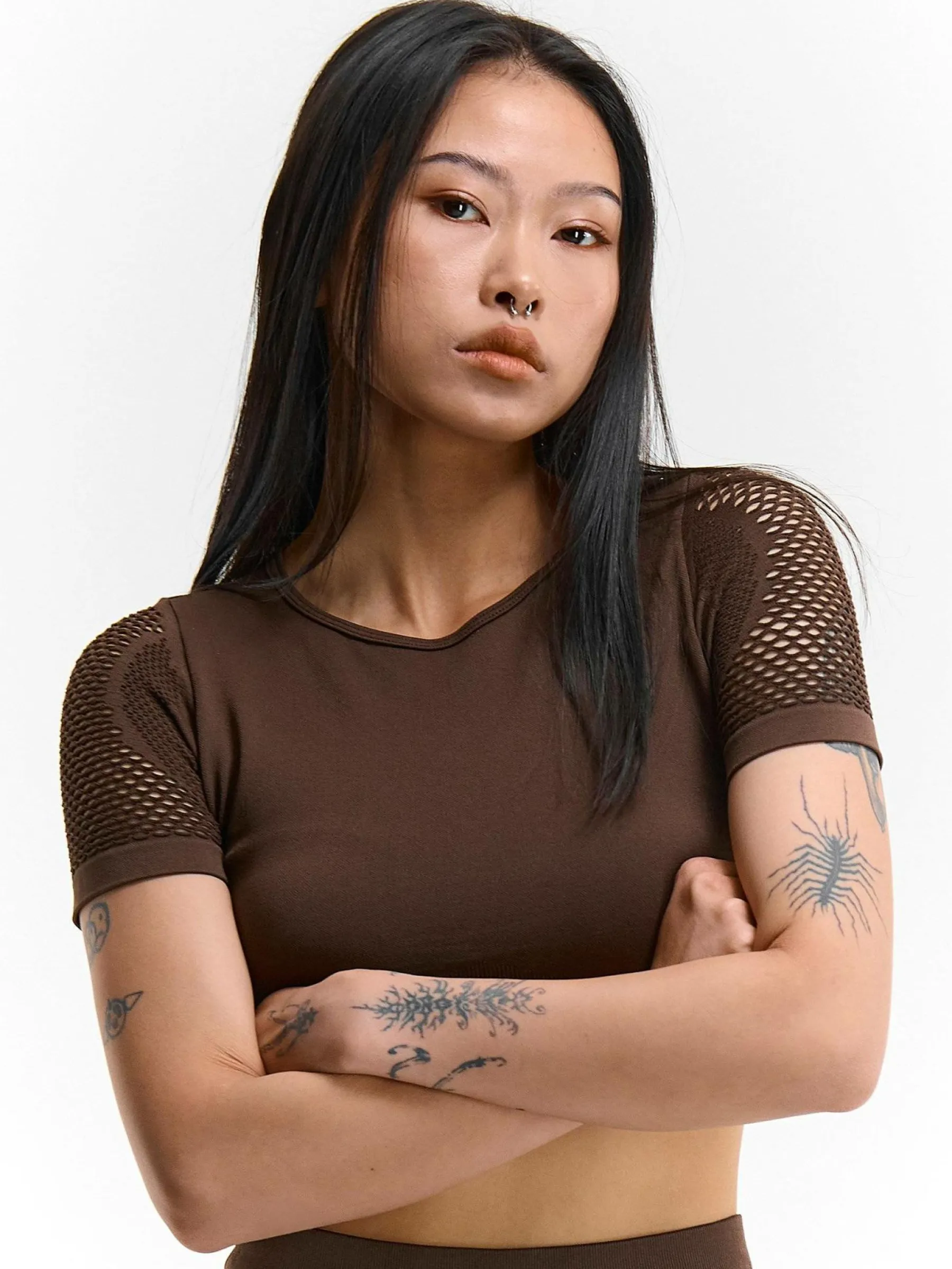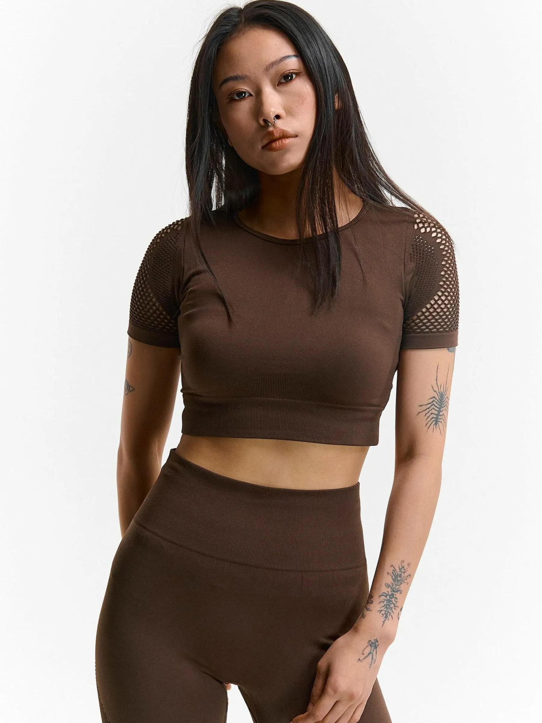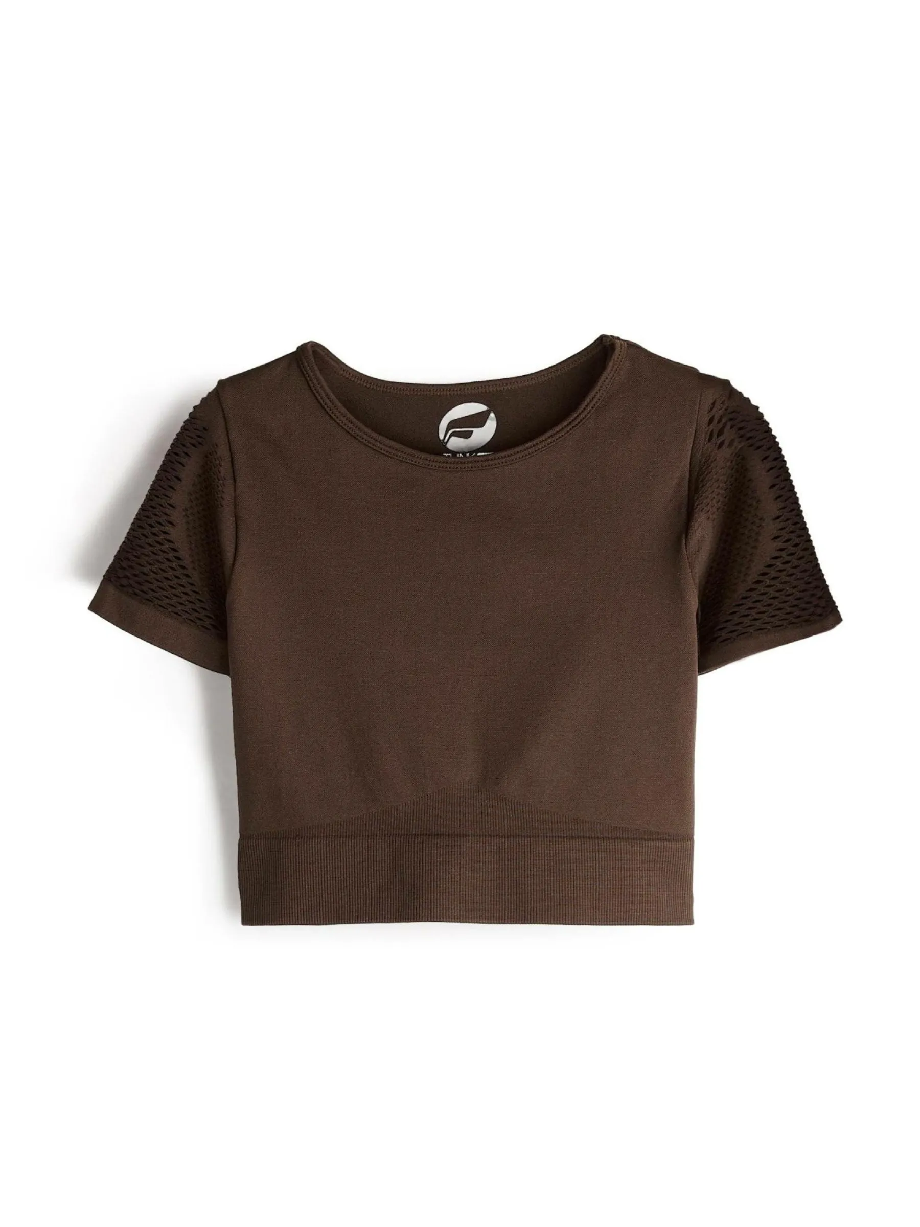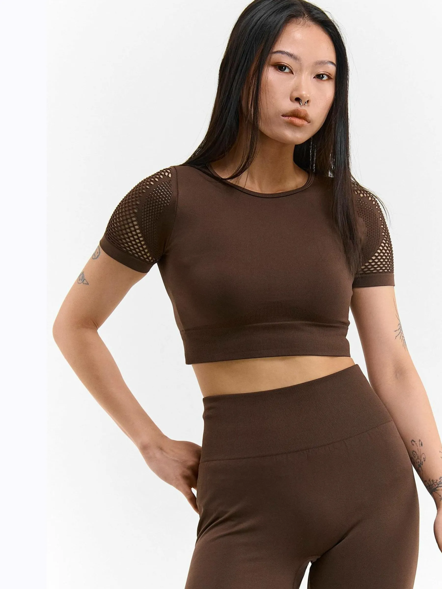 Kolor: brązowyKrój: regularTyp: topRekaw: krótki rękawDługość: krótki topPattern style: pojedynczy kolorDetal: n…
