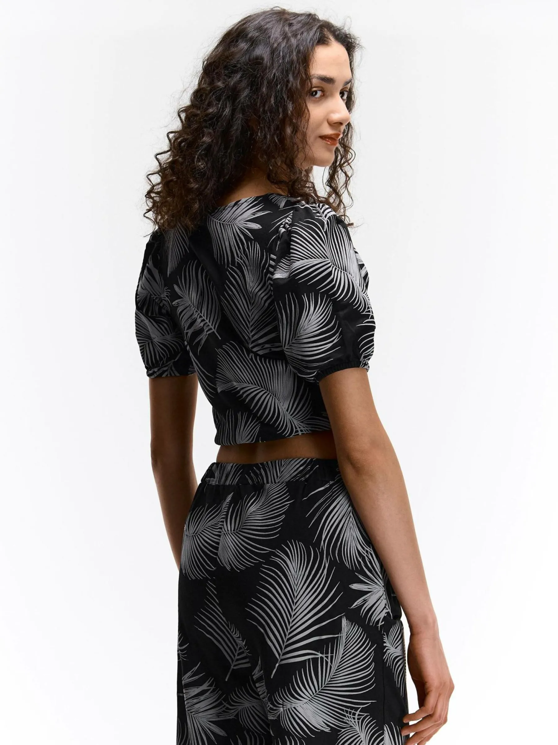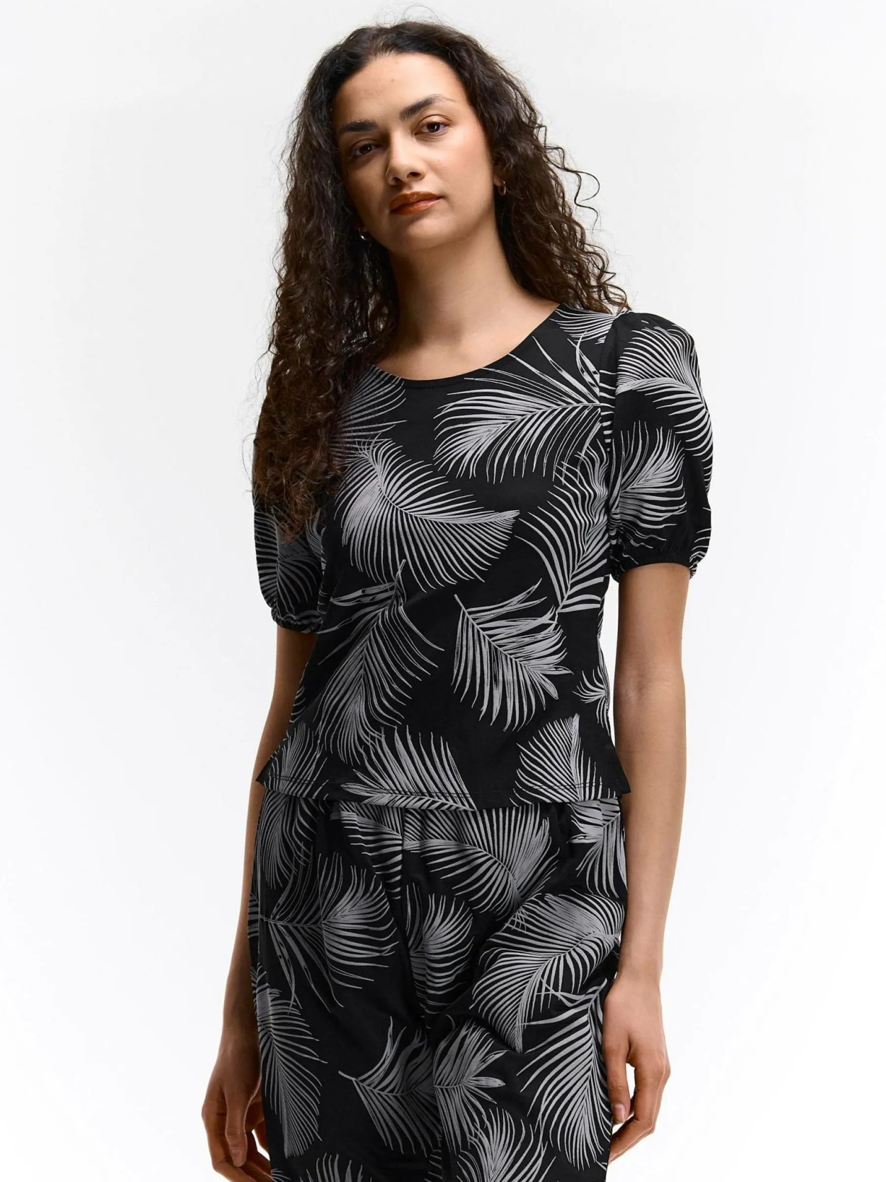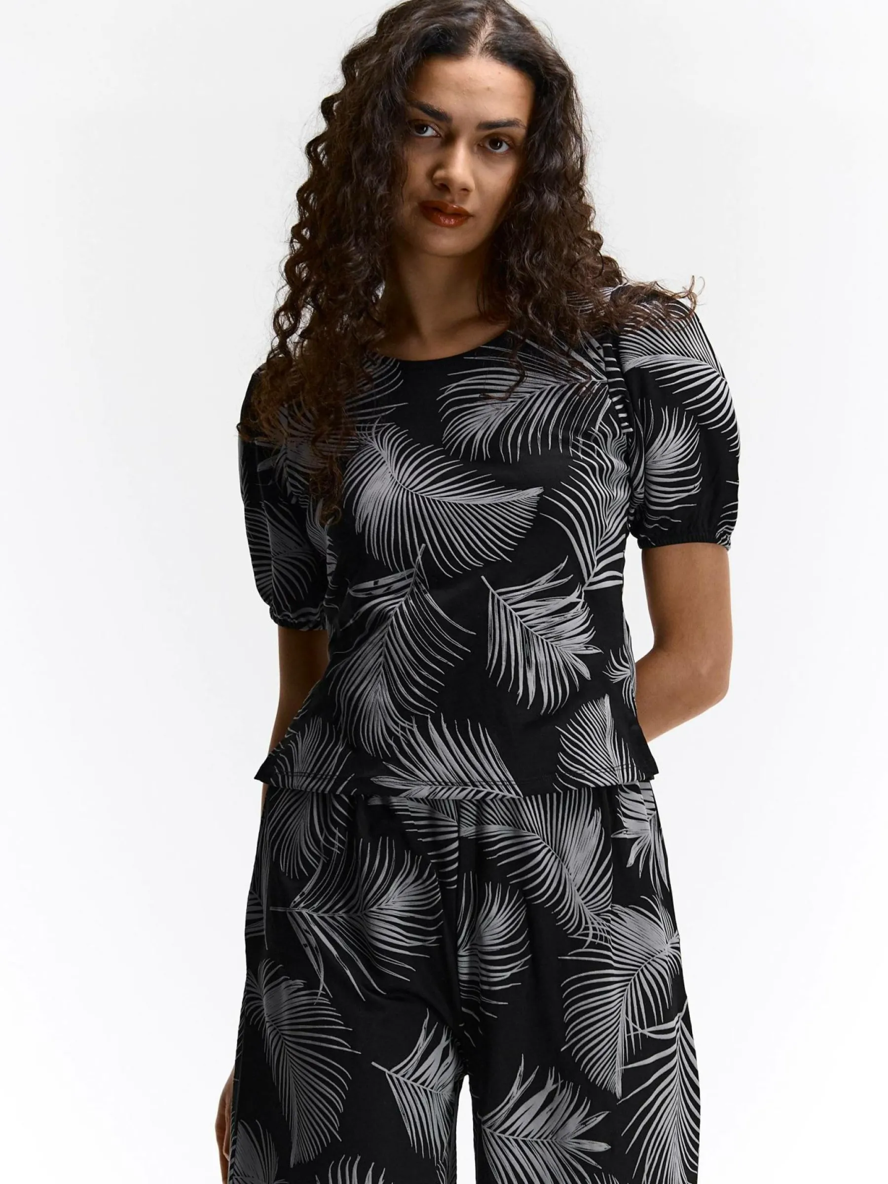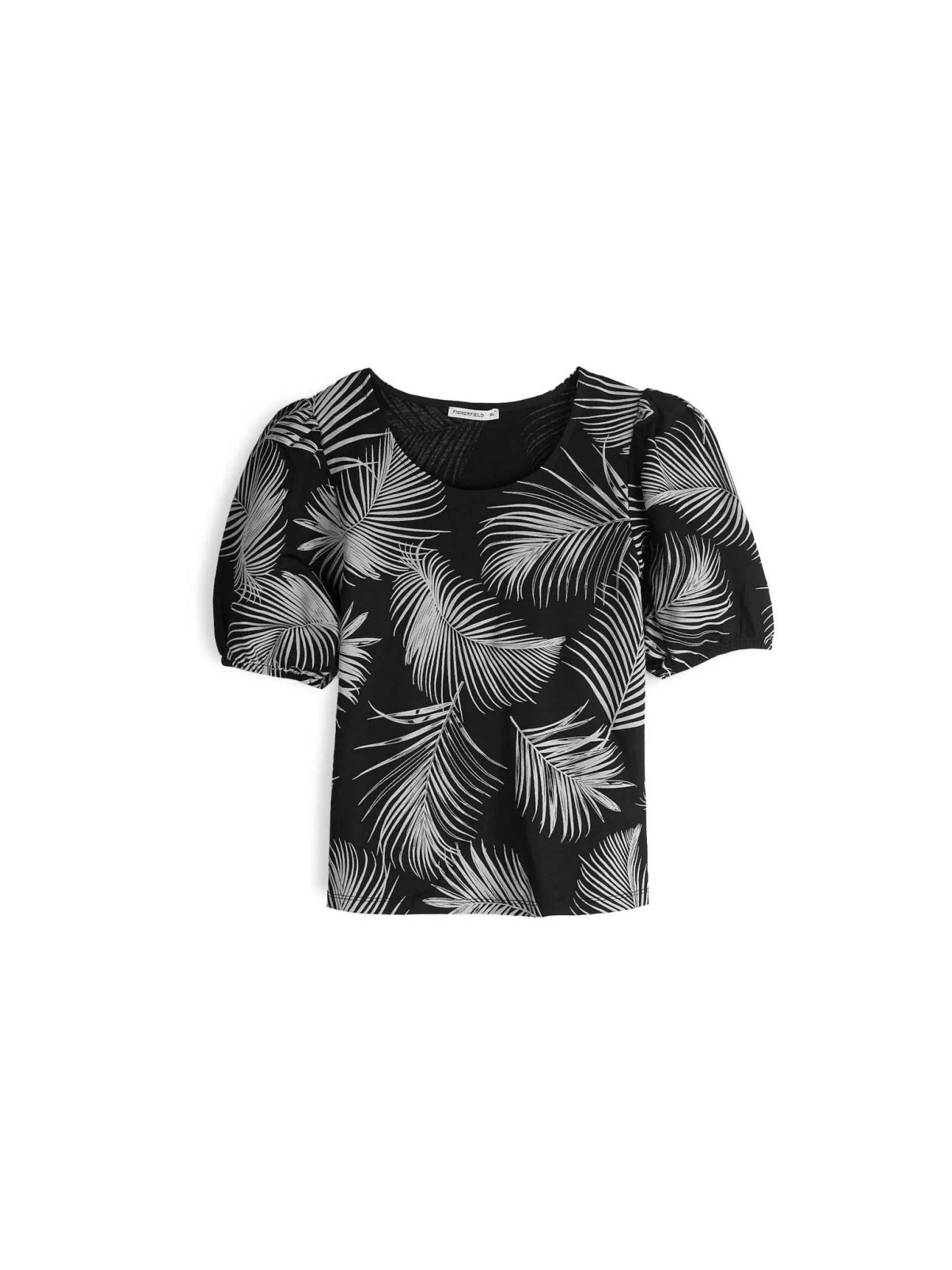 Kolor: czarnyKrój: regularTyp: topRekaw: krótki rękawDługość: krótkiPattern style: kwiatoweDetal: nad głowąMate…
