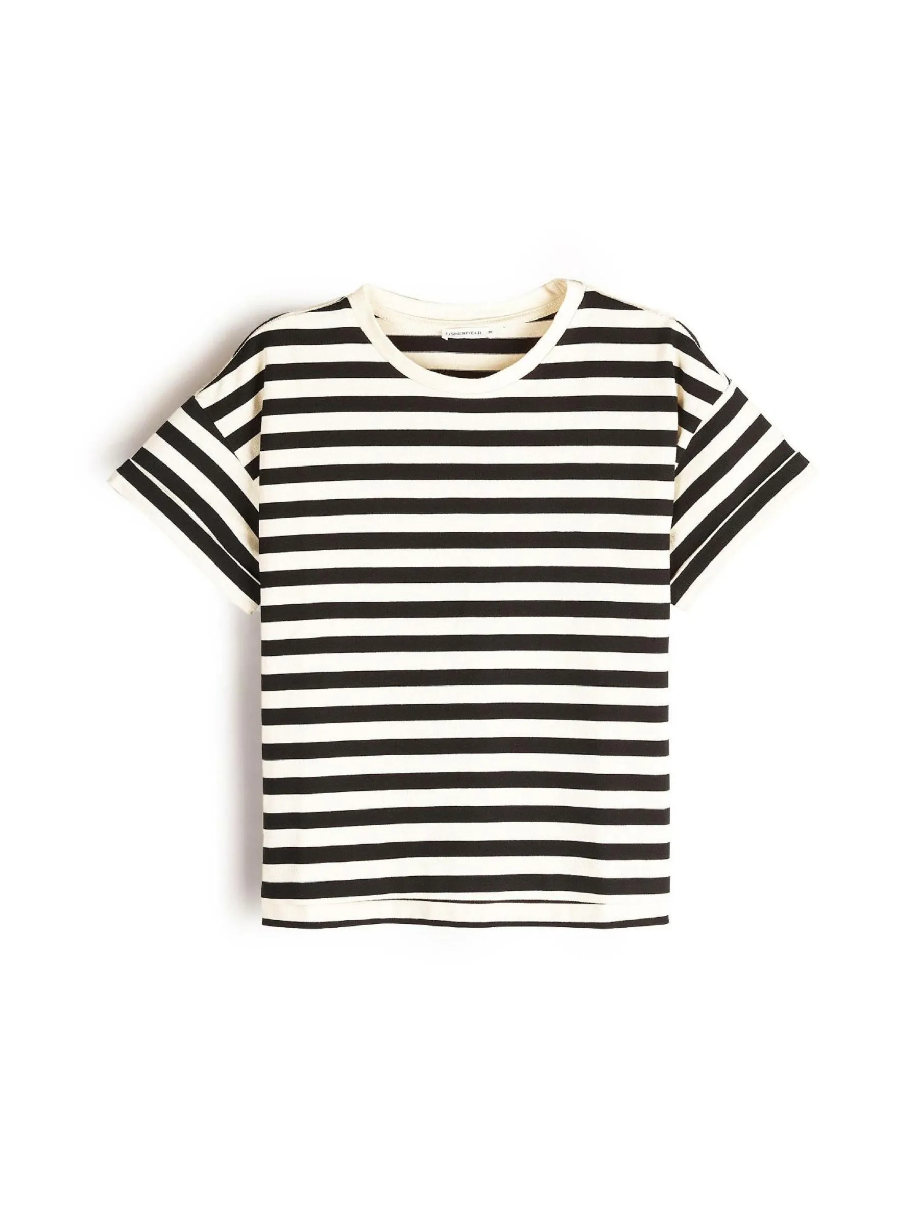 Kolor: beżowy, białyKrój: podstawowyTyp: topRekaw: krótki rękawDługość: krótkiPattern style: w prążkiDetal: n…