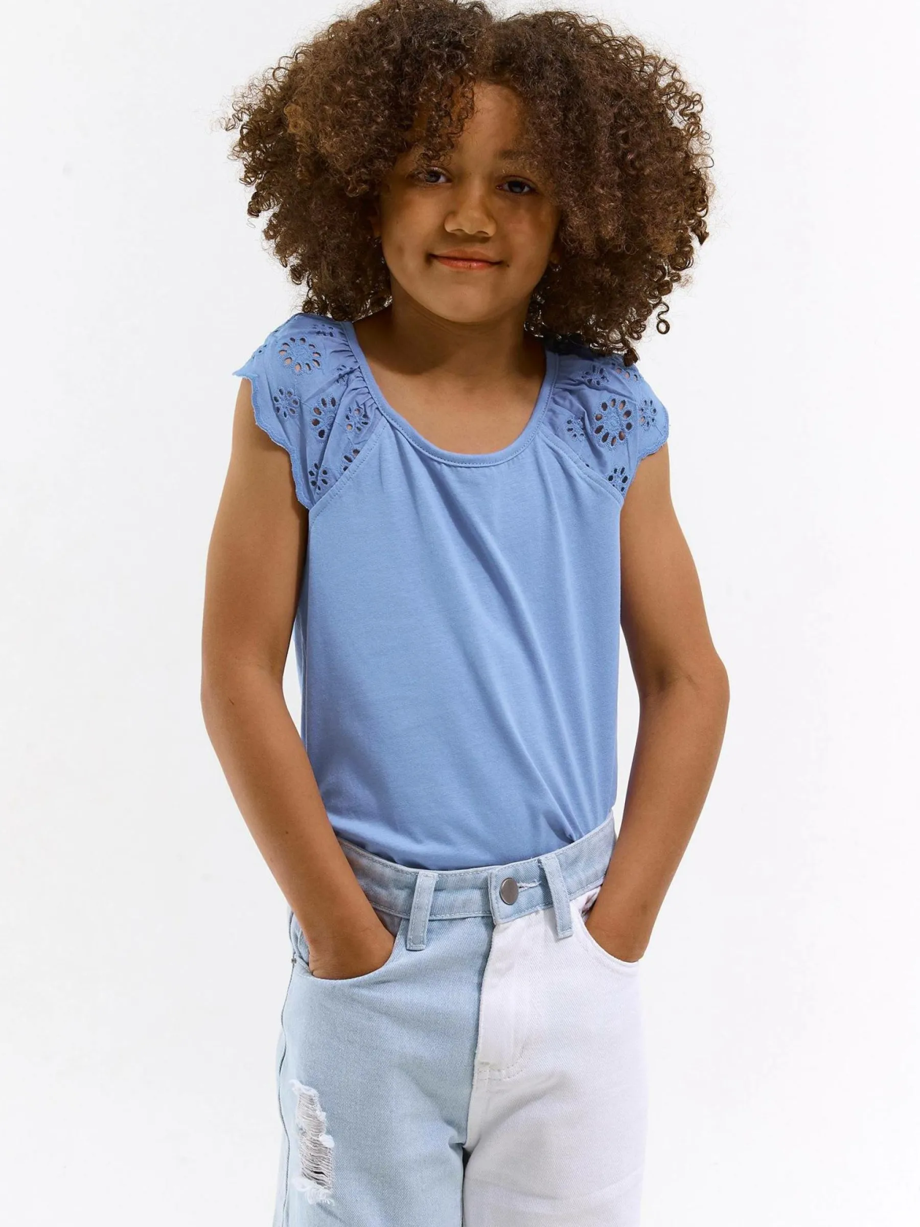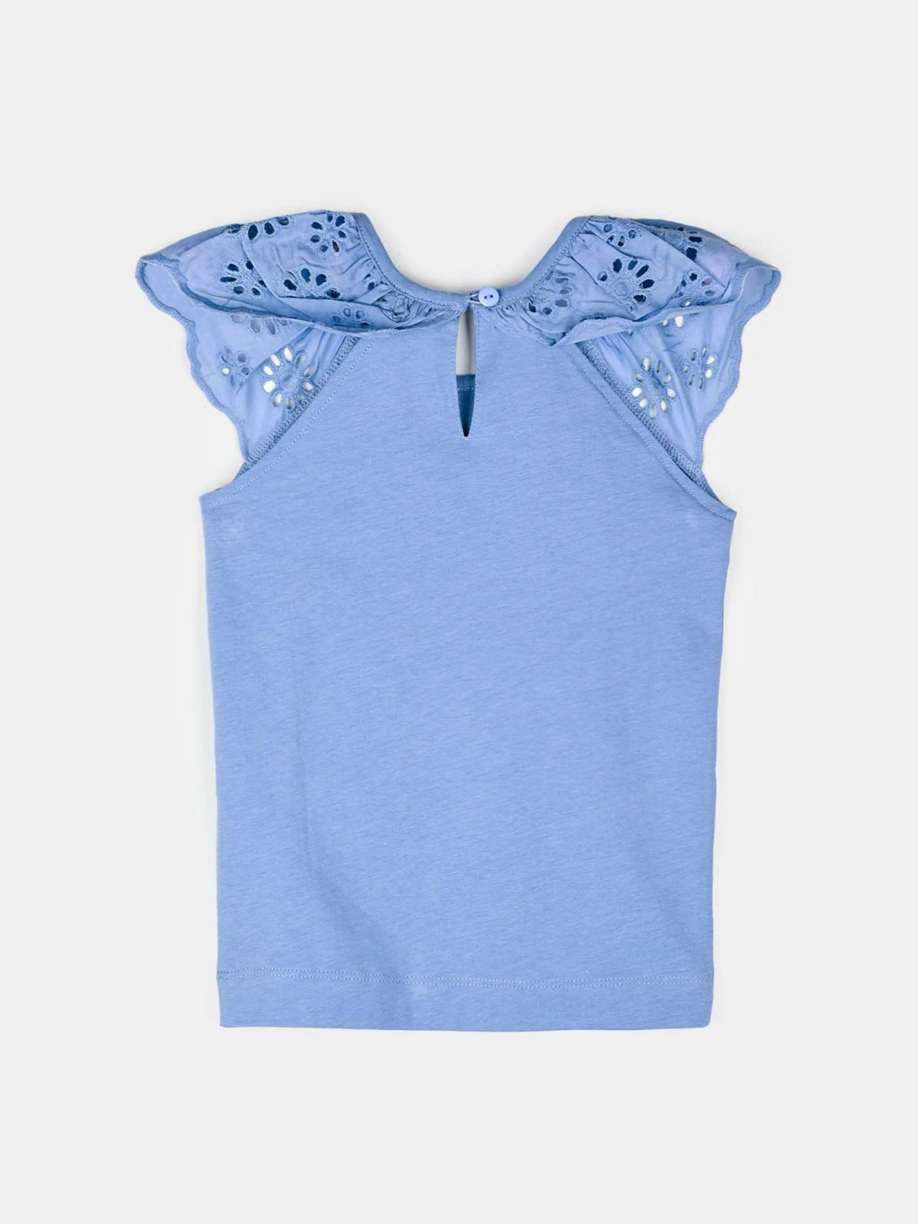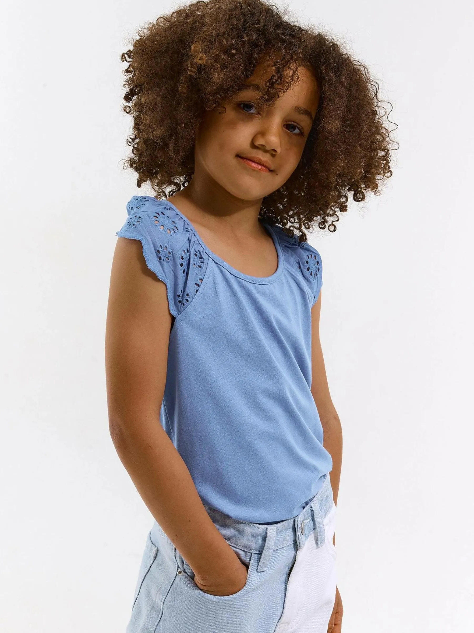 Kolor: niebieskiKrój: z falbanąTyp: topRekaw: bez rękawówDługość: krótkiPattern style: pojedynczy kolorDetal: na…