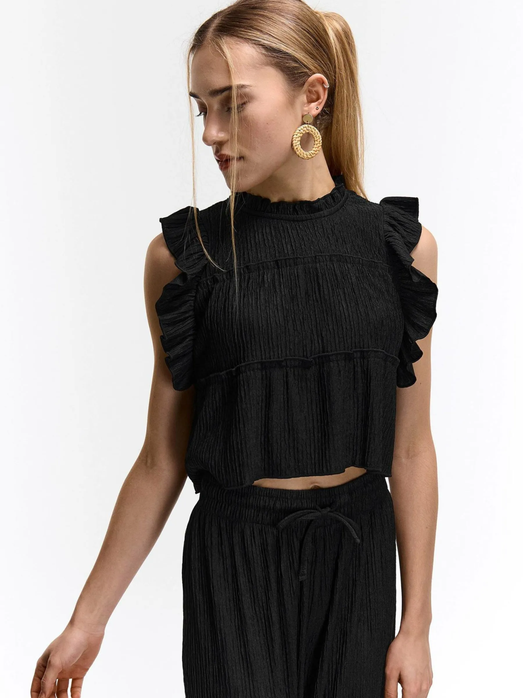 Kolor: czarnyKrój: z falbanąTyp: topRekaw: bez rękawówDługość: krótkiPattern style: pojedynczy kolorDetal: nad g…