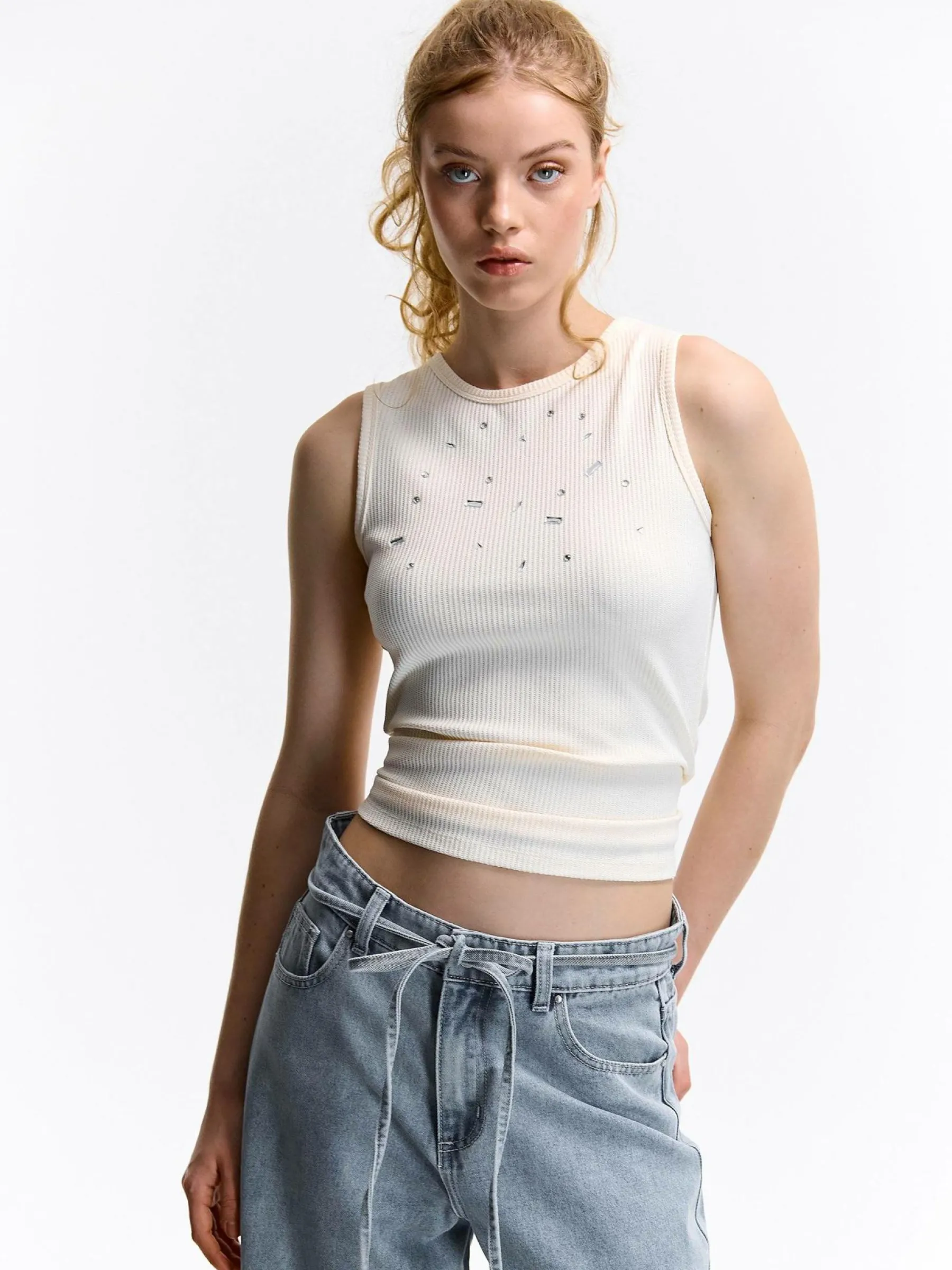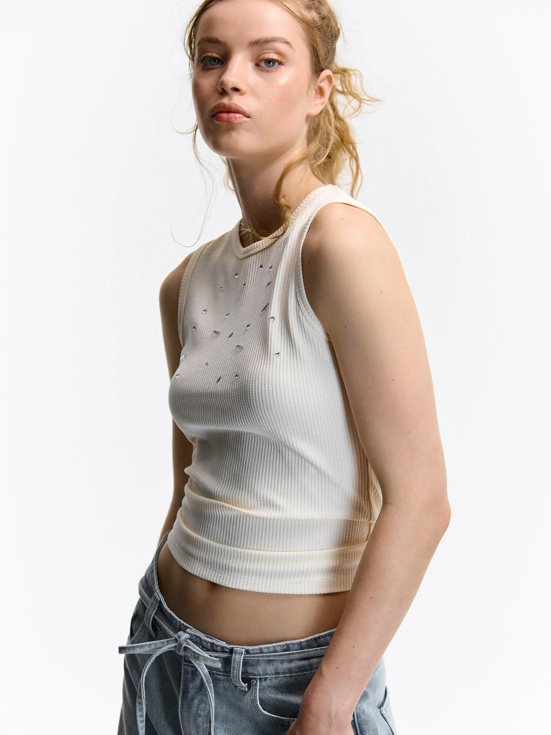 Kolor: białyKrój: regularTyp: podkoszulekRekaw: bez rękawówDługość: krótkiPattern style: pojedynczy kolor, żebr…