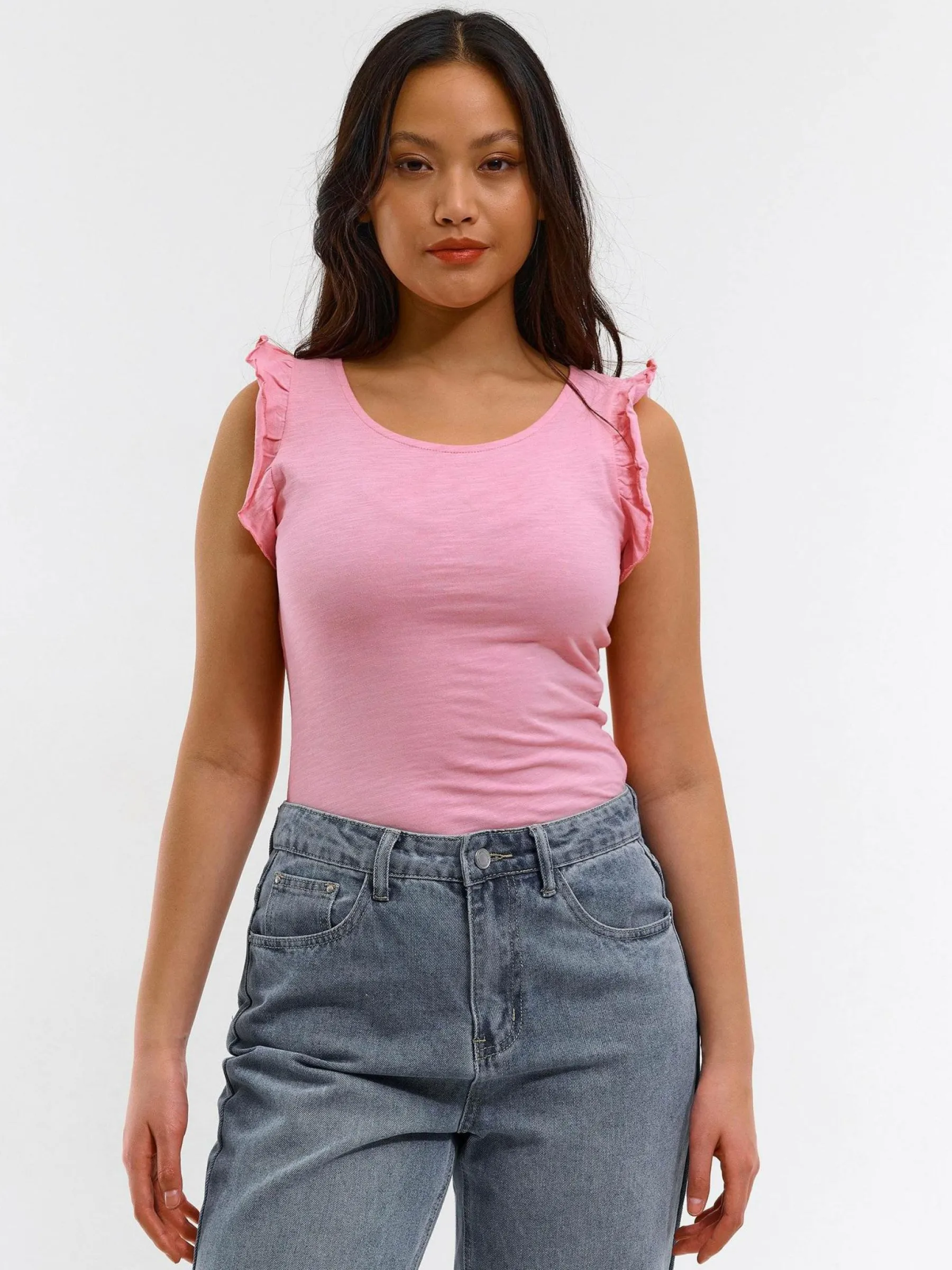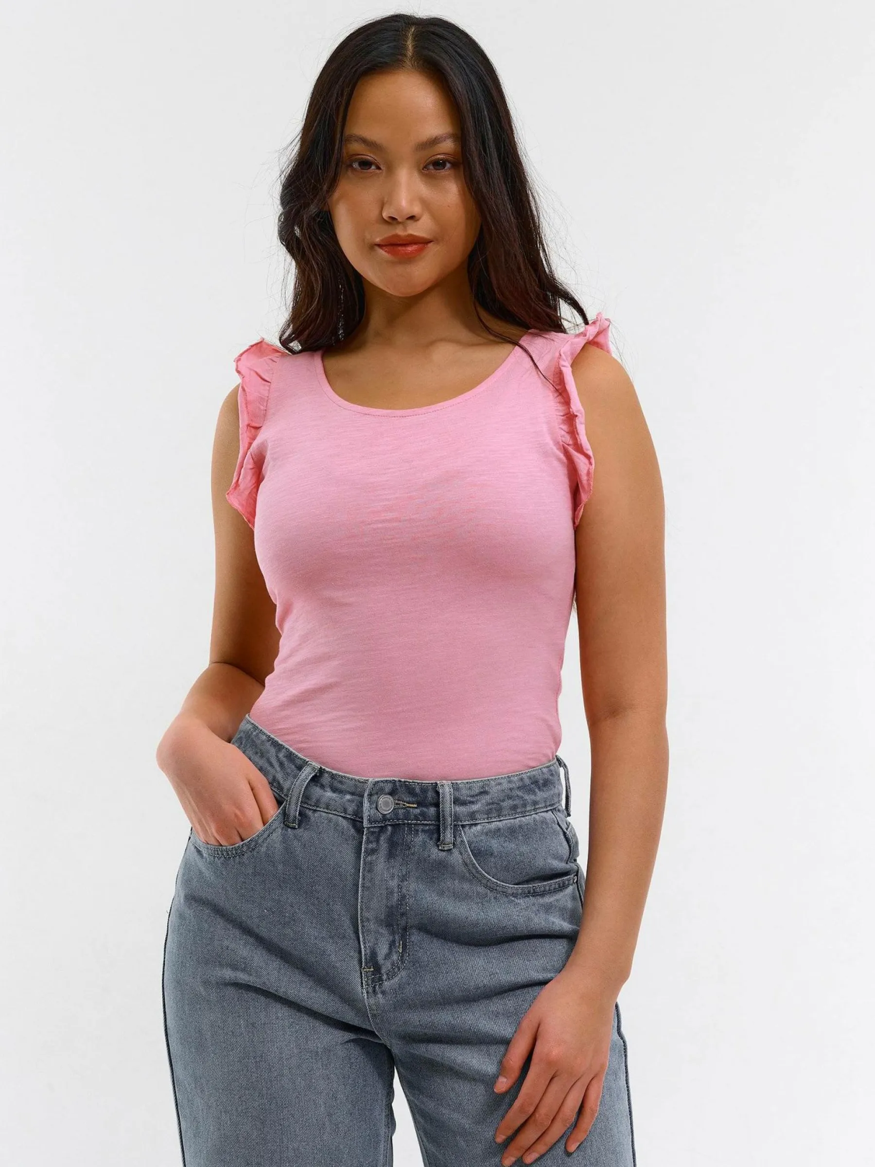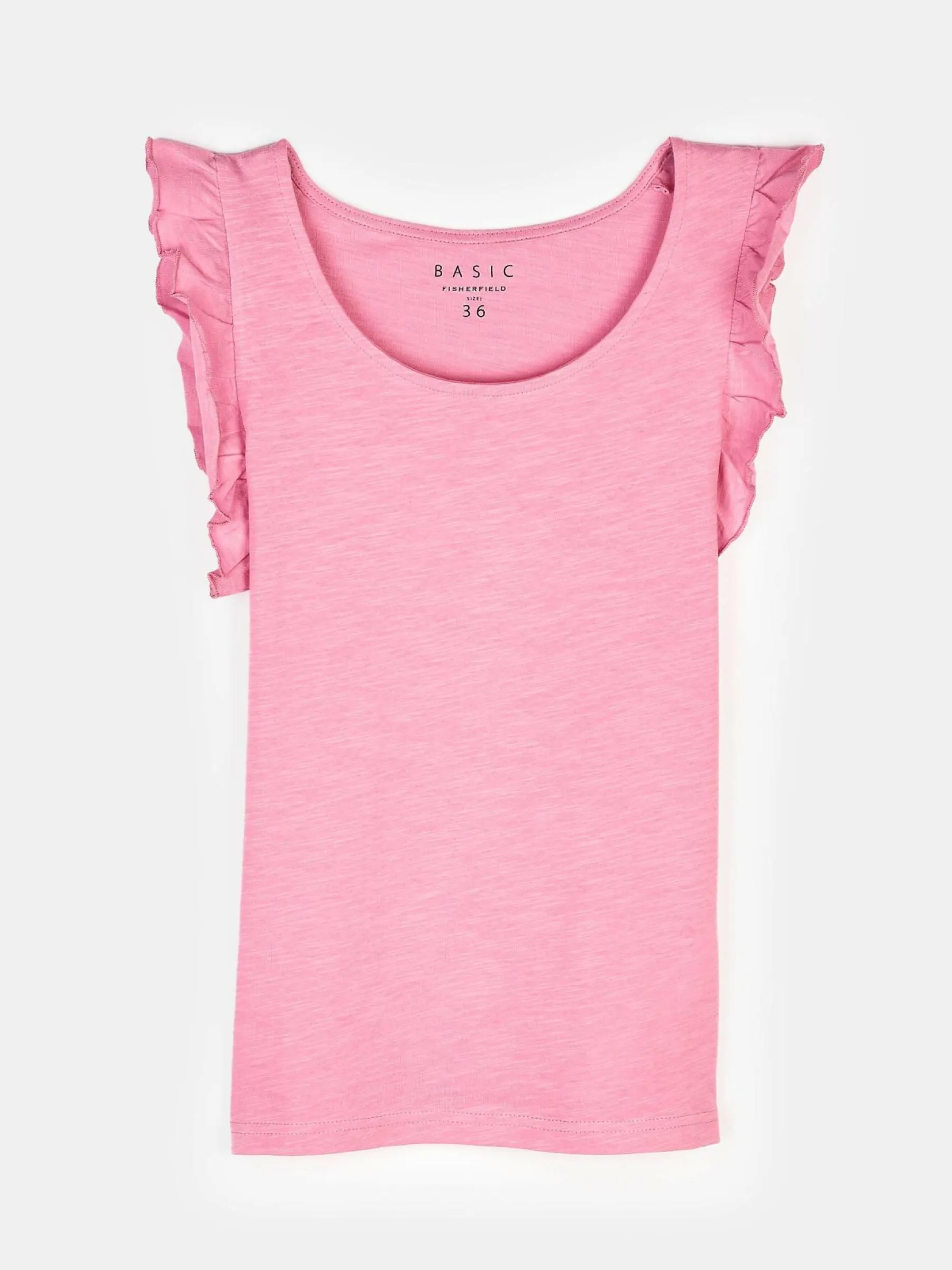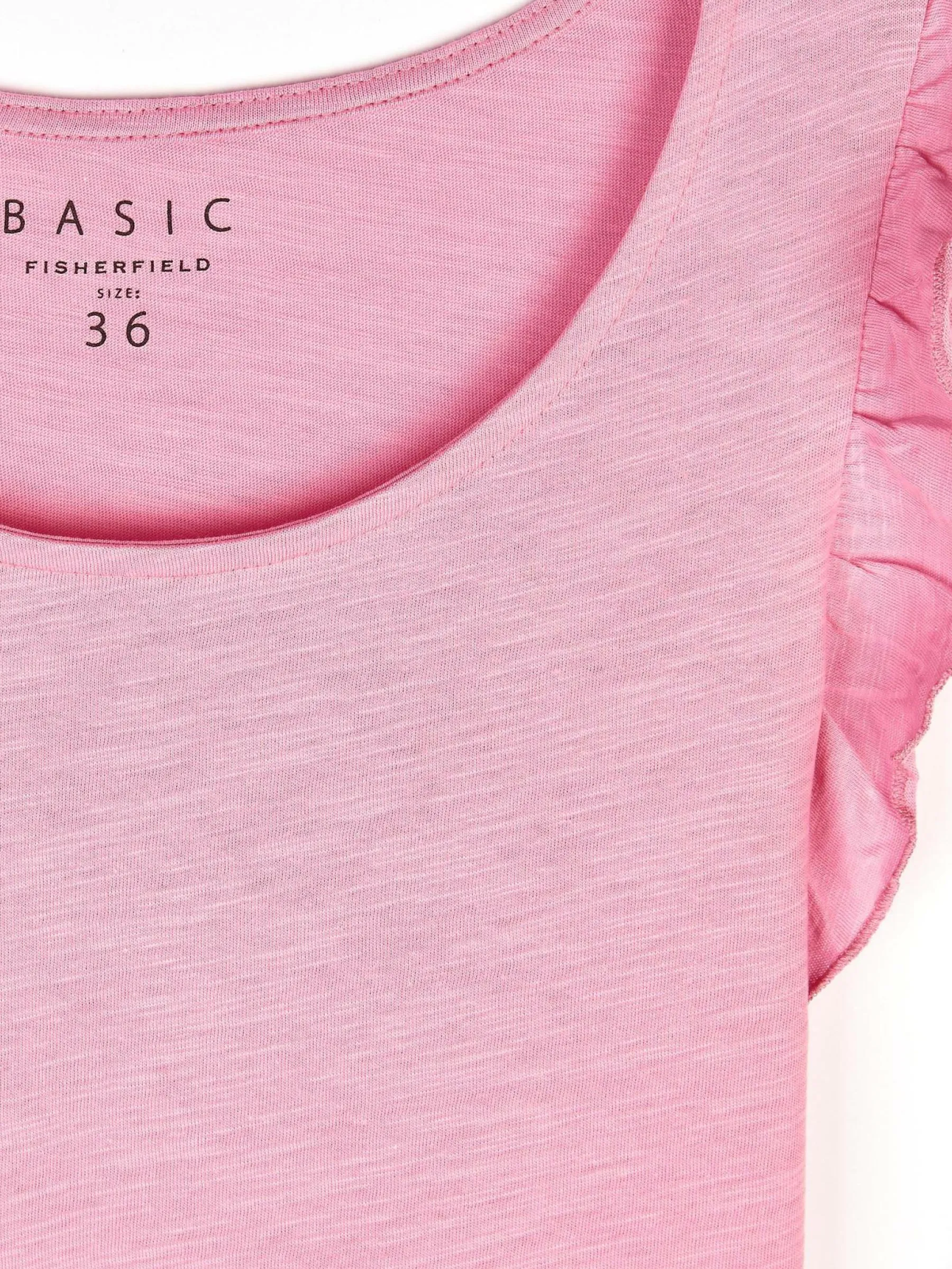 Kolor: różowyKrój: z falbanąTyp: koszulkaRekaw: krótki rękawDługość: krótkiPattern style: pojedynczy kolorDeta…