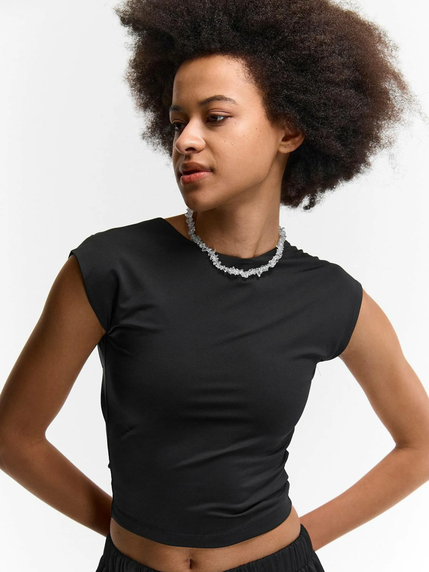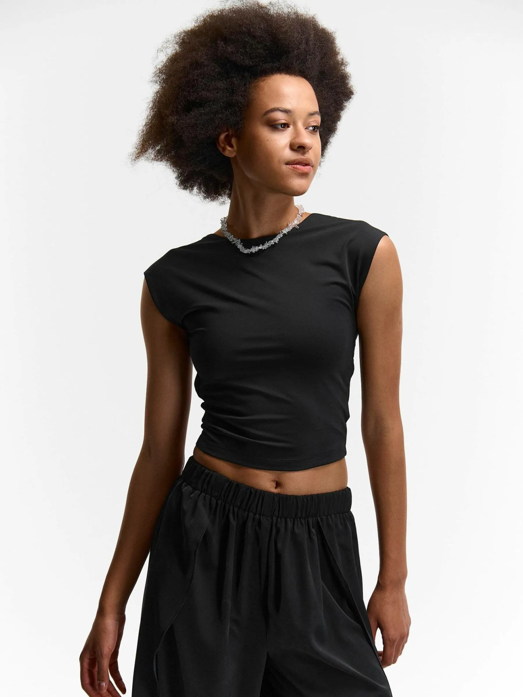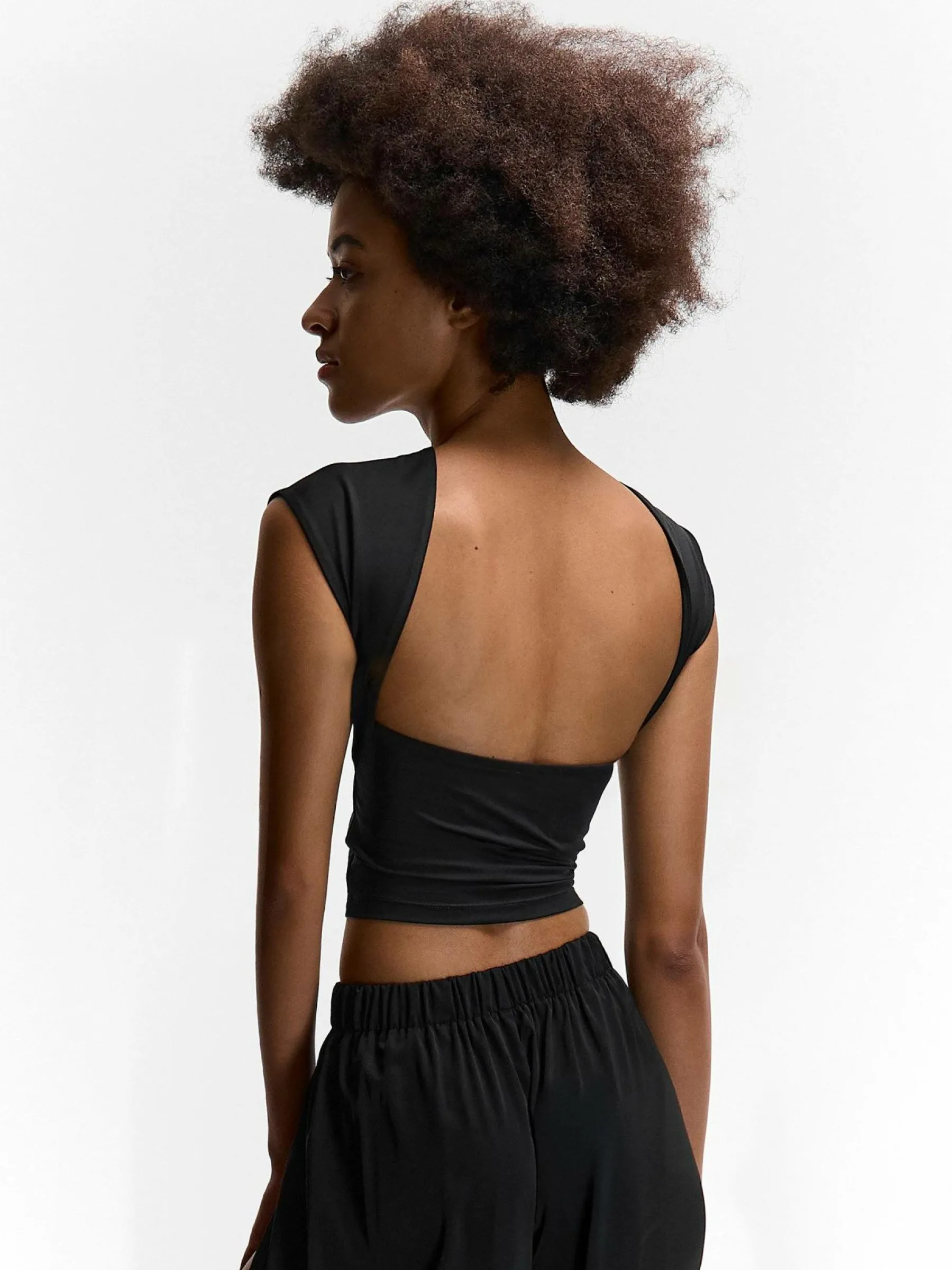 Kolor: czarnyKrój: regularTyp: topRekaw: bez rękawówDługość: krótki topPattern style: pojedynczy kolorDetal: nad …
