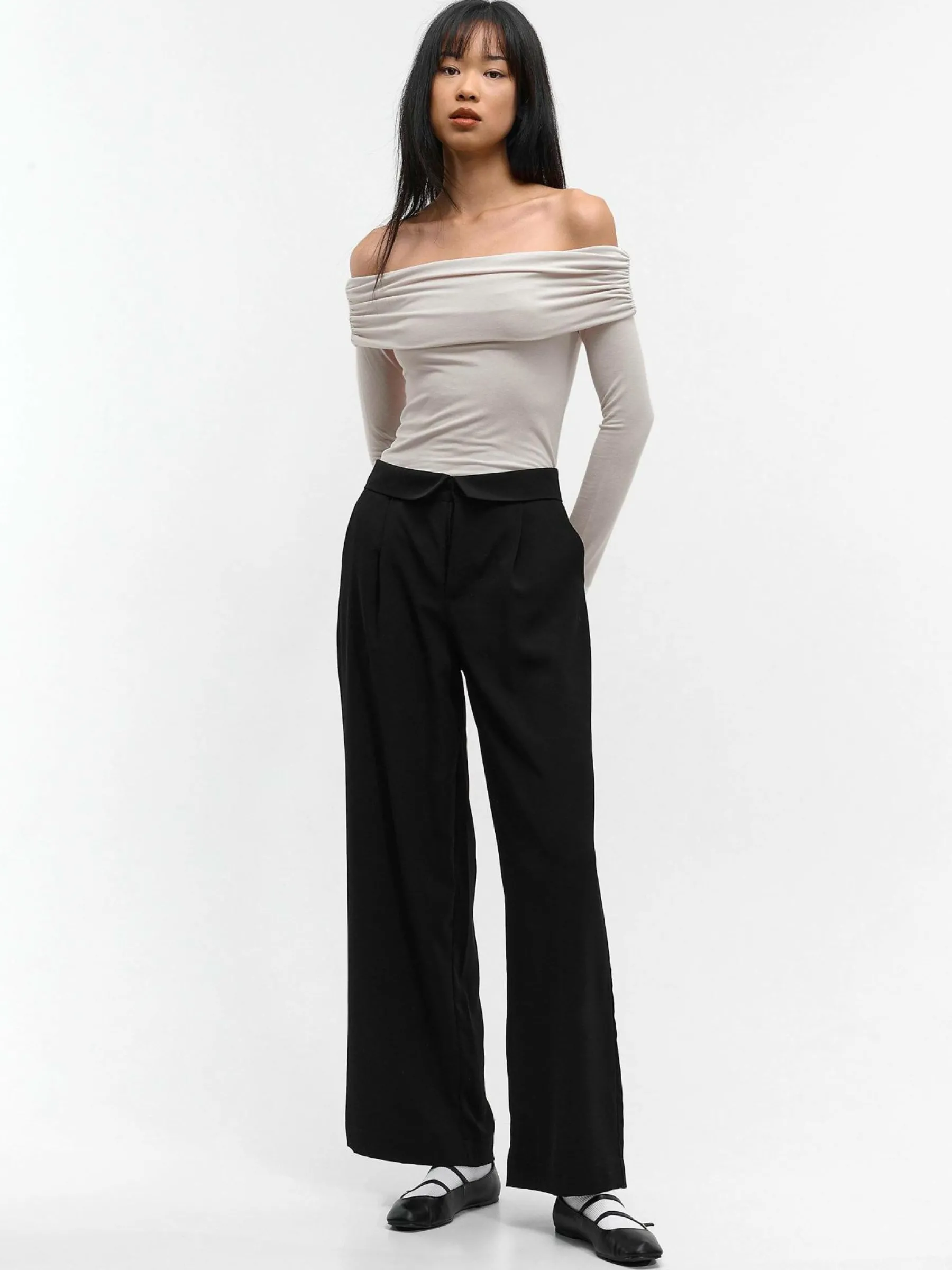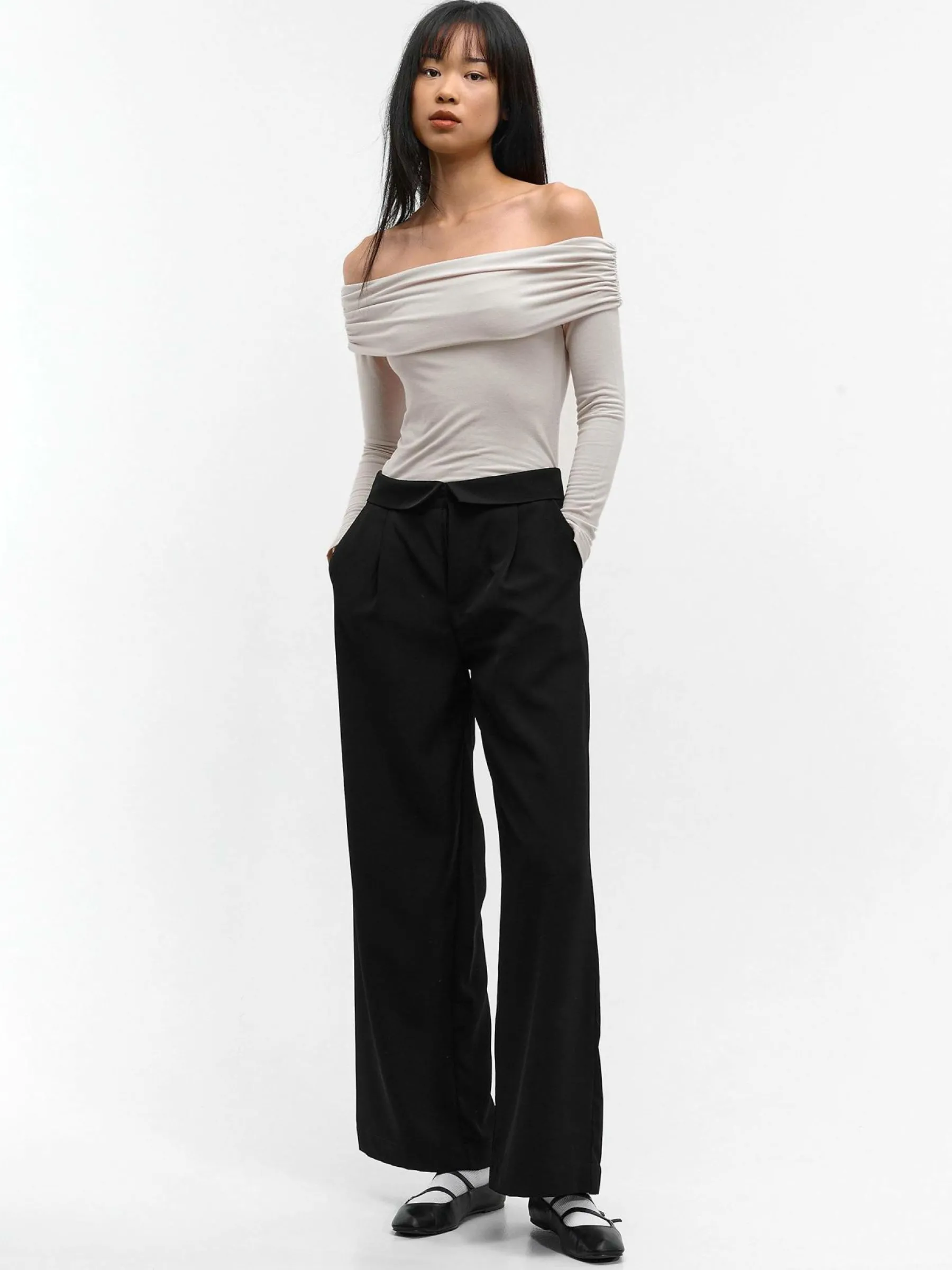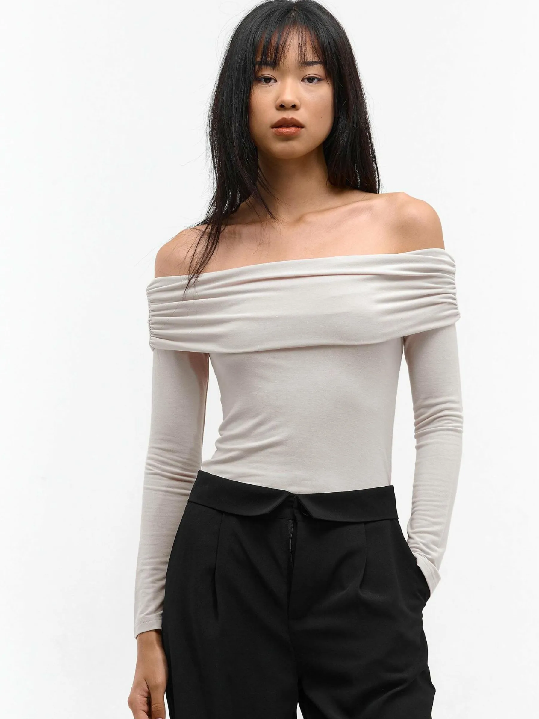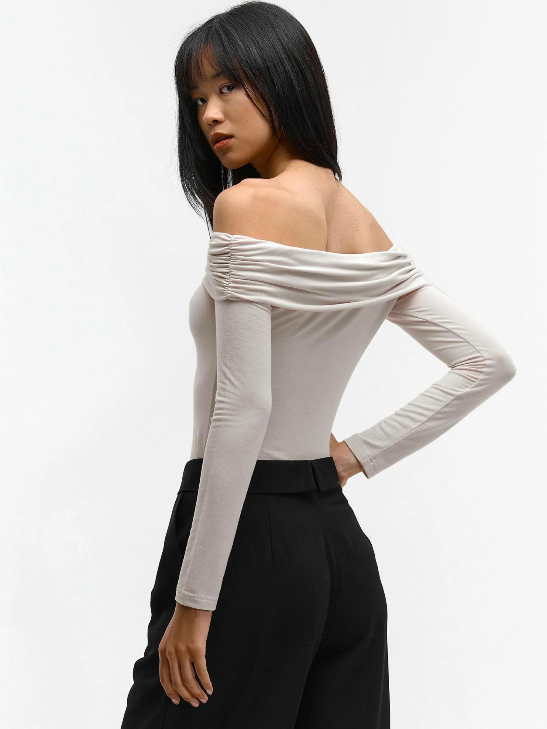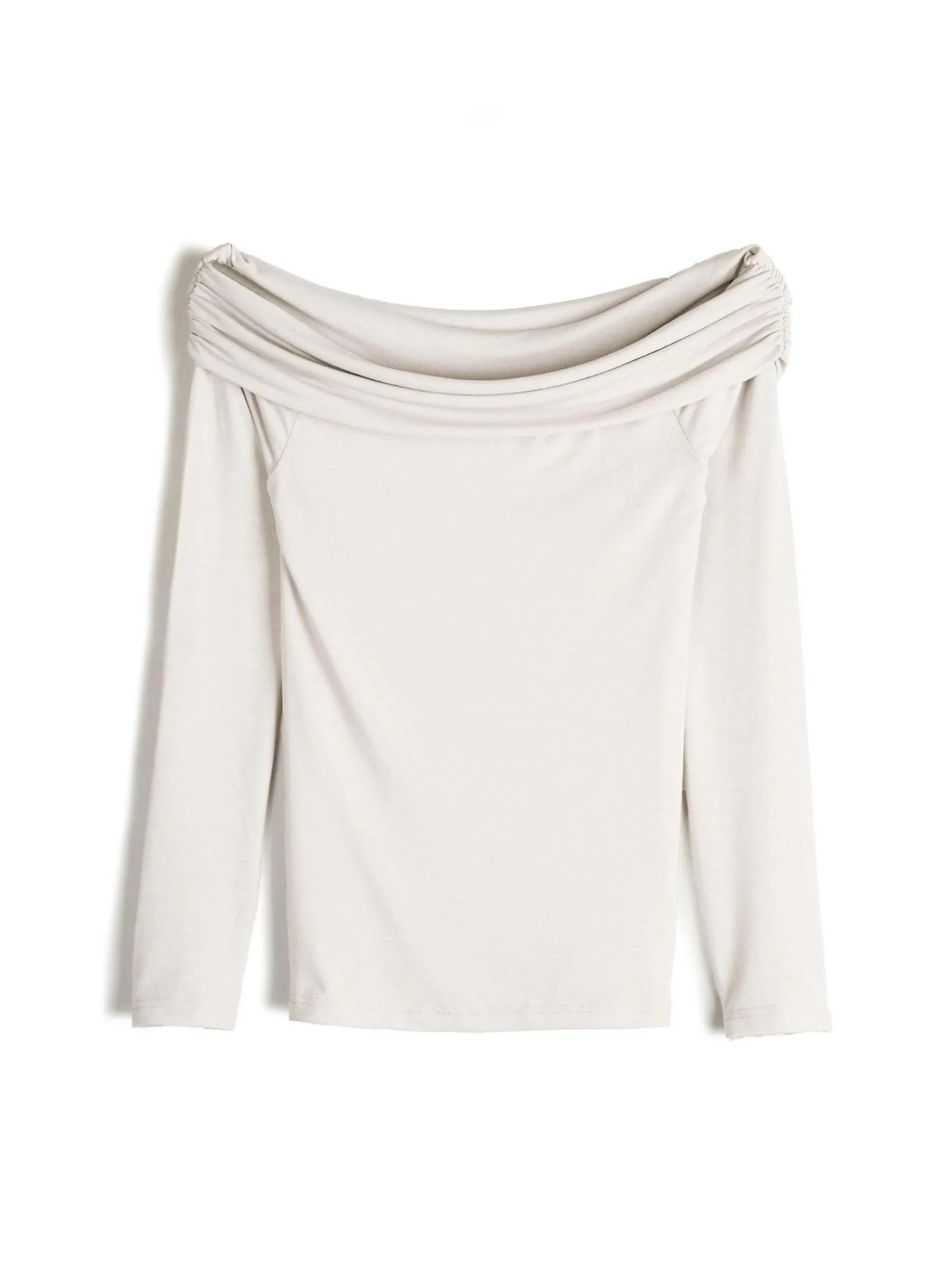 Kolor: białyKrój: z marszczeniem, z odkrytymi ramionamiTyp: topRekaw: długi rękawDługość: krótkiPattern style: p…