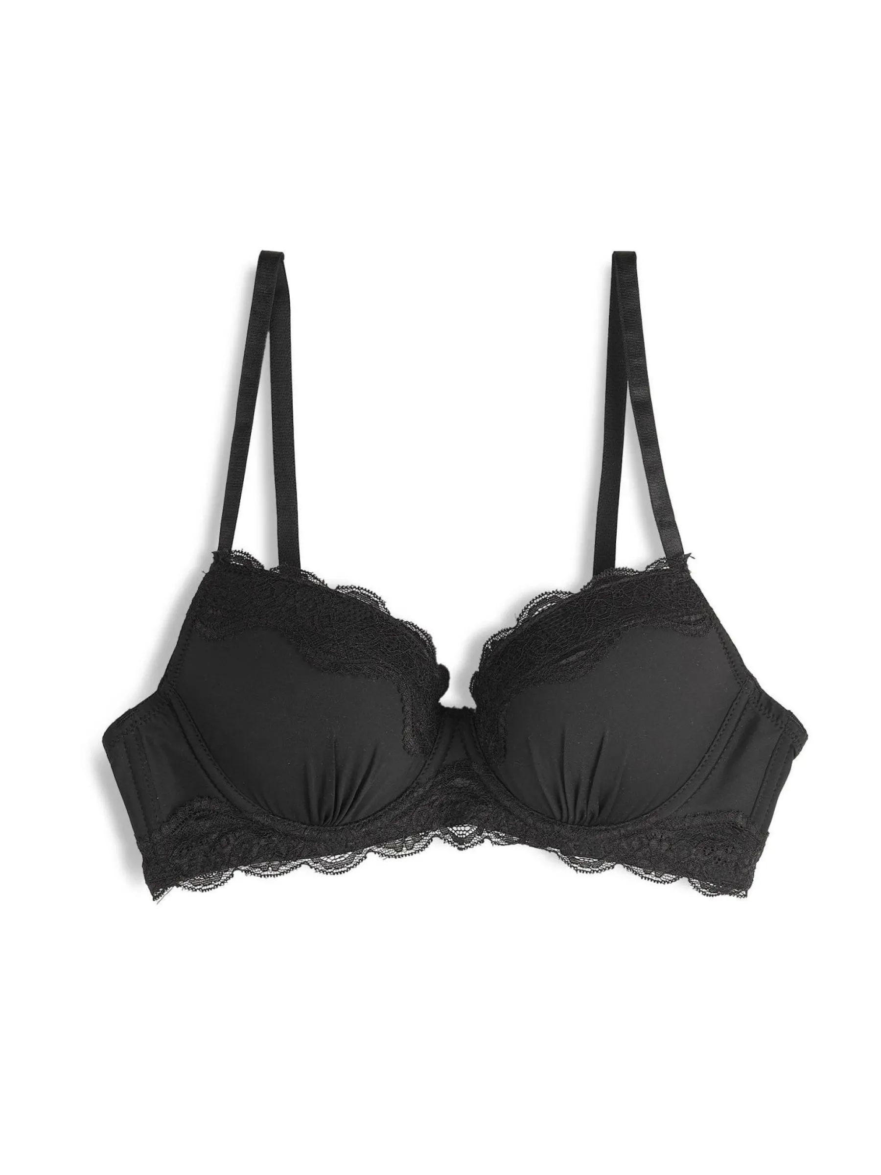 Kolor: czarnyKrój: plungeTyp: biustonoszPattern style: pojedynczy kolorDetal: z koronką, wzmocniony, z kośćmiMateria…