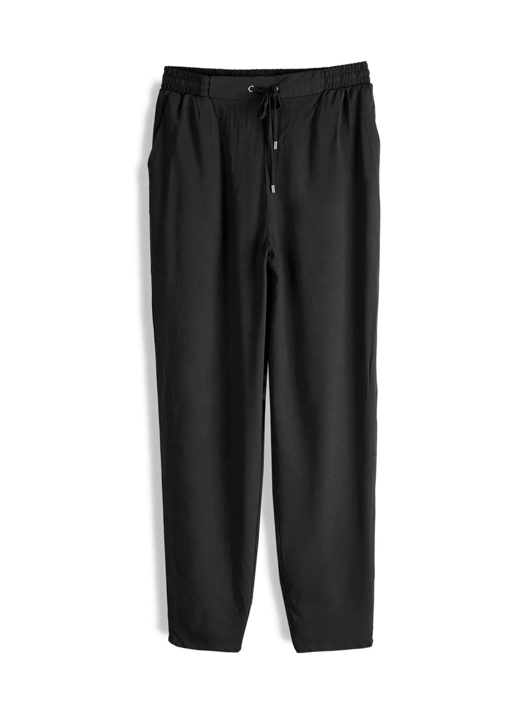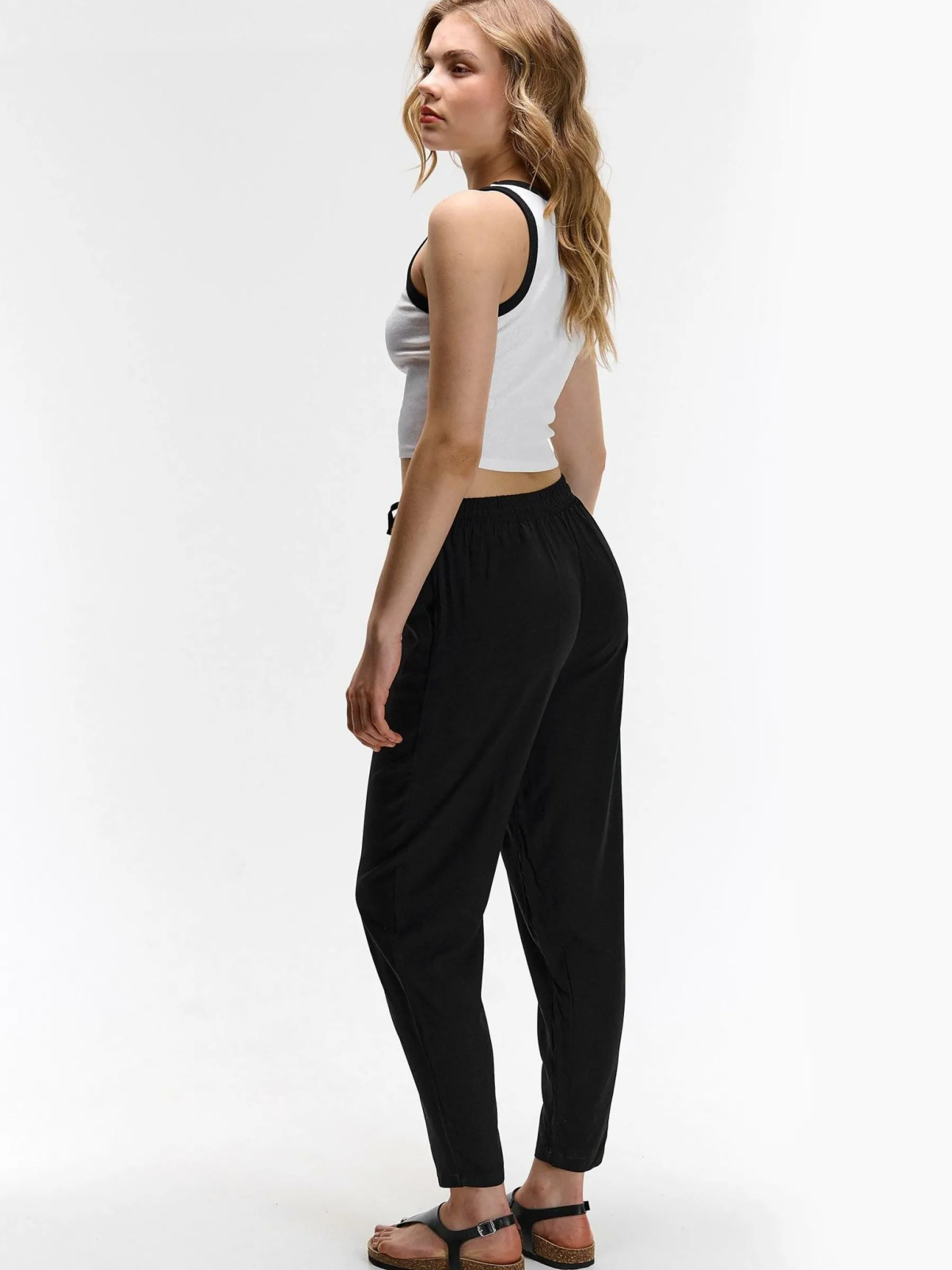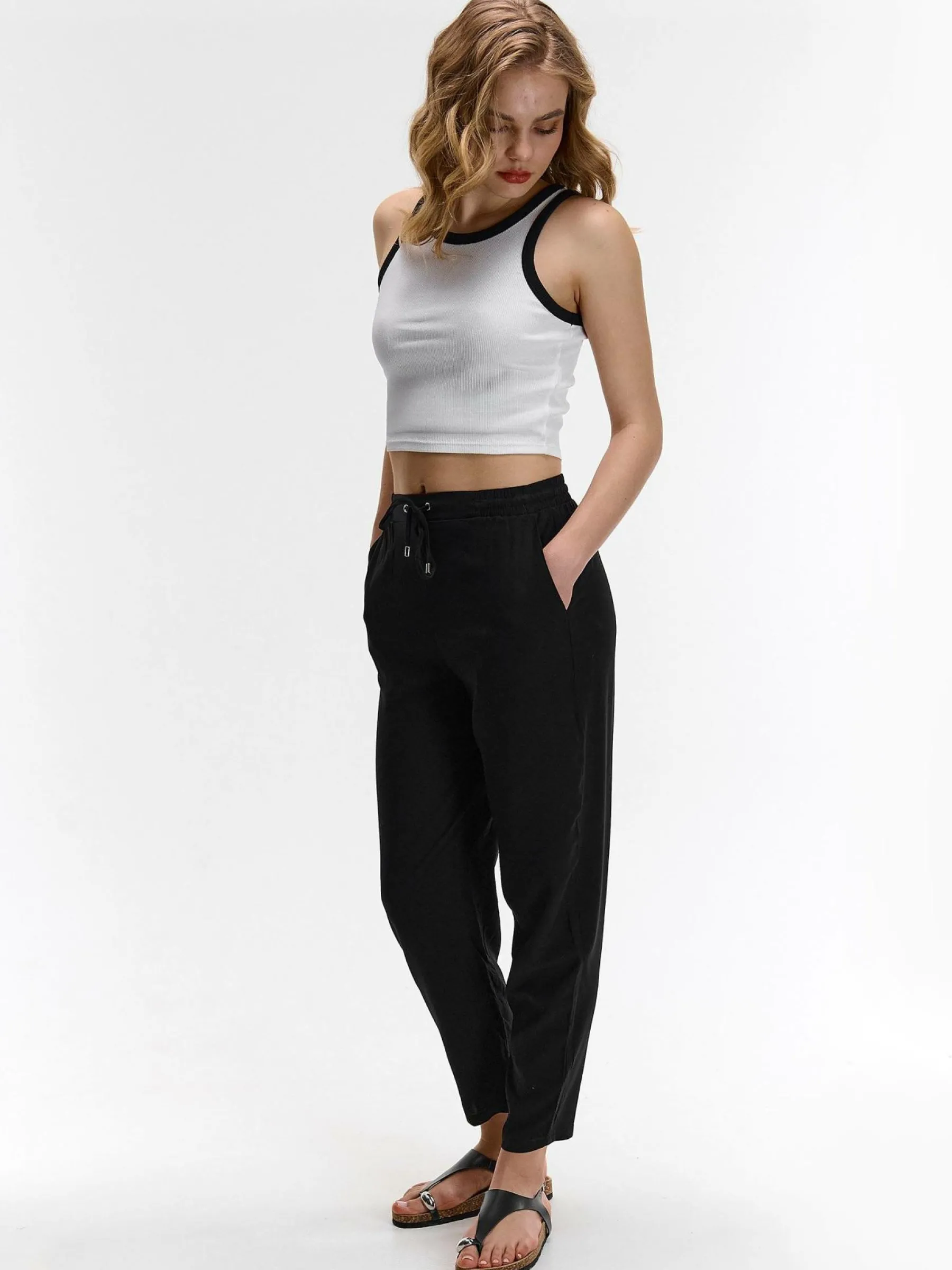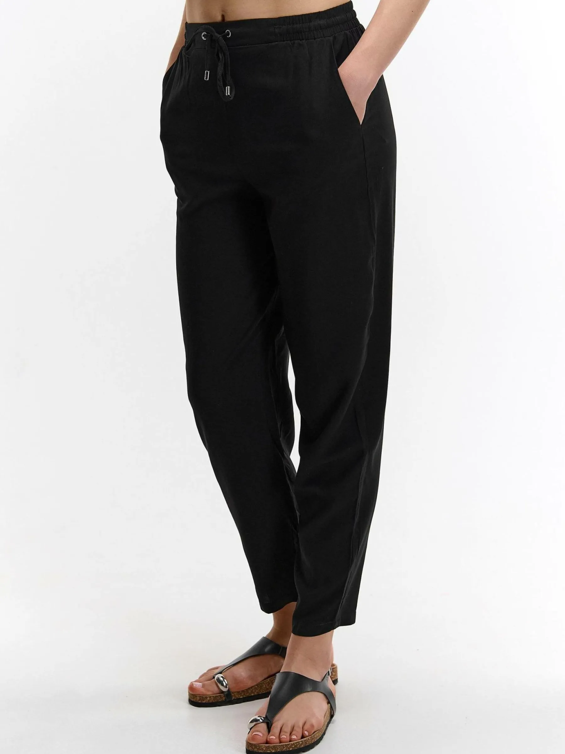 Kolor: czarnyKrój: slimTyp: spodnieDługość: dlugiePattern style: pojedynczy kolorDetal: ze sznurowaniemMateriał: wi…