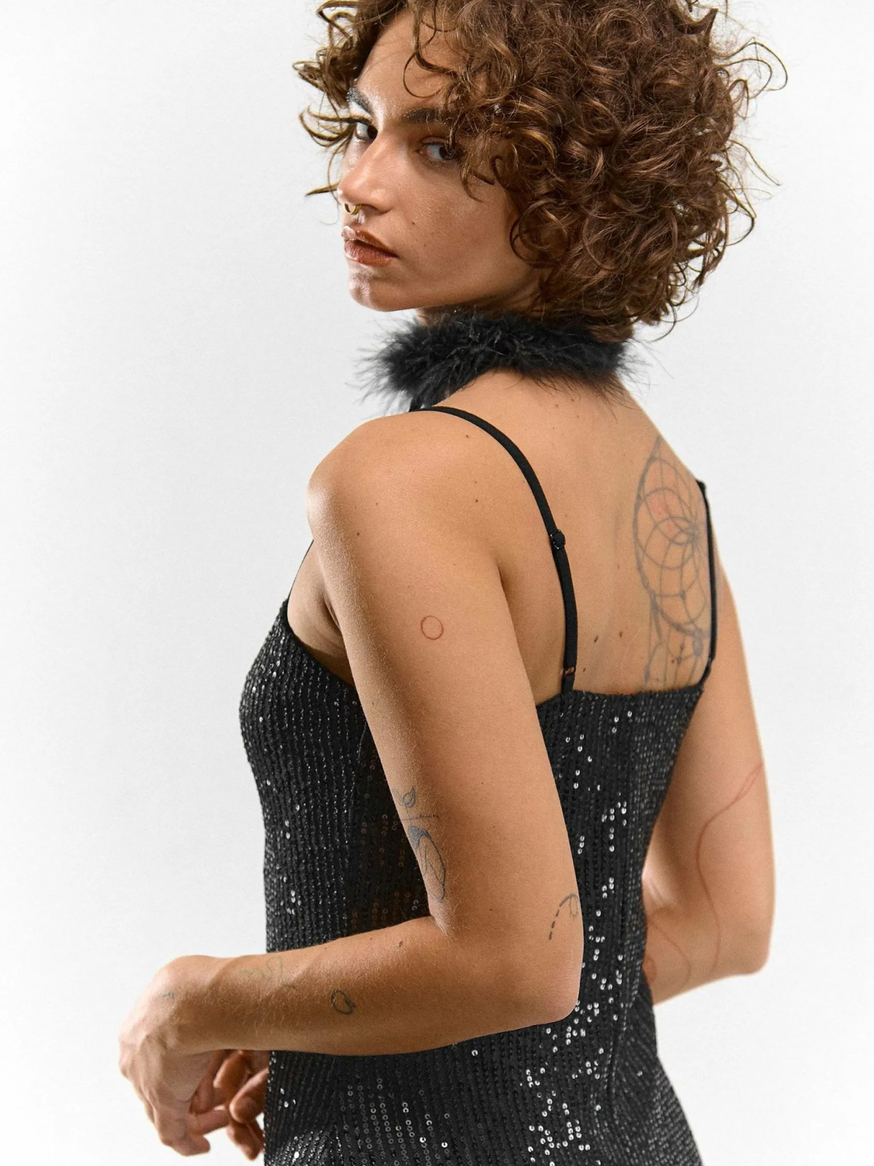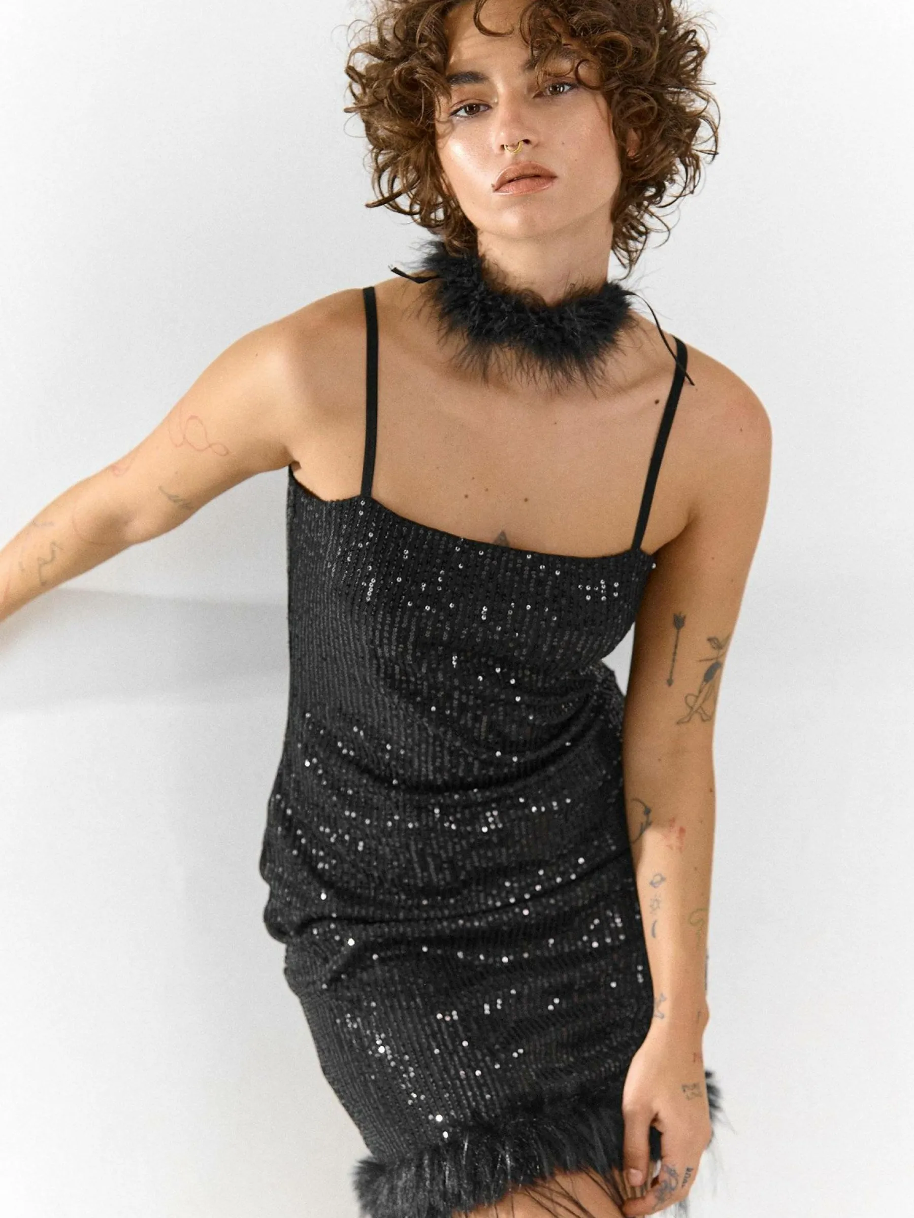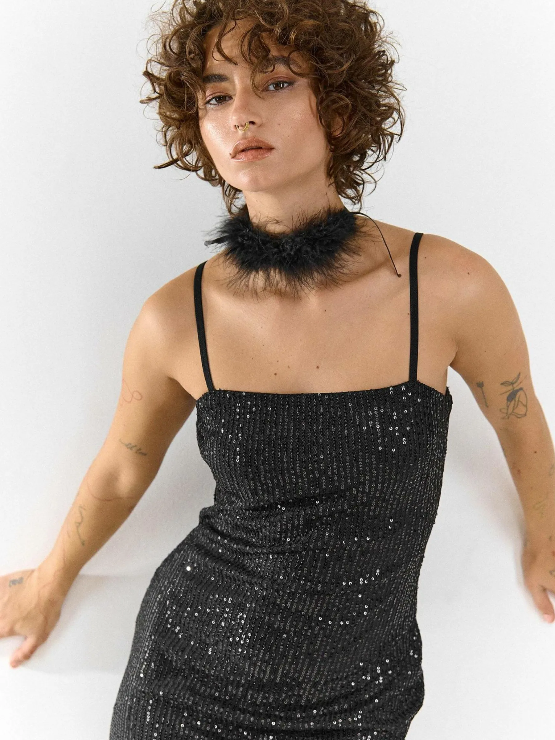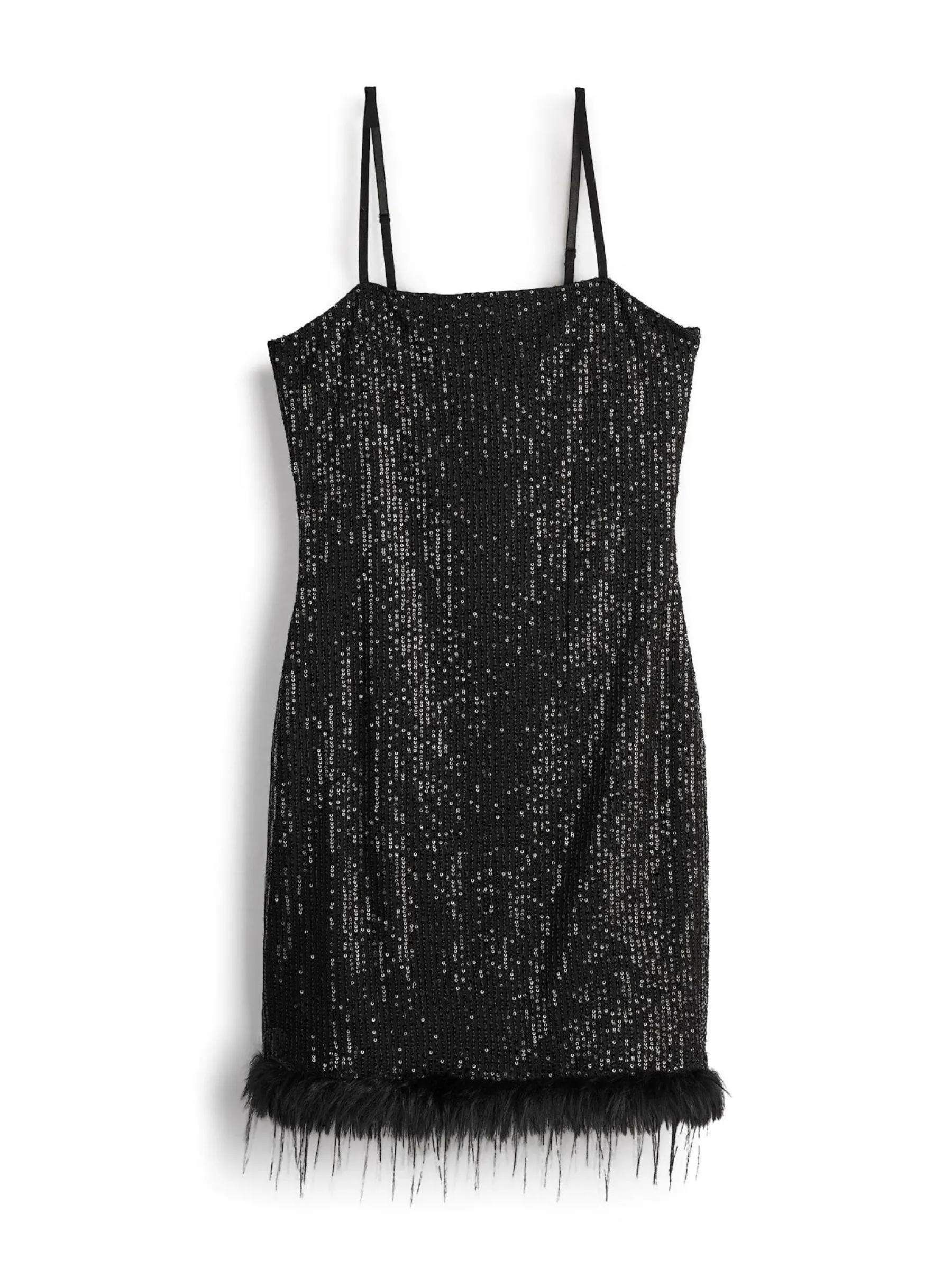 Kolor: czarnyKrój: ołówkoweTyp: sukienkaRekaw: bez rękawówDługość: miniPattern style: z cekinami, pojedynczy kol…