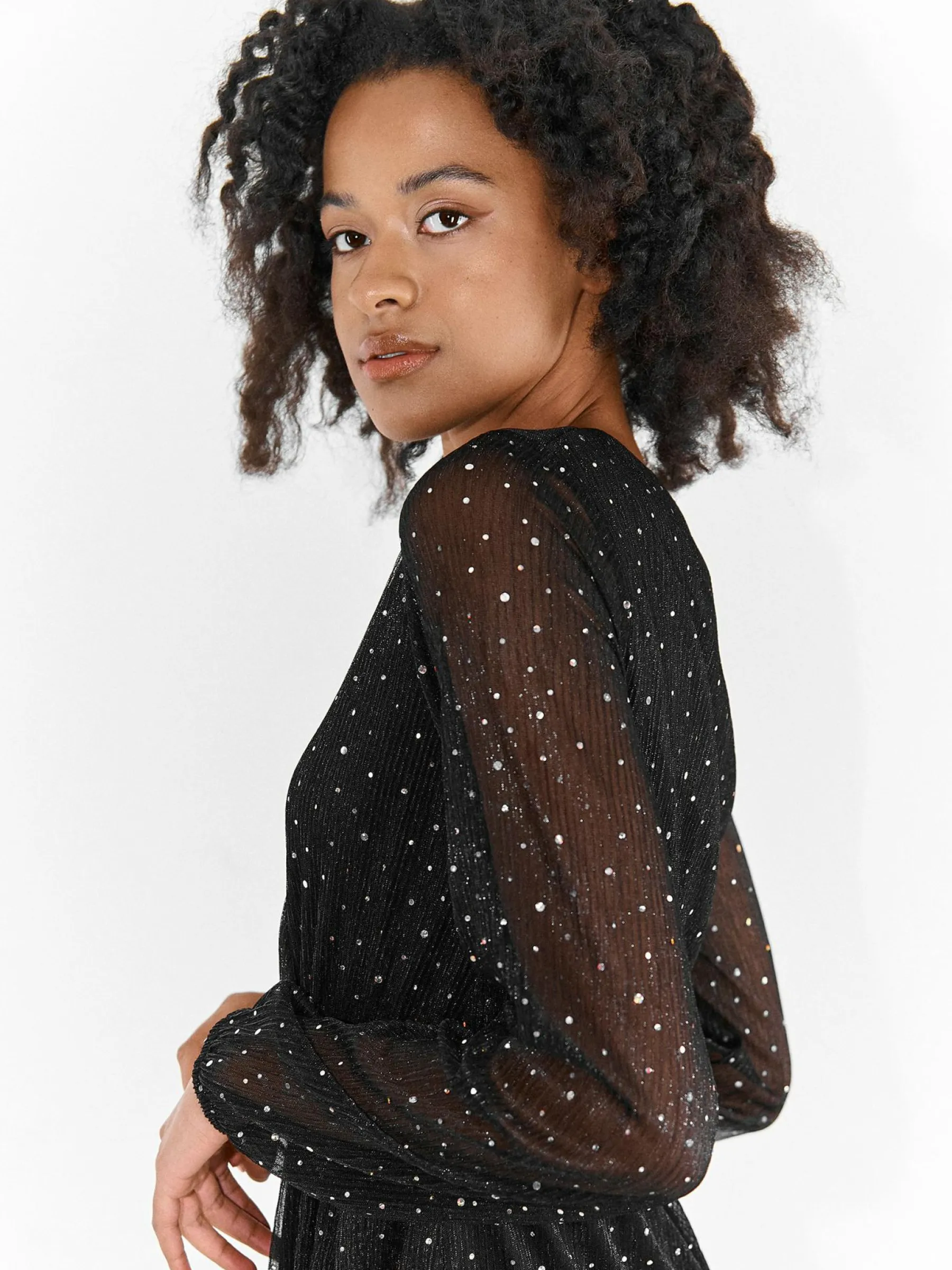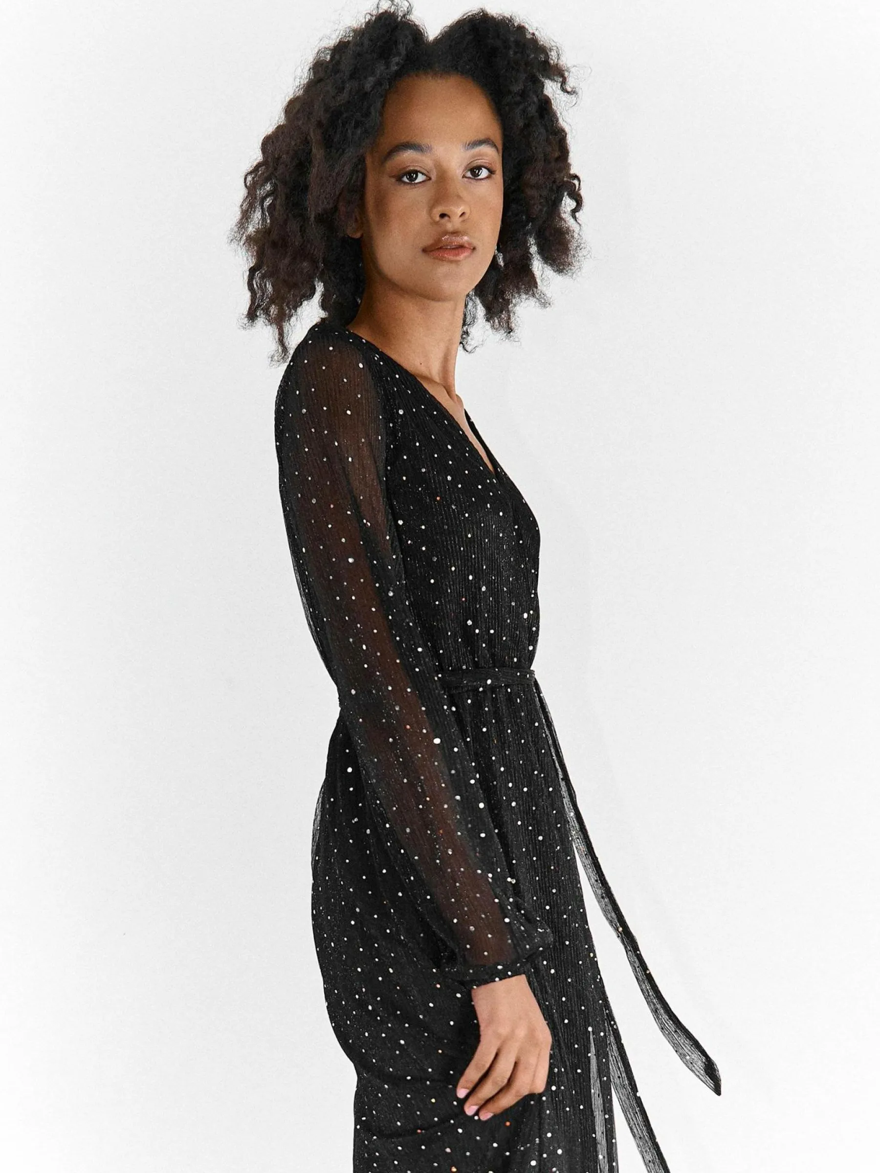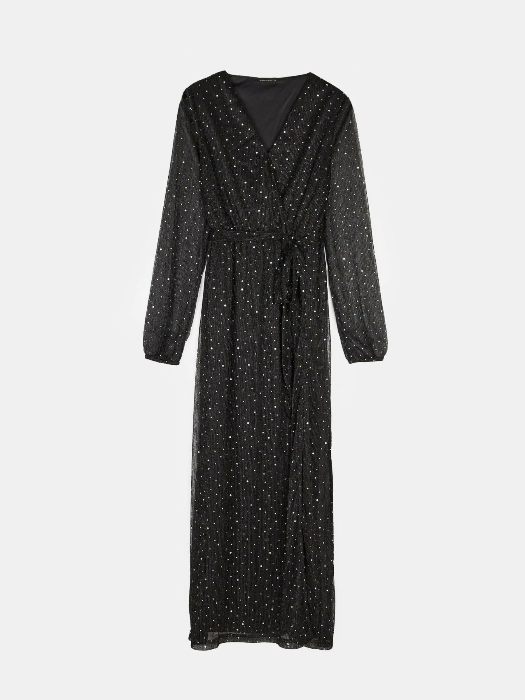 Kolor: czarnyKrój: kopertówkiTyp: sukienkaRekaw: długi rękawDługość: midiPattern style: pojedynczy kolorDetal: z …
