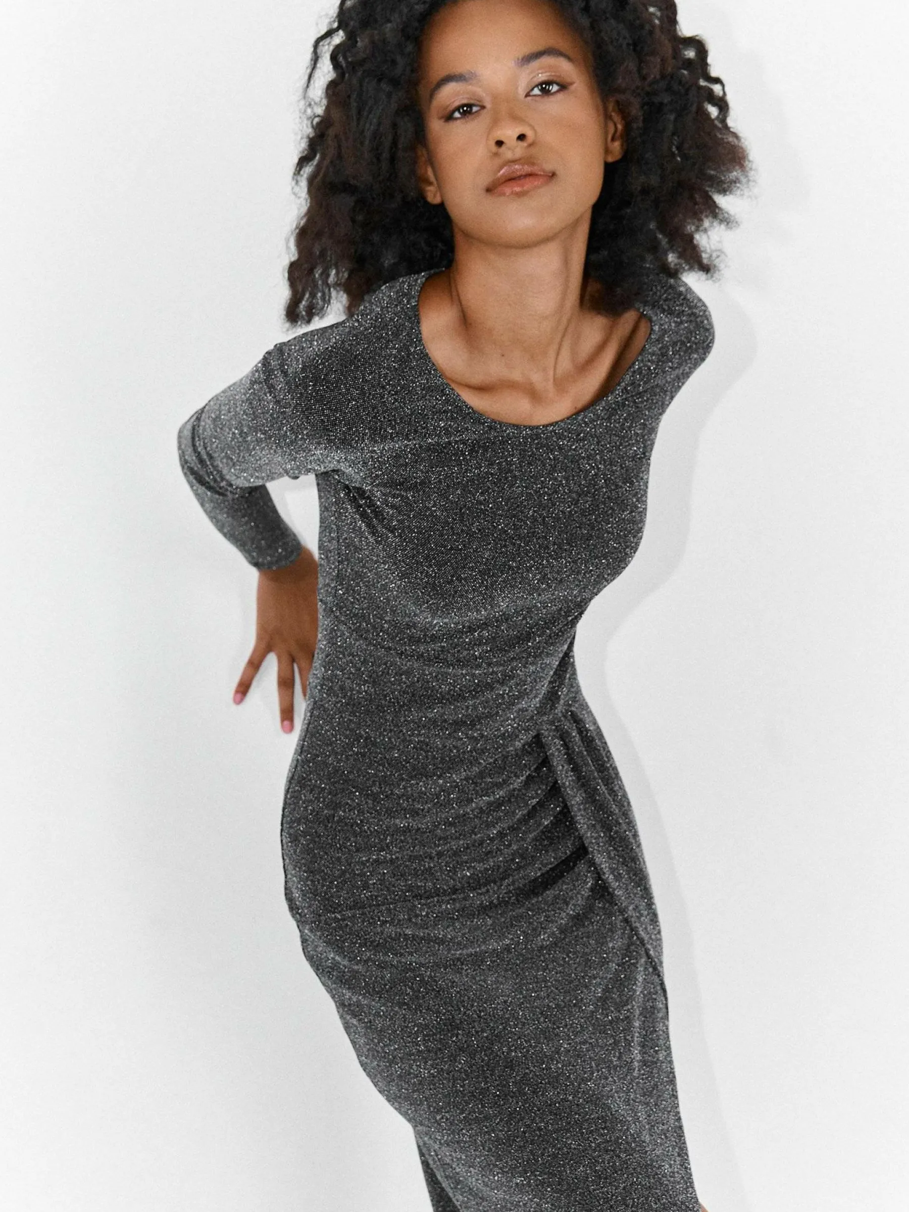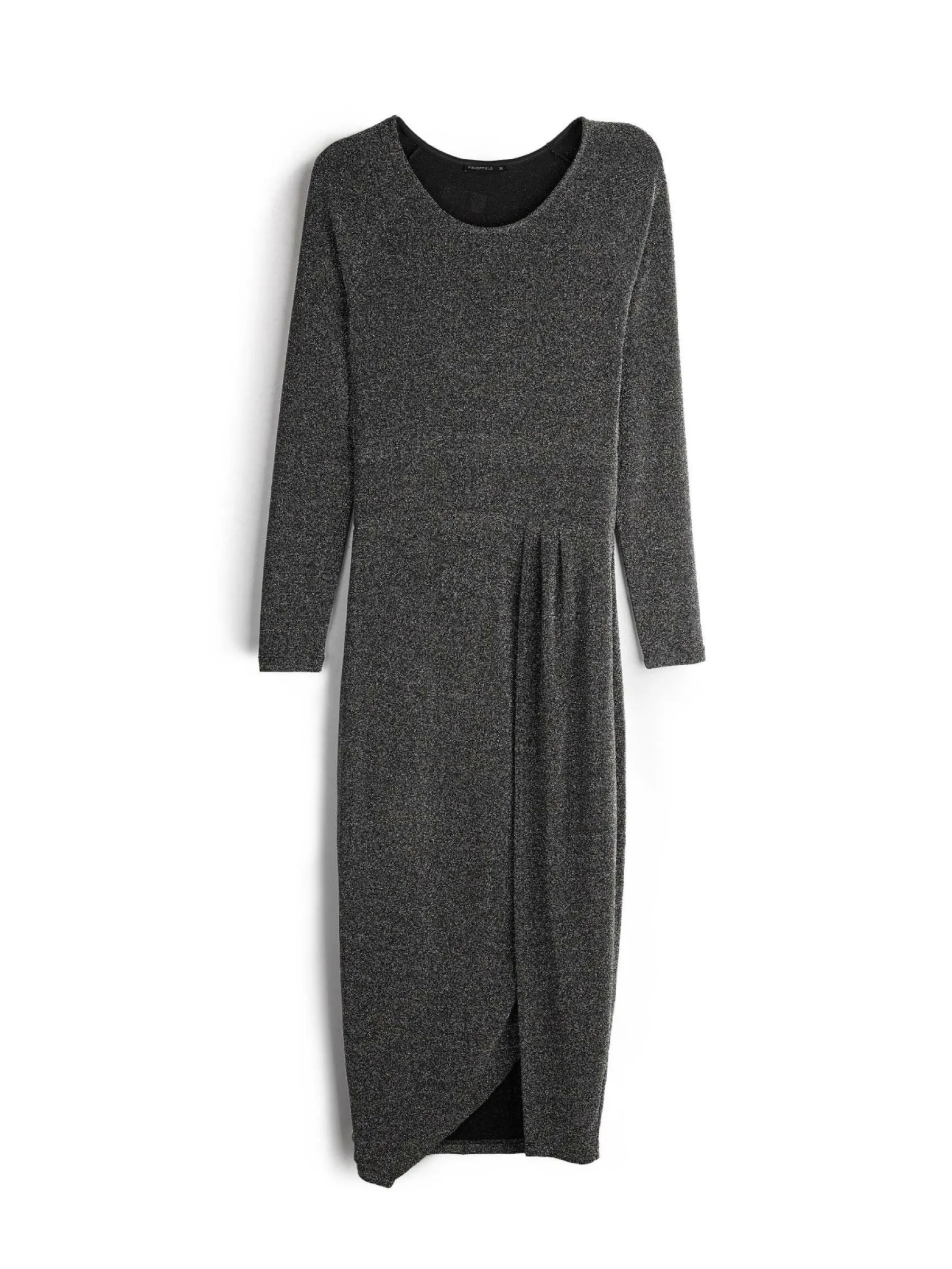 Kolor: metalicznyKrój: asymetryczneTyp: sukienkaRekaw: długi rękawDługość: midiPattern style: z włóknem metalicz…