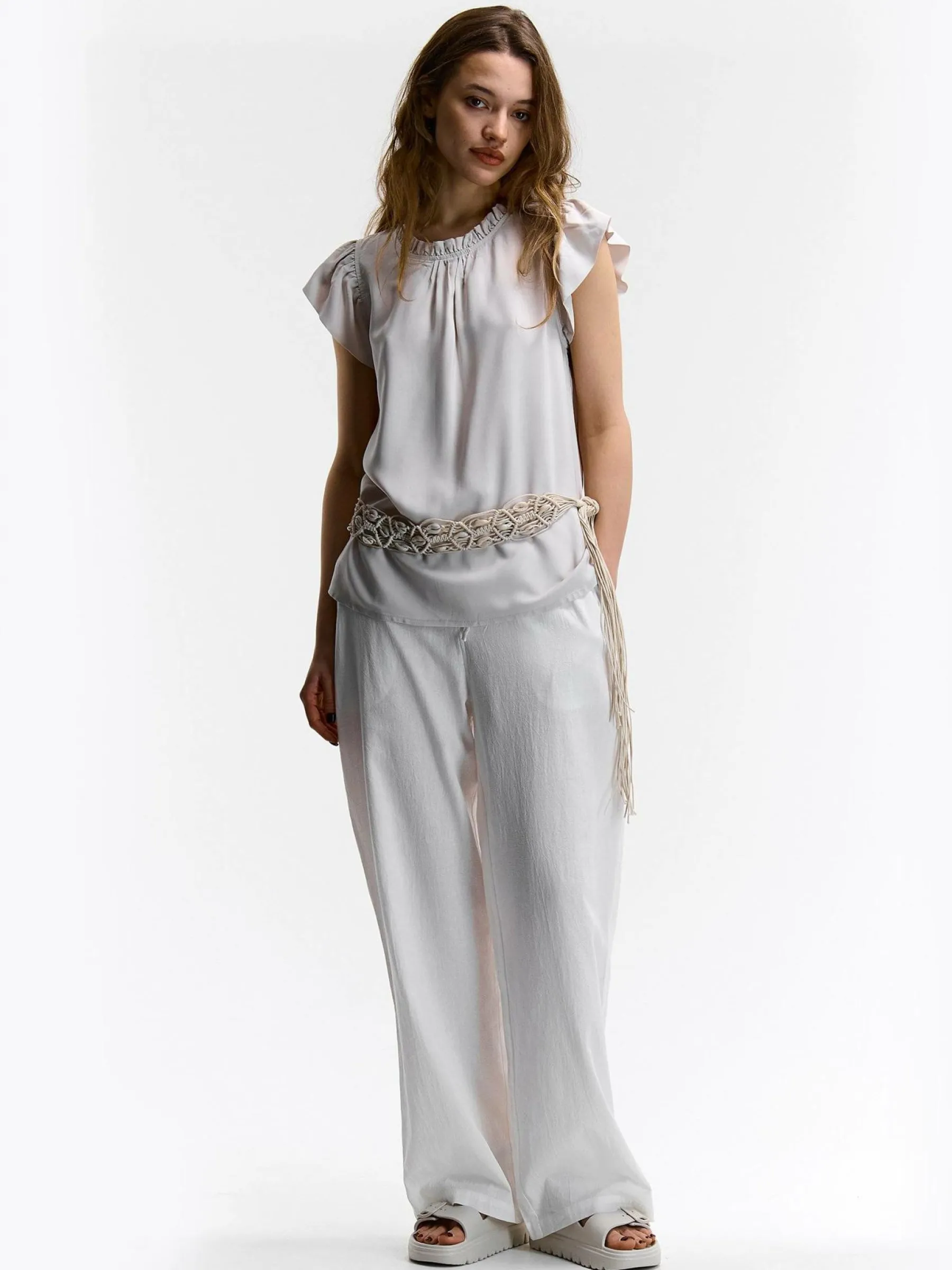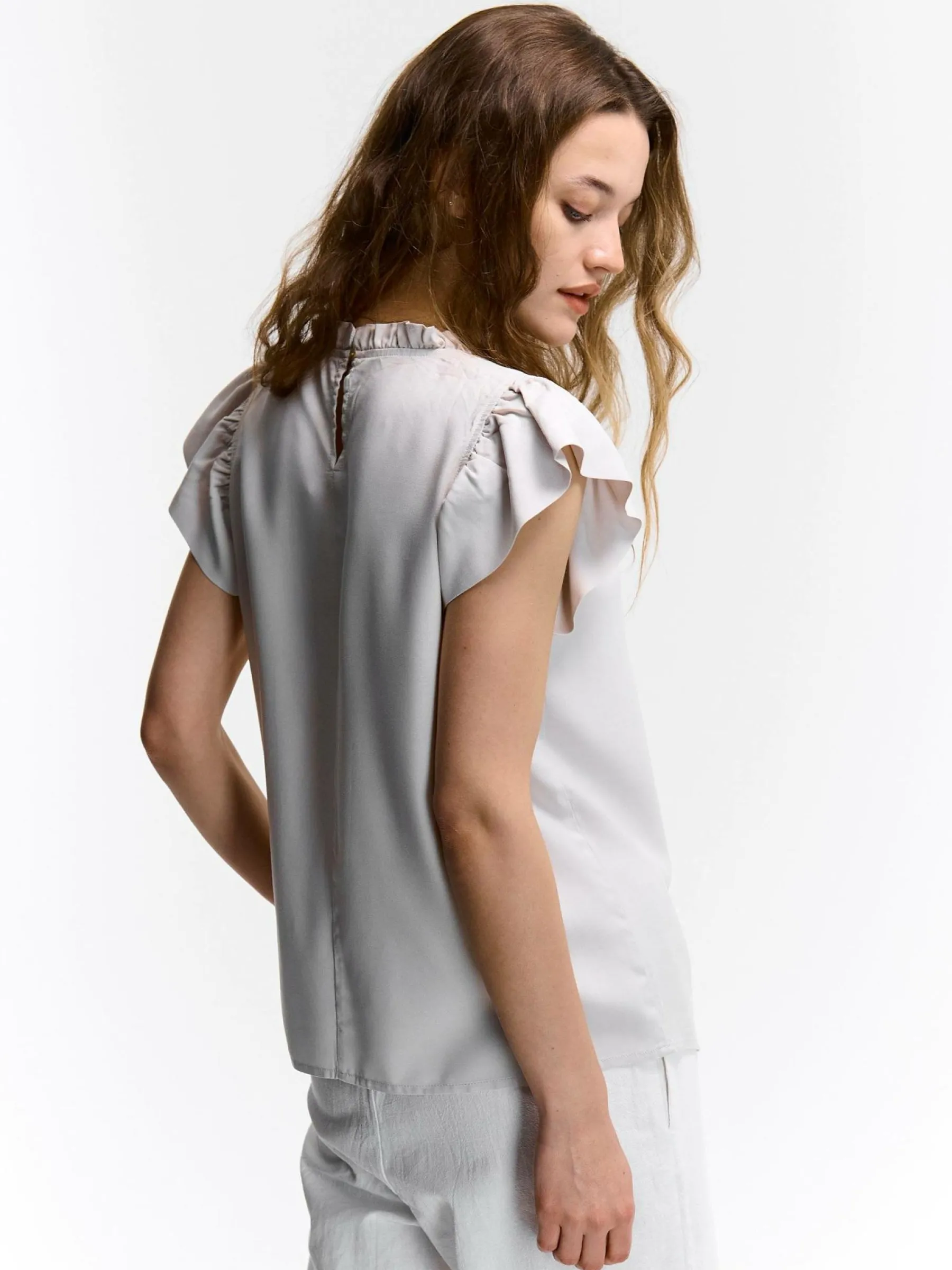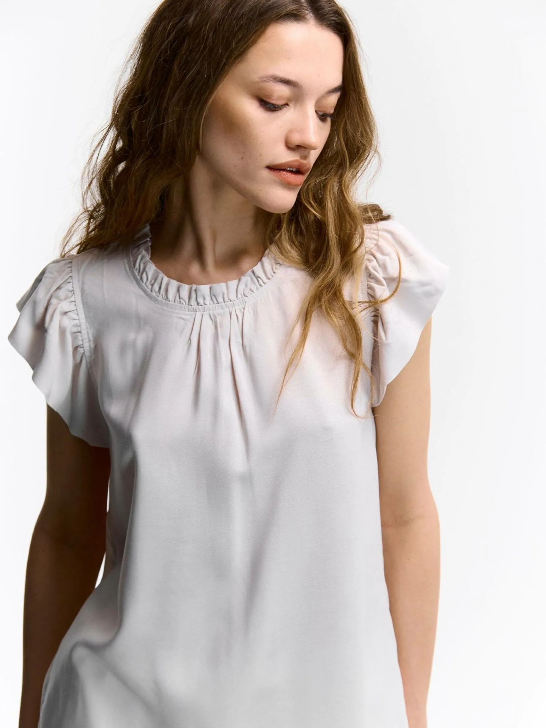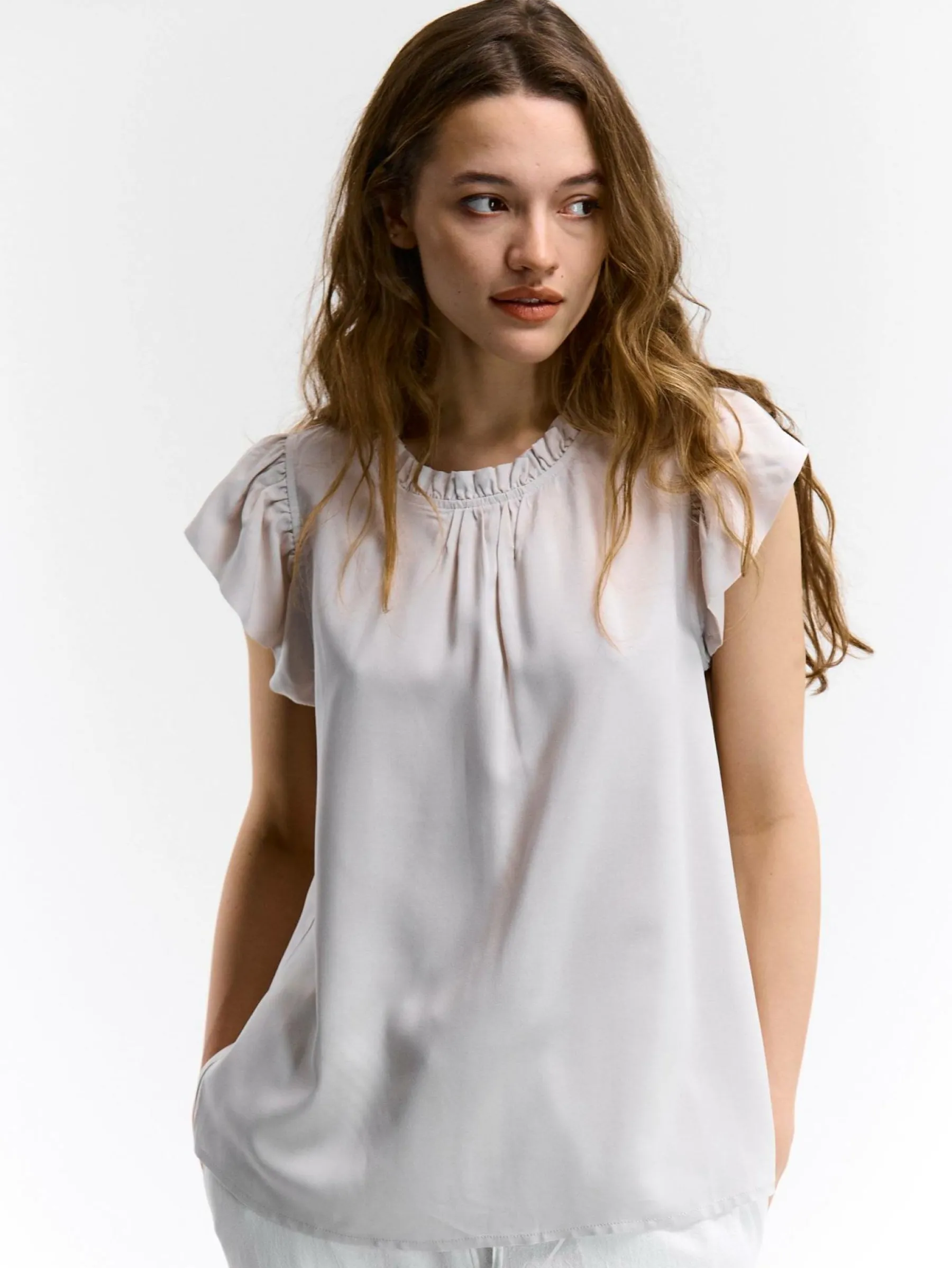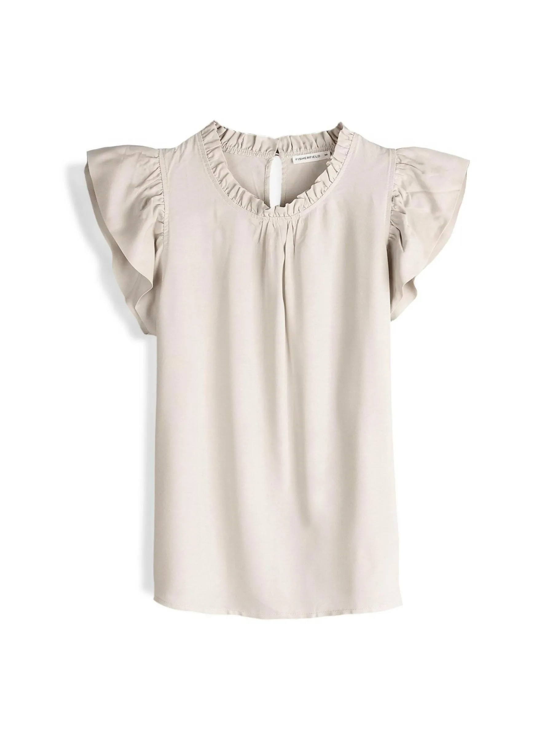 Kolor: beżowyKrój: z falbanąTyp: top, bluzkaRekaw: krótki rękawDługość: krótkiPattern style: pojedynczy kolorDe…
