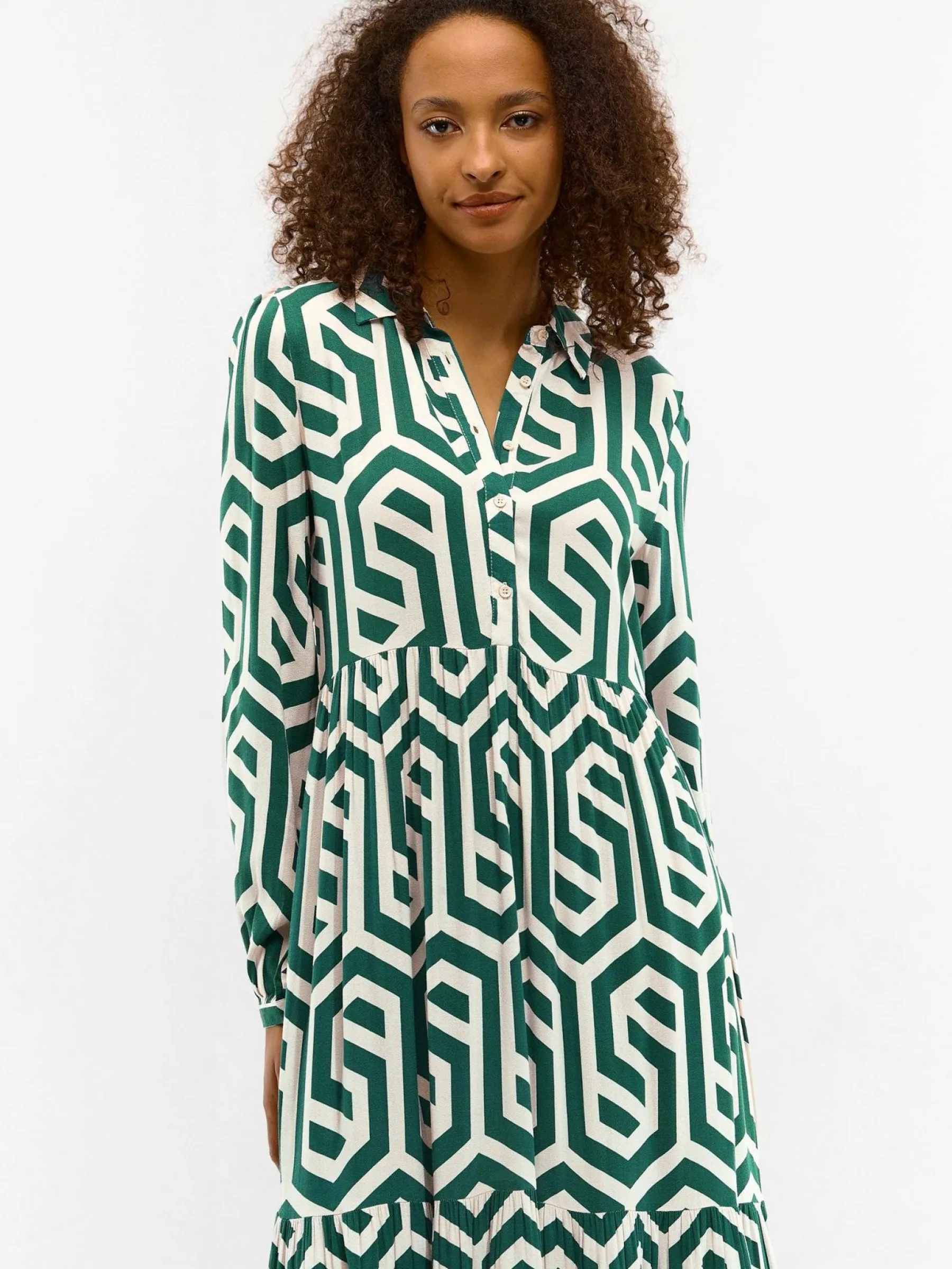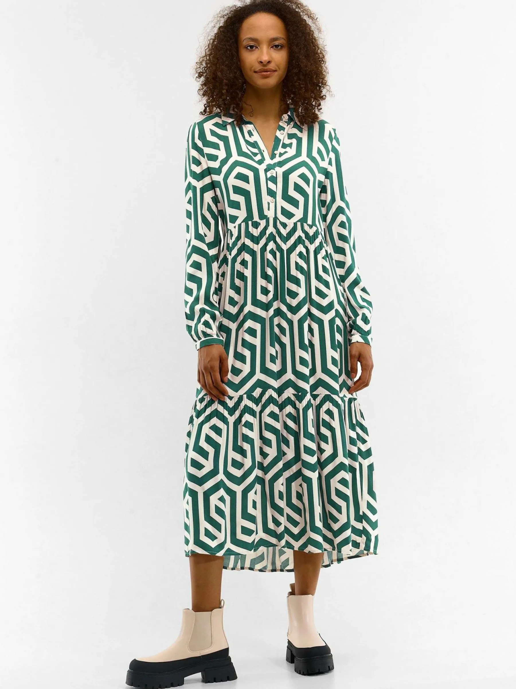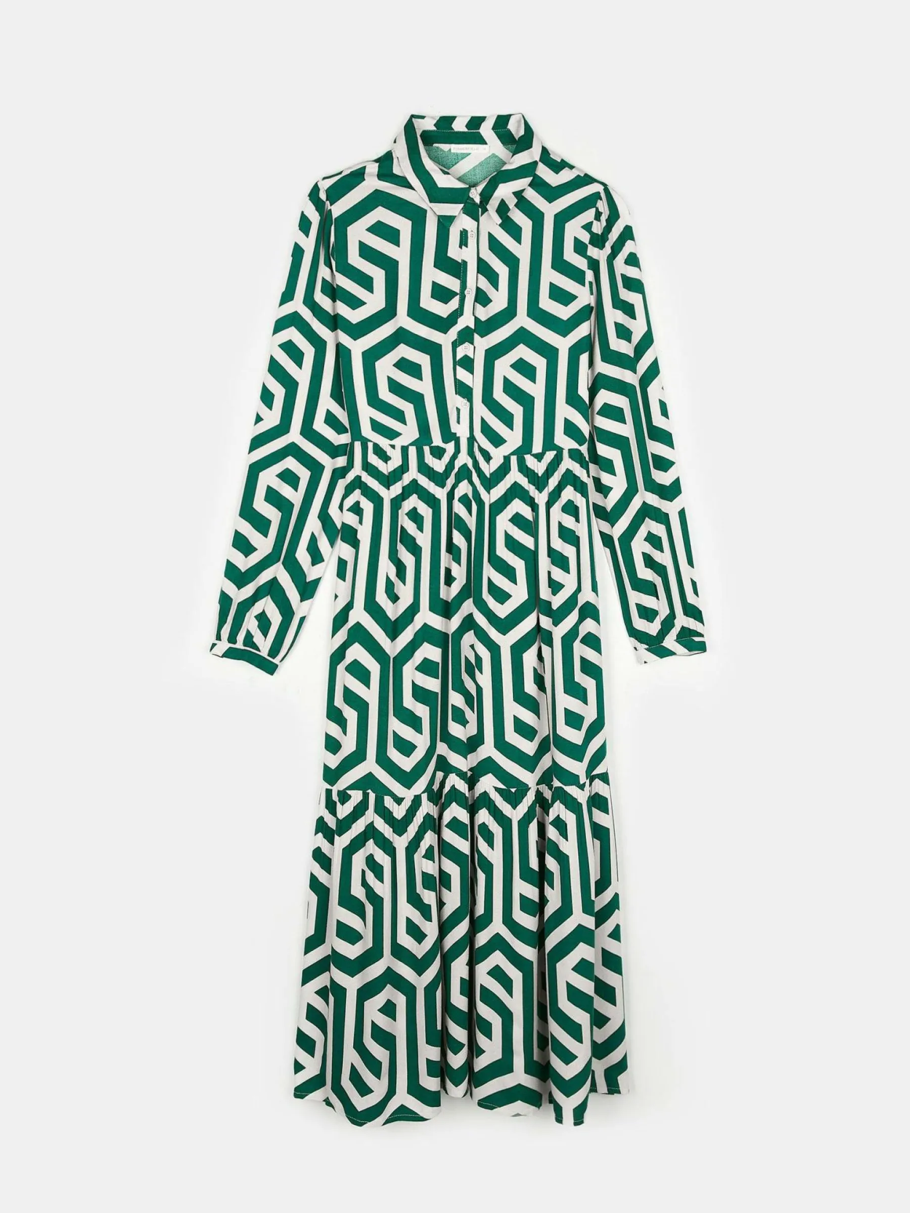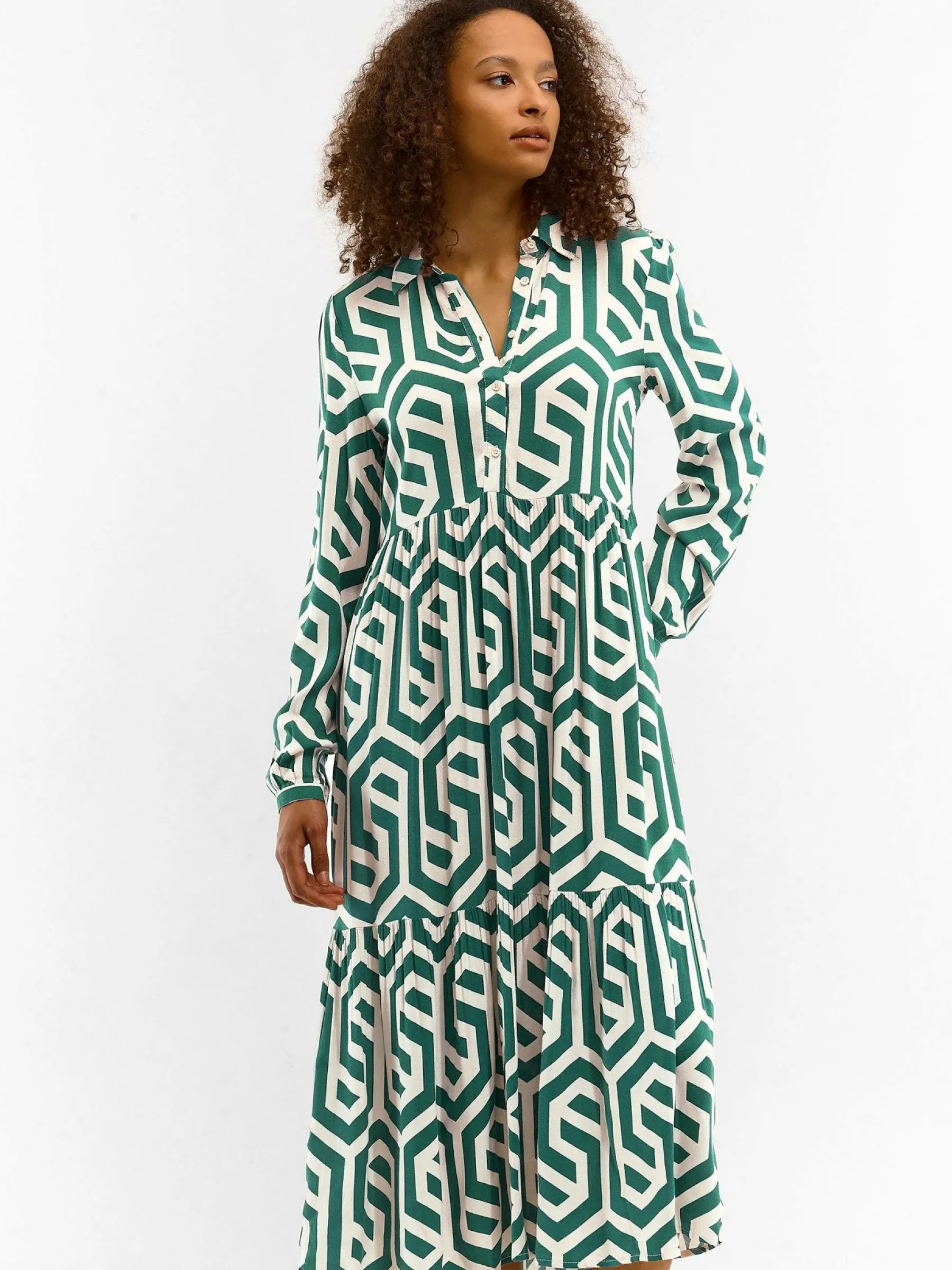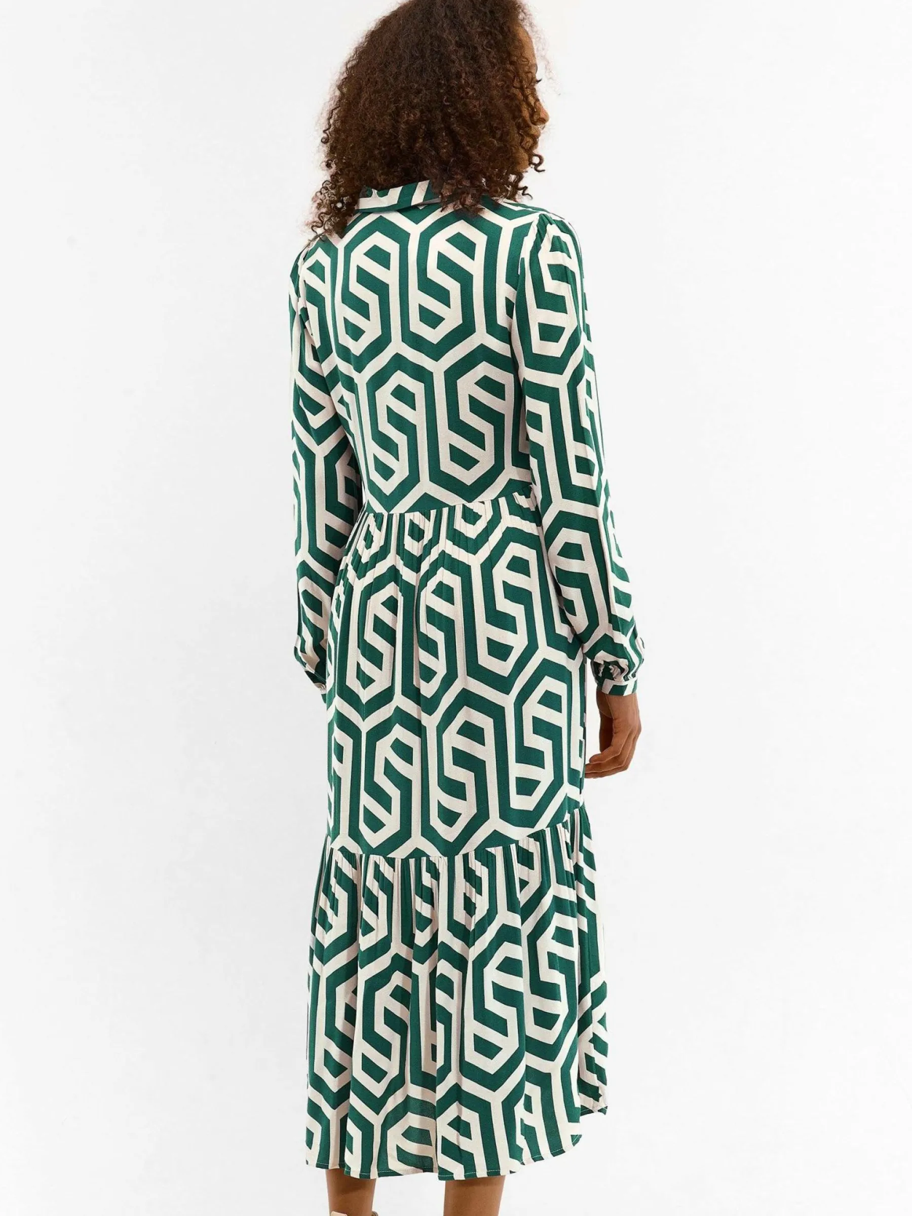 Kolor: zielonyKrój: koszulowe, z falbanąTyp: sukienkaRekaw: długi rękawDługość: midiPattern style: geometryczny, …
