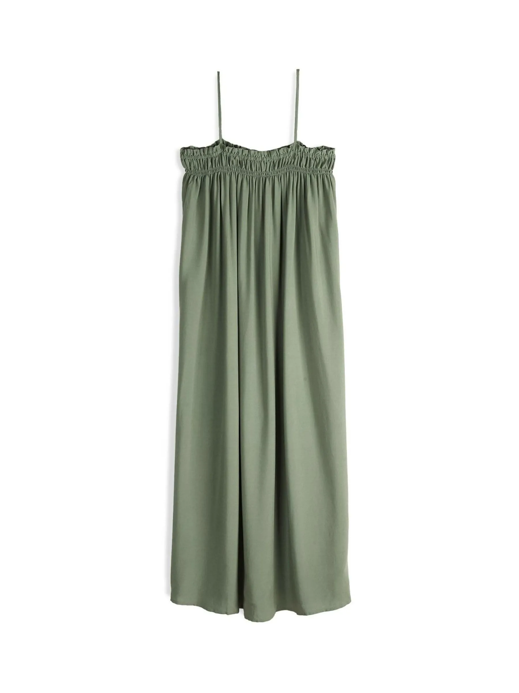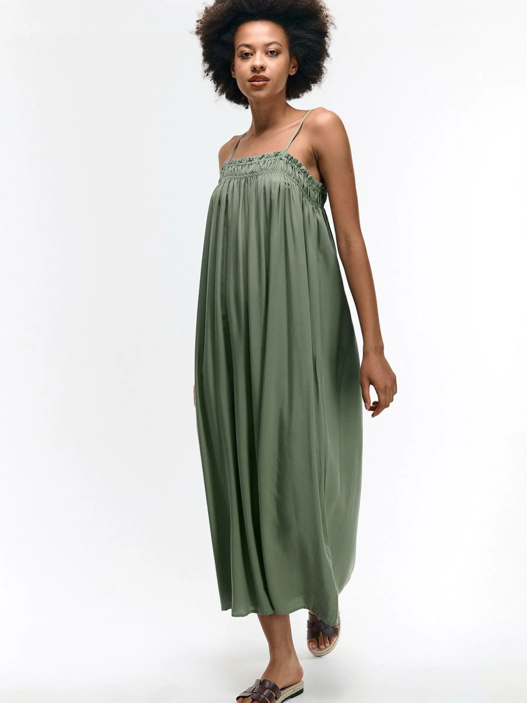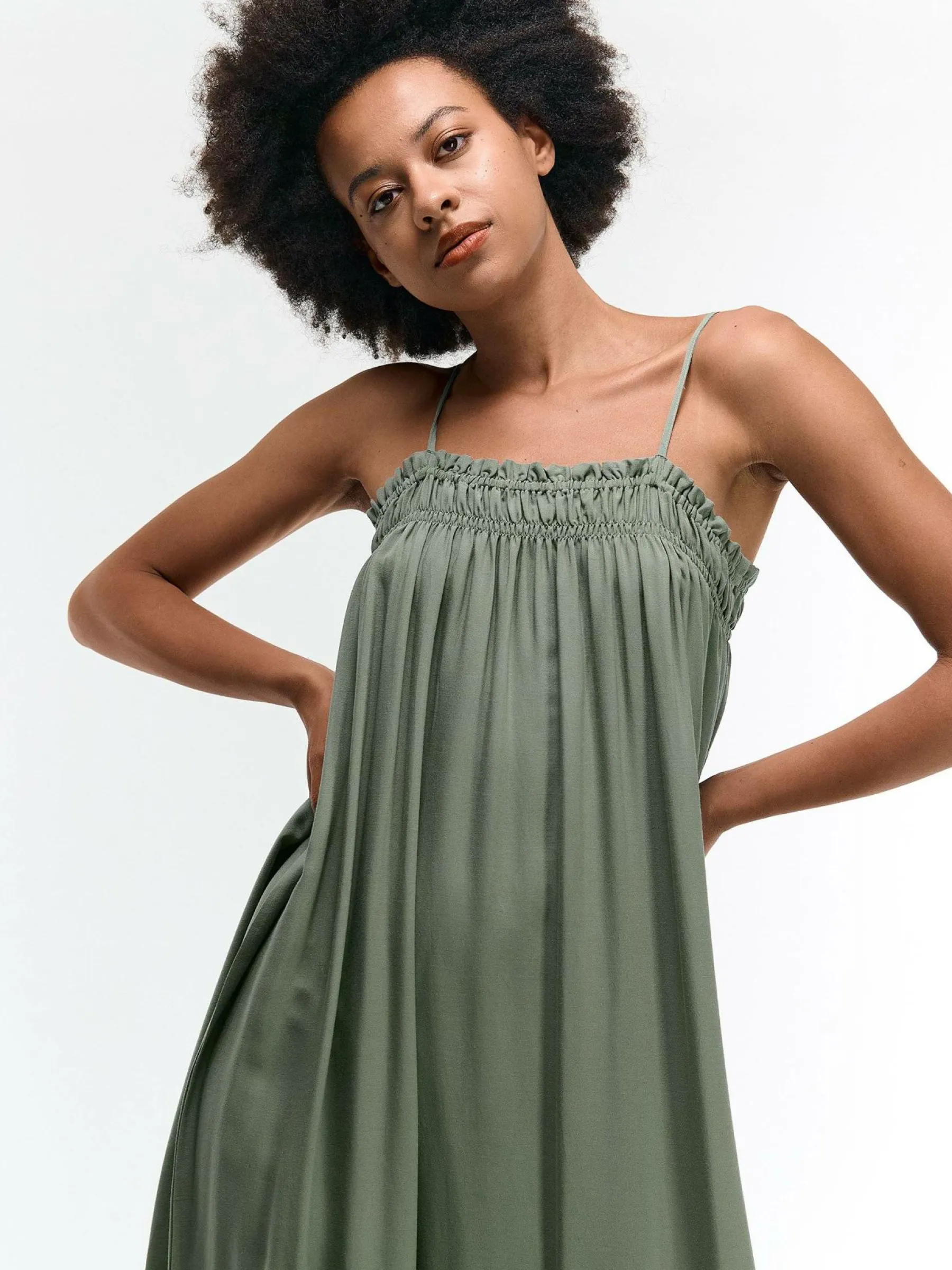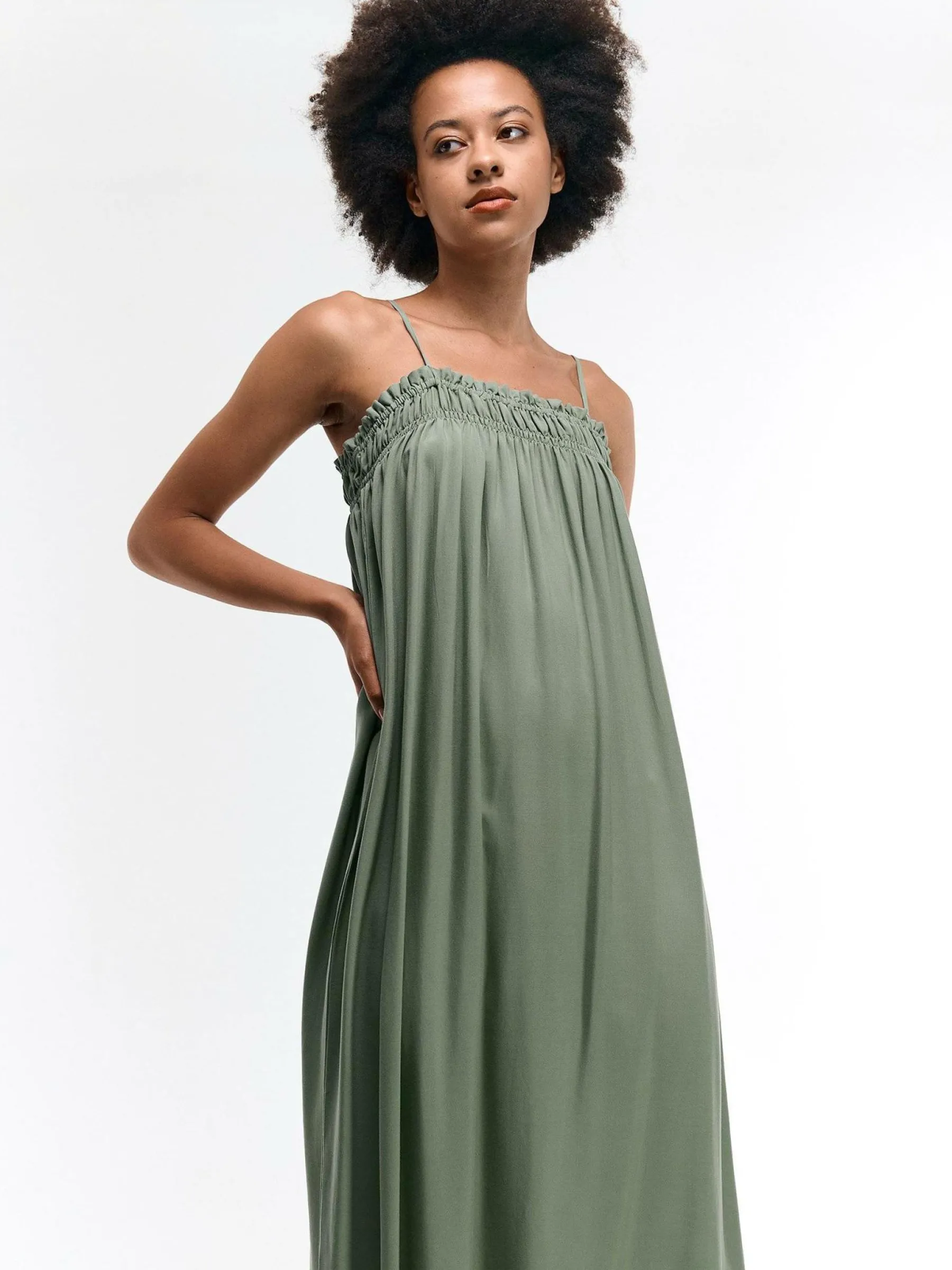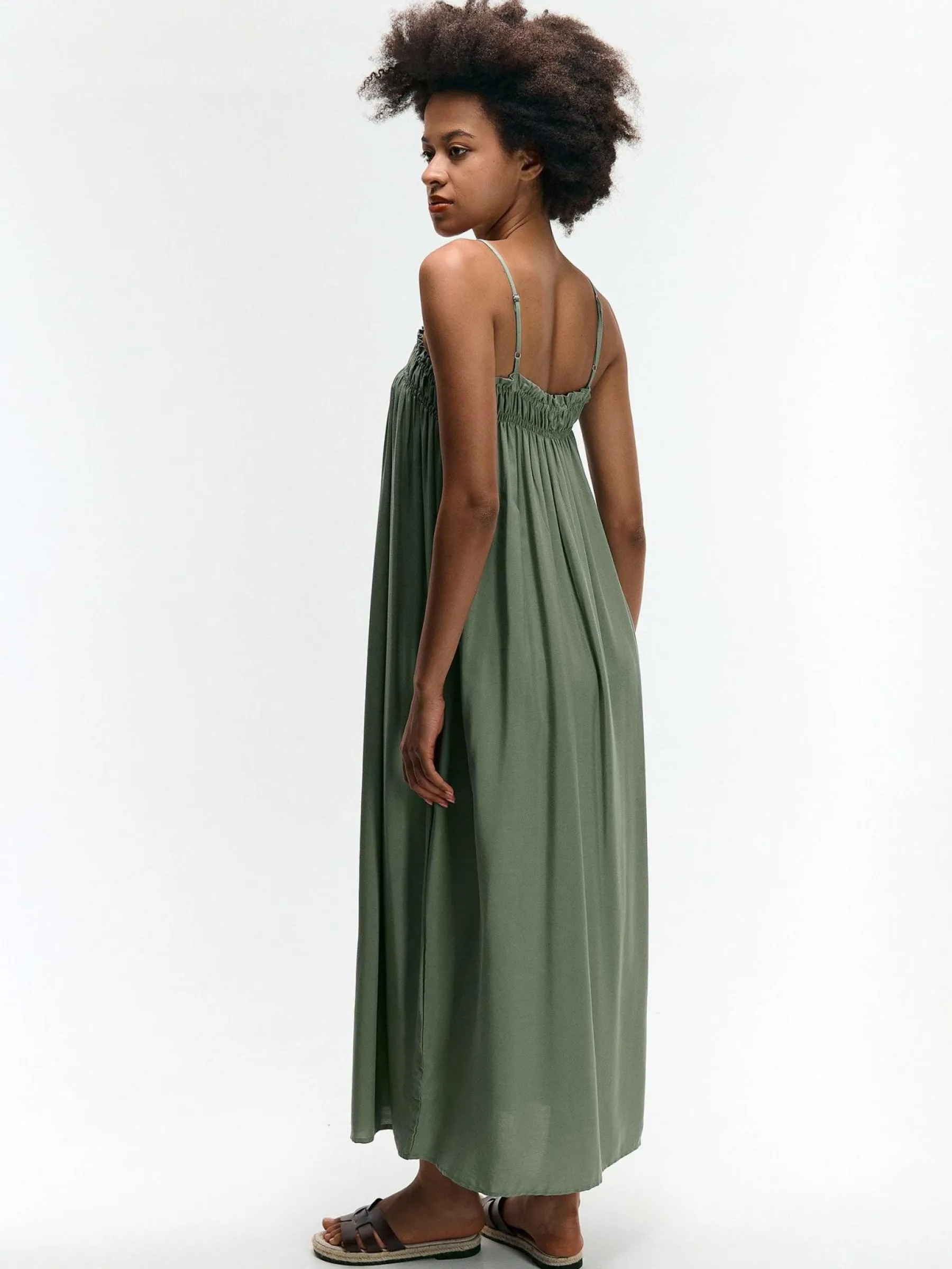 Kolor: zielonyKrój: z marszczeniemTyp: sukienkaRekaw: bez rękawówDługość: midiPattern style: pojedynczy kolorDetal…