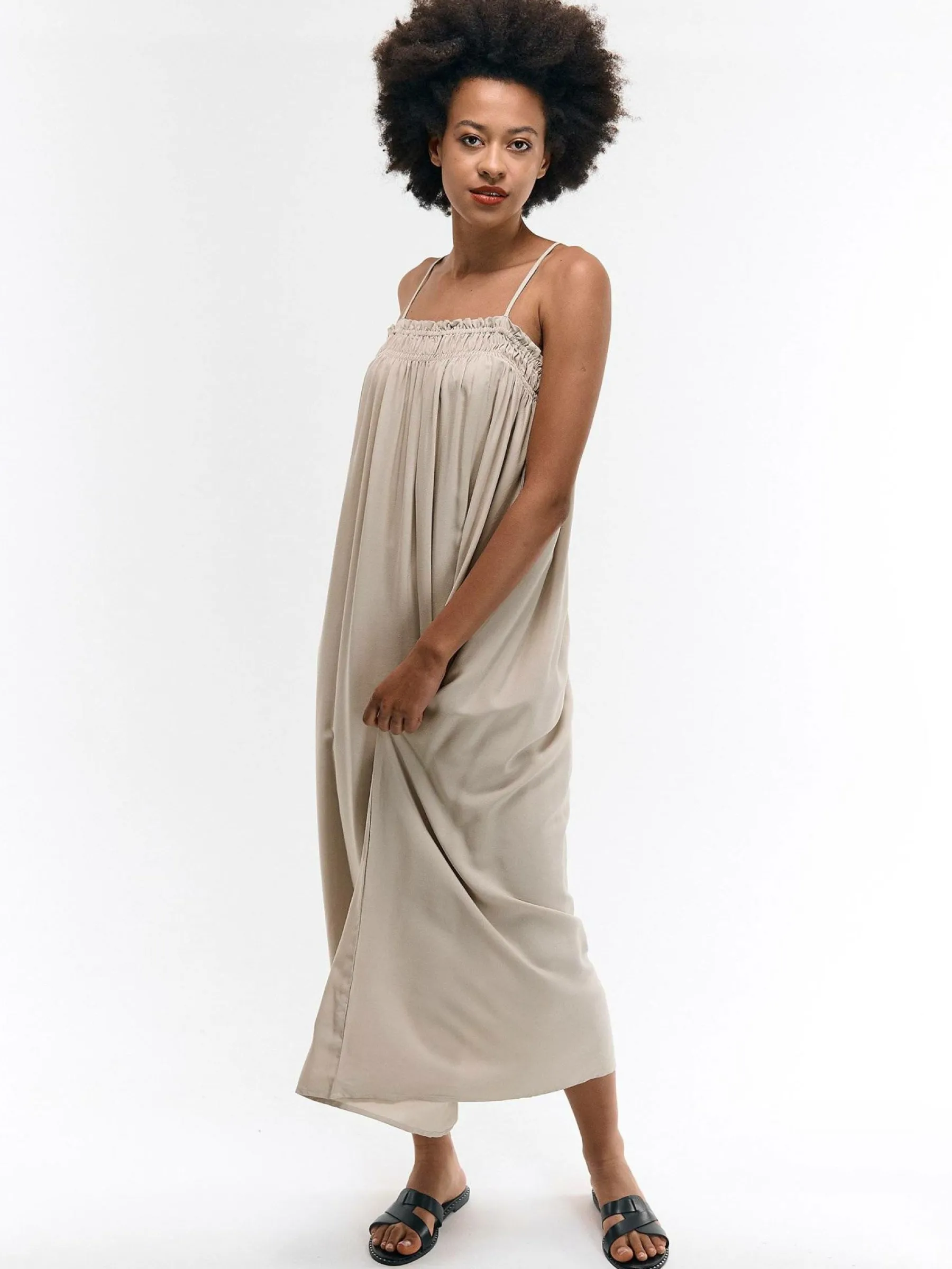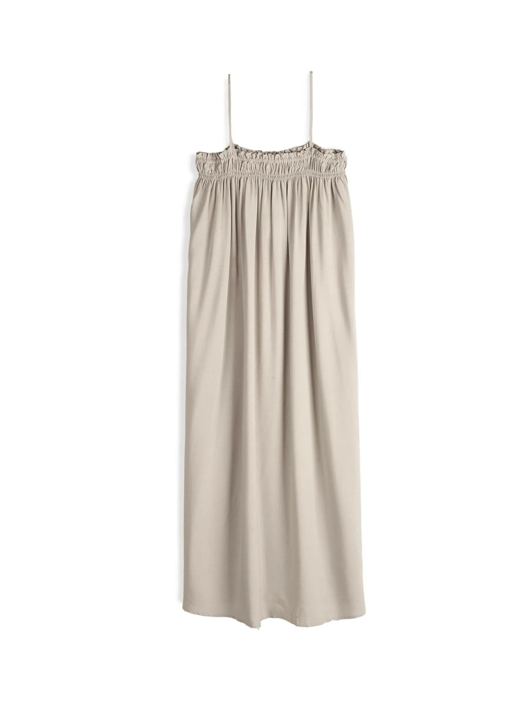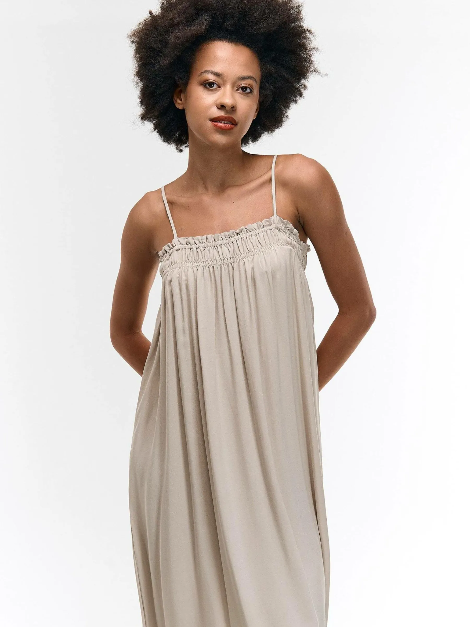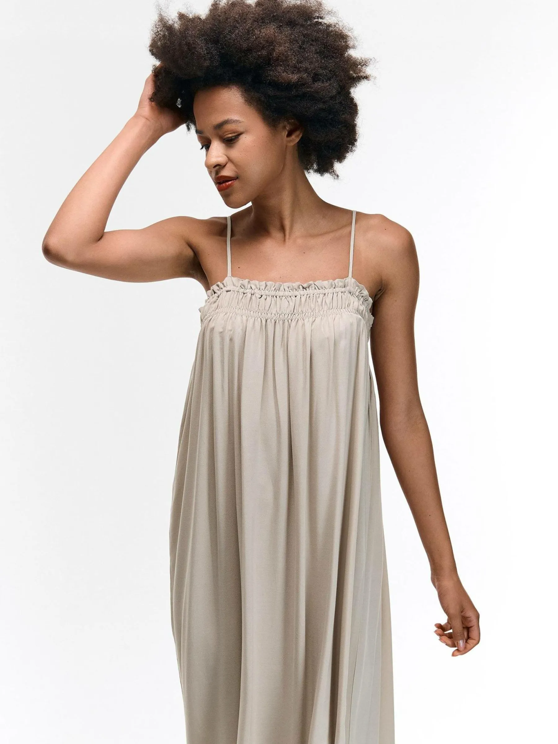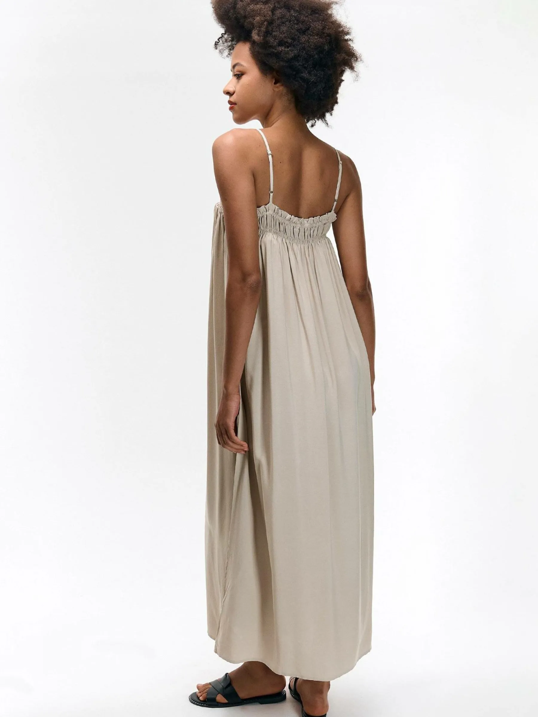 Kolor: beżowyKrój: z marszczeniemTyp: sukienkaRekaw: bez rękawówDługość: midiPattern style: pojedynczy kolorDetal…