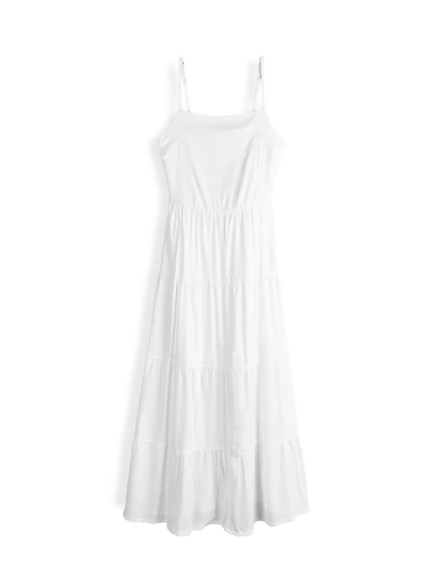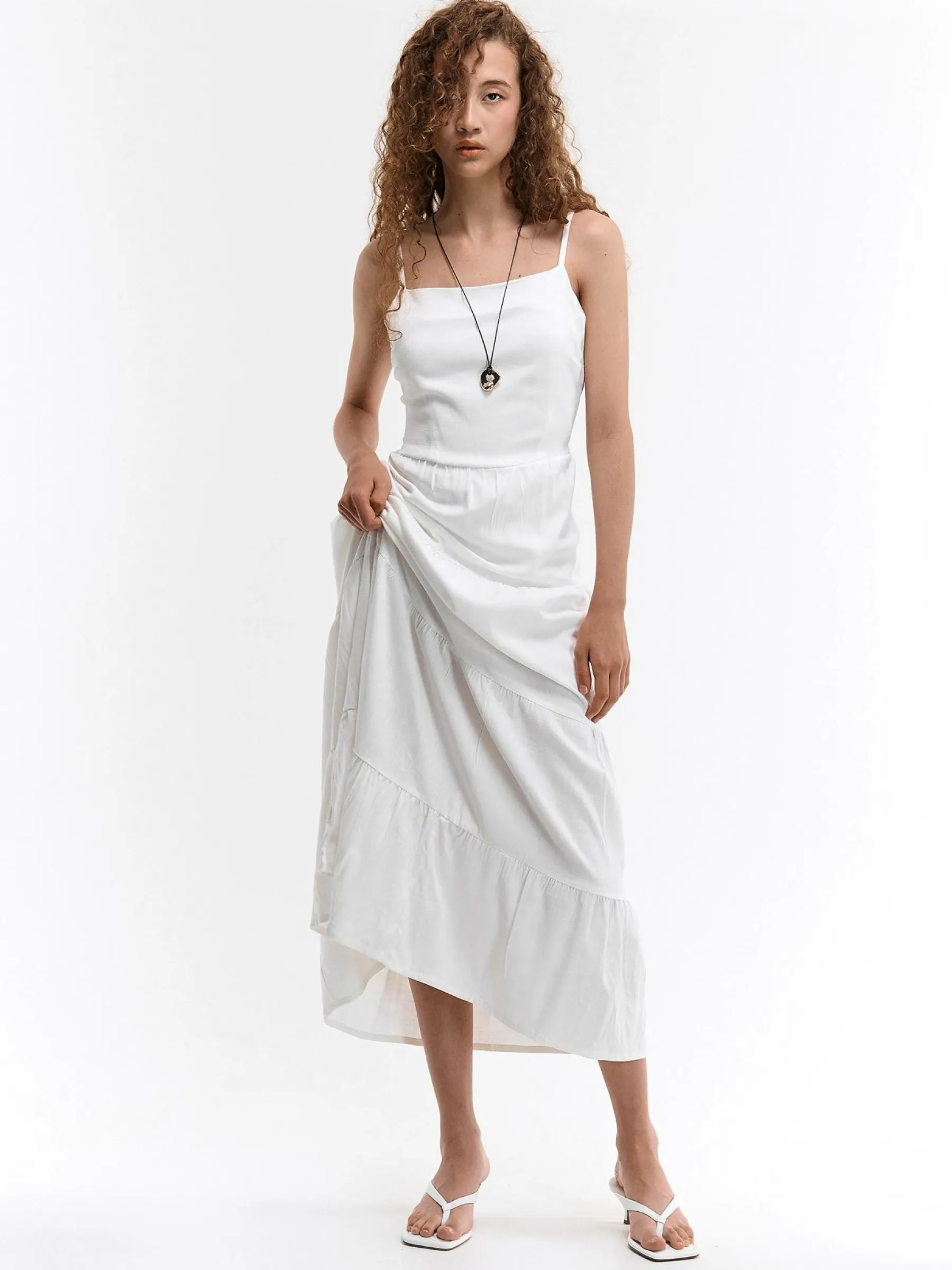 Kolor: białyKrój: z falbanąTyp: sukienkaRekaw: bez rękawówDługość: maxiPattern style: pojedynczy kolorDetal: nad…