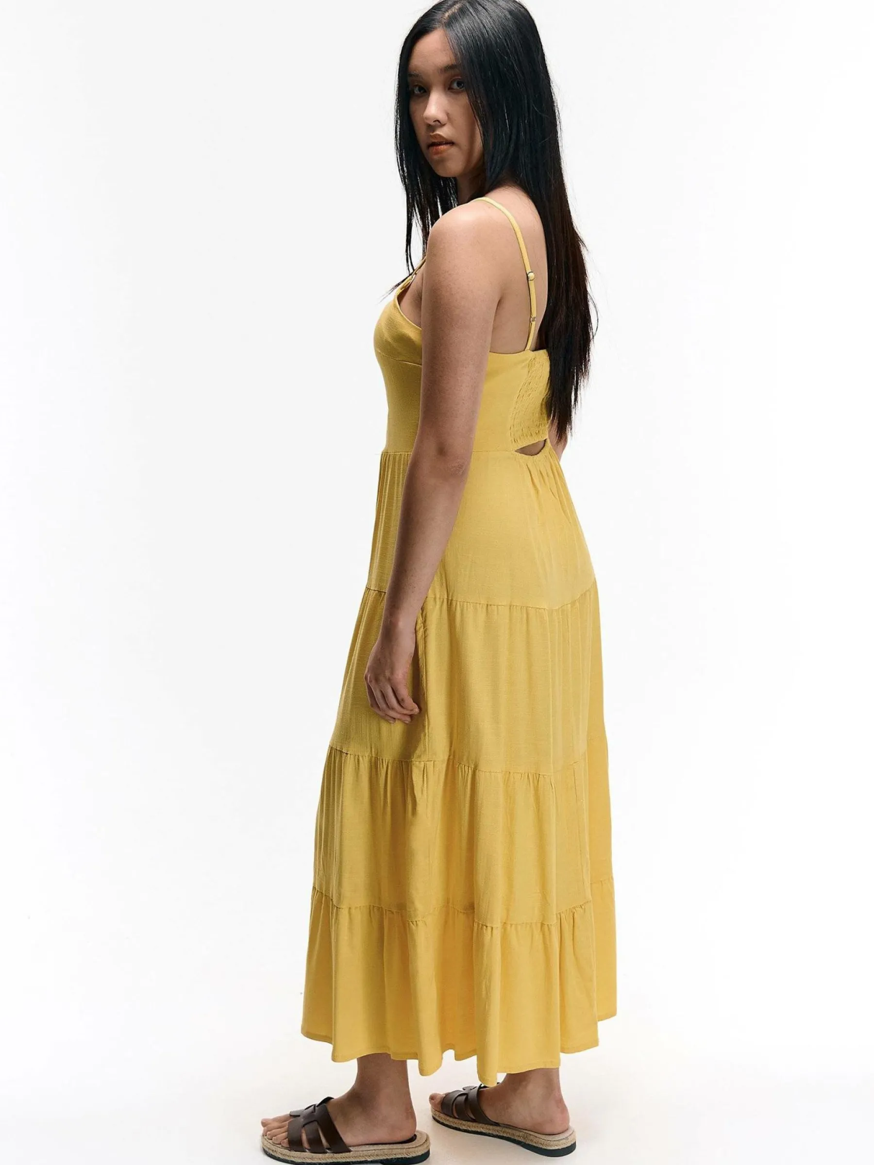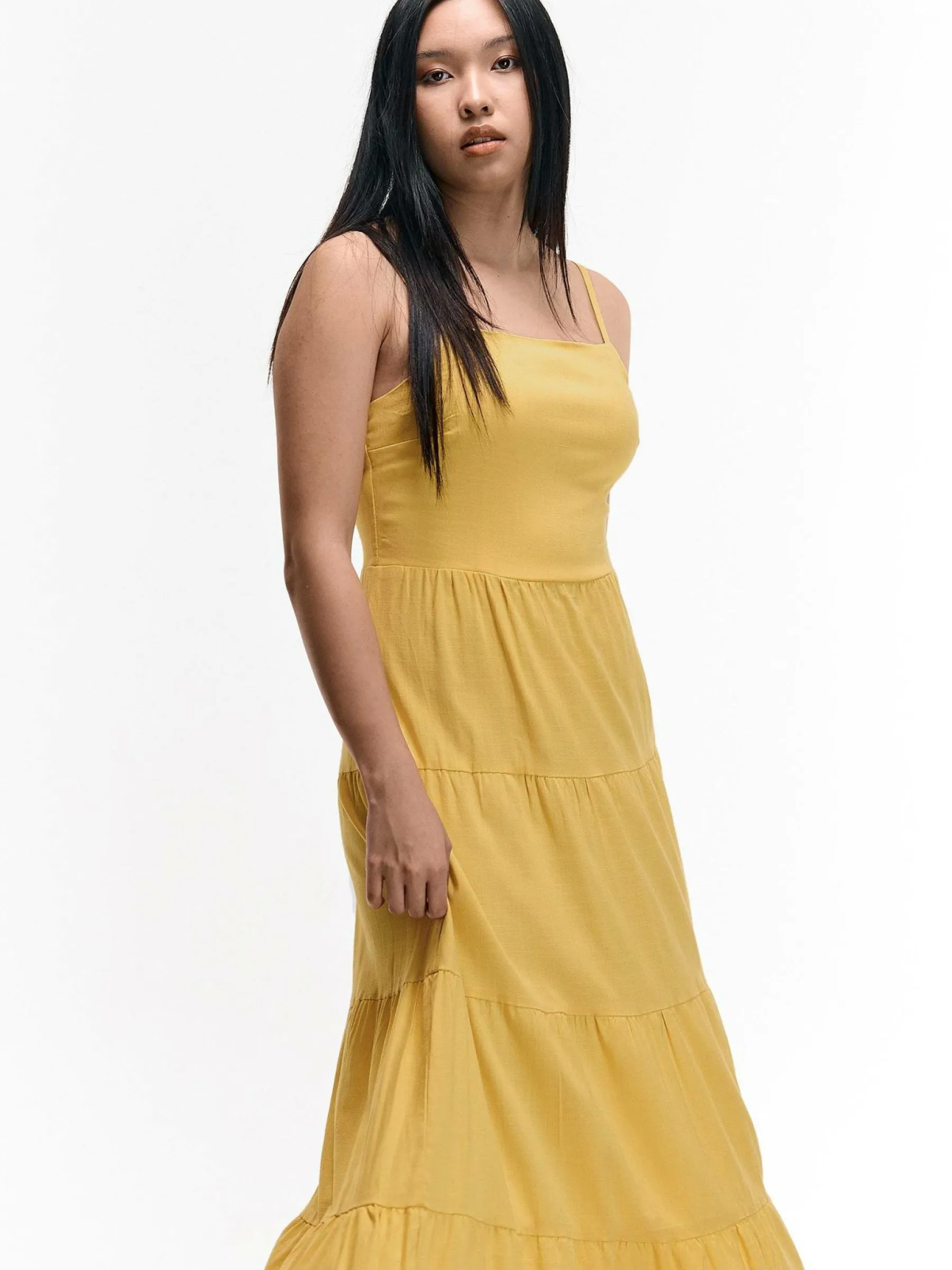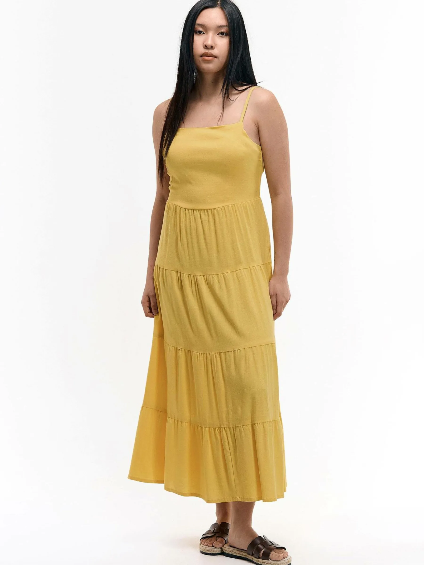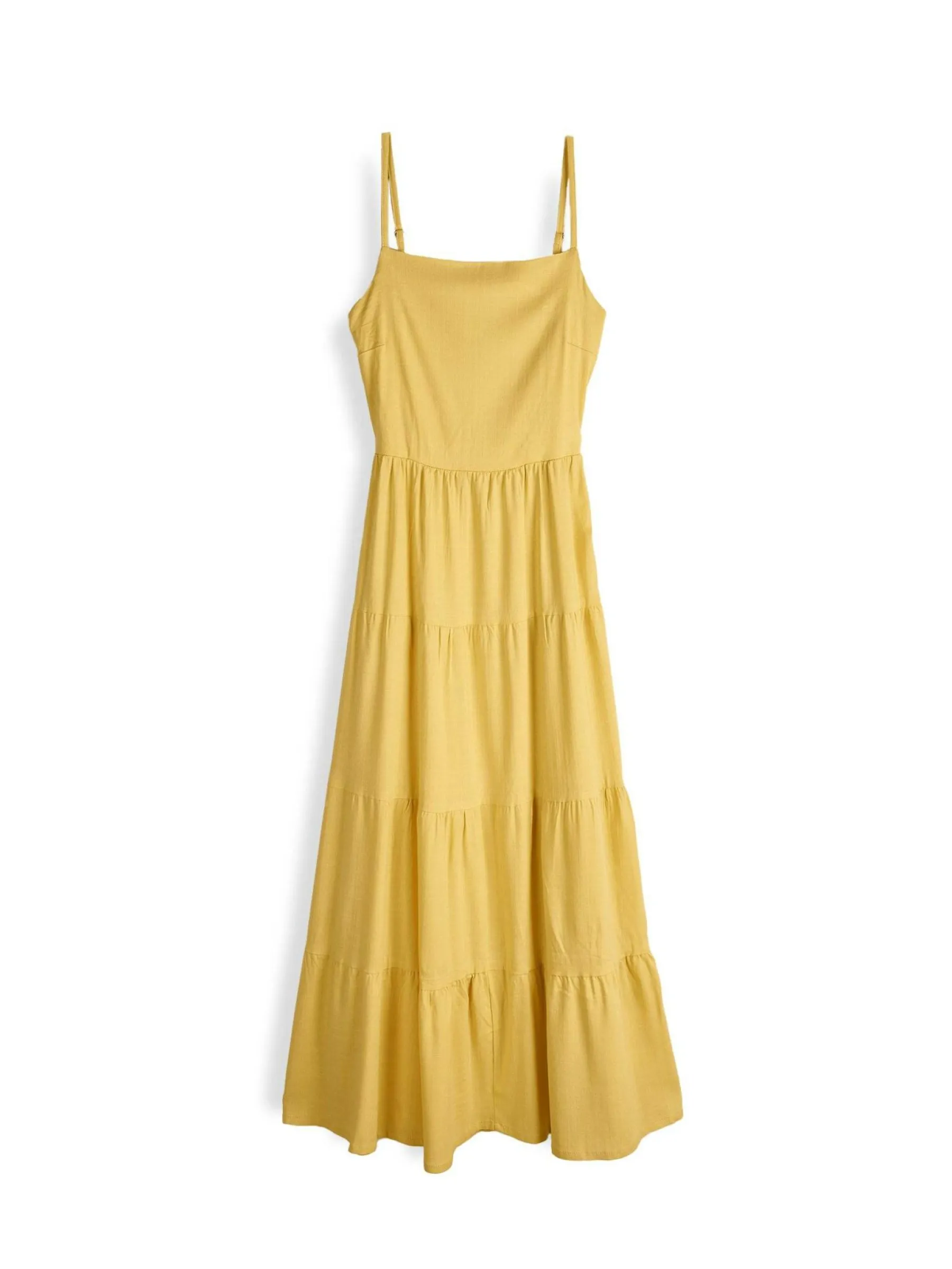 Kolor: żółtyKrój: z falbanąTyp: sukienkaRekaw: bez rękawówDługość: maxiPattern style: pojedynczy kolorDetal: n…