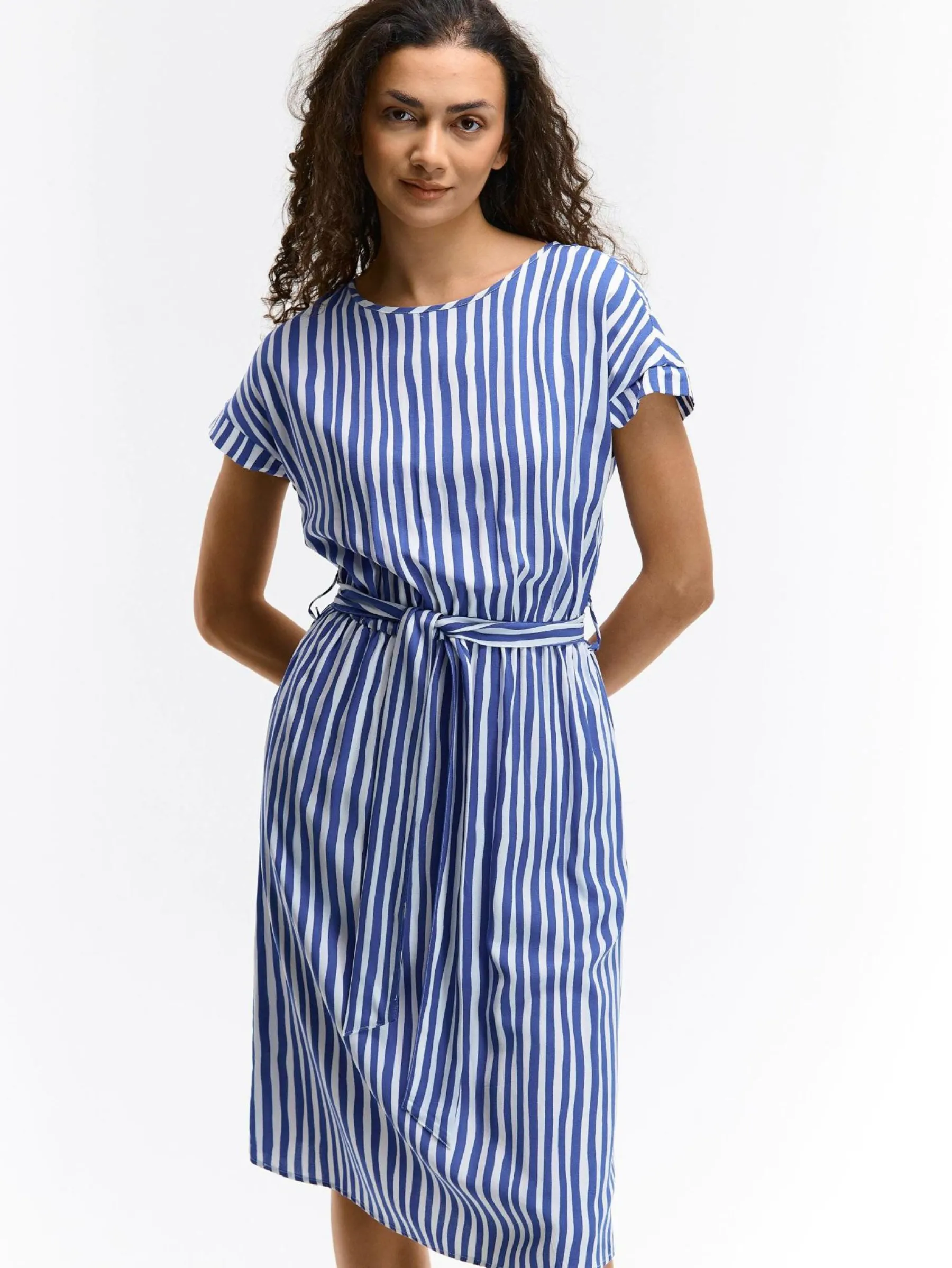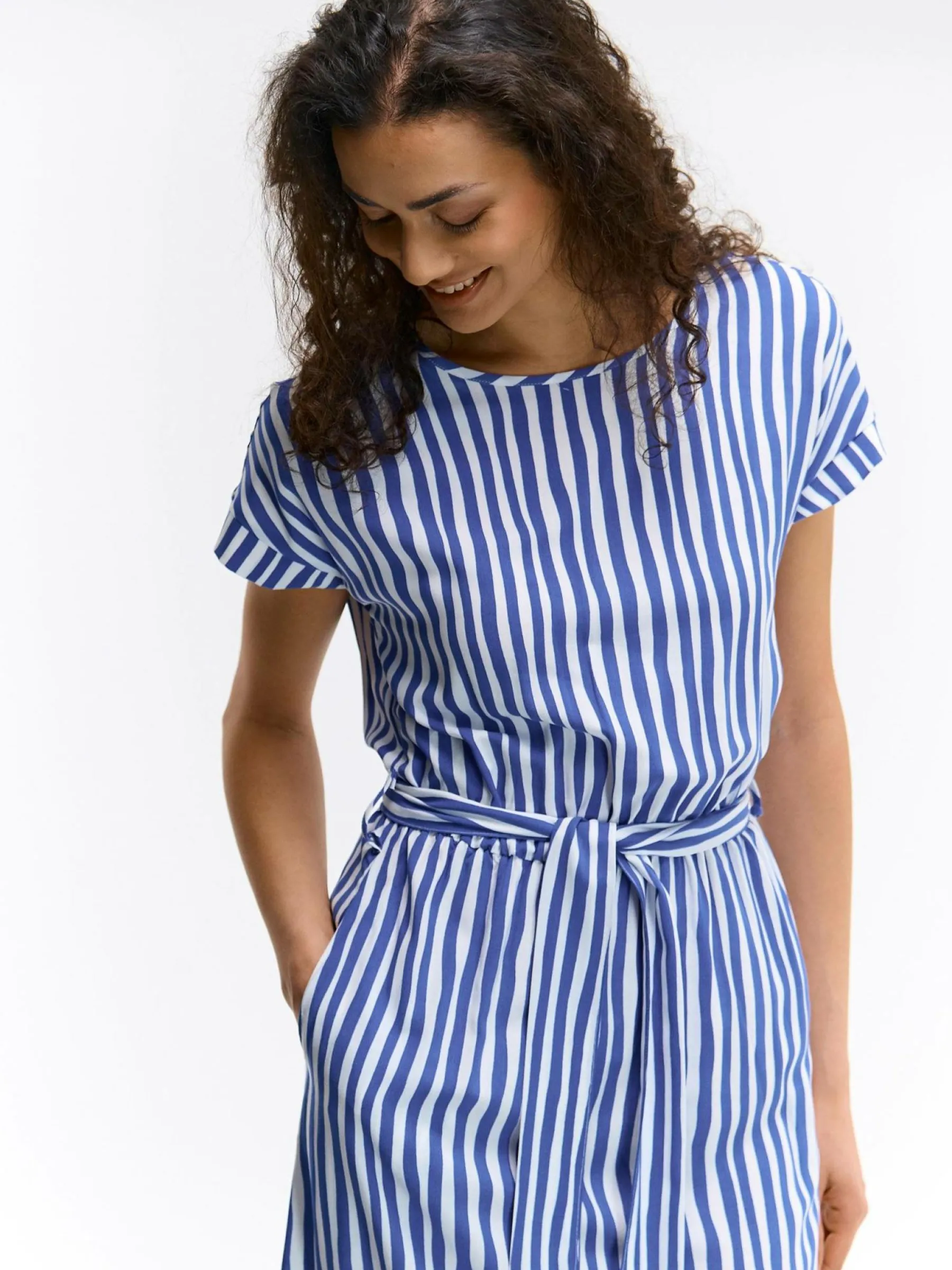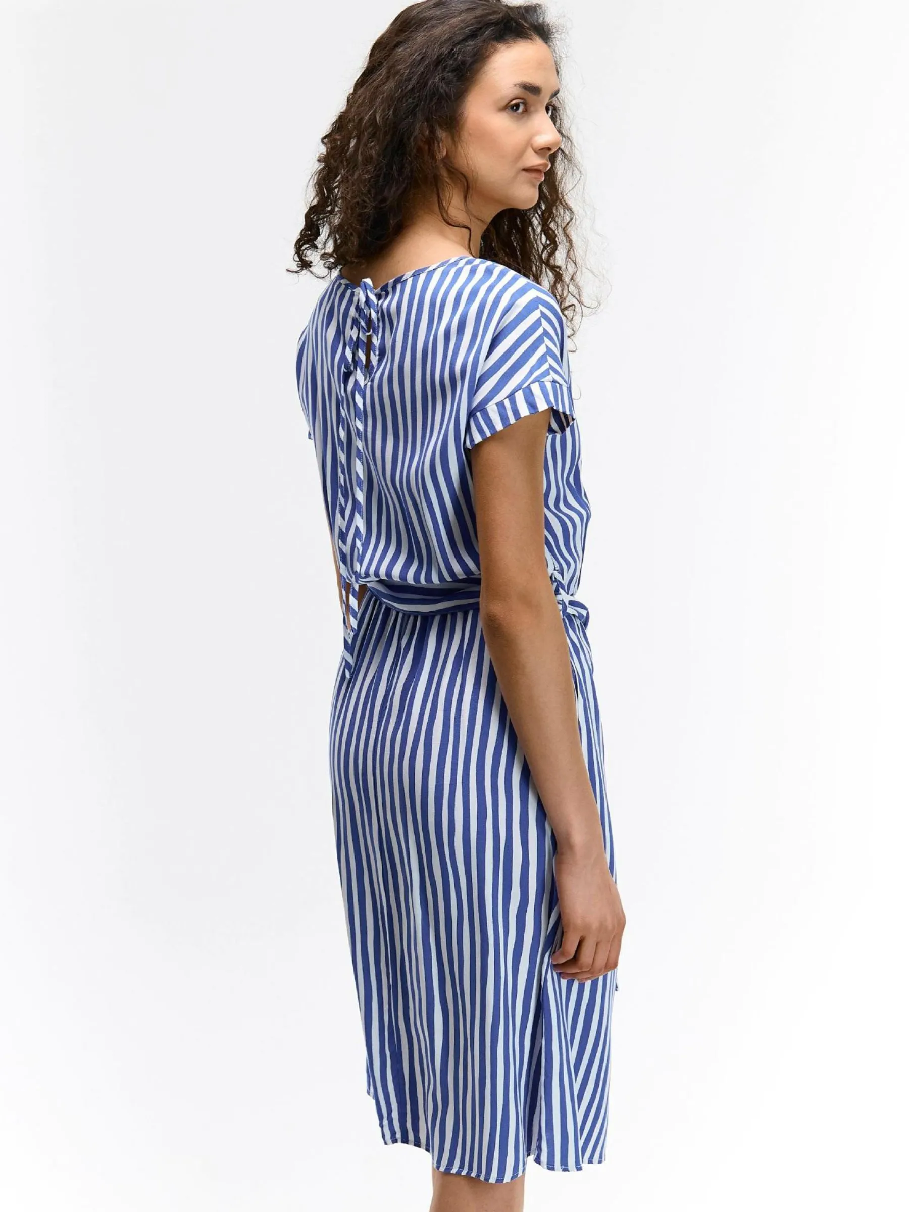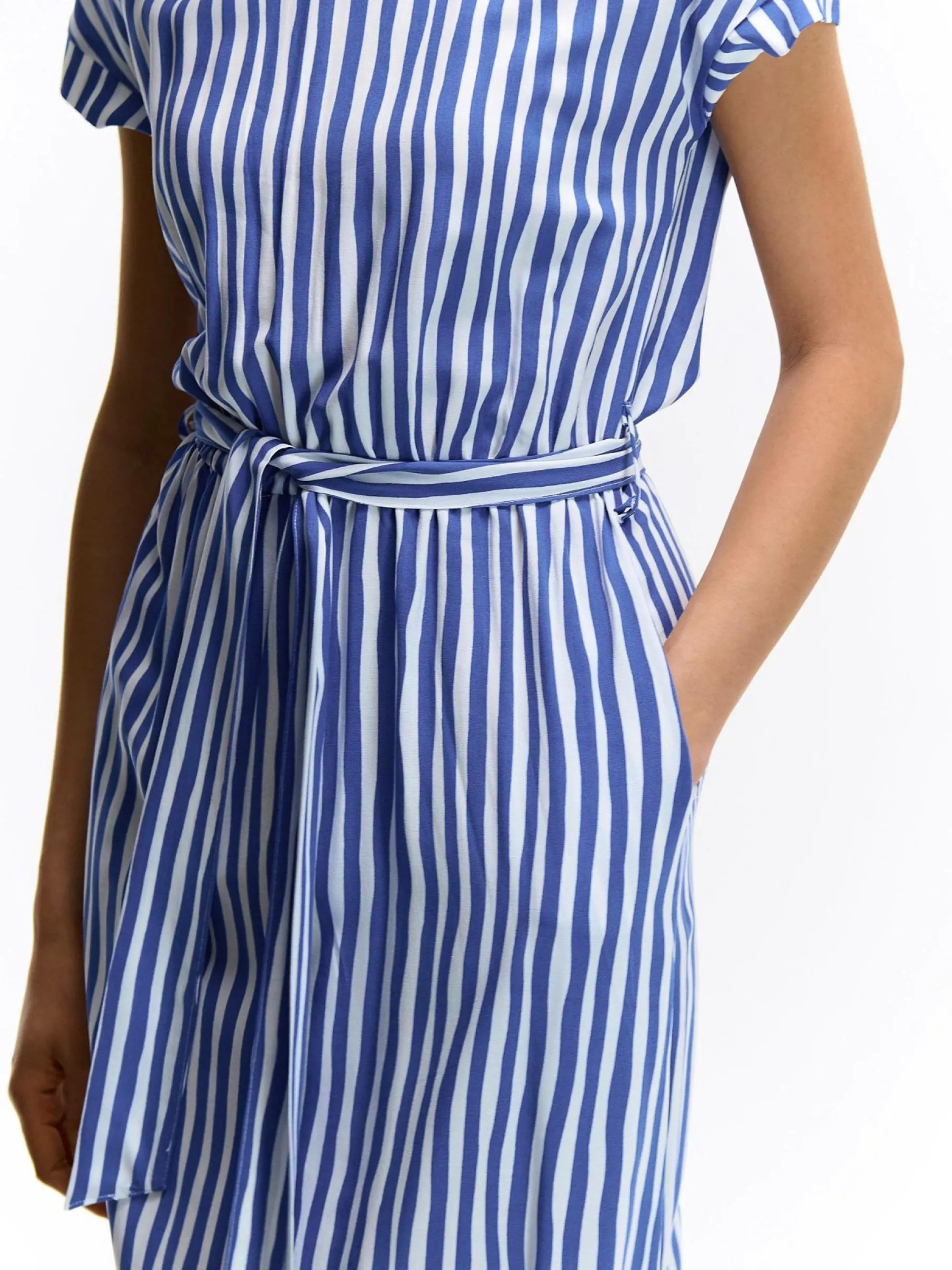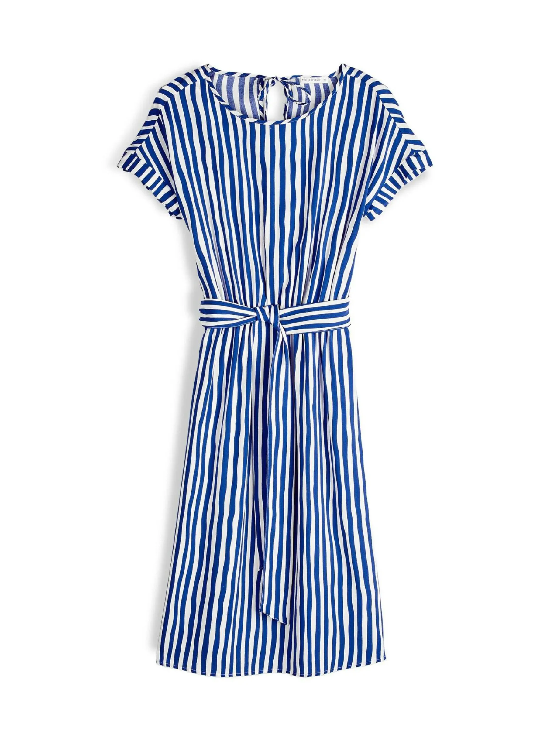Kolor: niebieskiKrój: asyTyp: sukienkaRekaw: krótki rękawDługość: midiPattern style: w prążkiDetal: z paskiem, n…