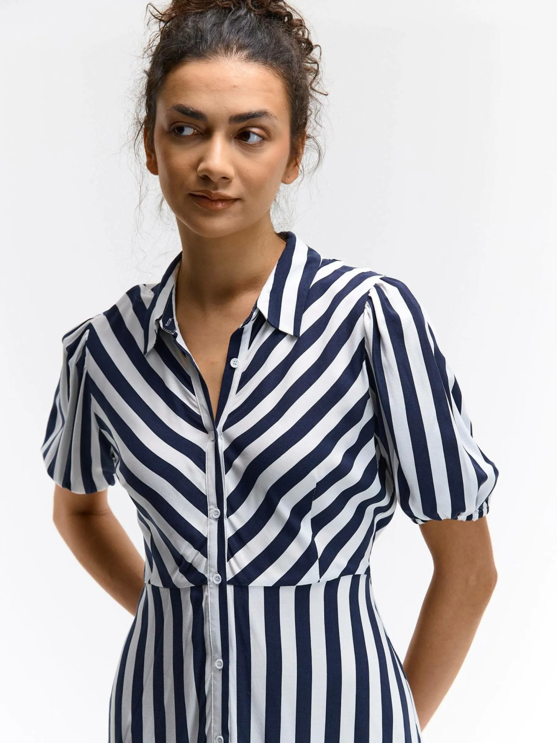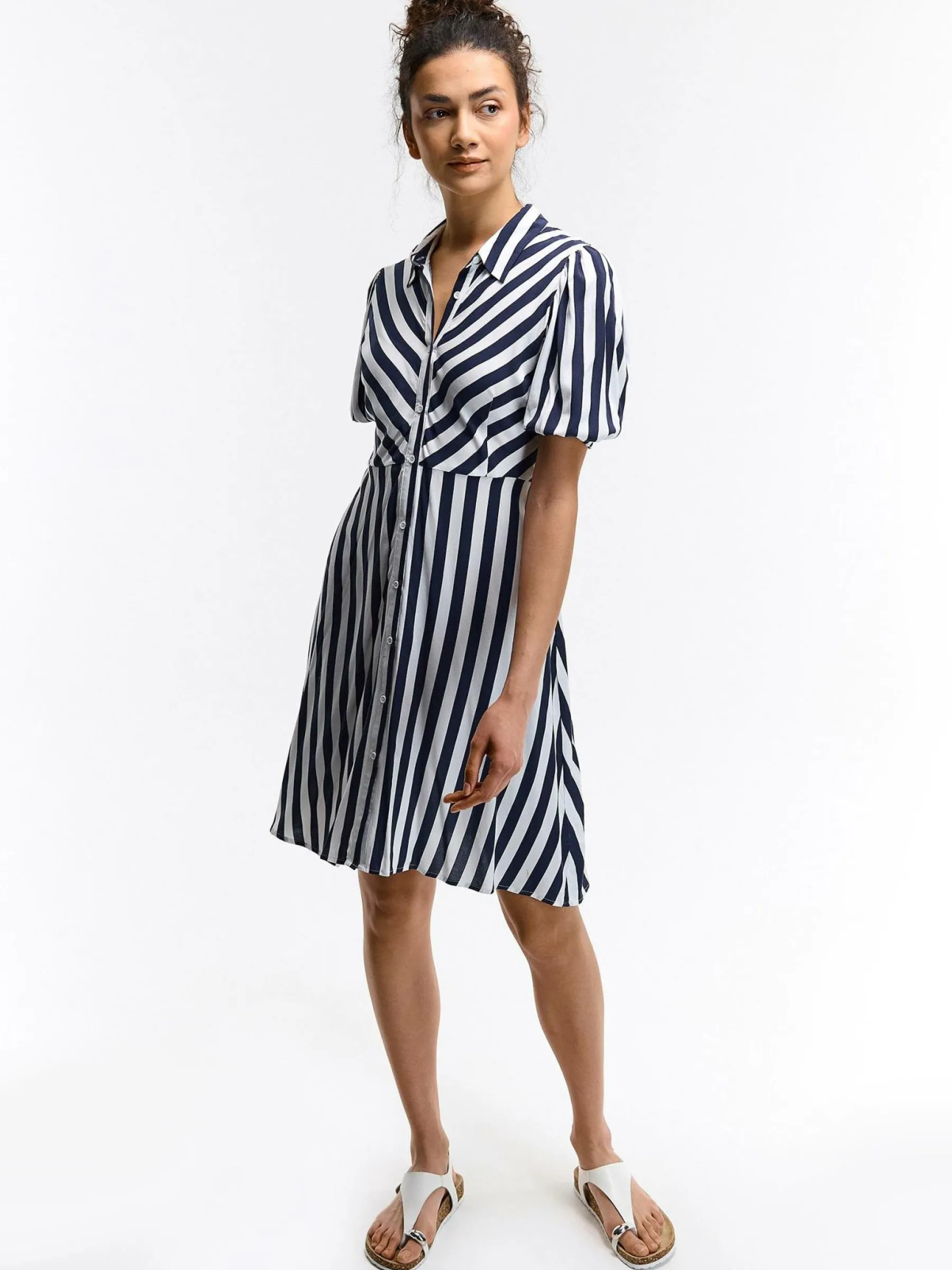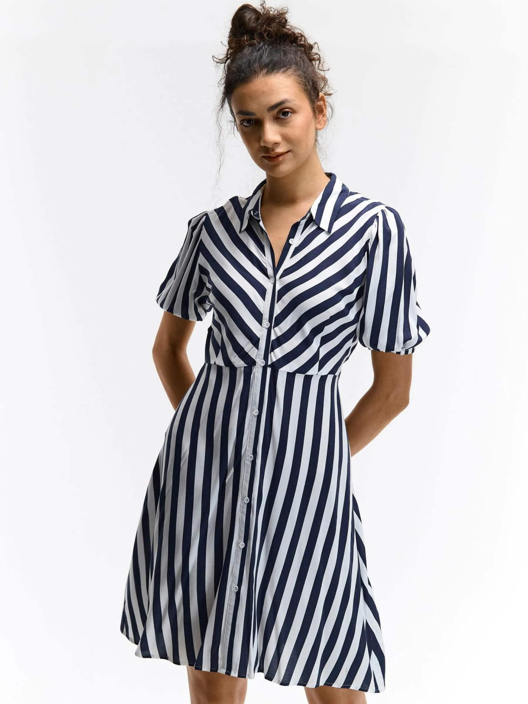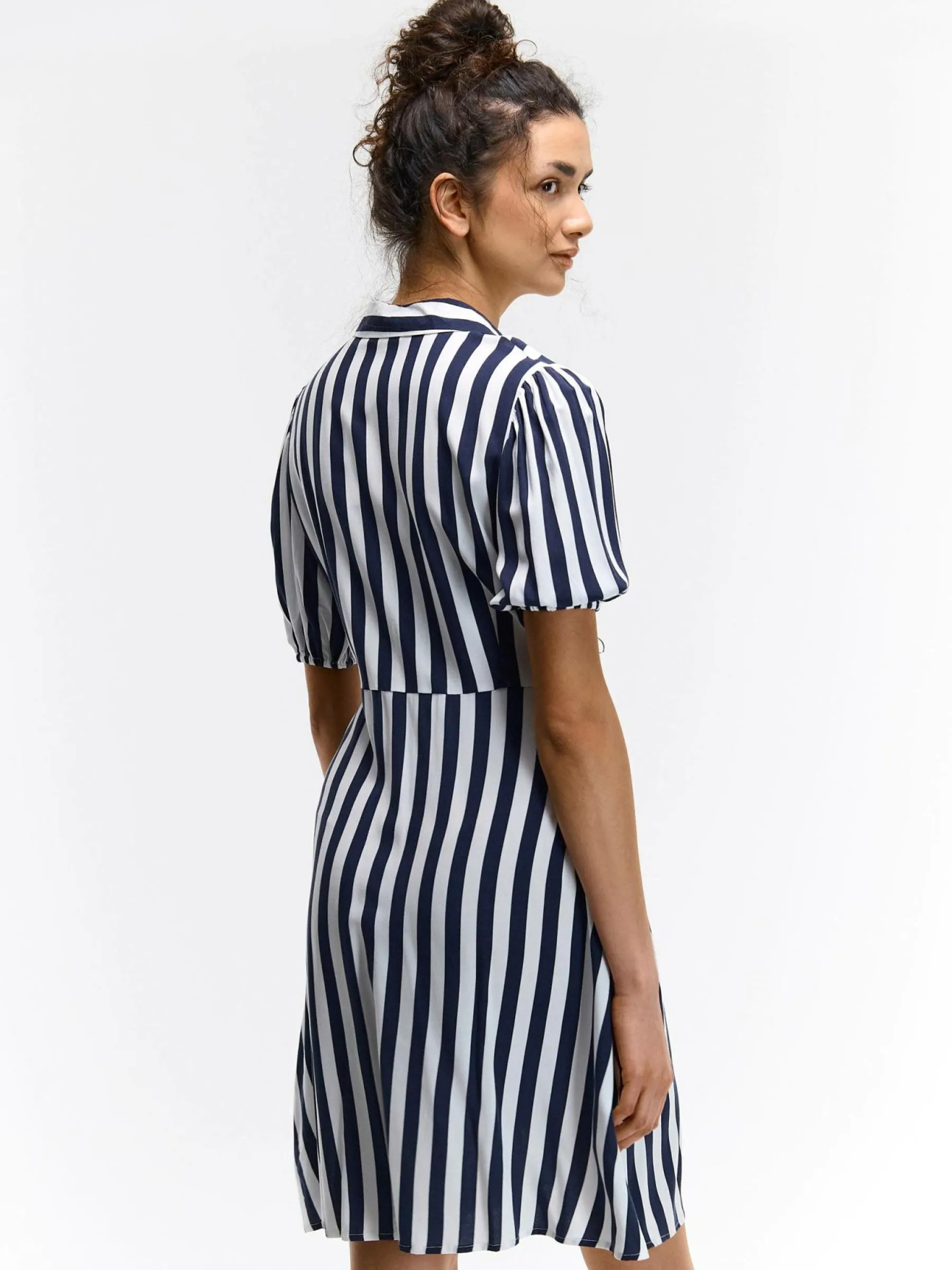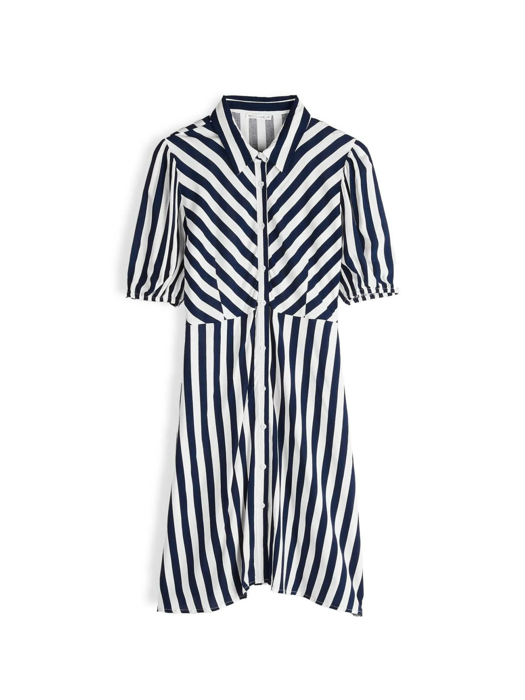 Kolor: granatowyKrój: koszuloweTyp: sukienkaRekaw: krótki rękawDługość: miniPattern style: w prążkiDetal: na guz…