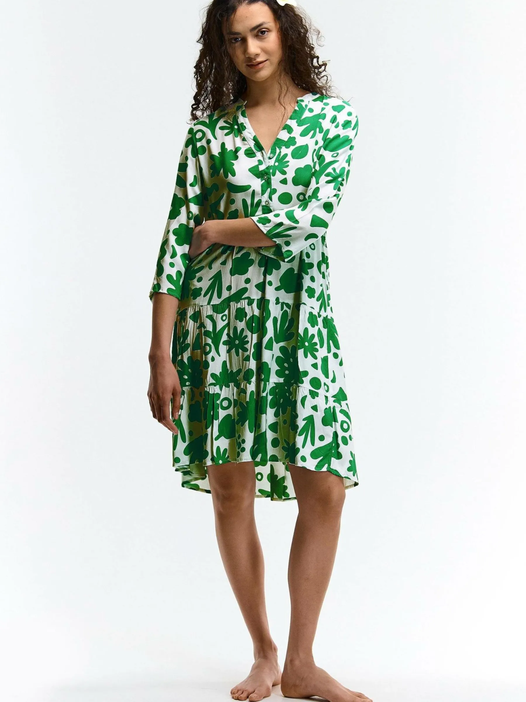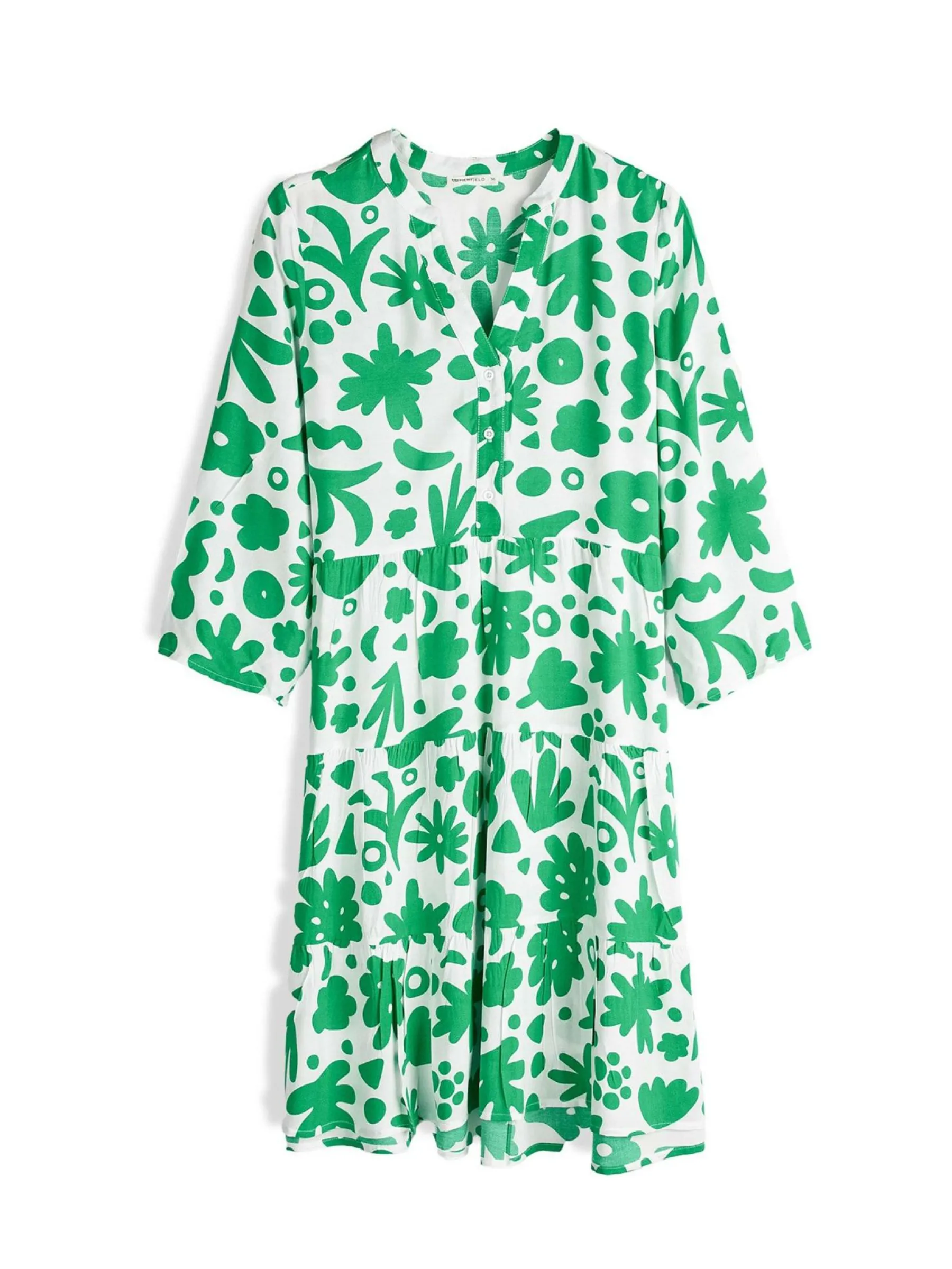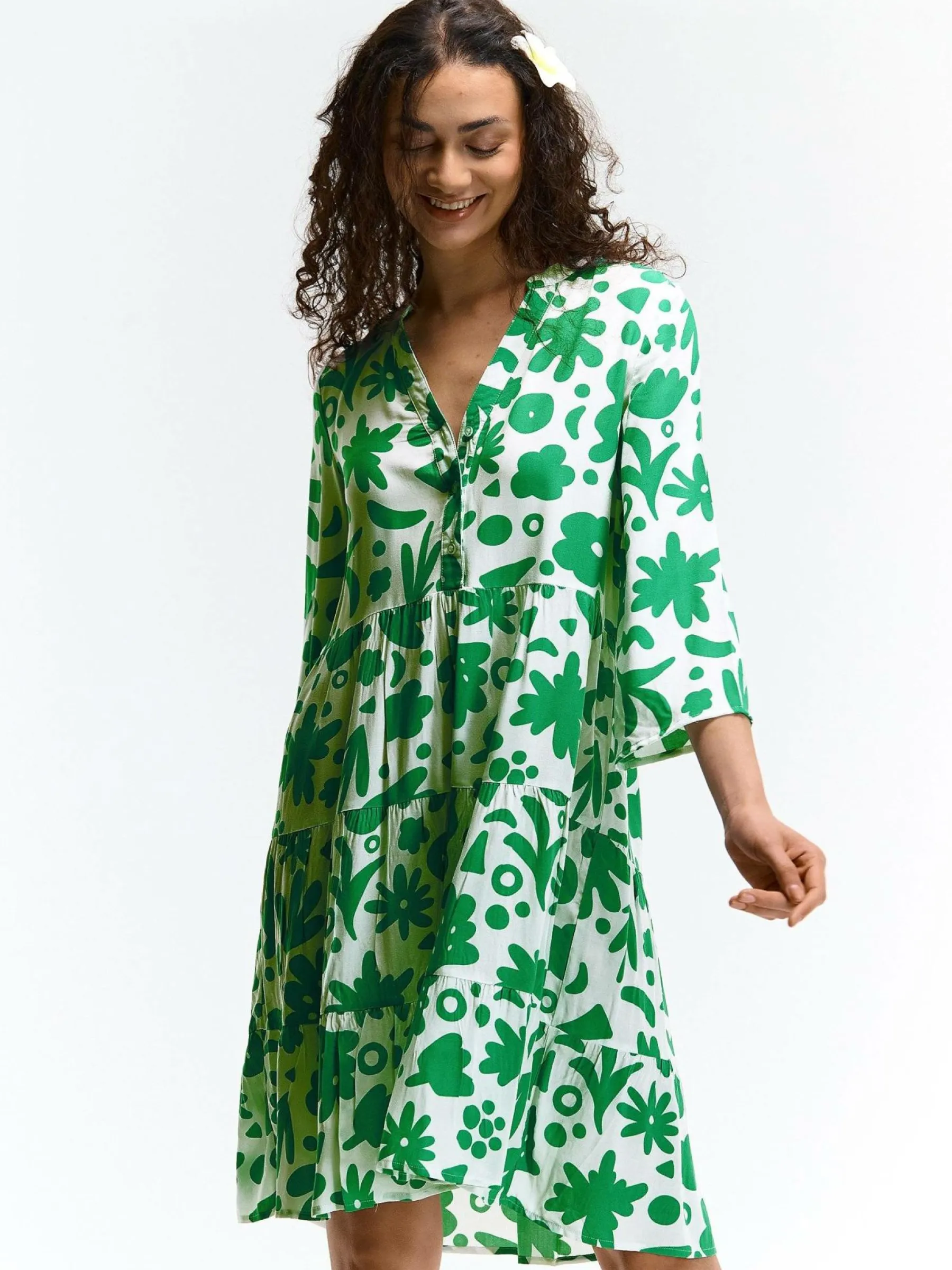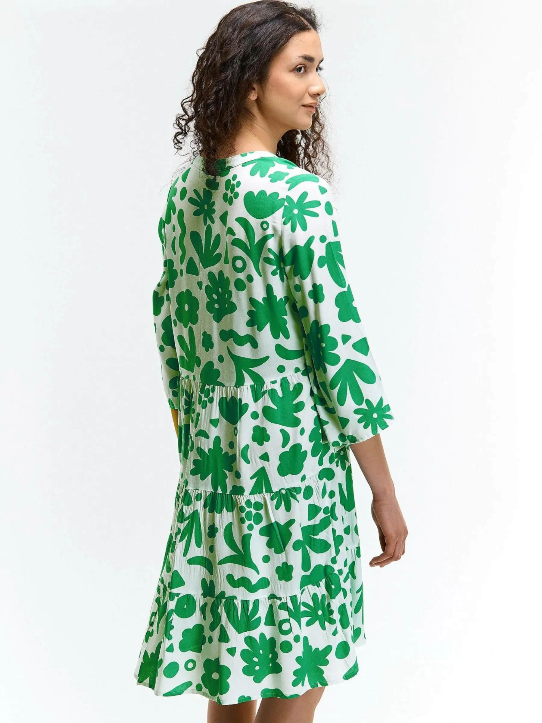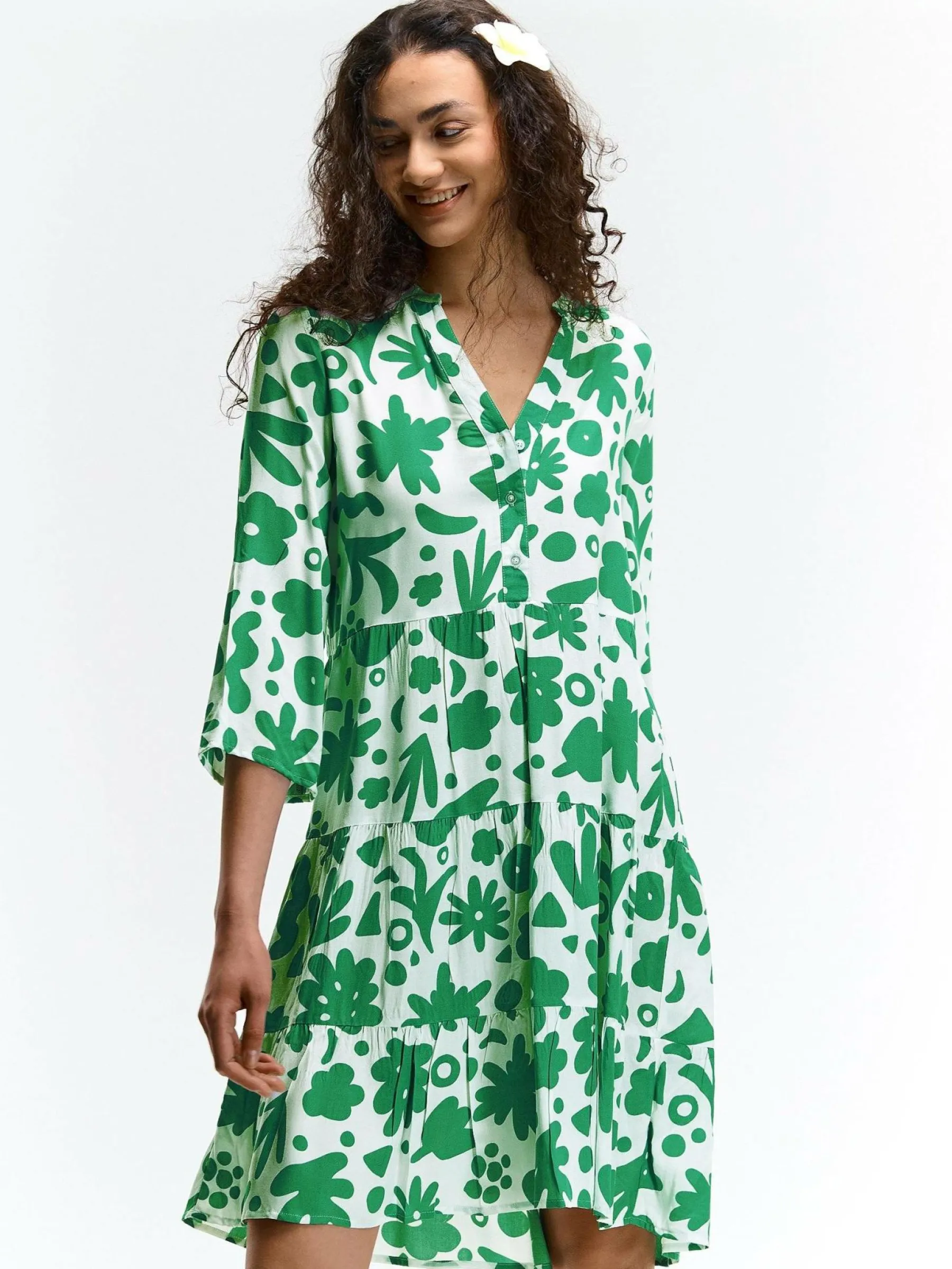 Kolor: zielonyKrój: z falbanąTyp: sukienkaRekaw: rękaw 3/4Długość: miniPattern style: wzorzysteDetal: na guziki, v…